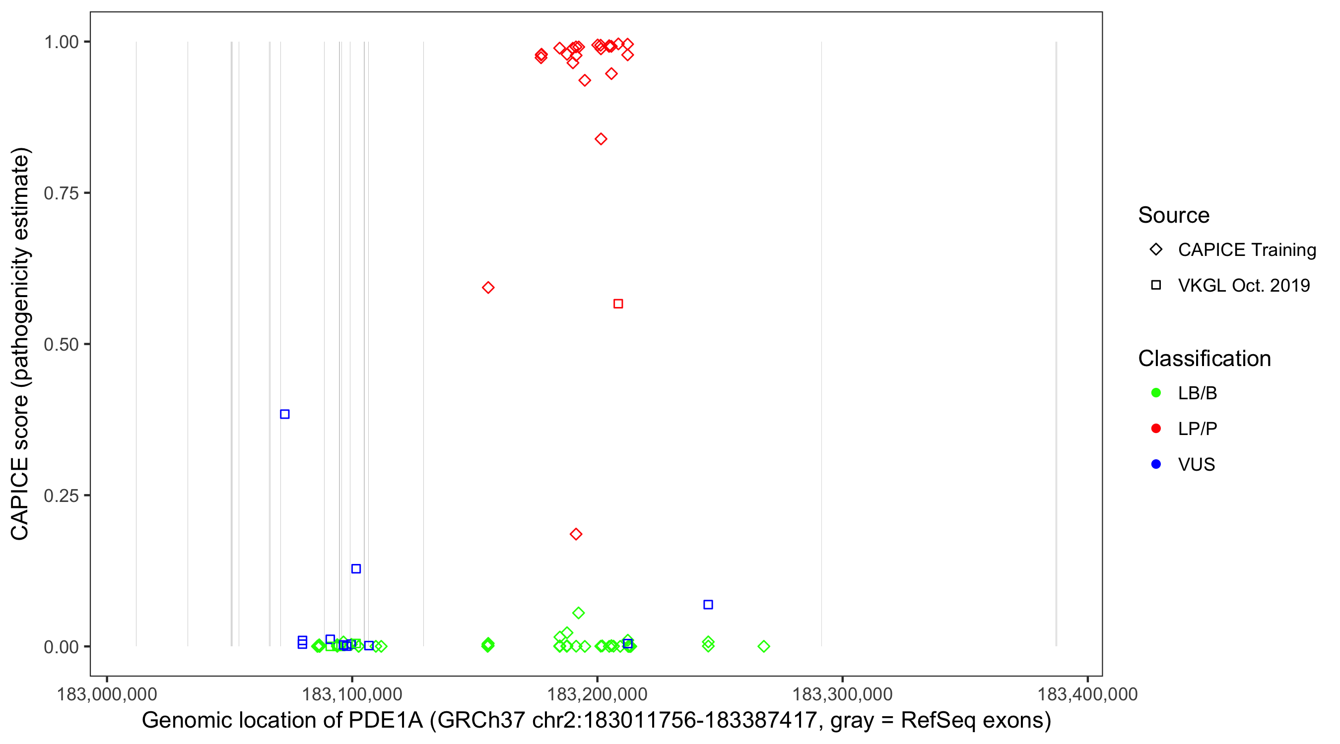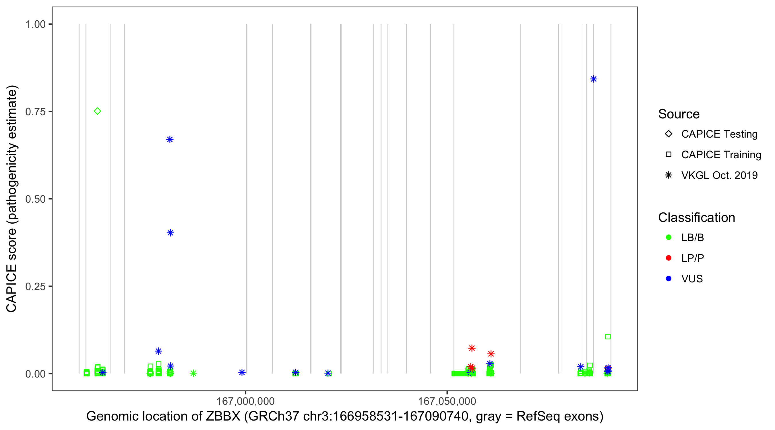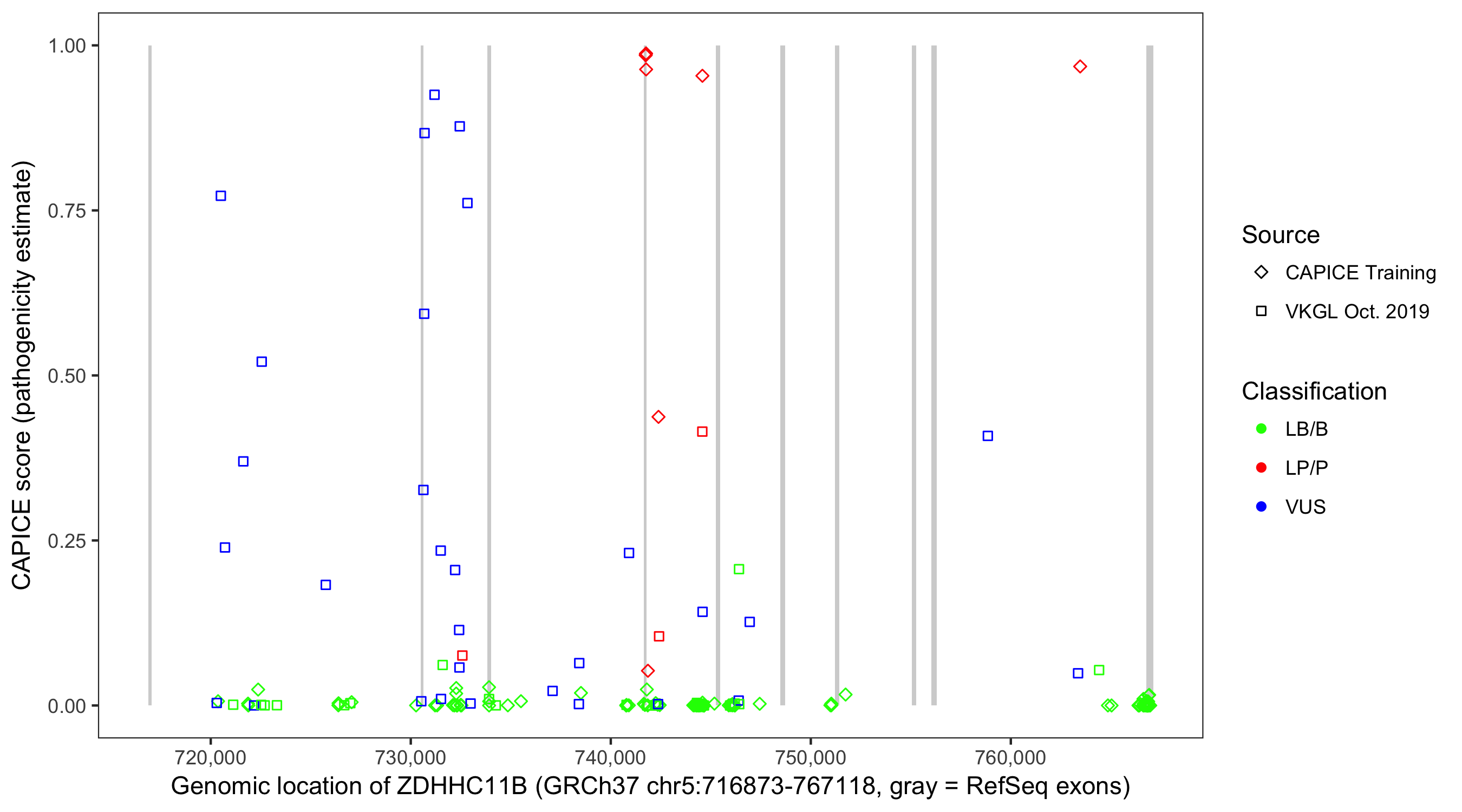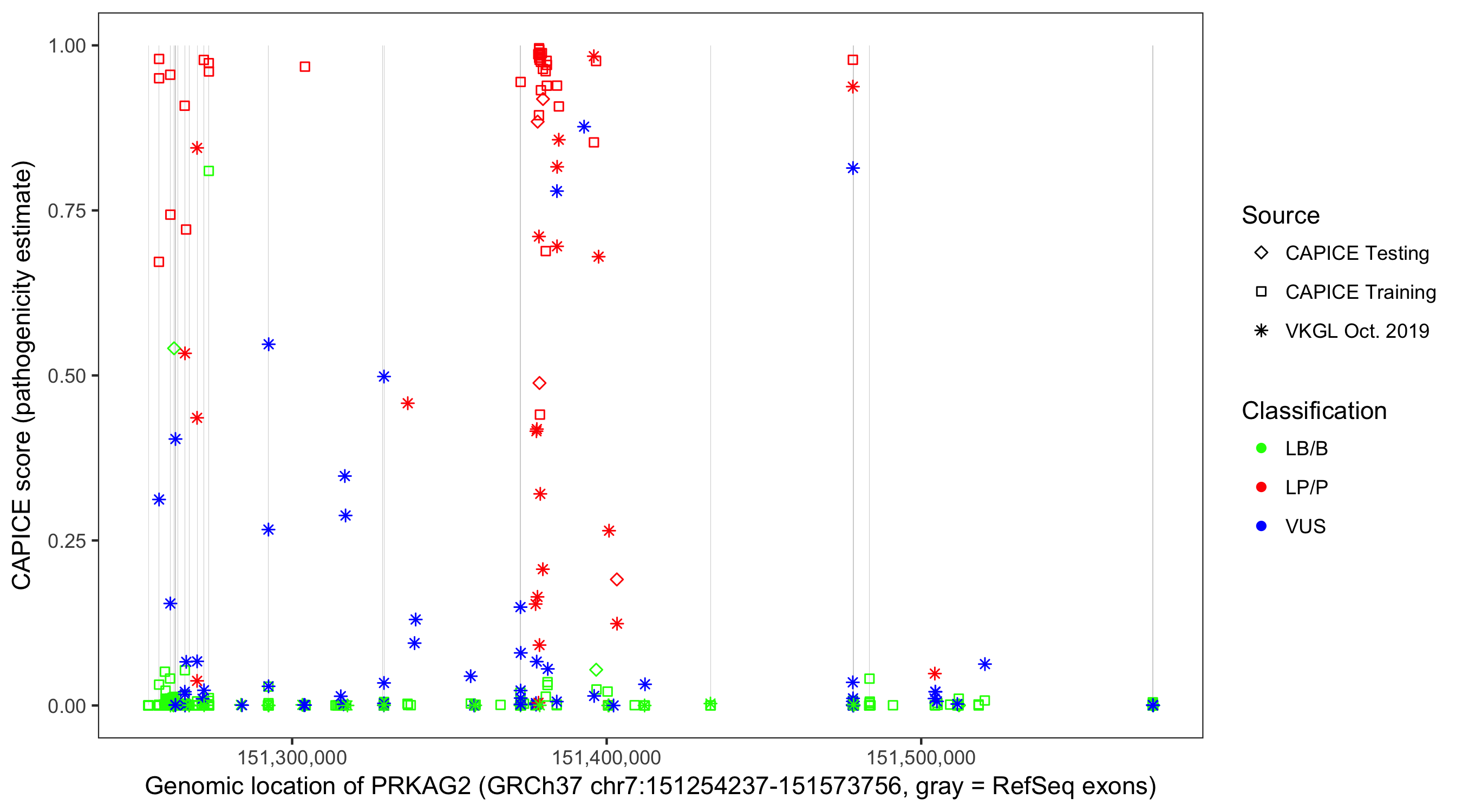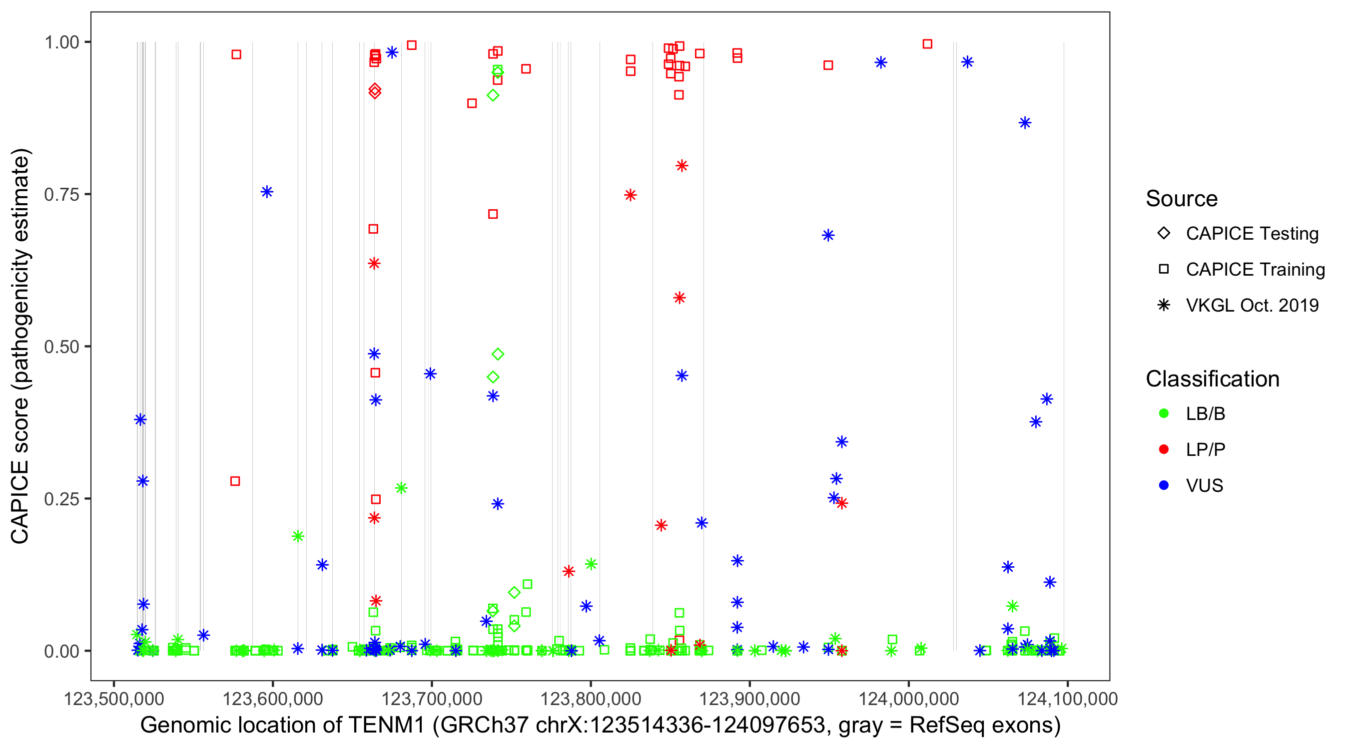 Shown are CAPICE train/test variants plus VKGL Oct 2019.