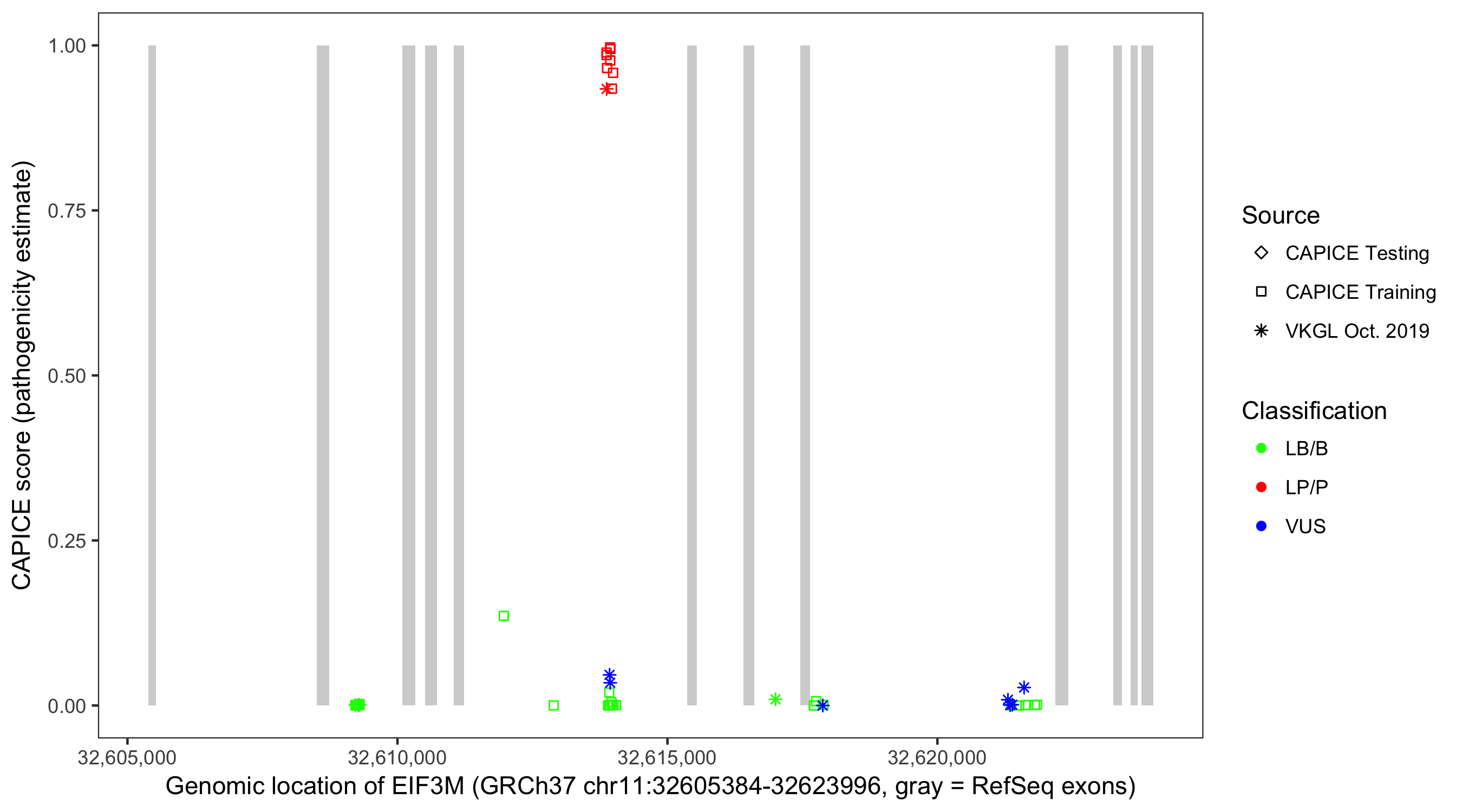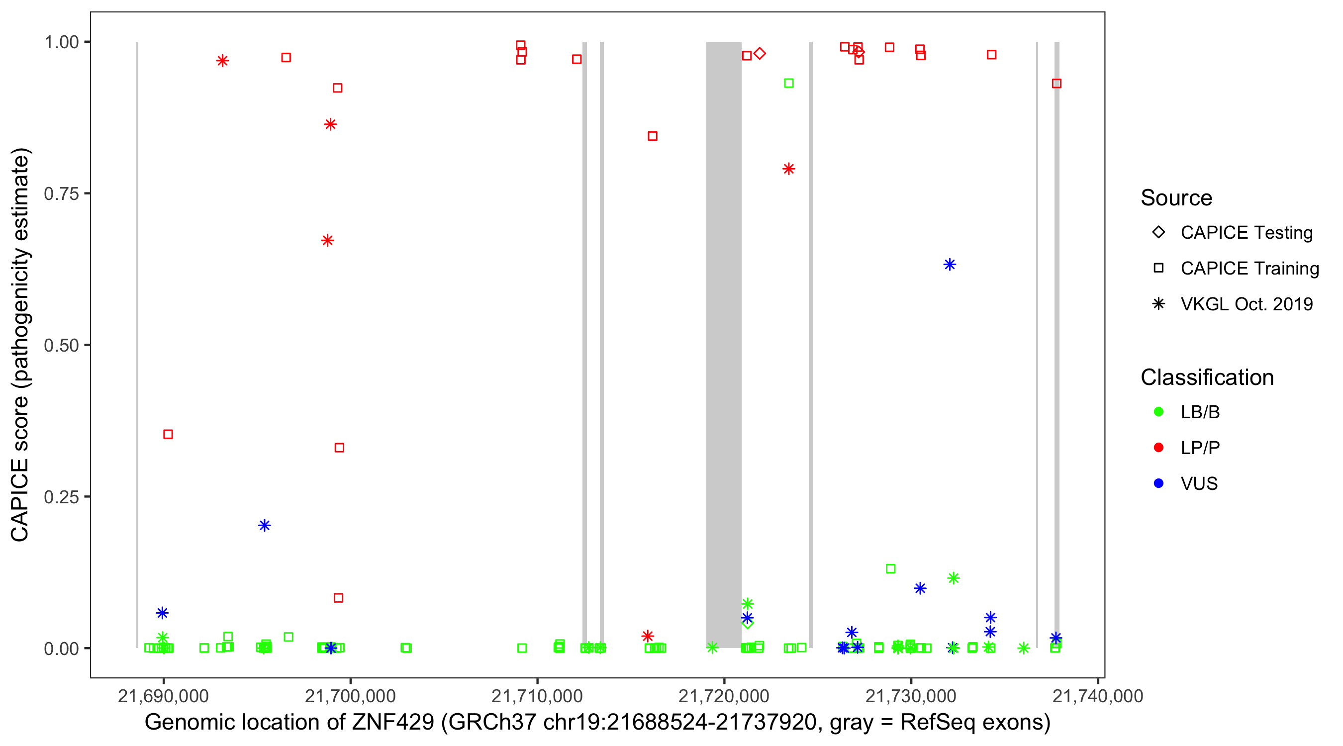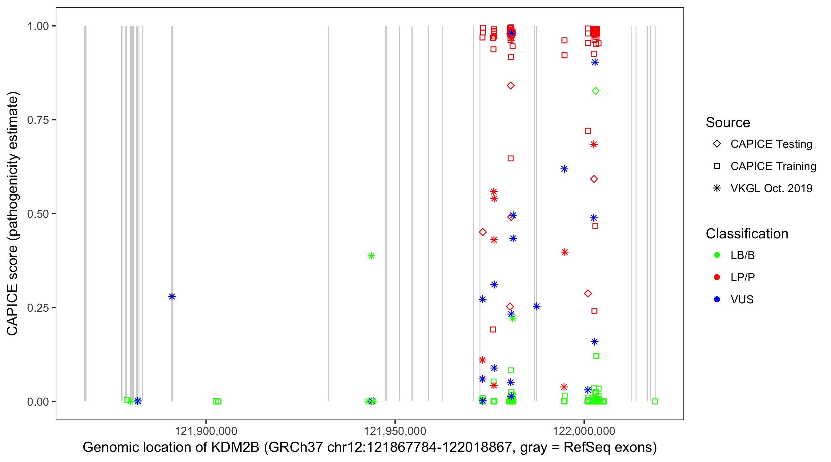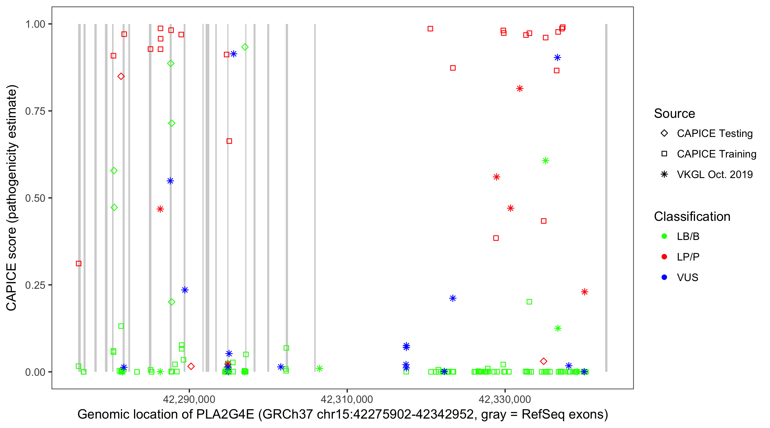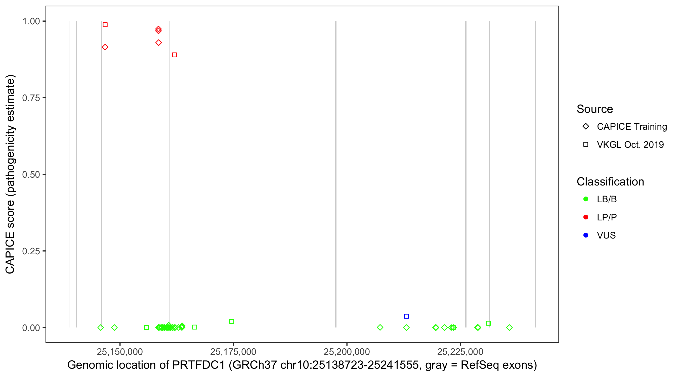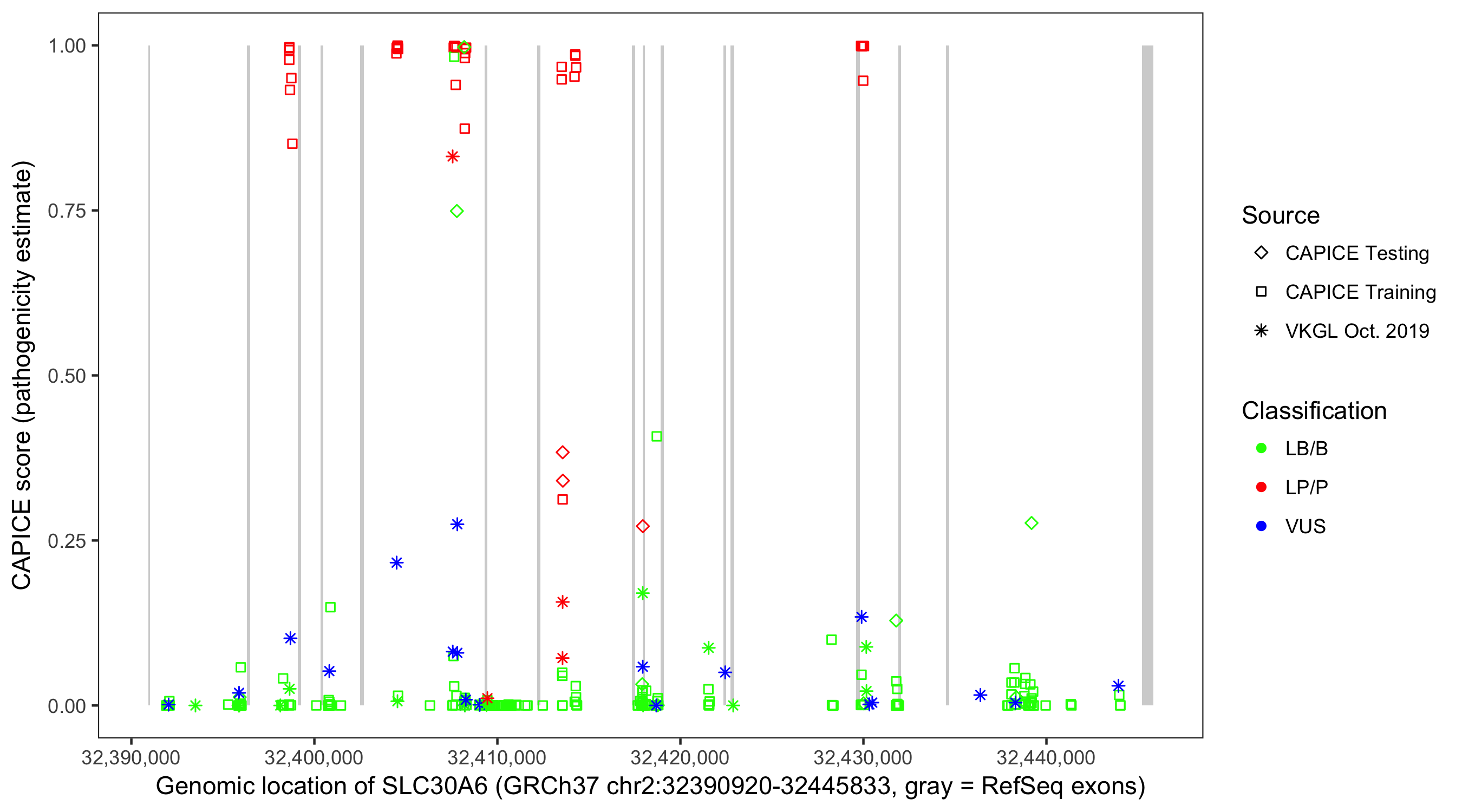 Shown are CAPICE train/test variants plus VKGL Oct 2019.