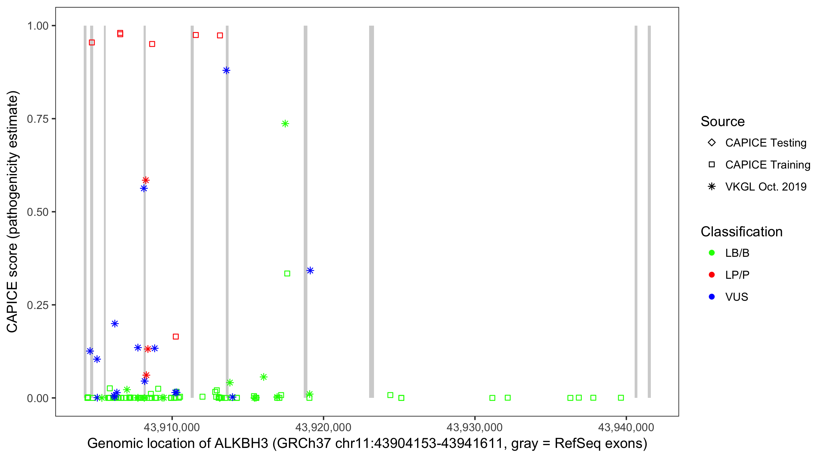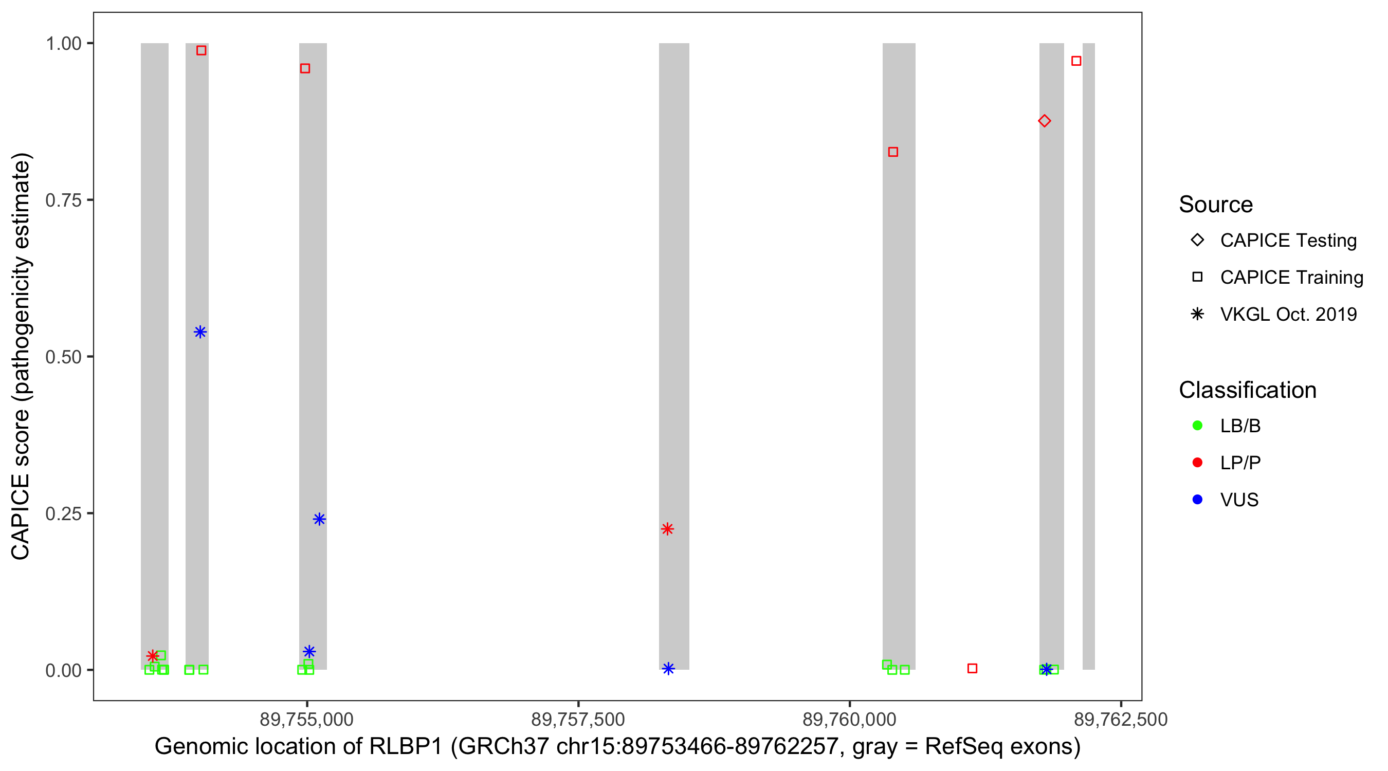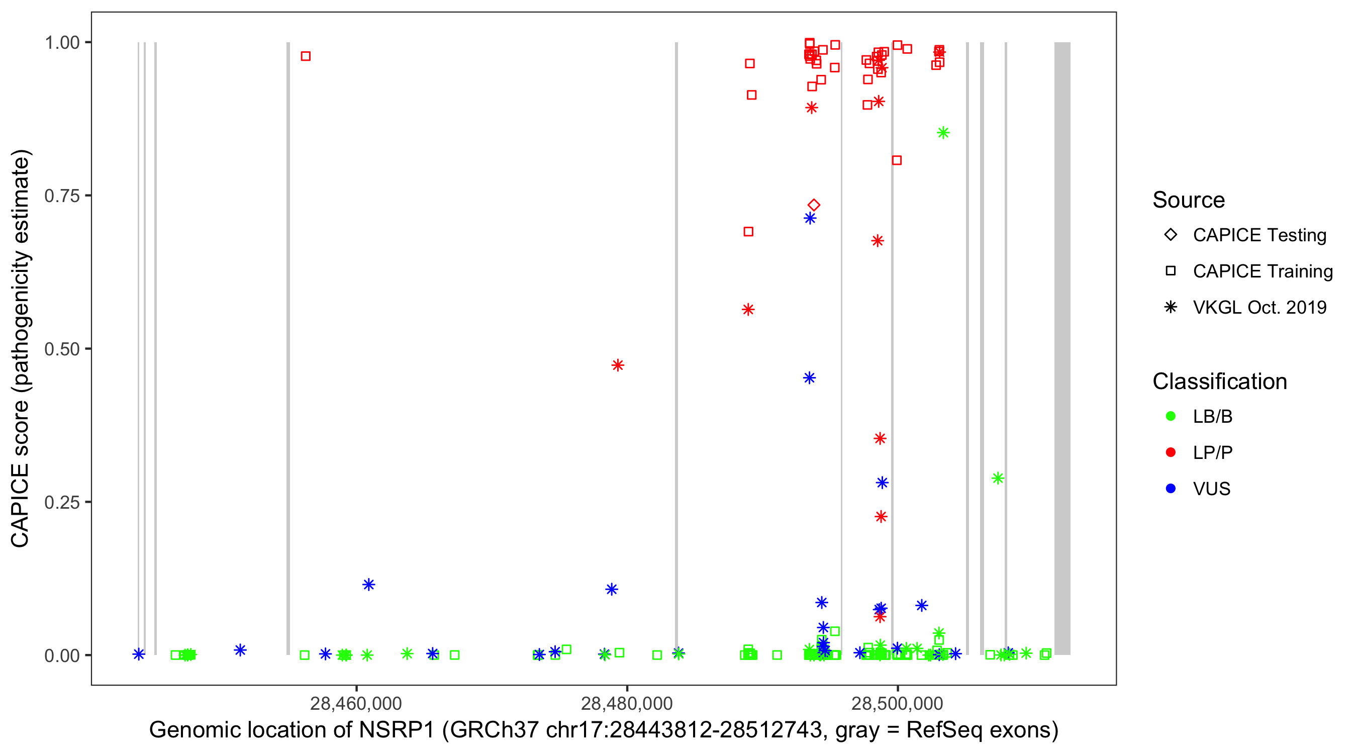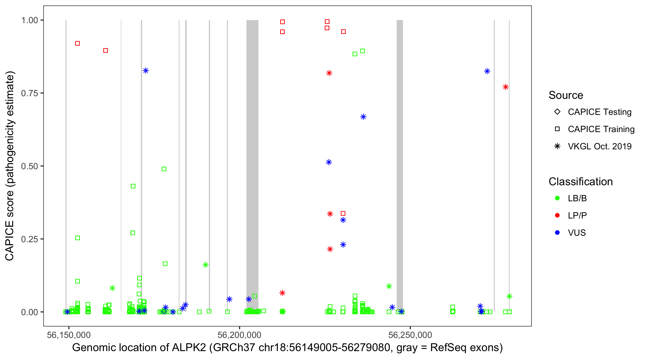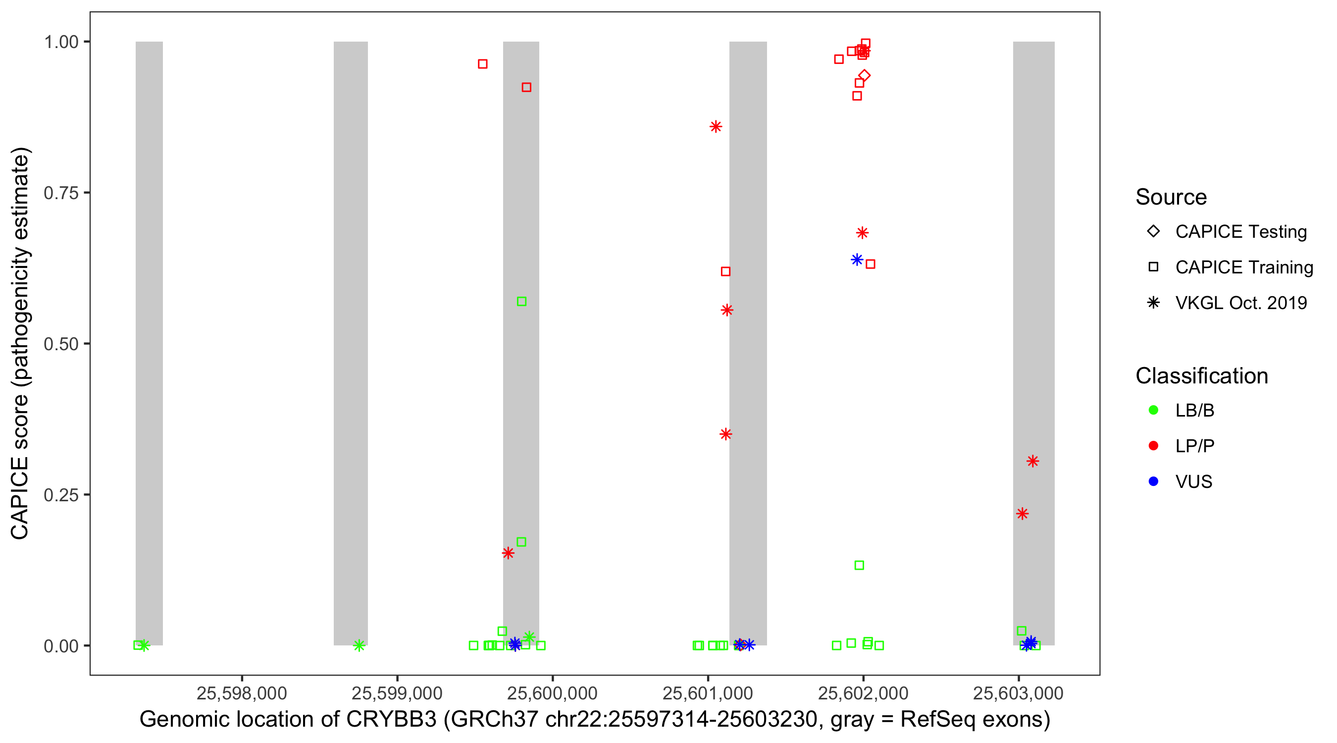 Shown are CAPICE train/test variants plus VKGL Oct 2019.