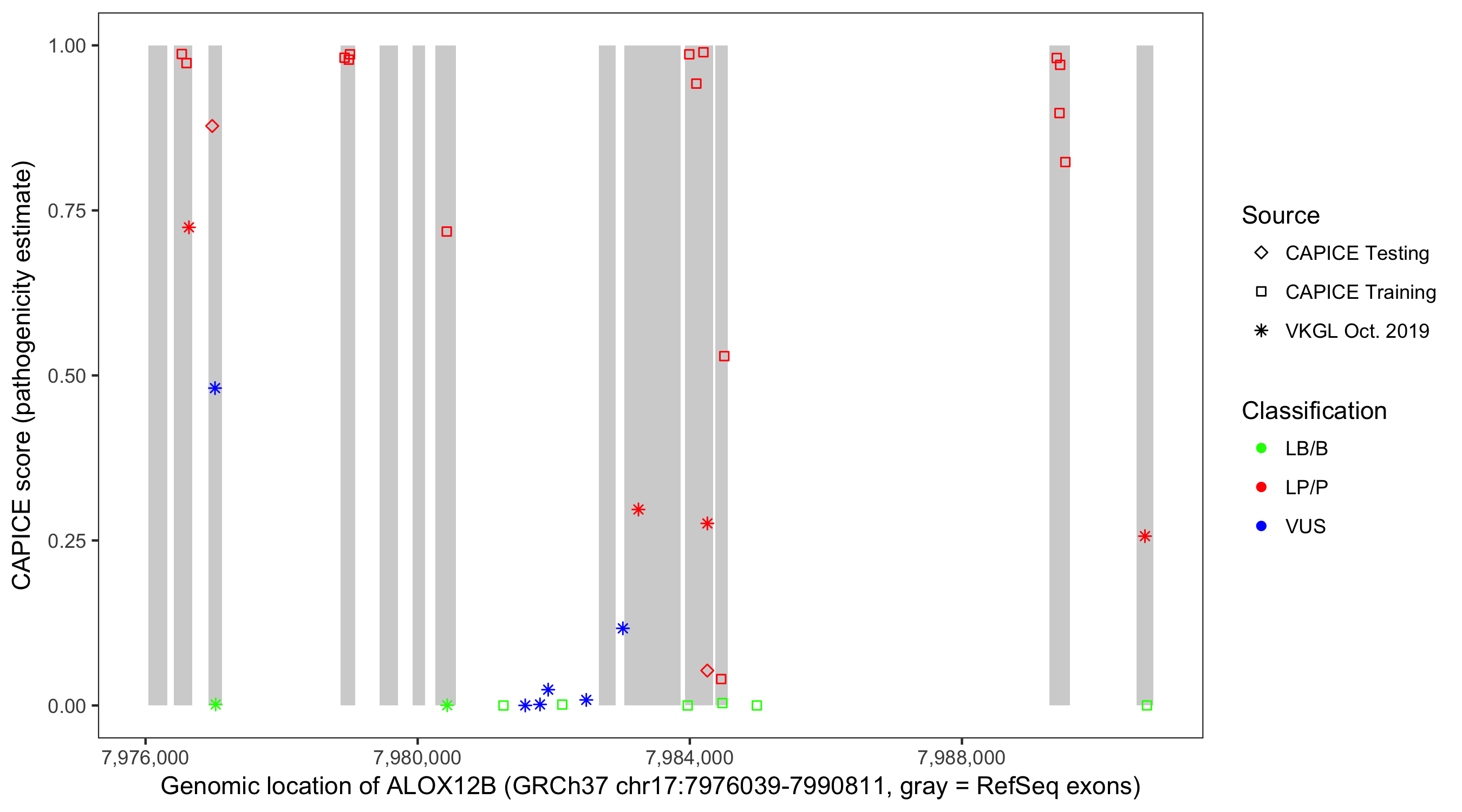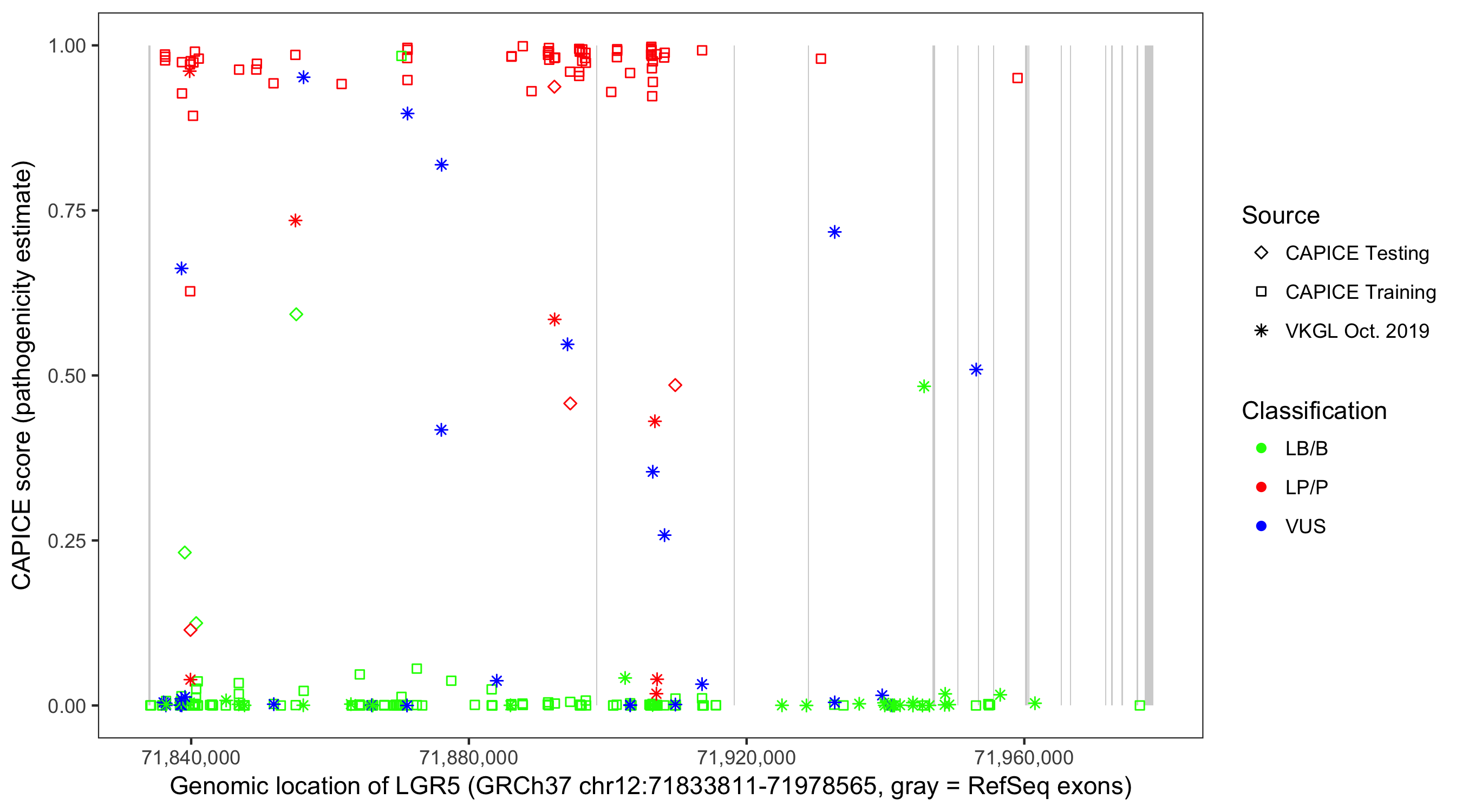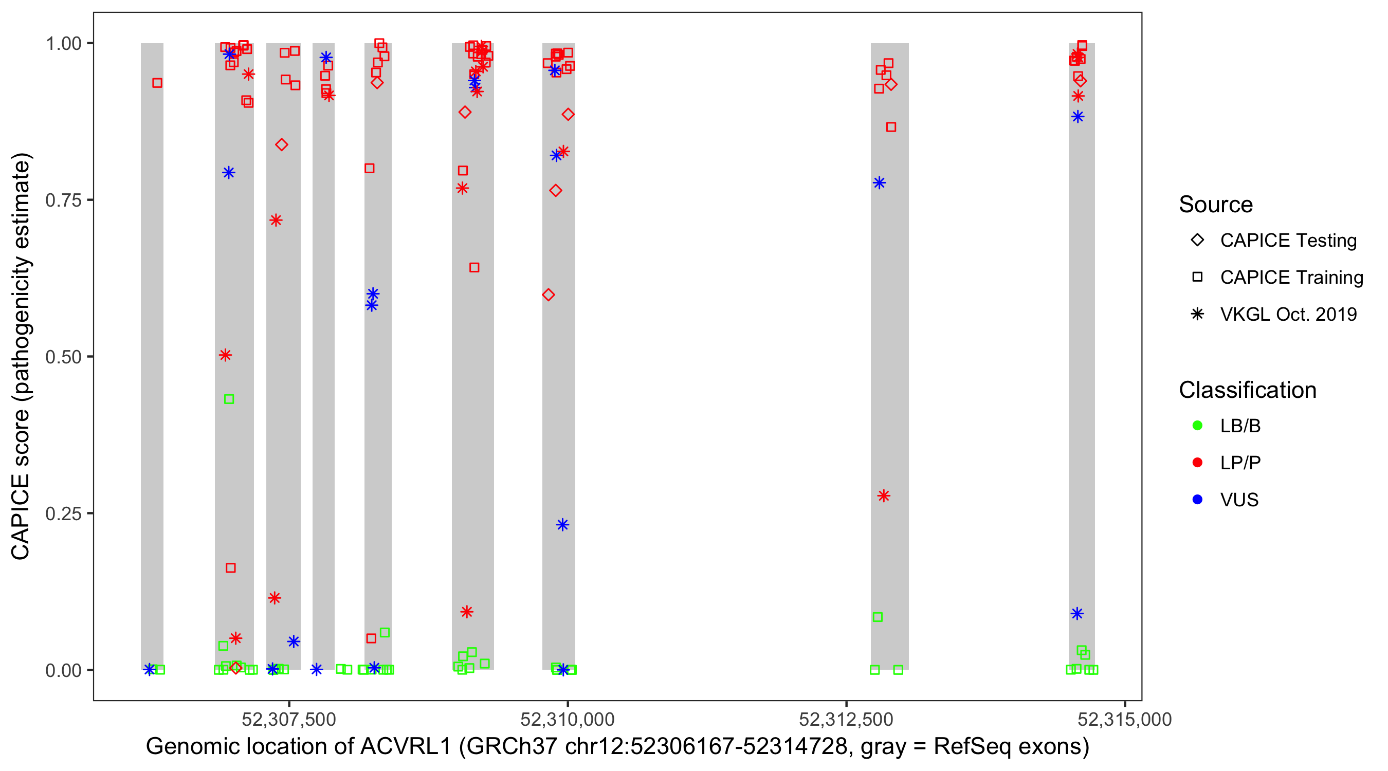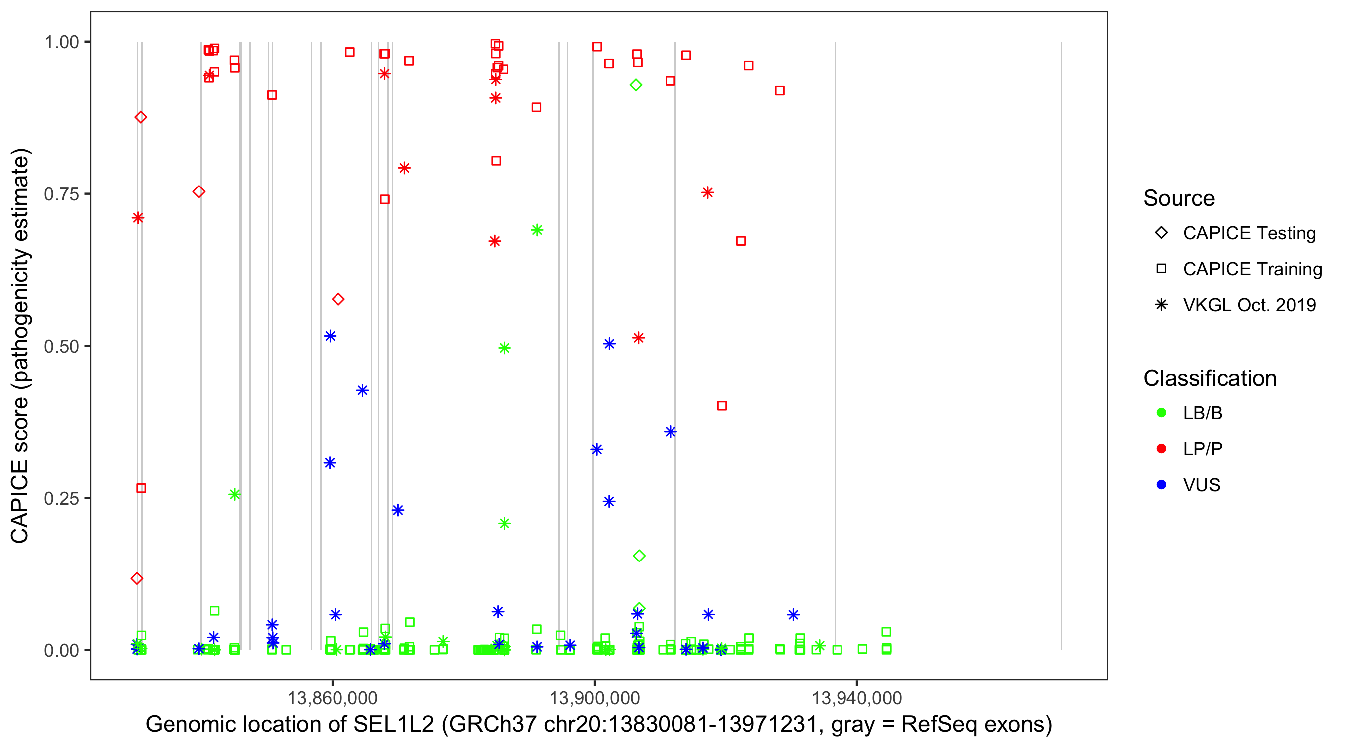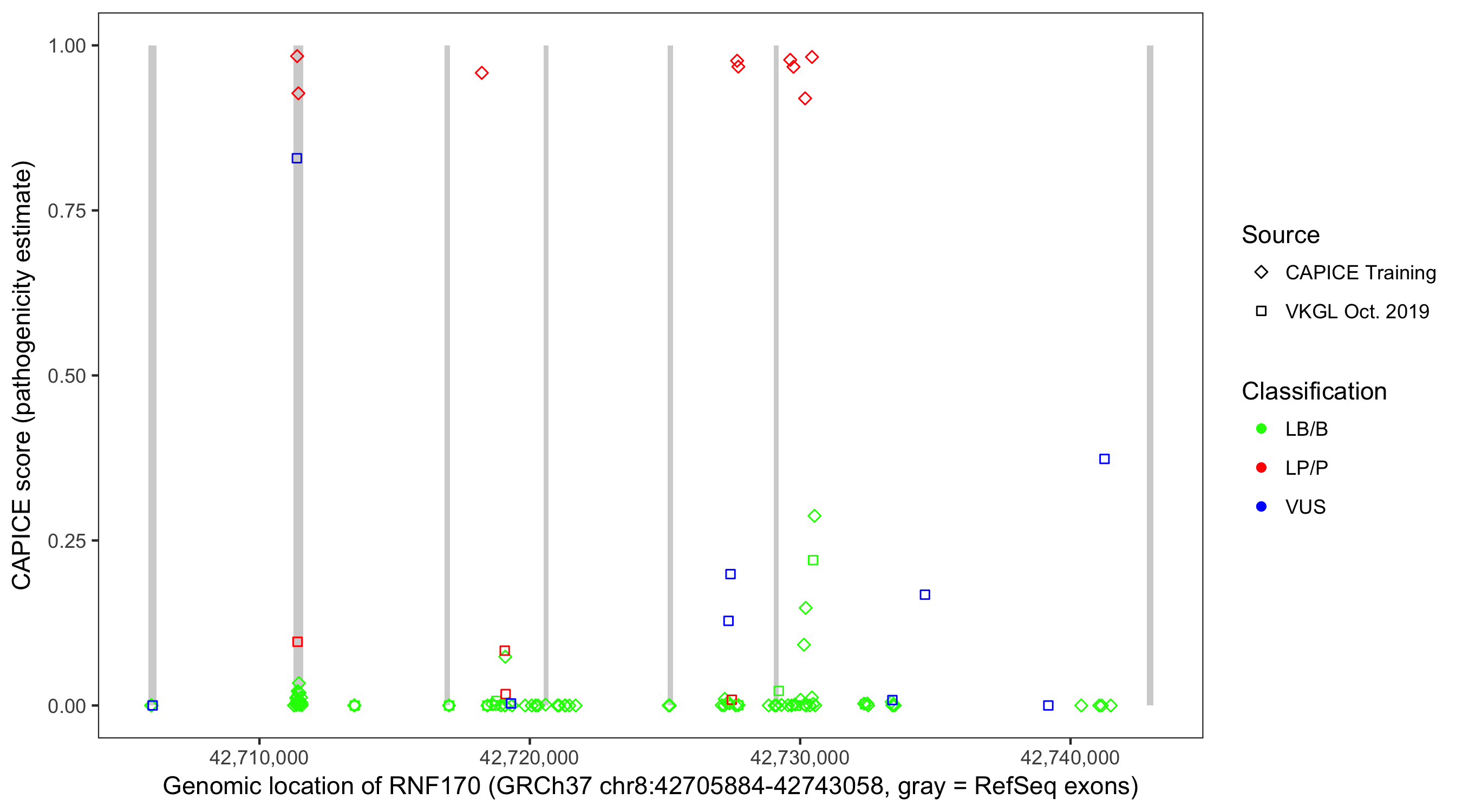 Shown are CAPICE train/test variants plus VKGL Oct 2019.