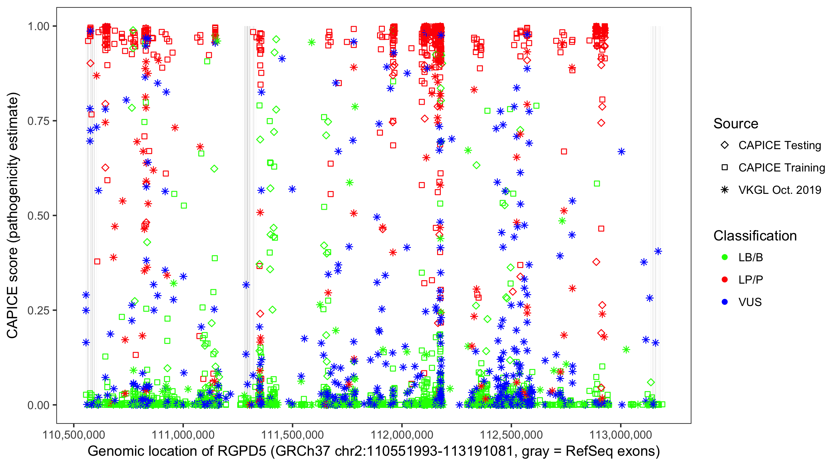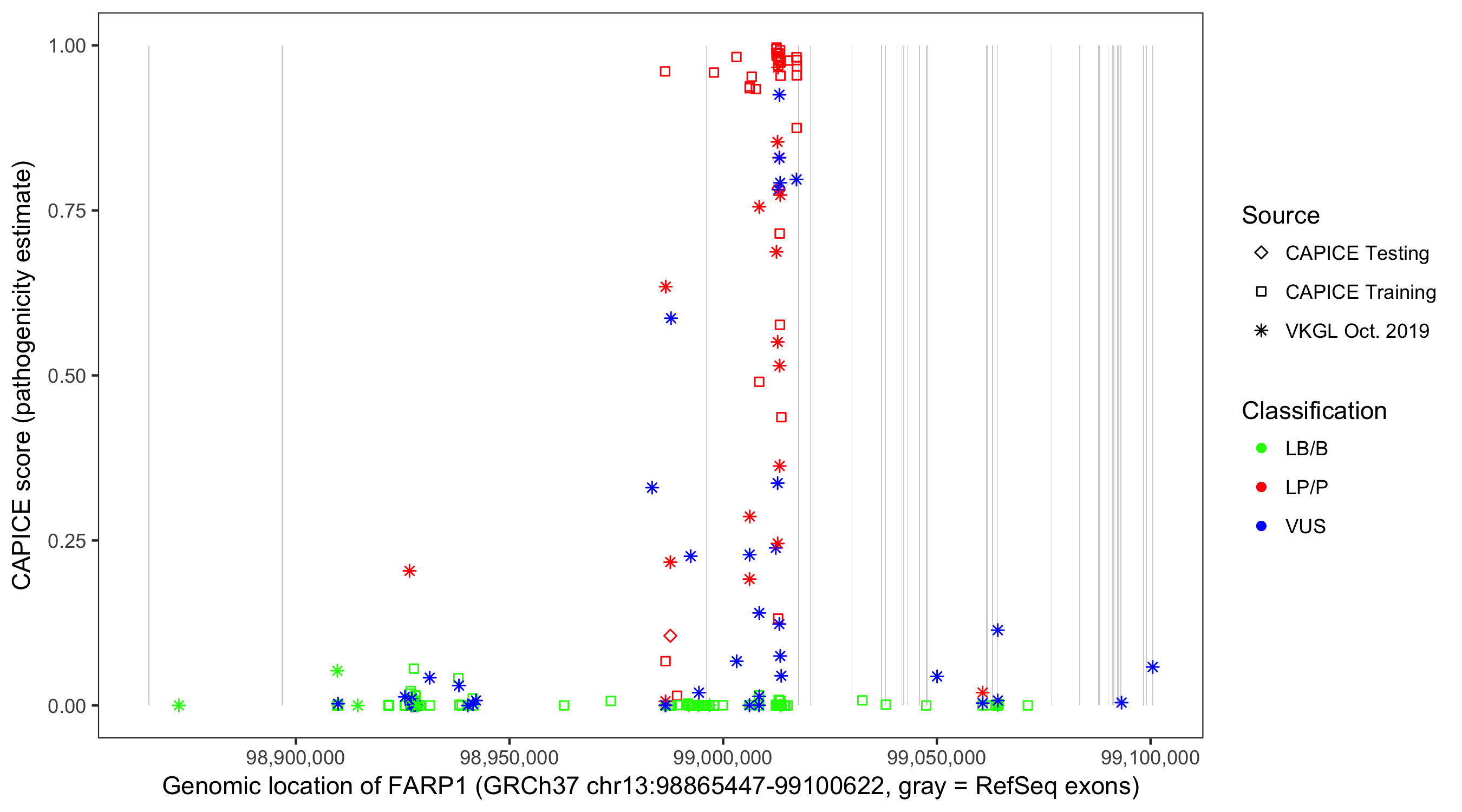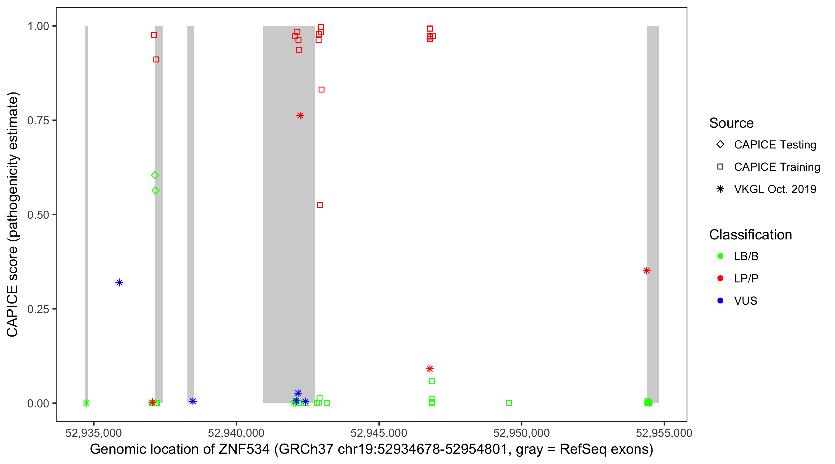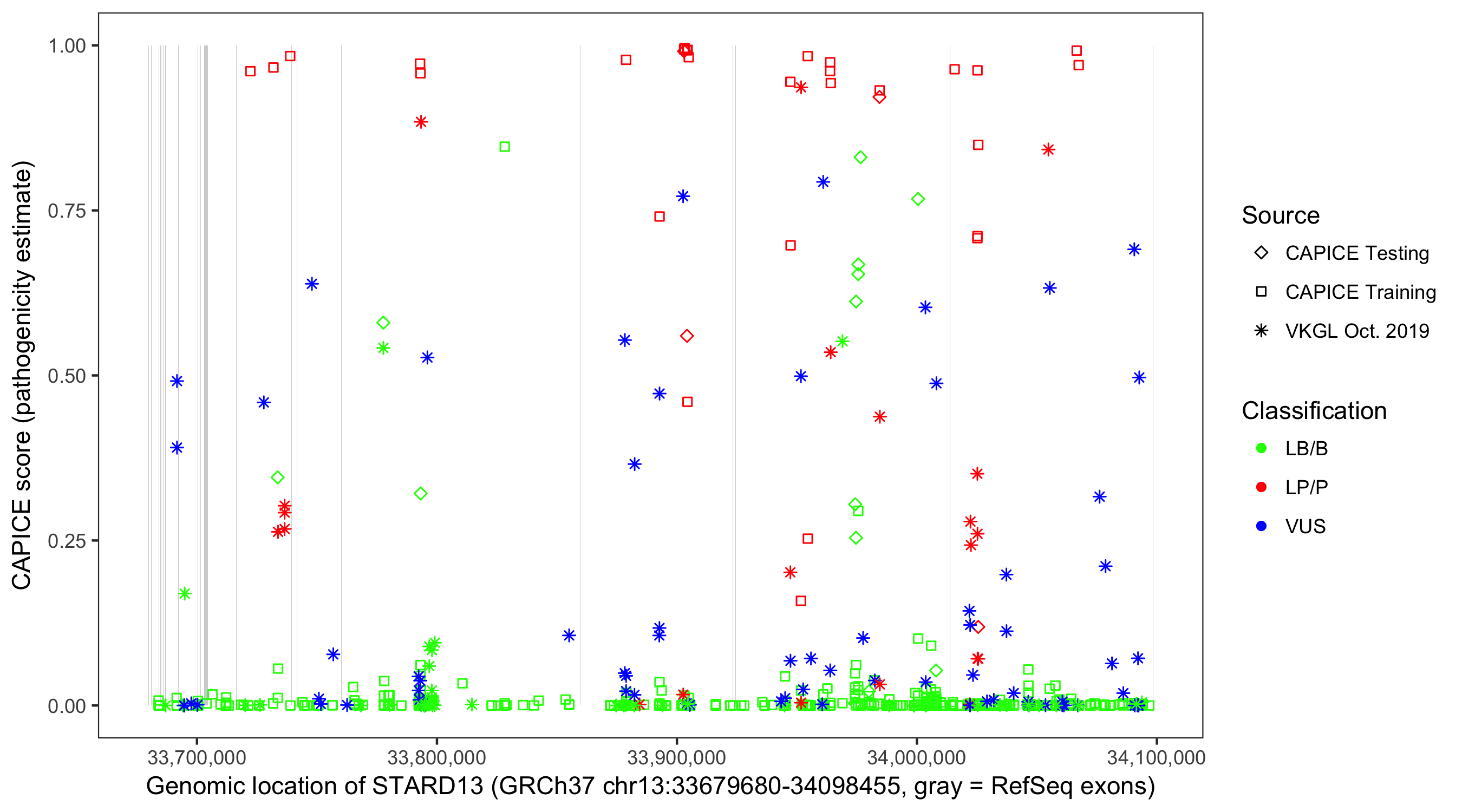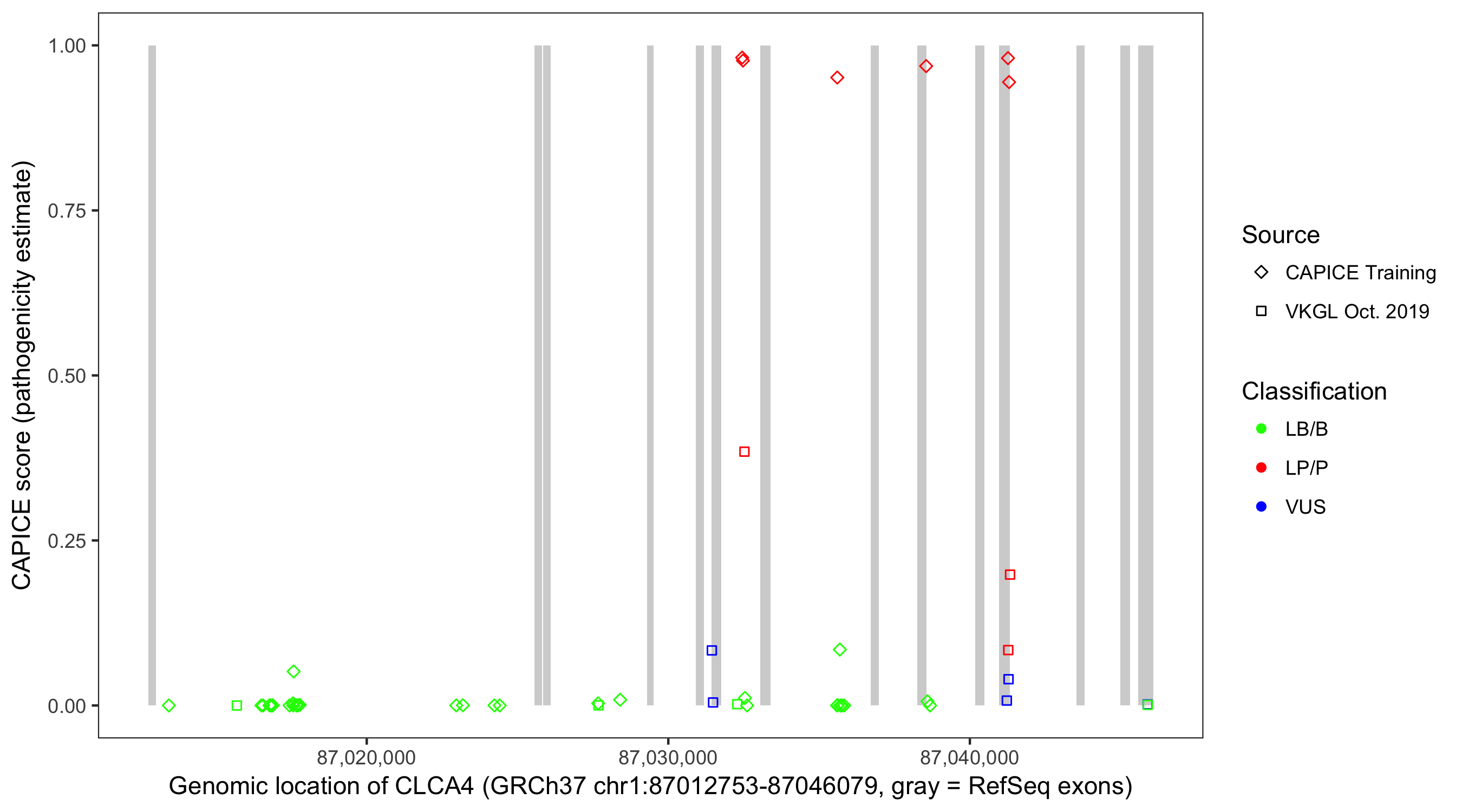 Shown are CAPICE train/test variants plus VKGL Oct 2019.