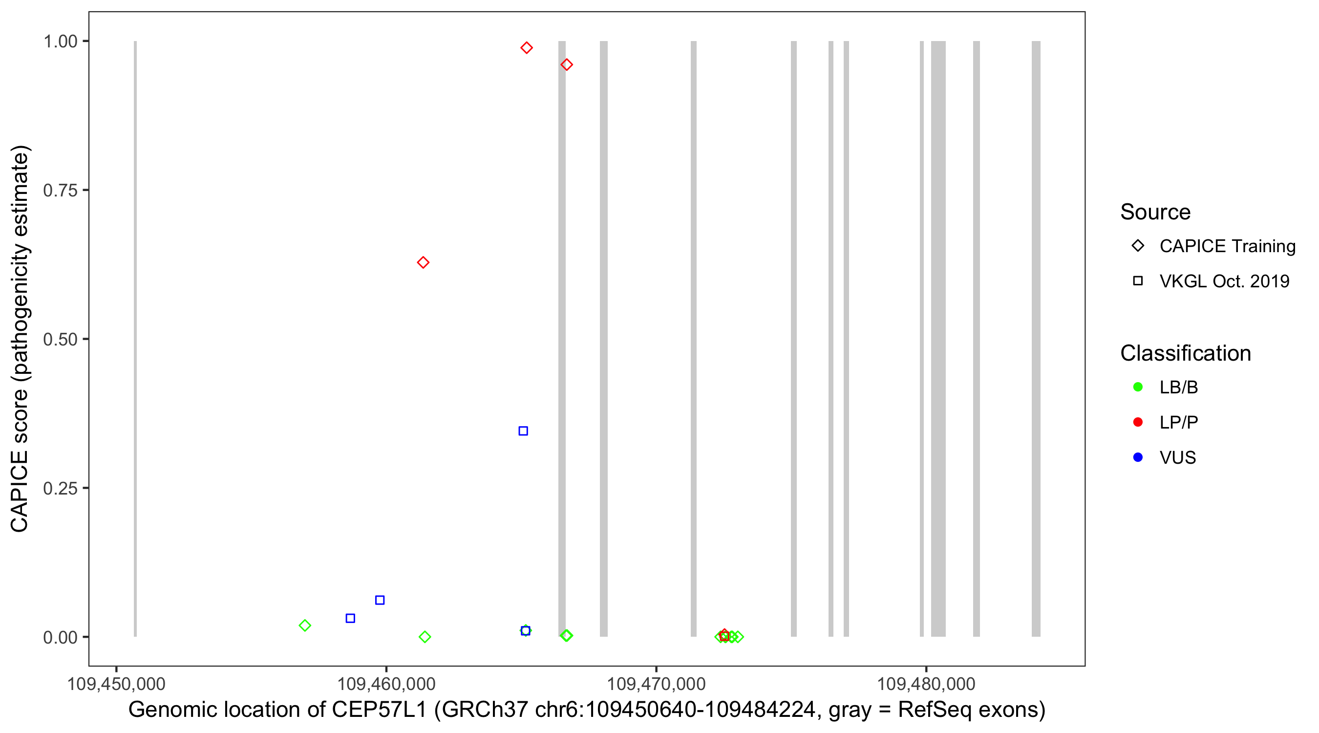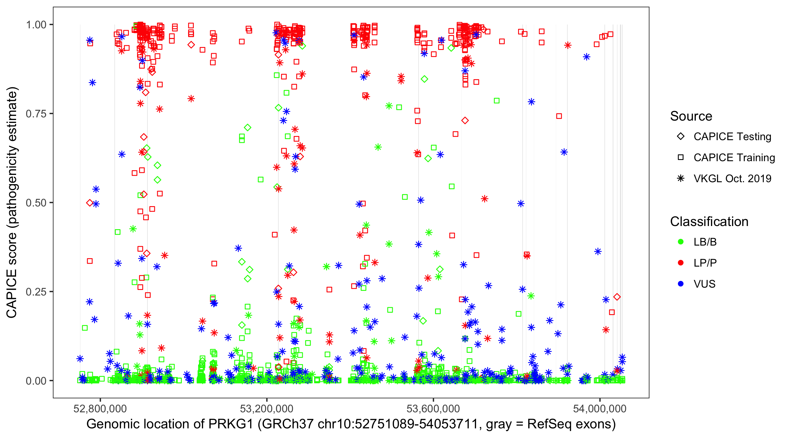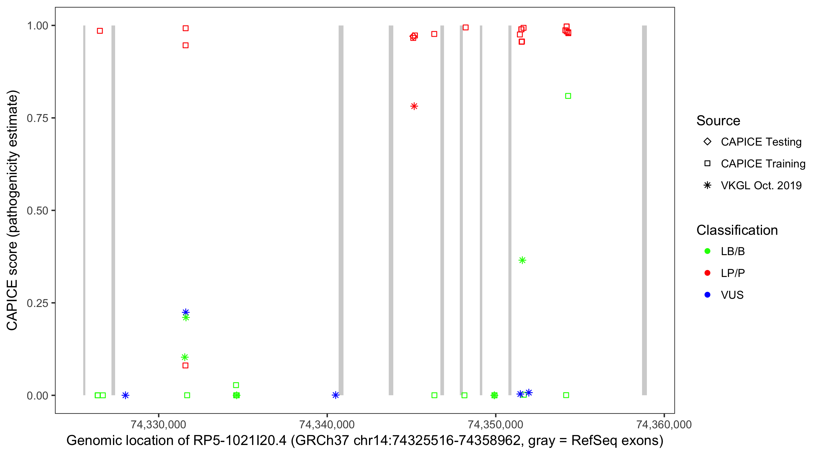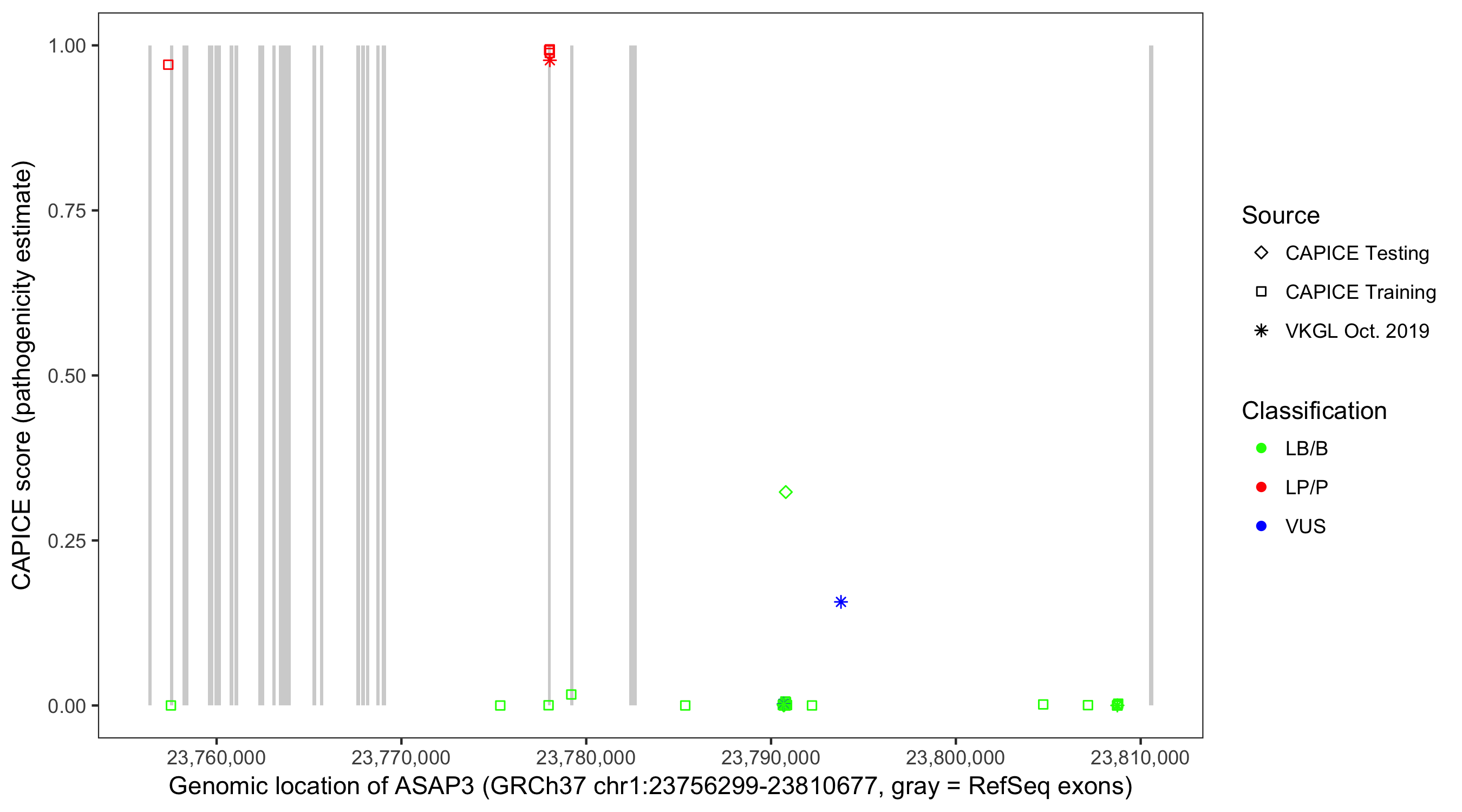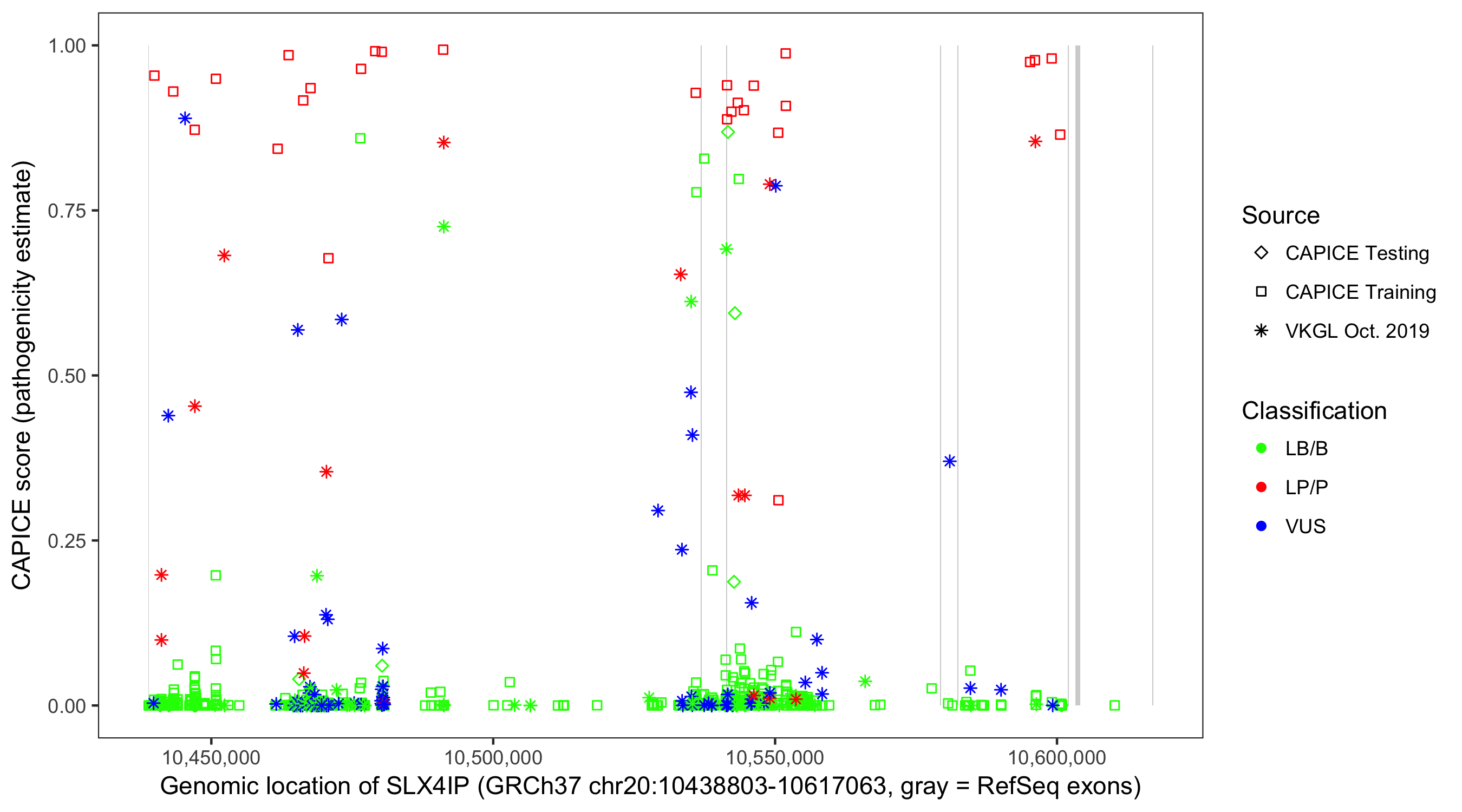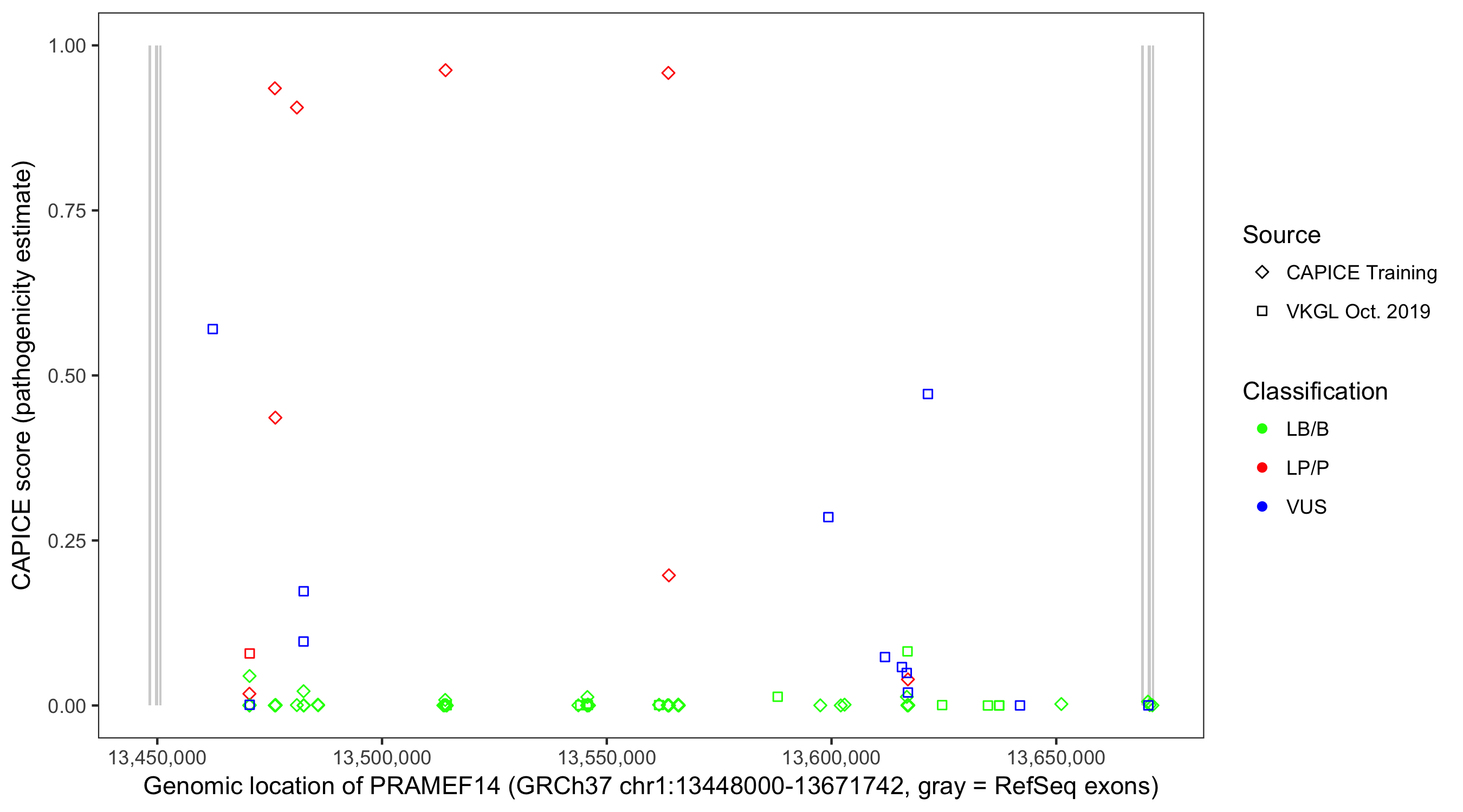 Shown are CAPICE train/test variants plus VKGL Oct 2019.