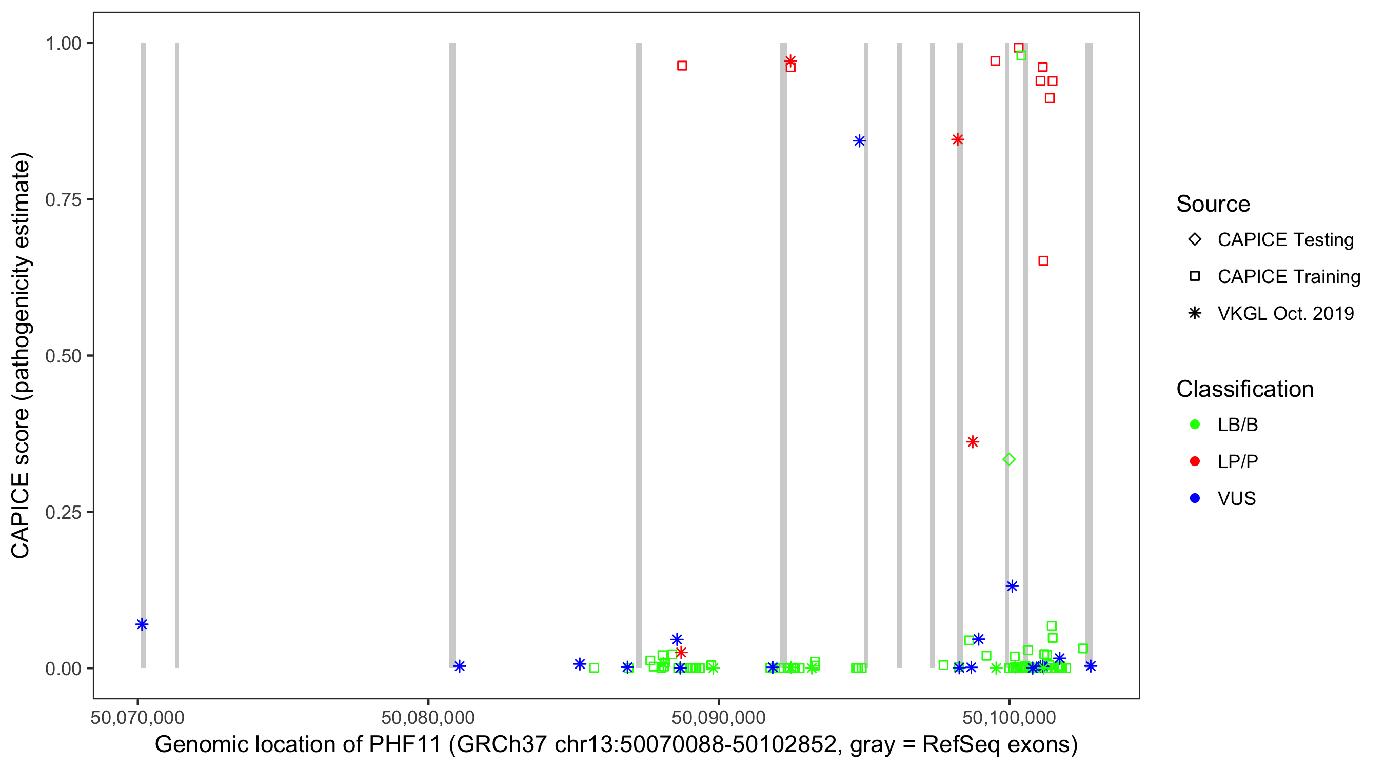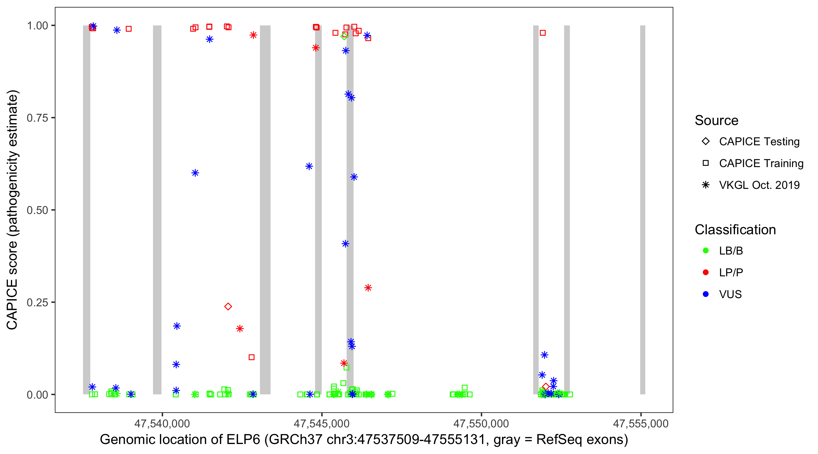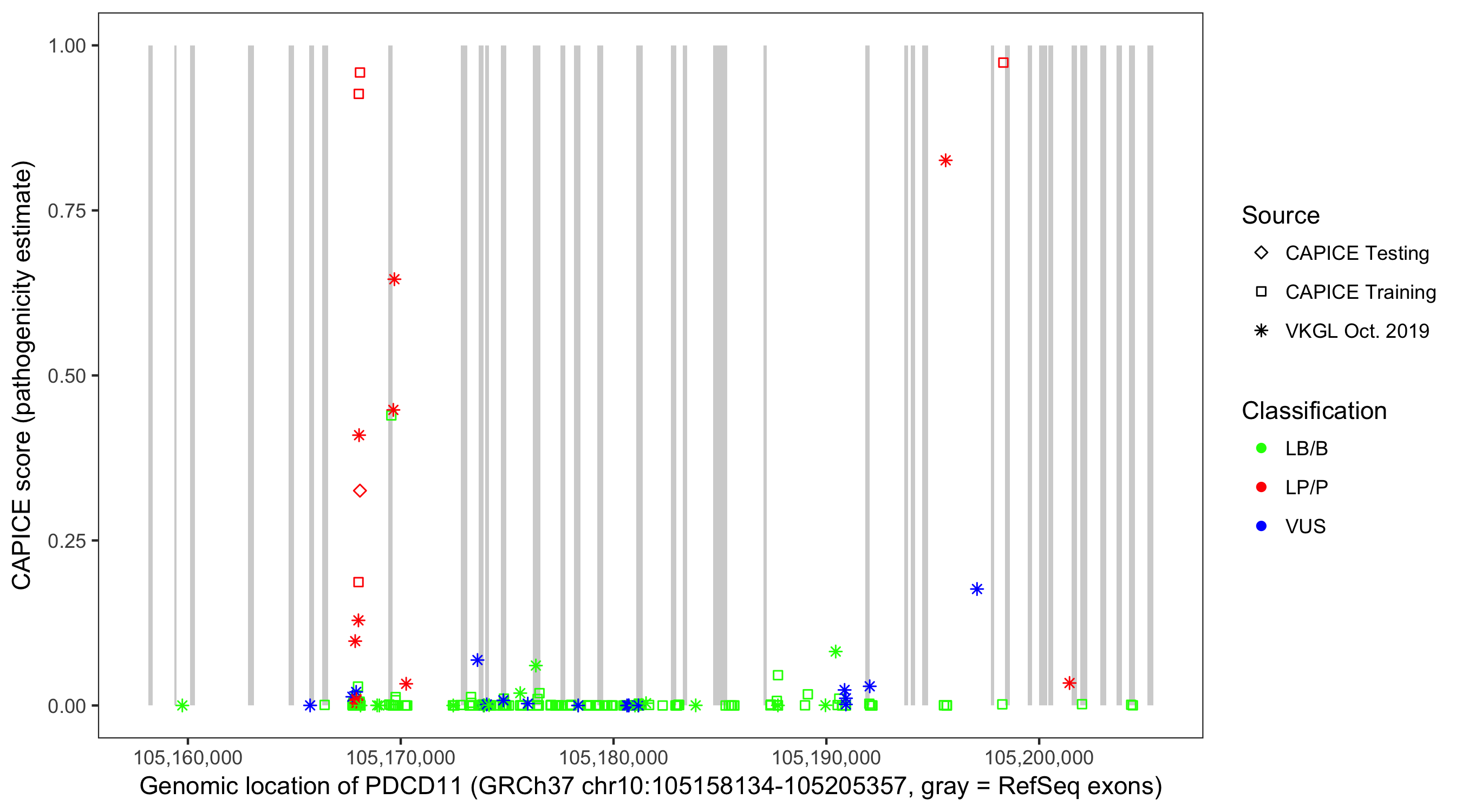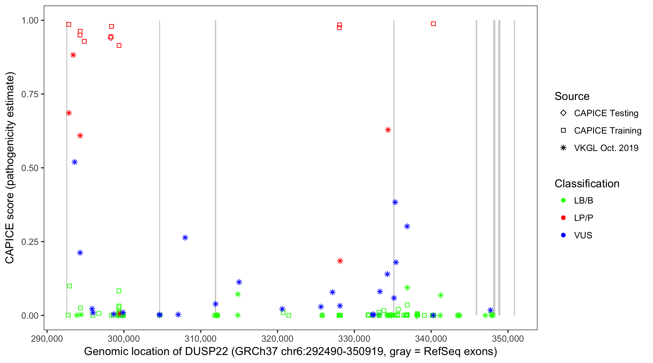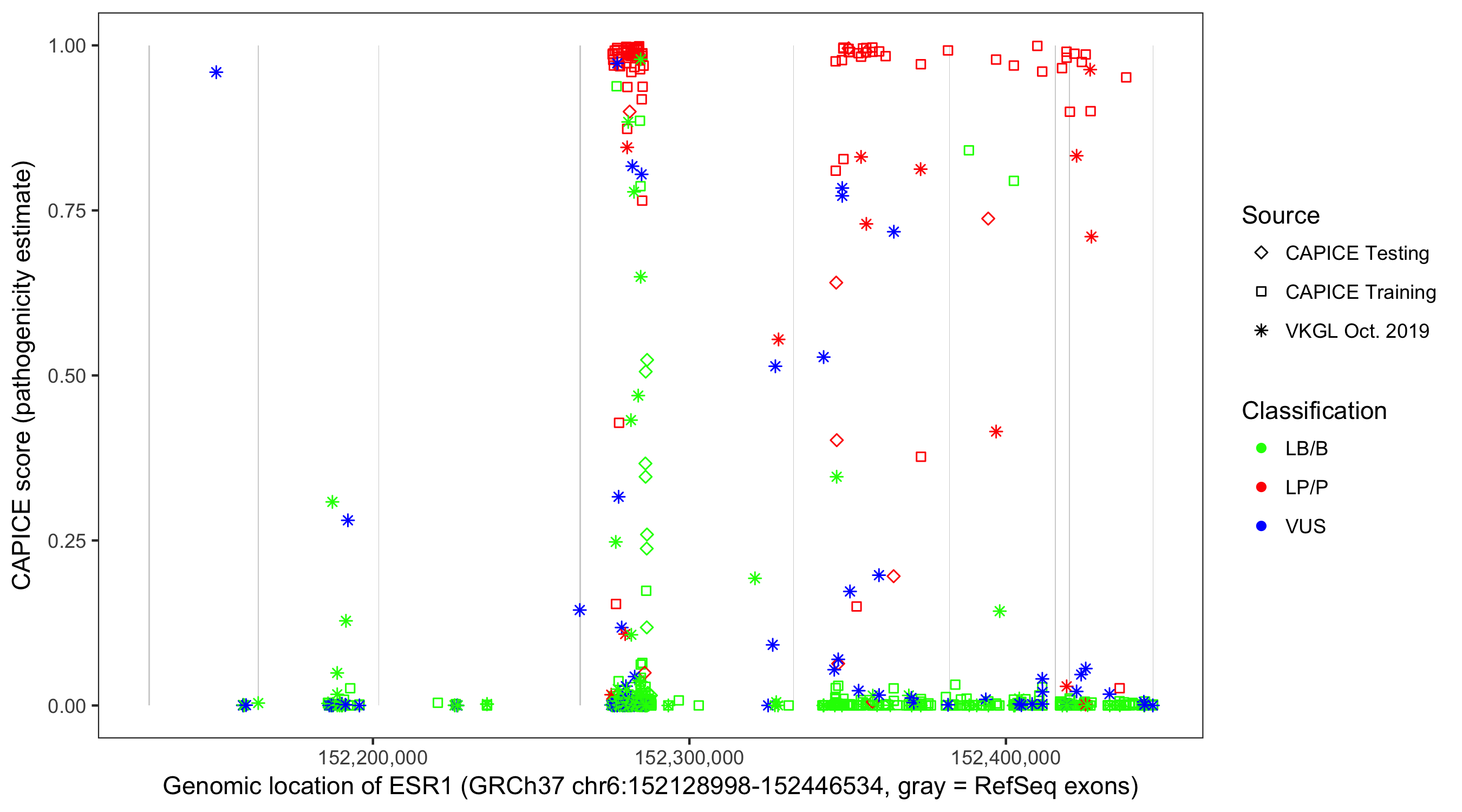 Shown are CAPICE train/test variants plus VKGL Oct 2019.