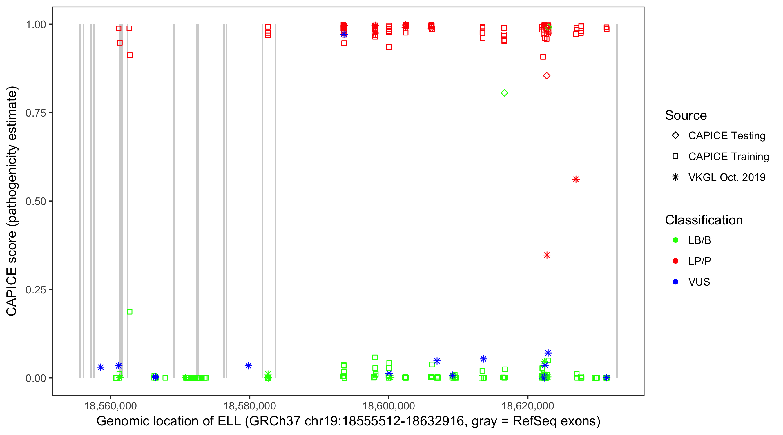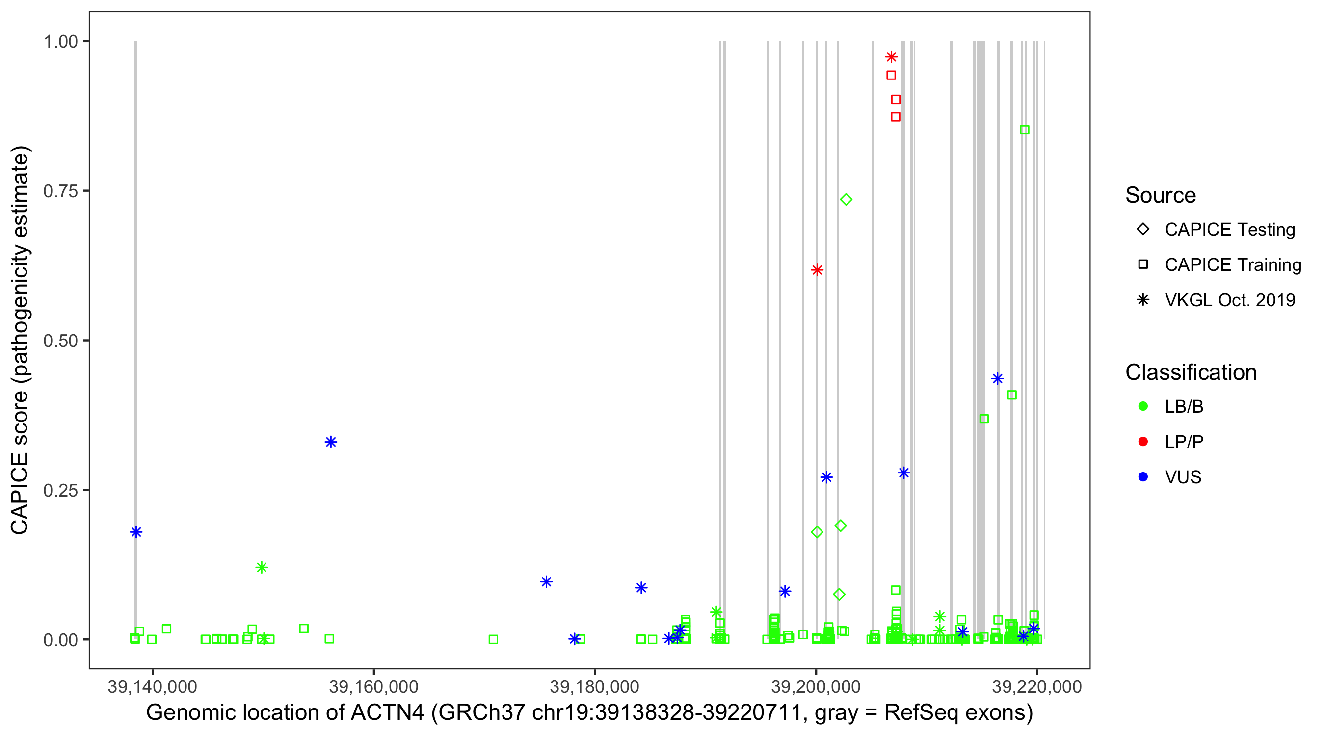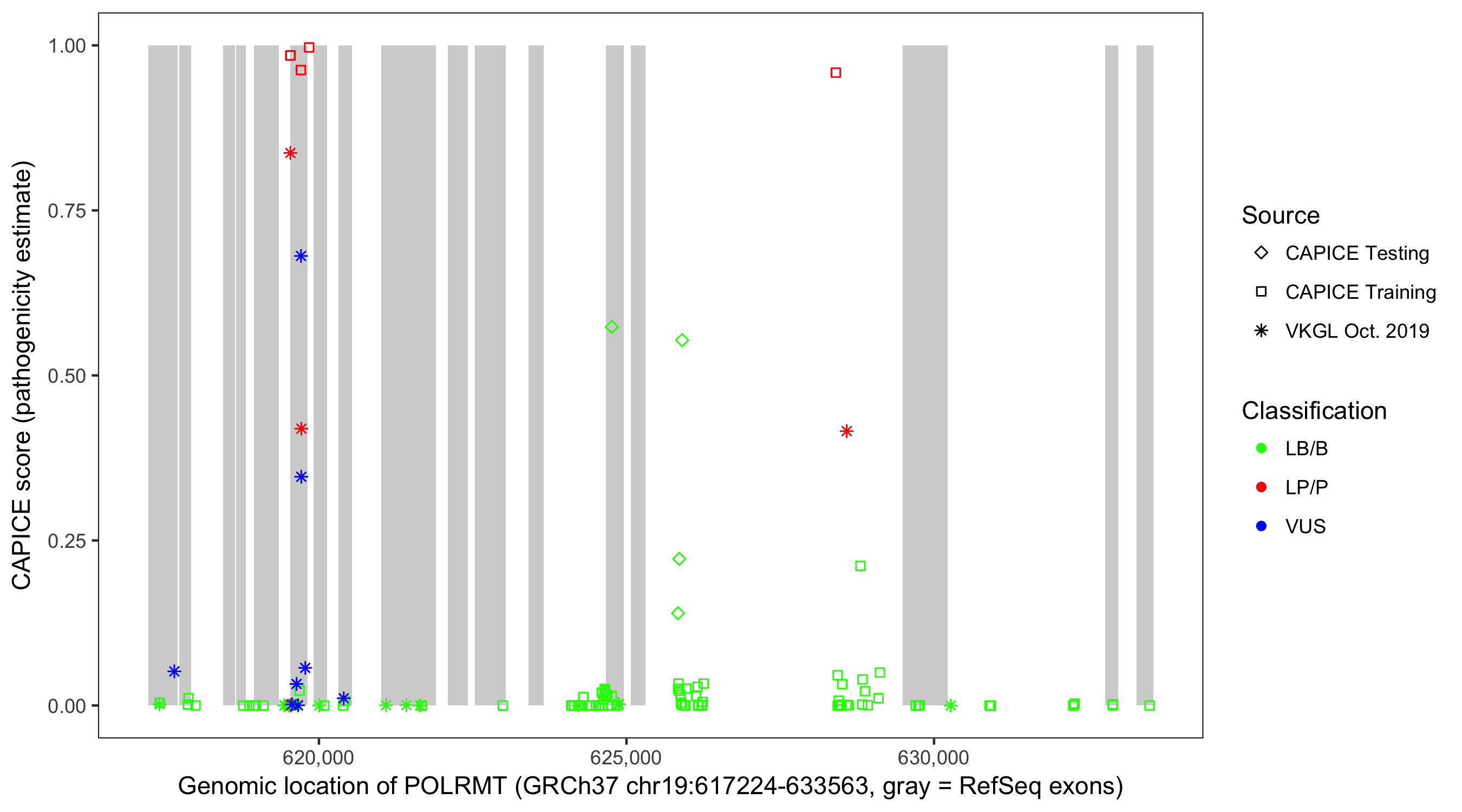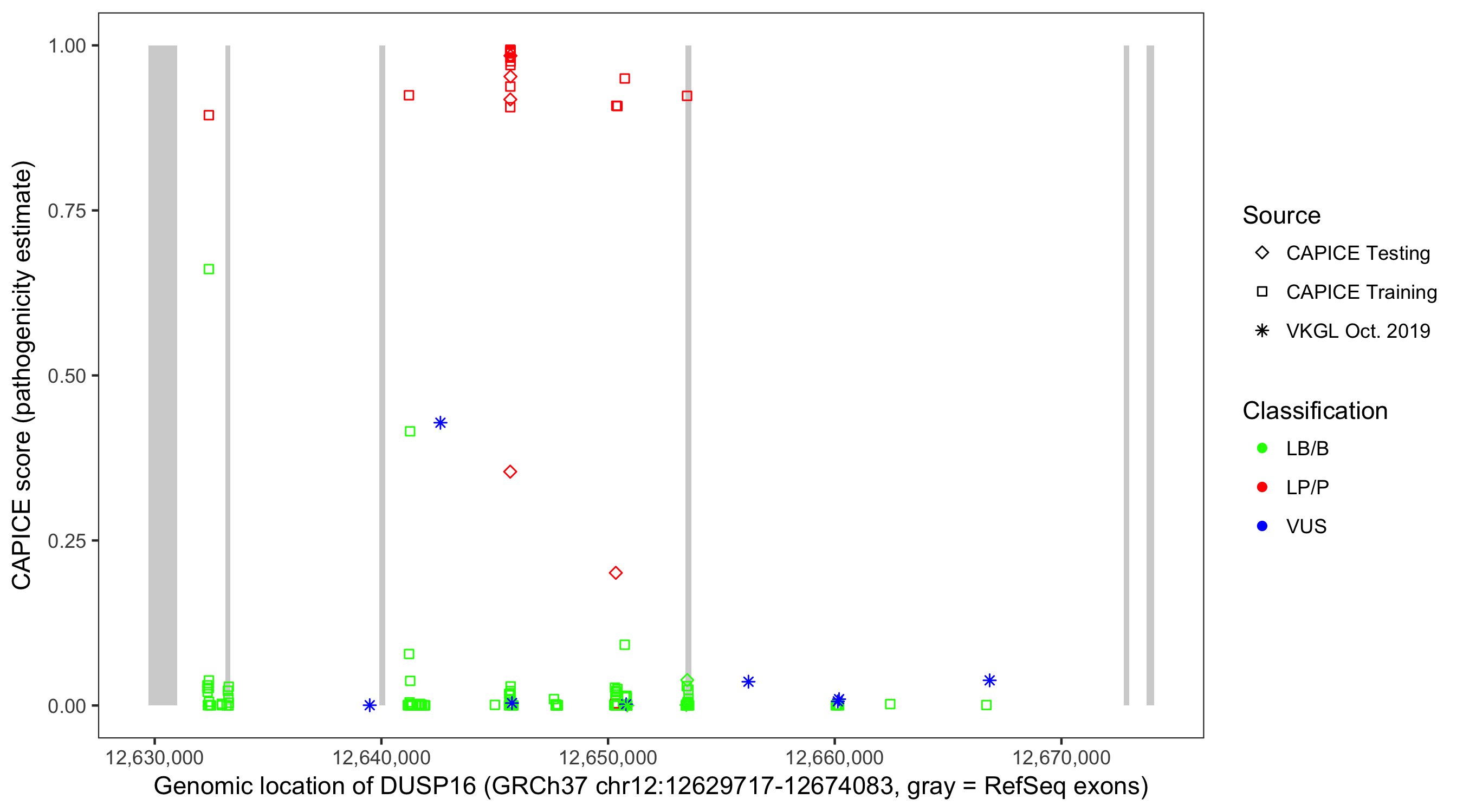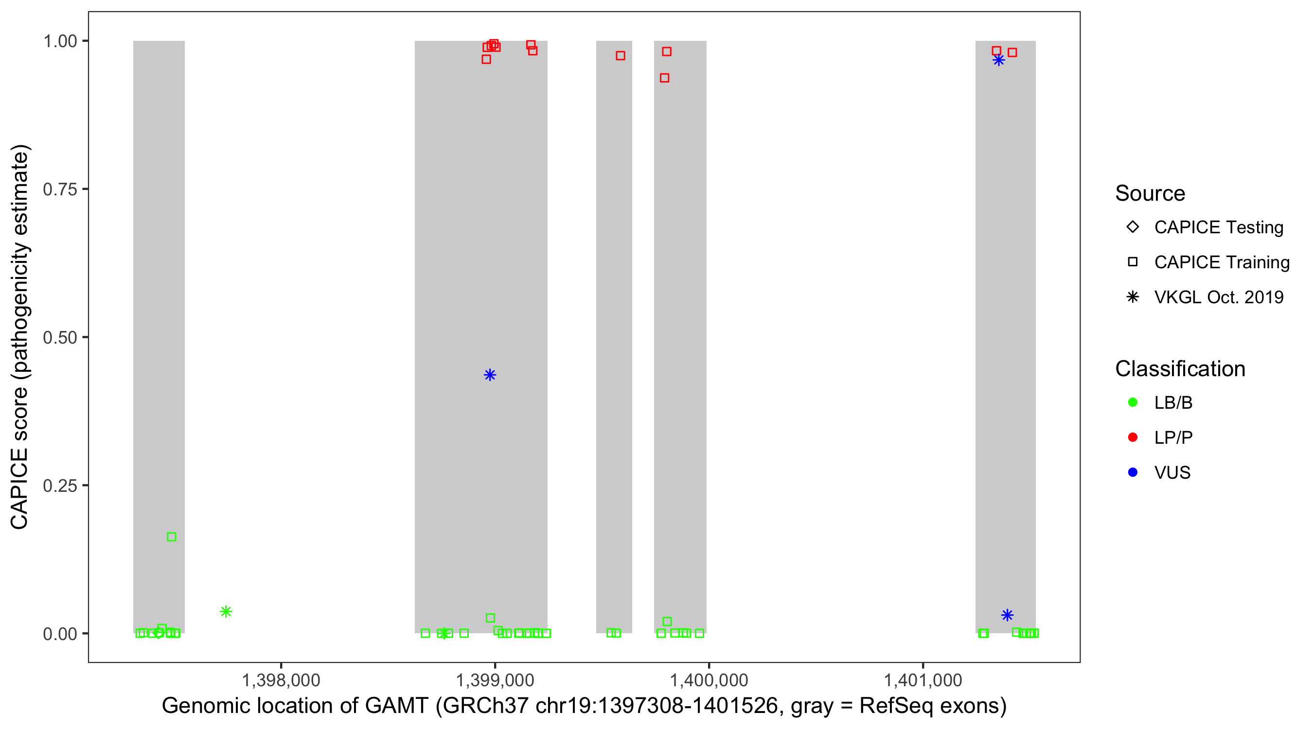 Shown are CAPICE train/test variants plus VKGL Oct 2019.