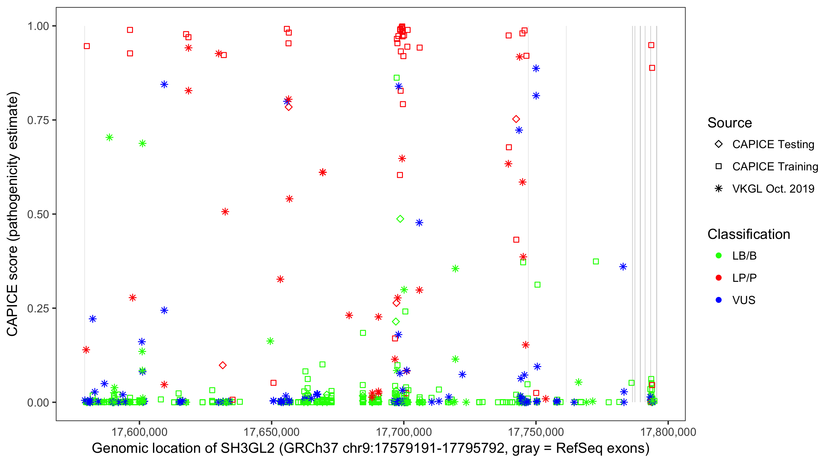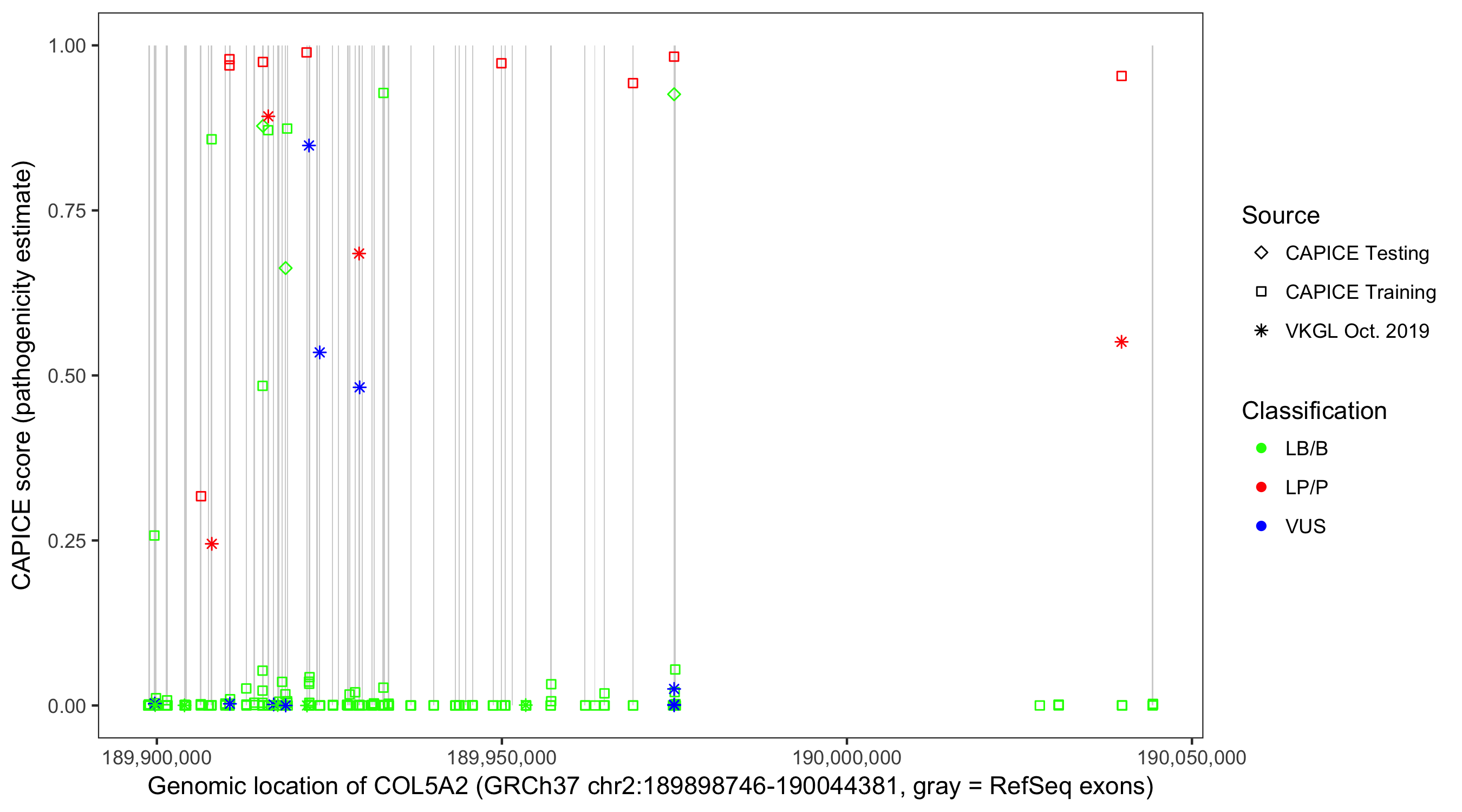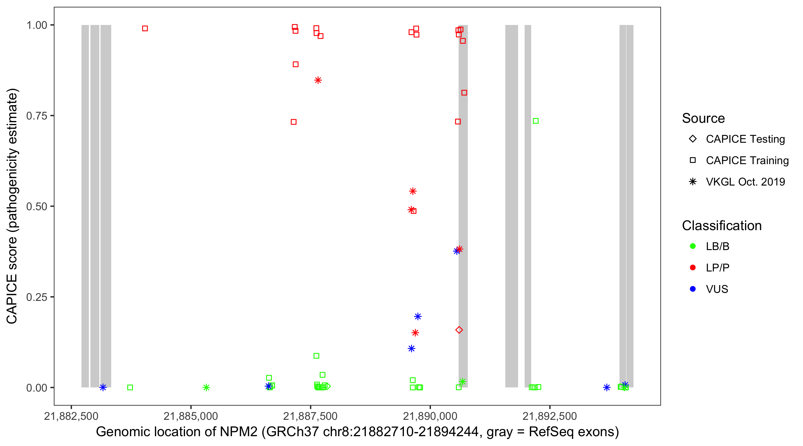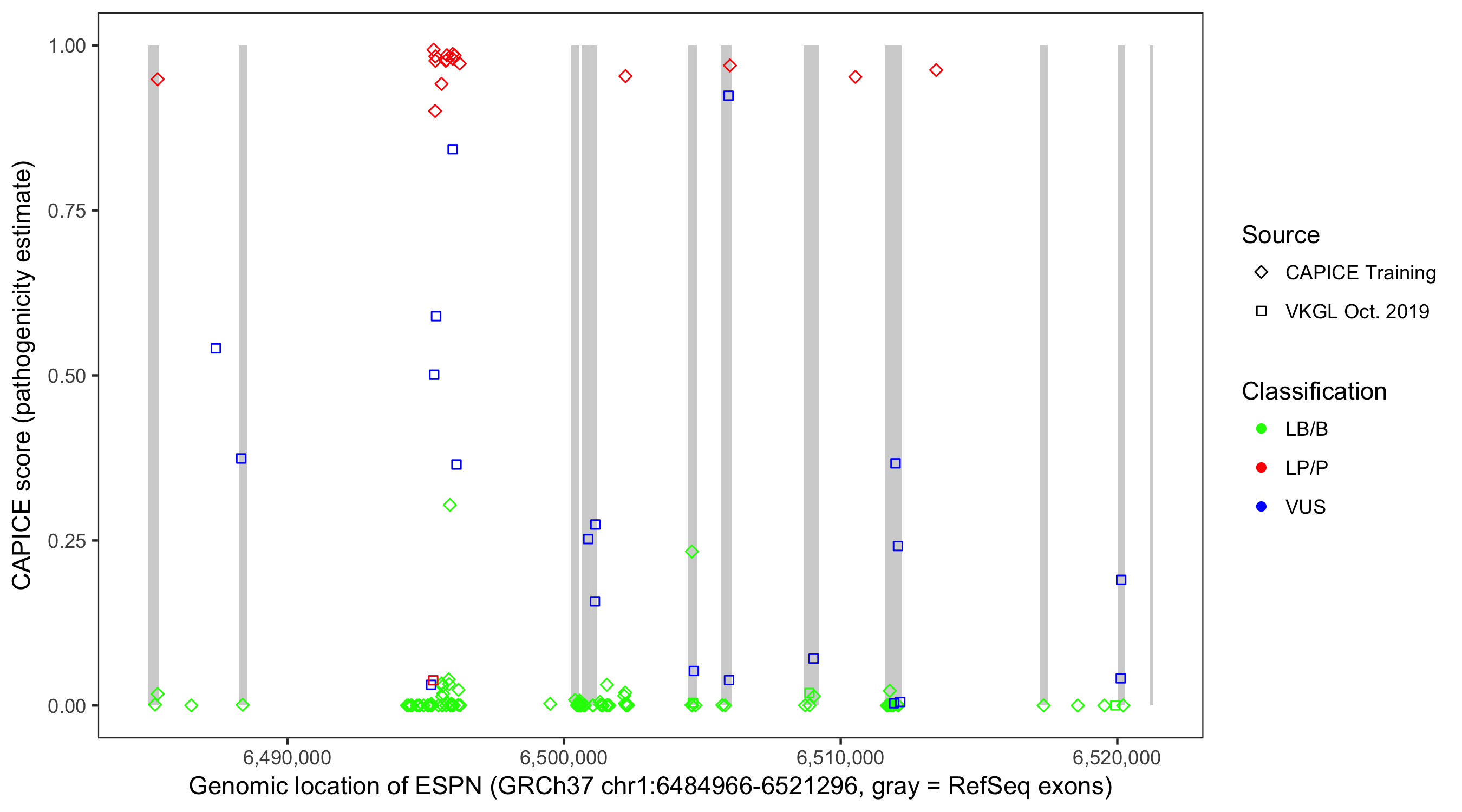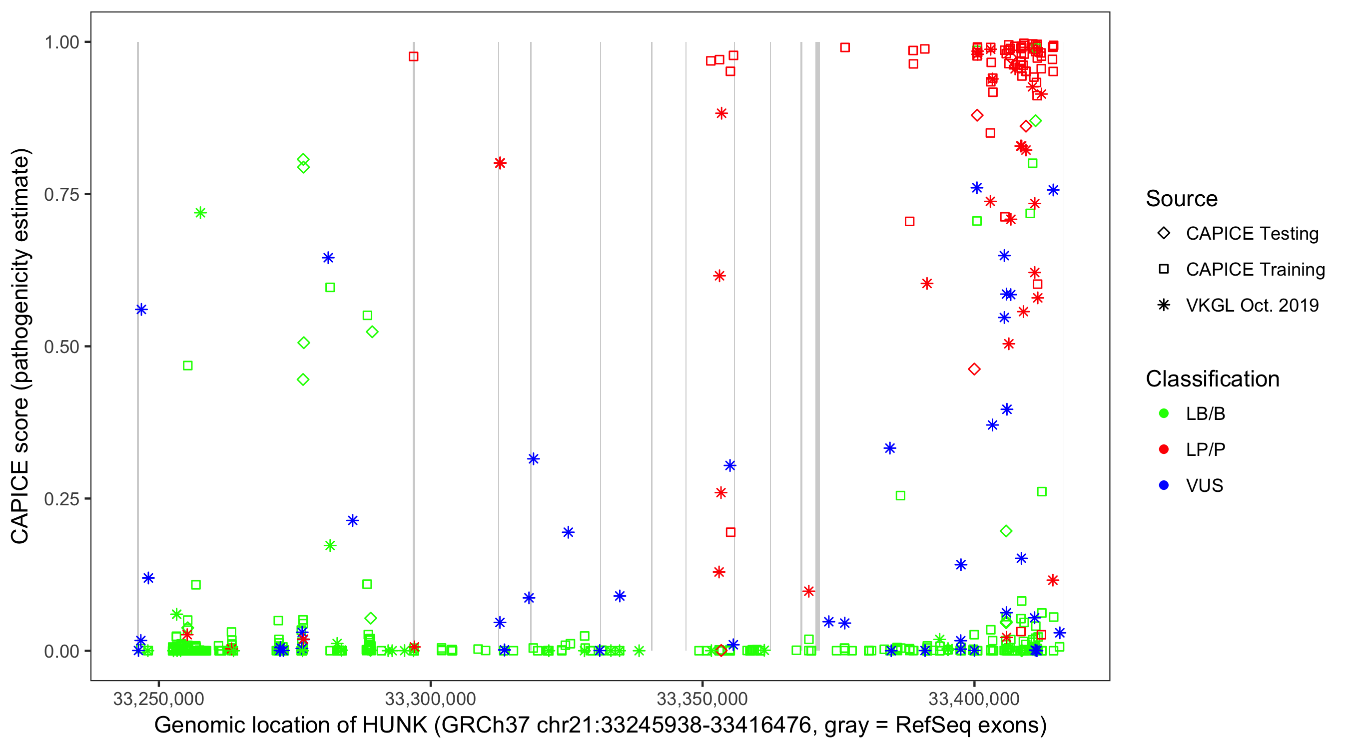 Shown are CAPICE train/test variants plus VKGL Oct 2019.