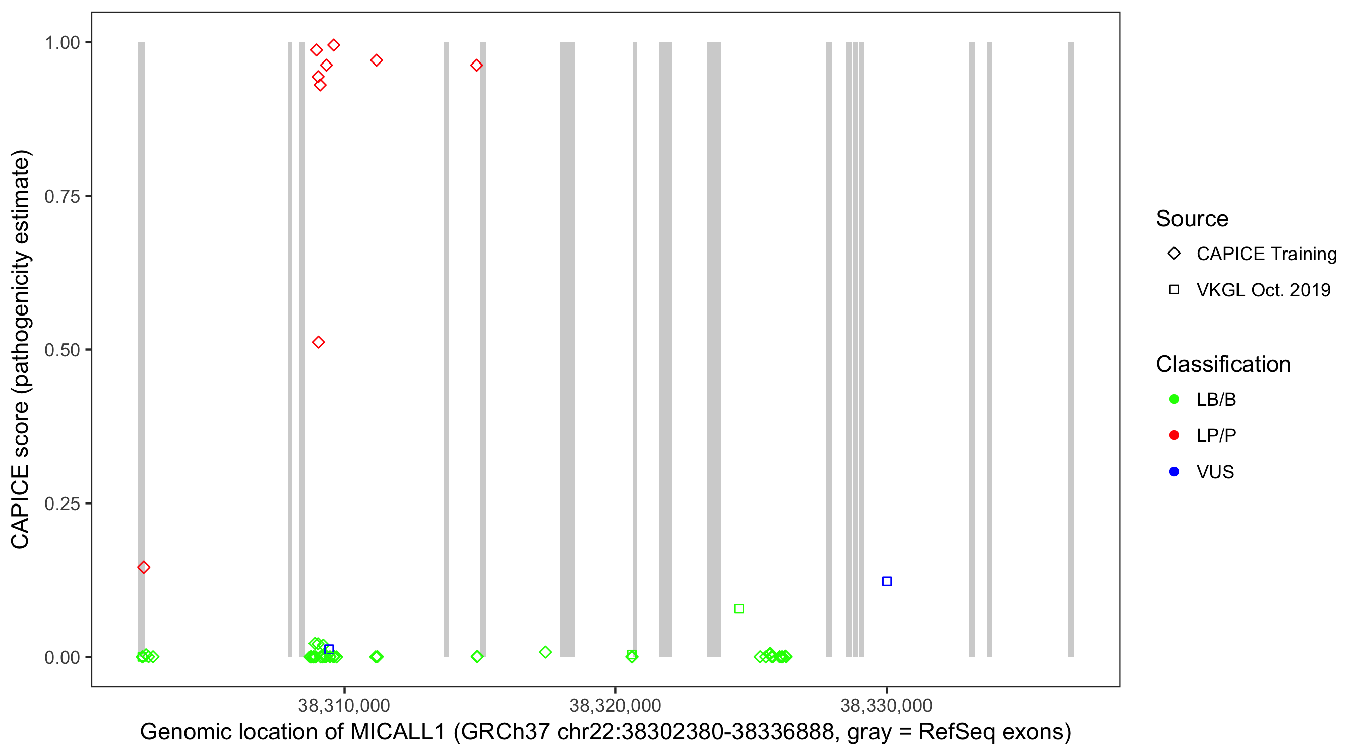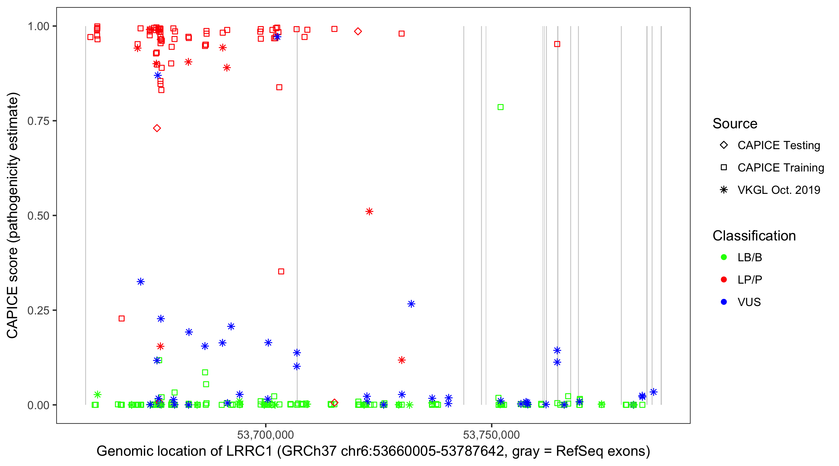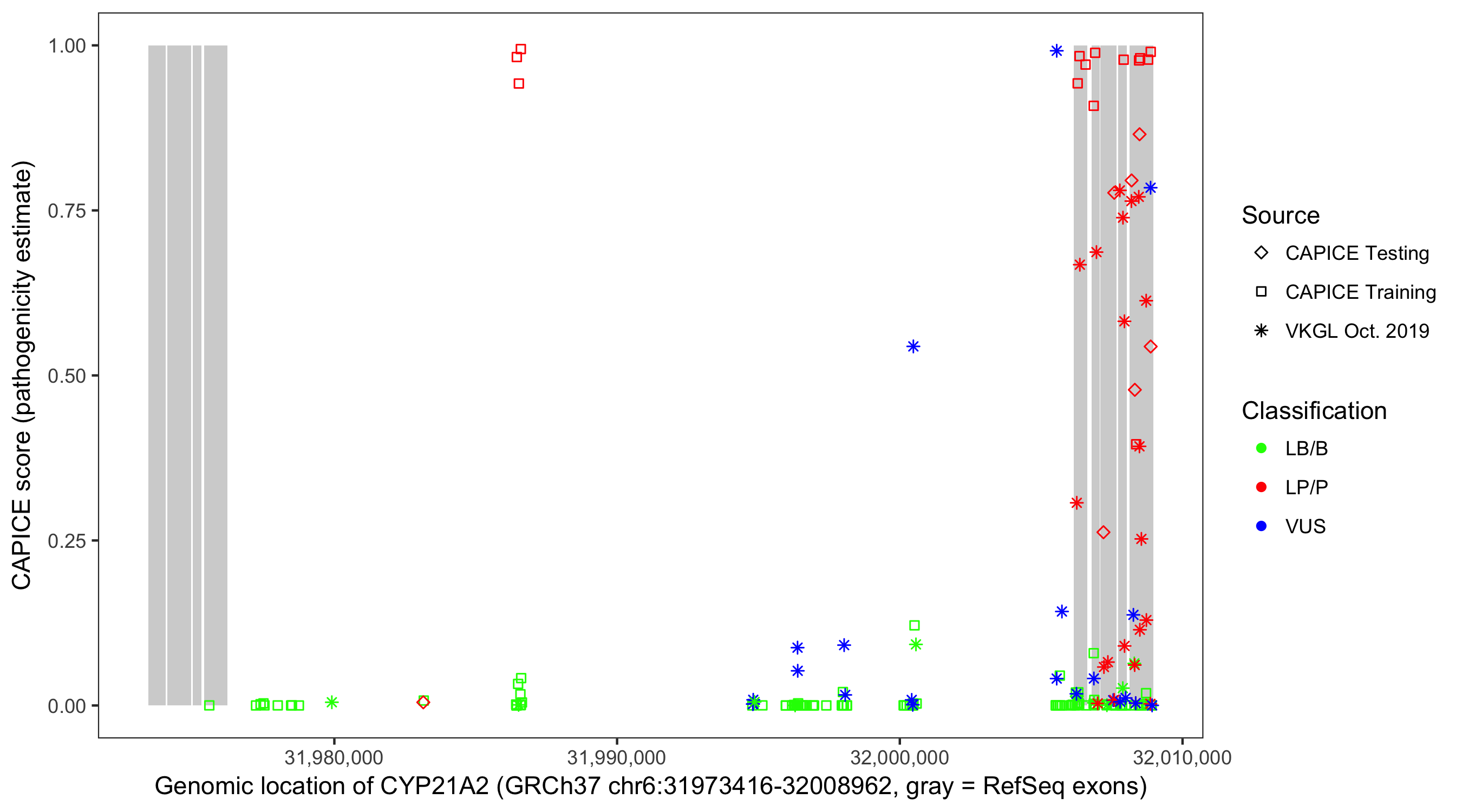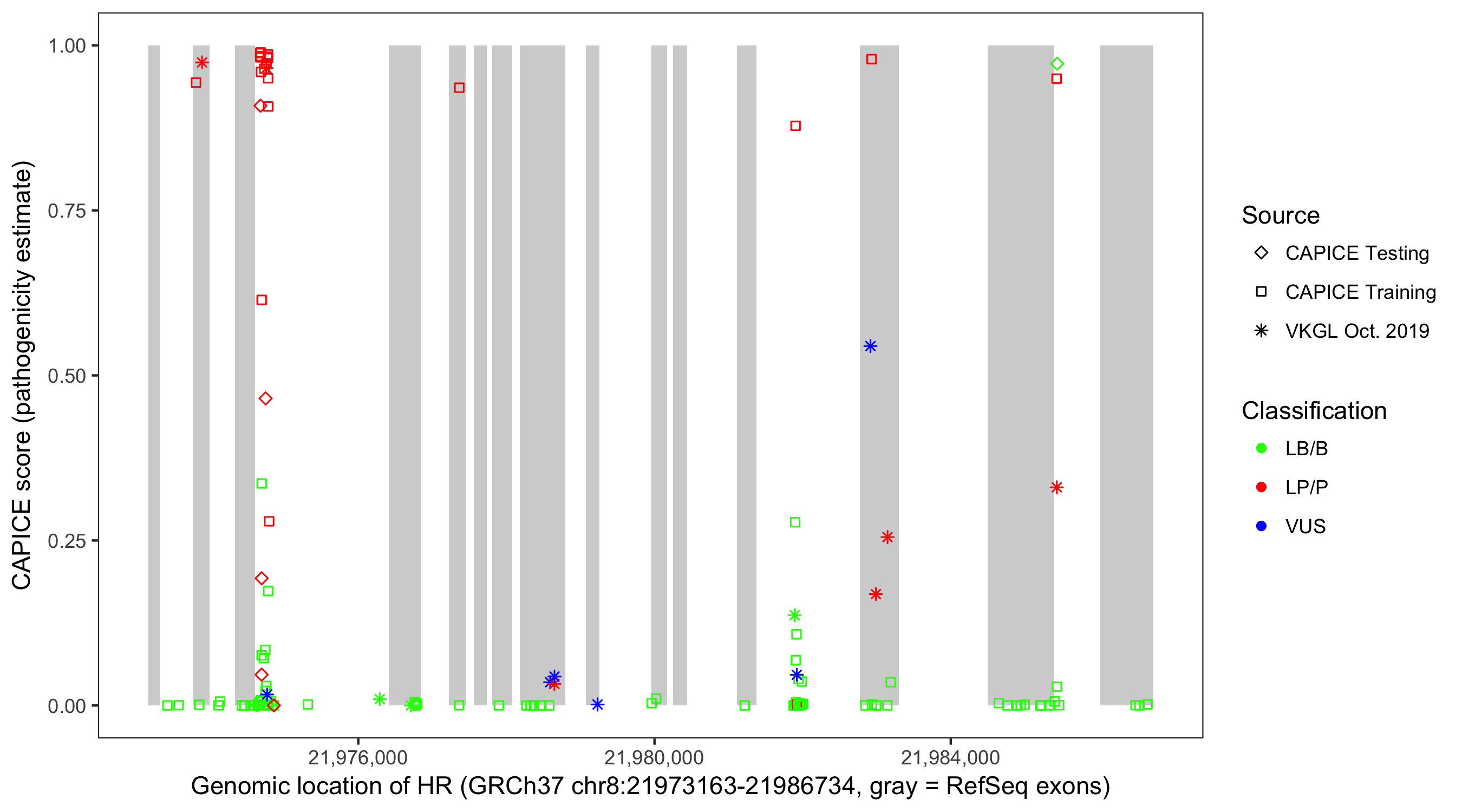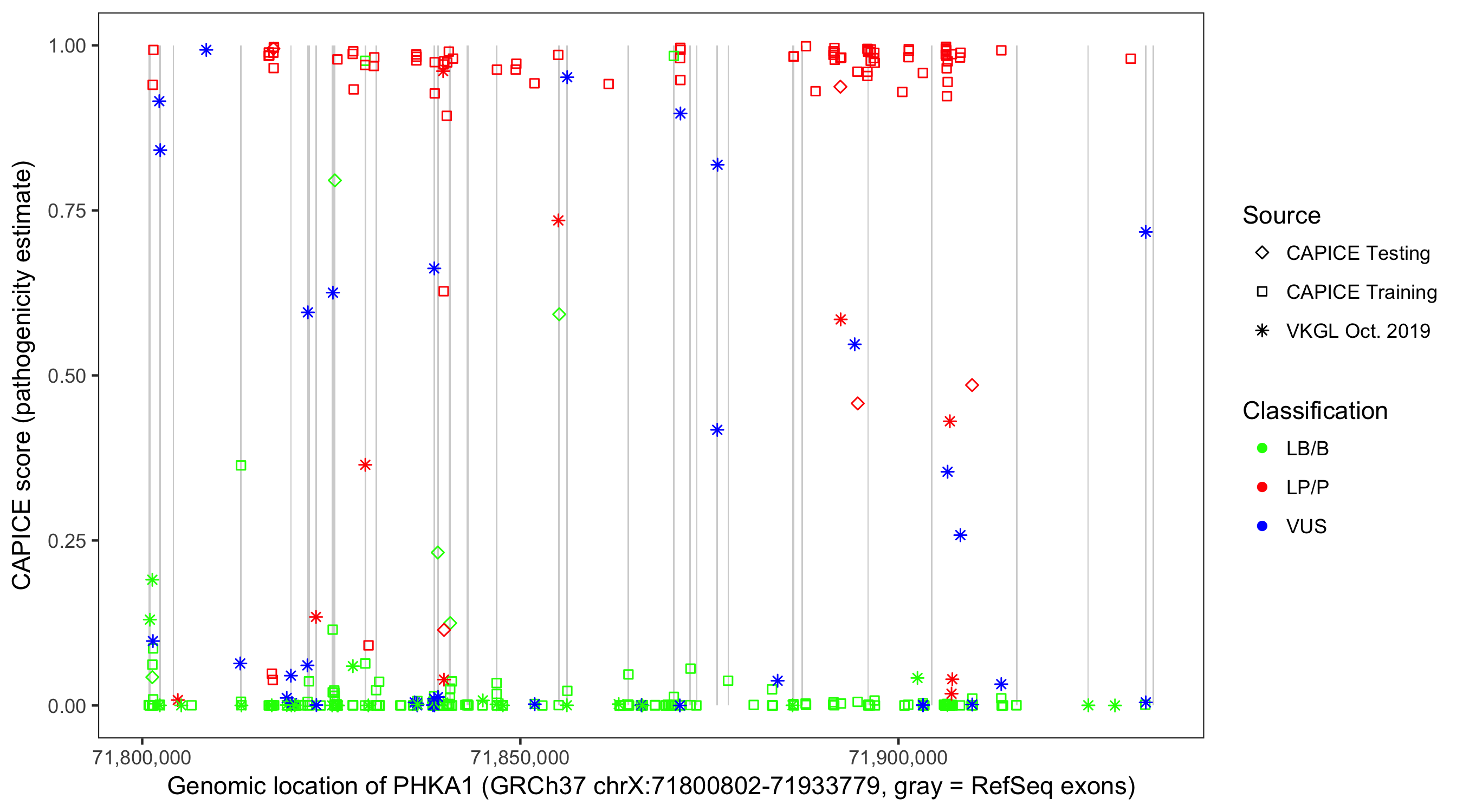 Shown are CAPICE train/test variants plus VKGL Oct 2019.