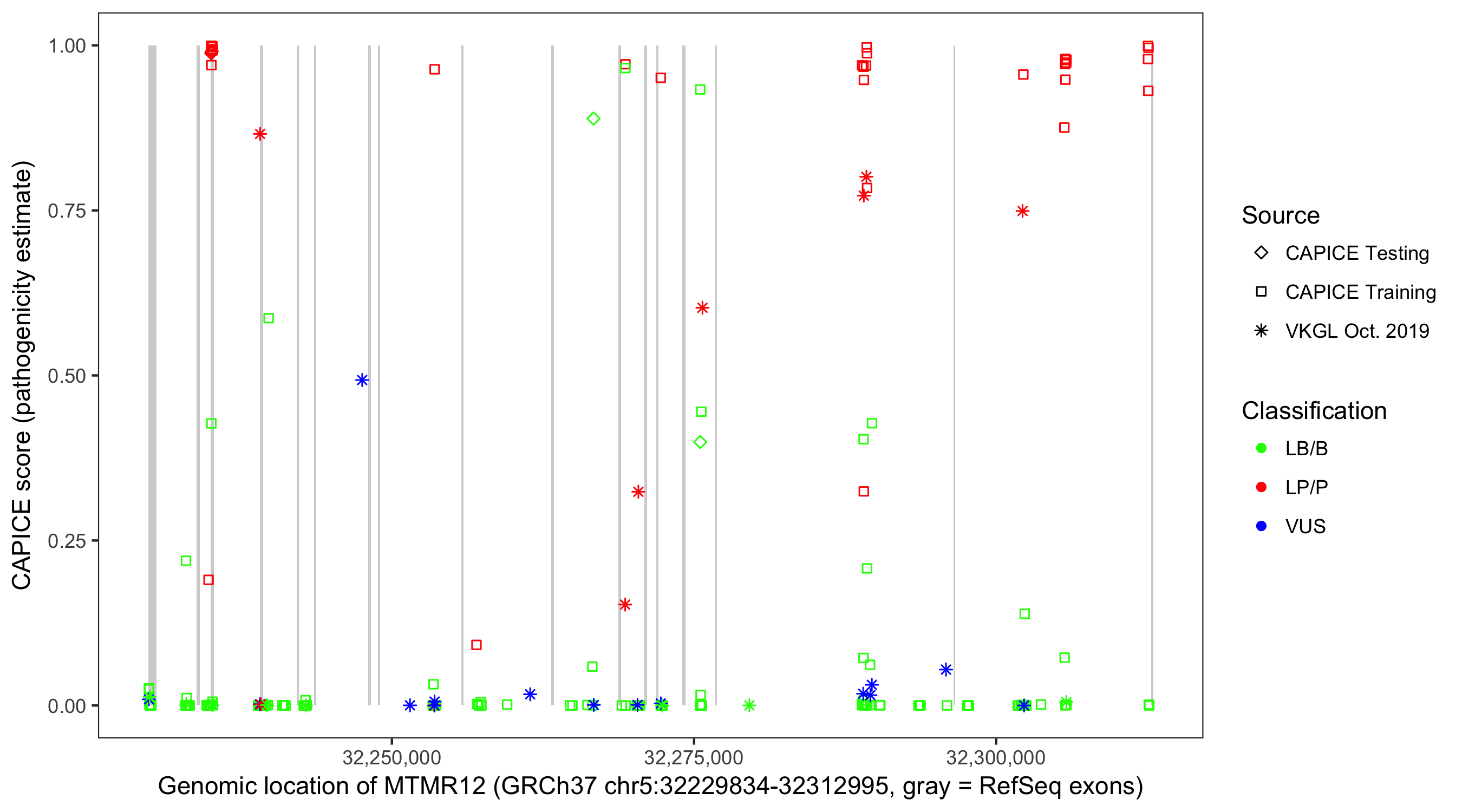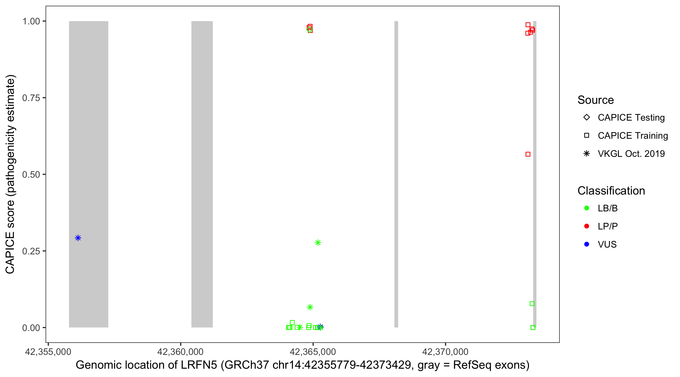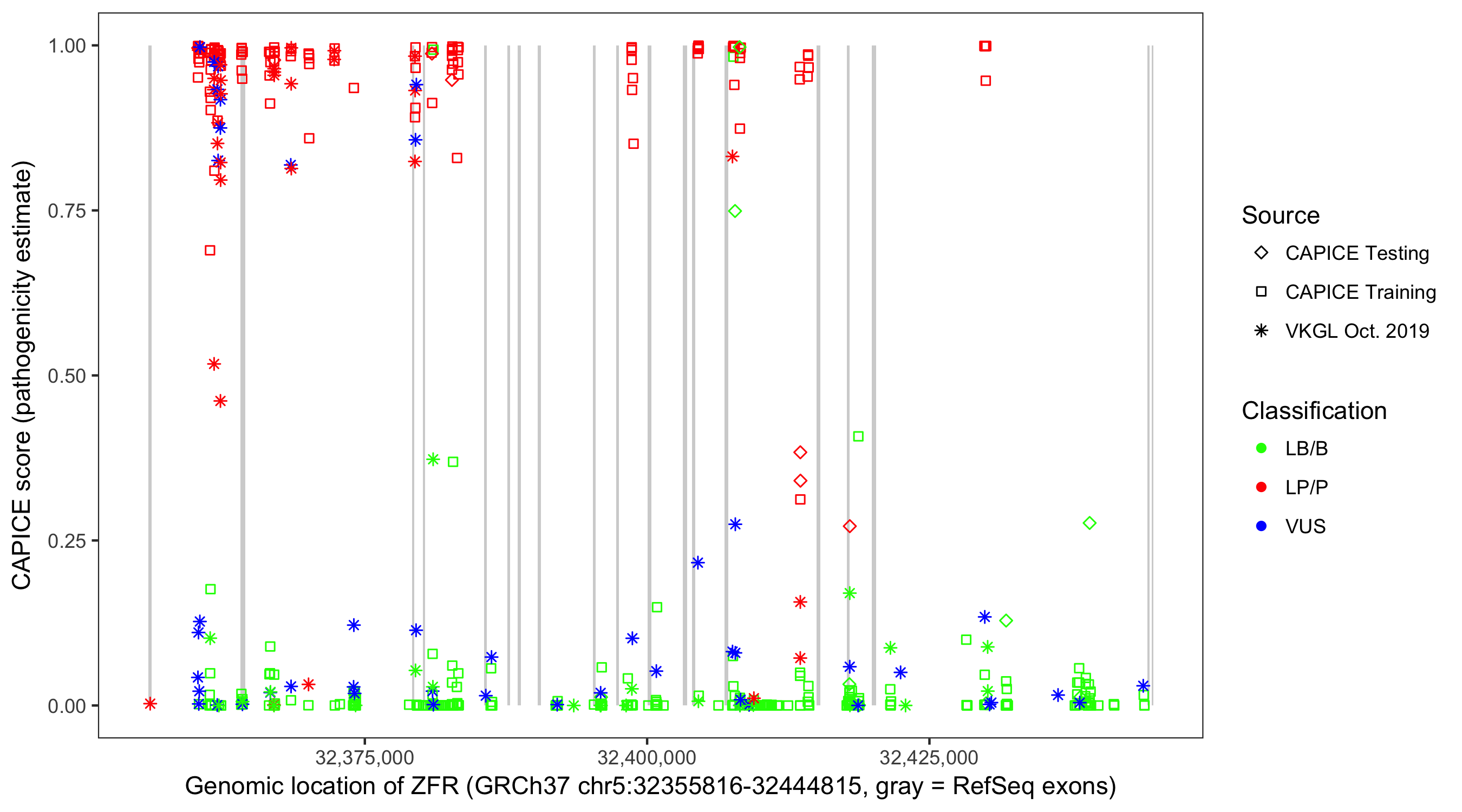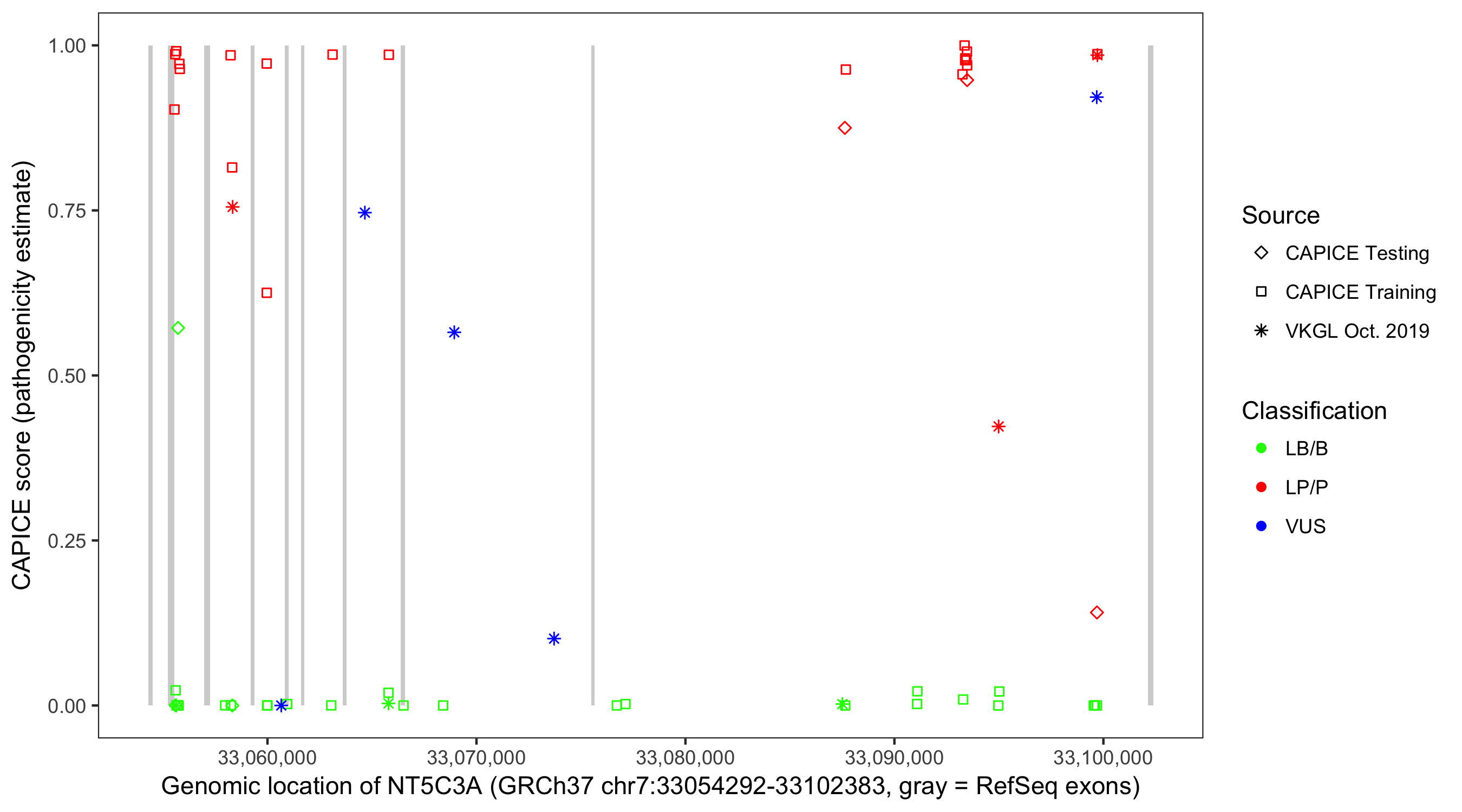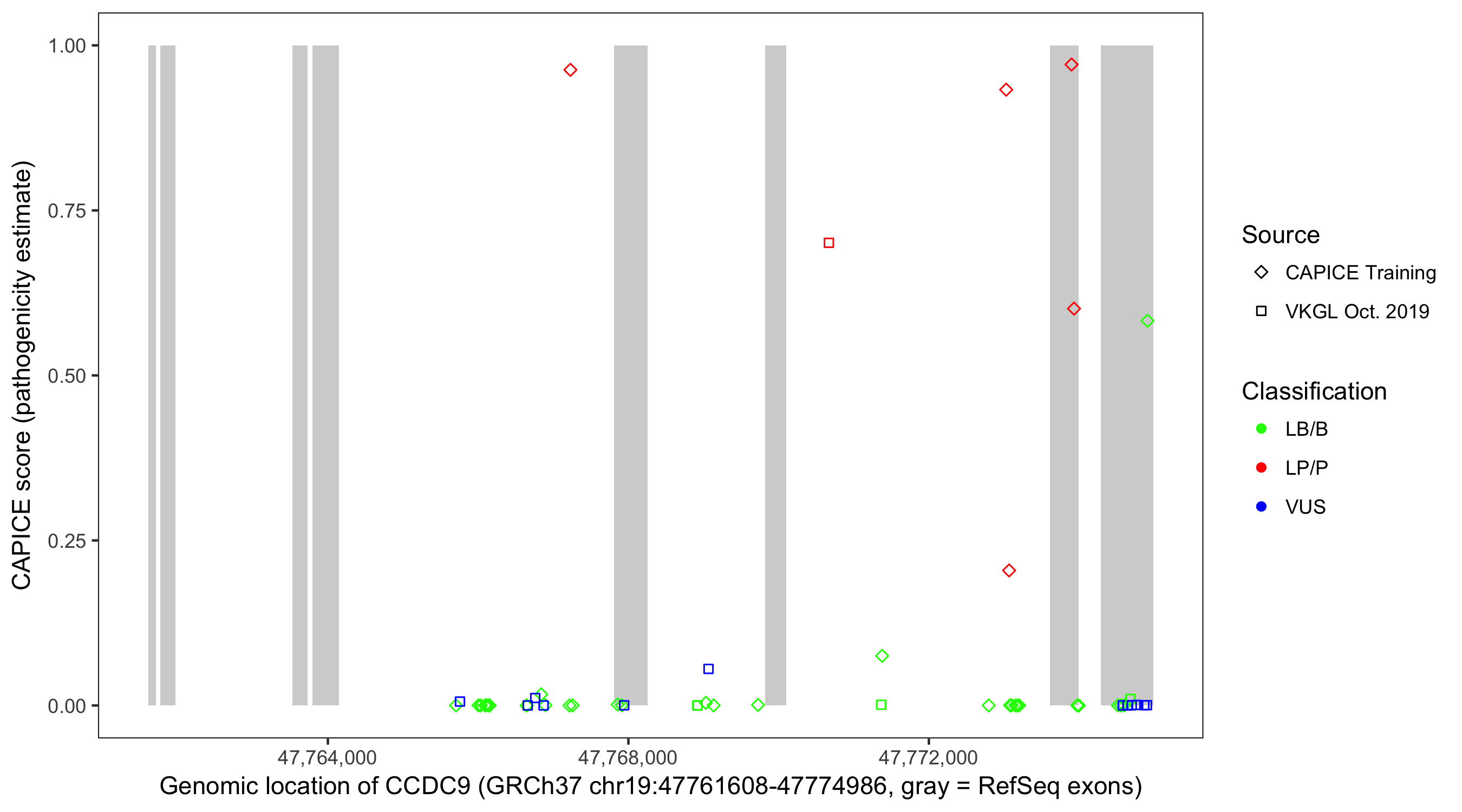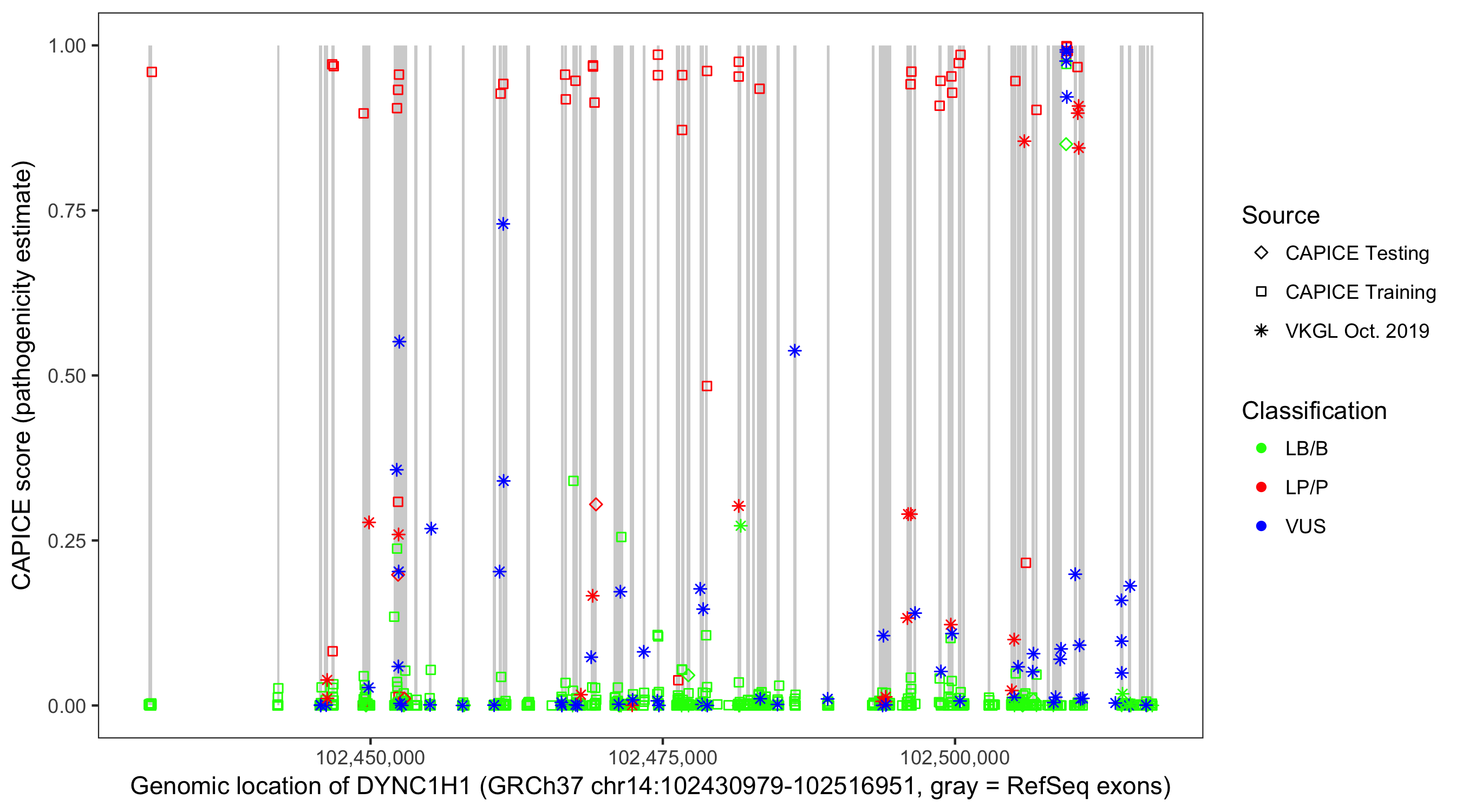 Shown are CAPICE train/test variants plus VKGL Oct 2019.