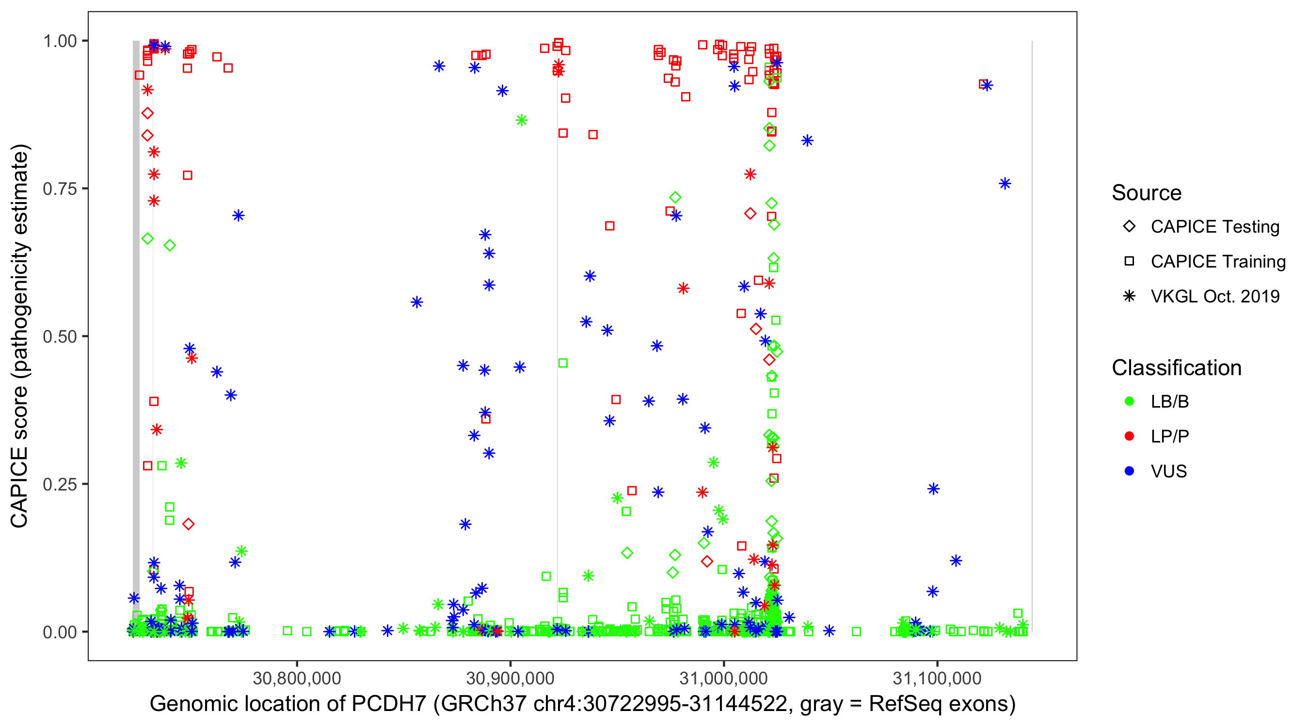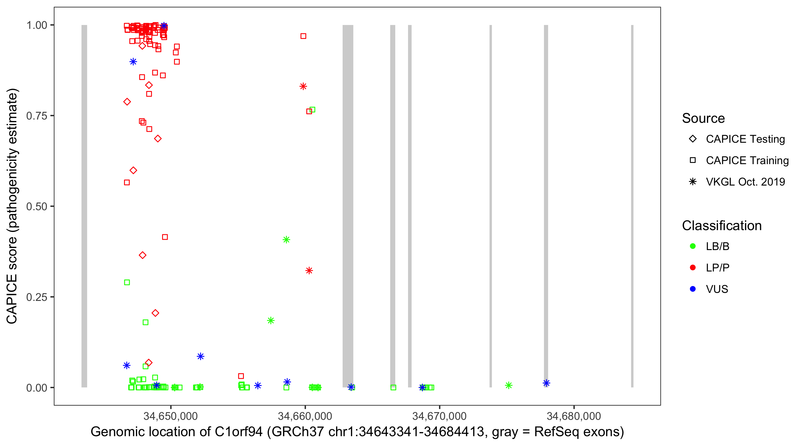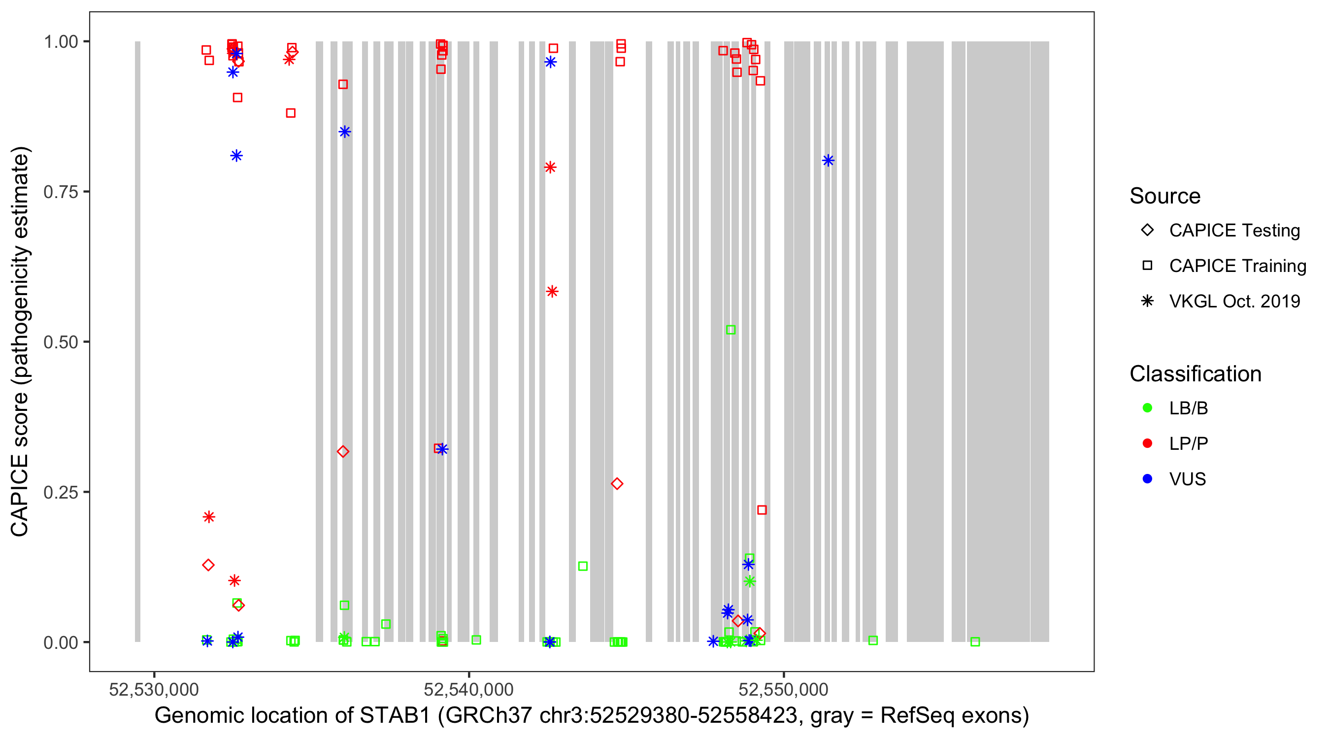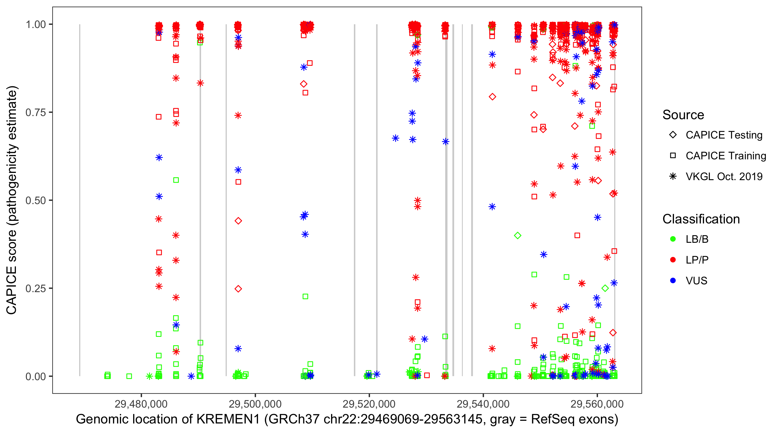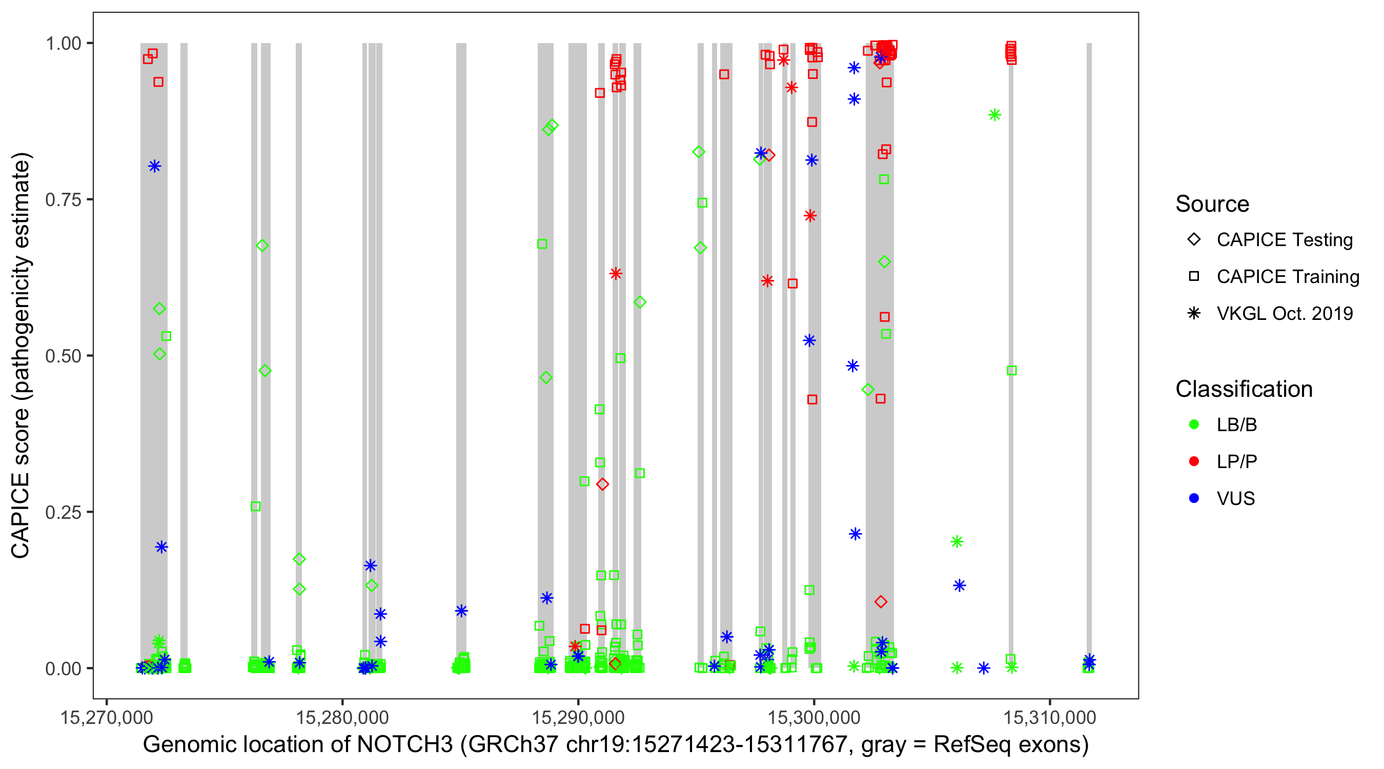Shown are CAPICE train/test variants plus VKGL Oct 2019.