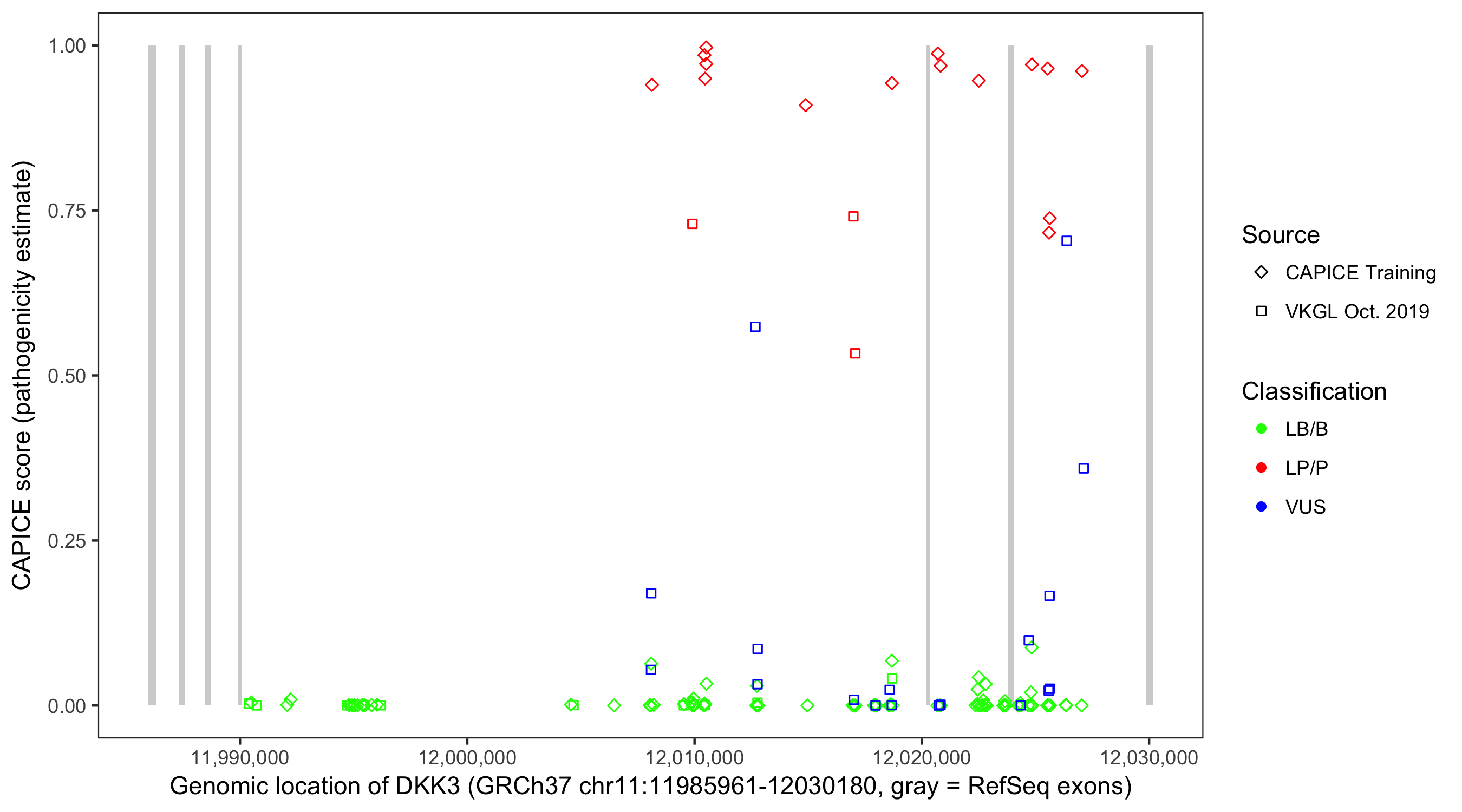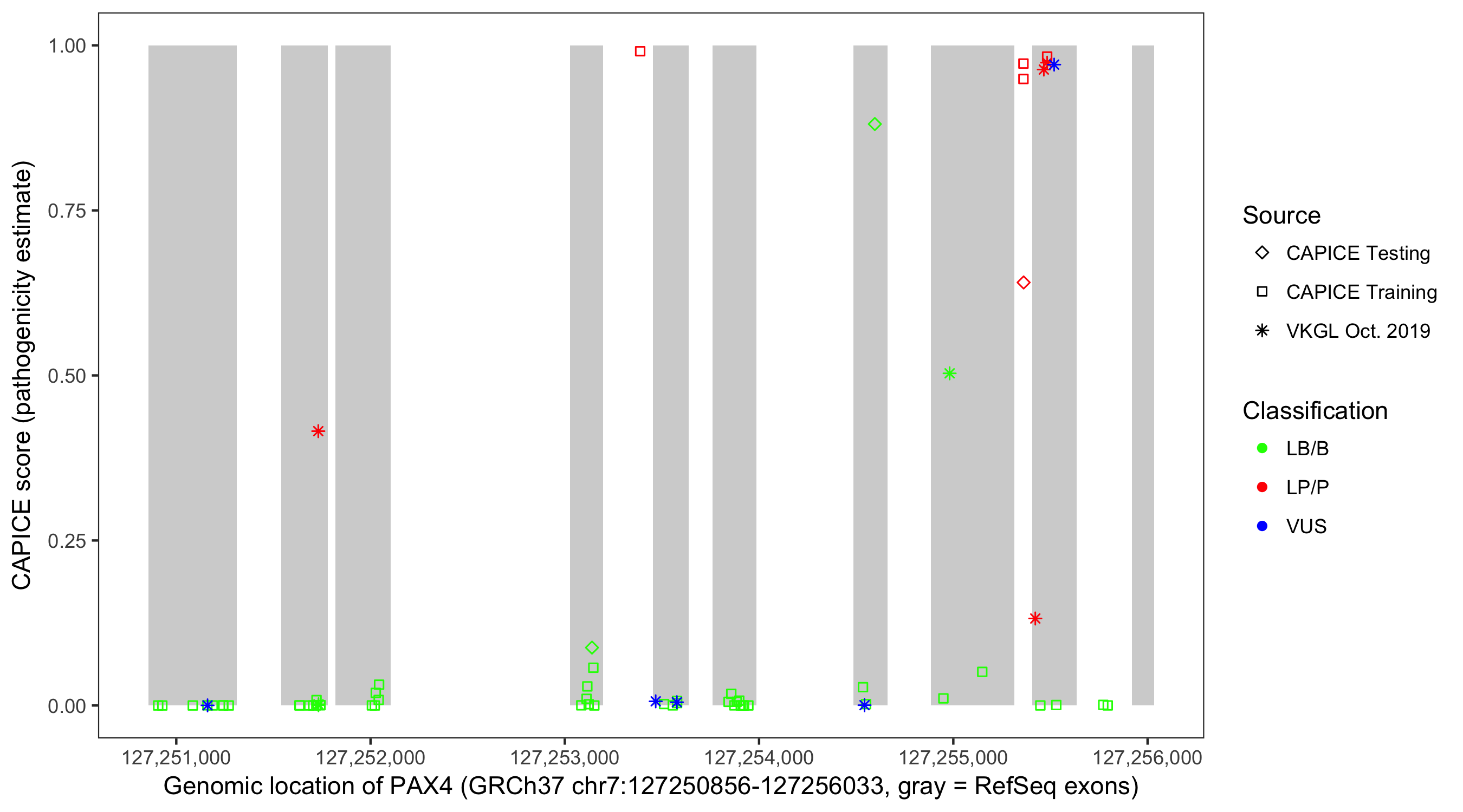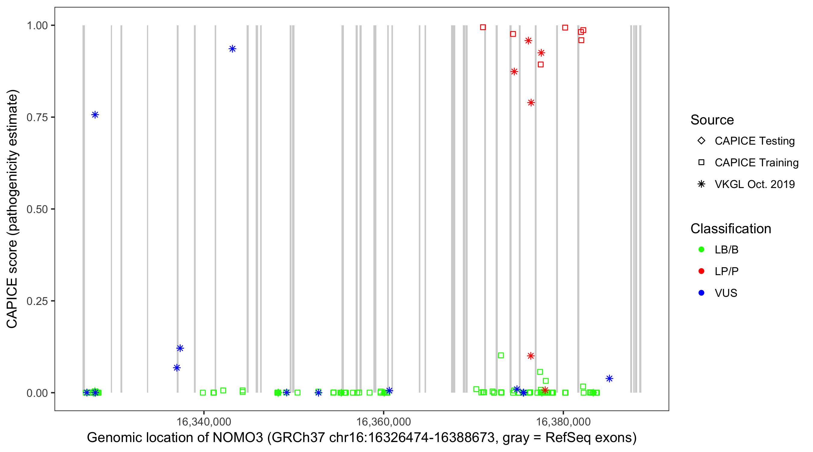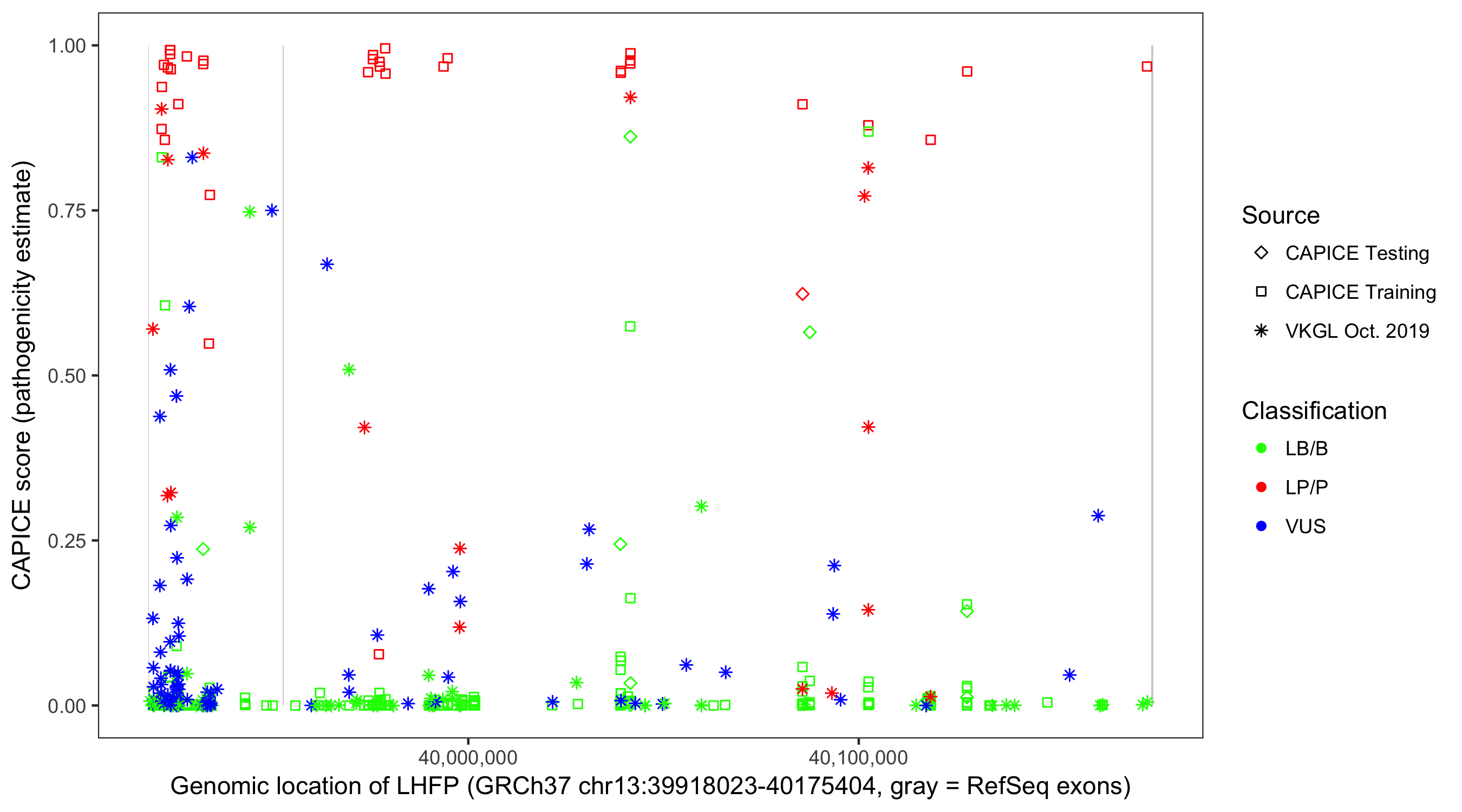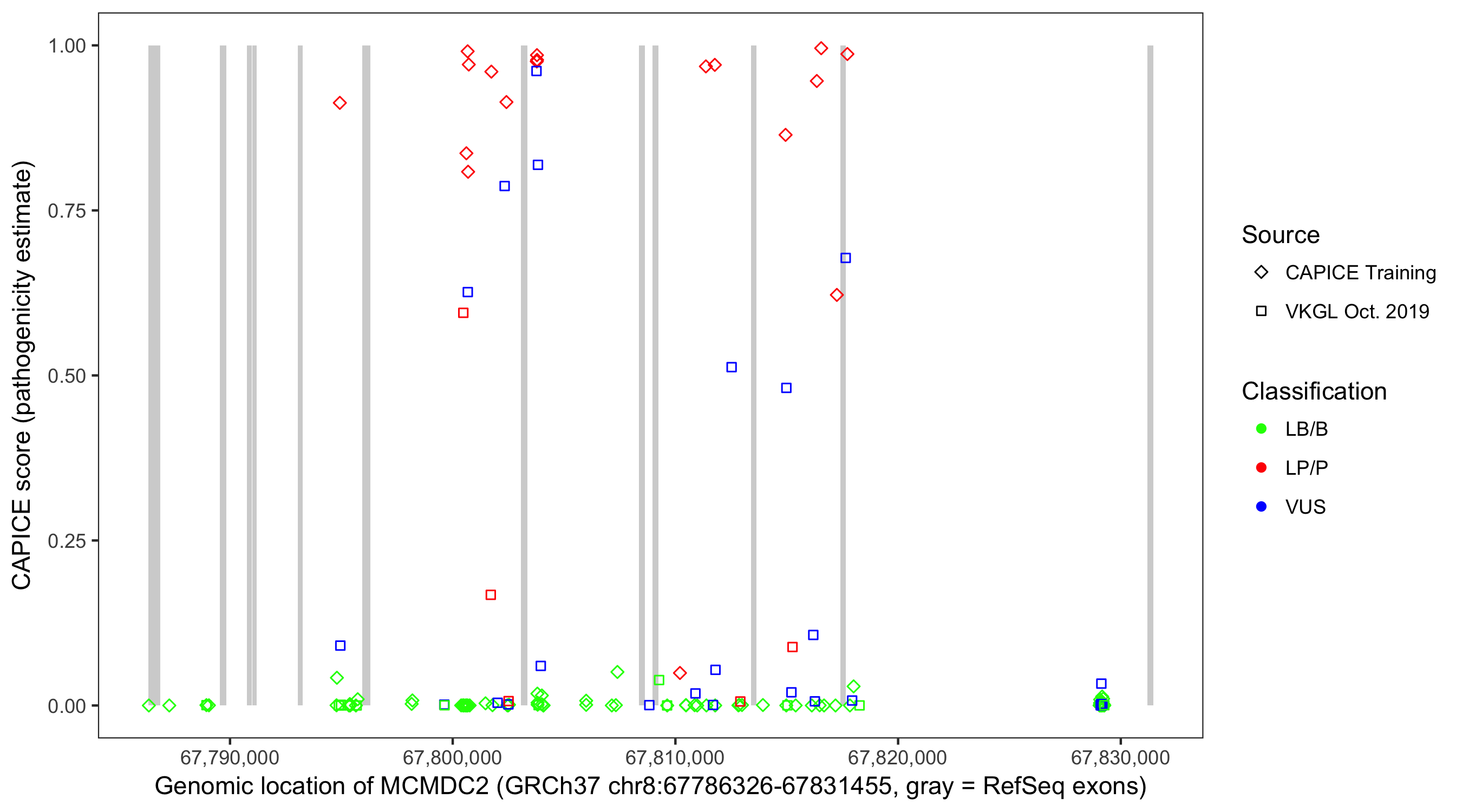 Shown are CAPICE train/test variants plus VKGL Oct 2019.