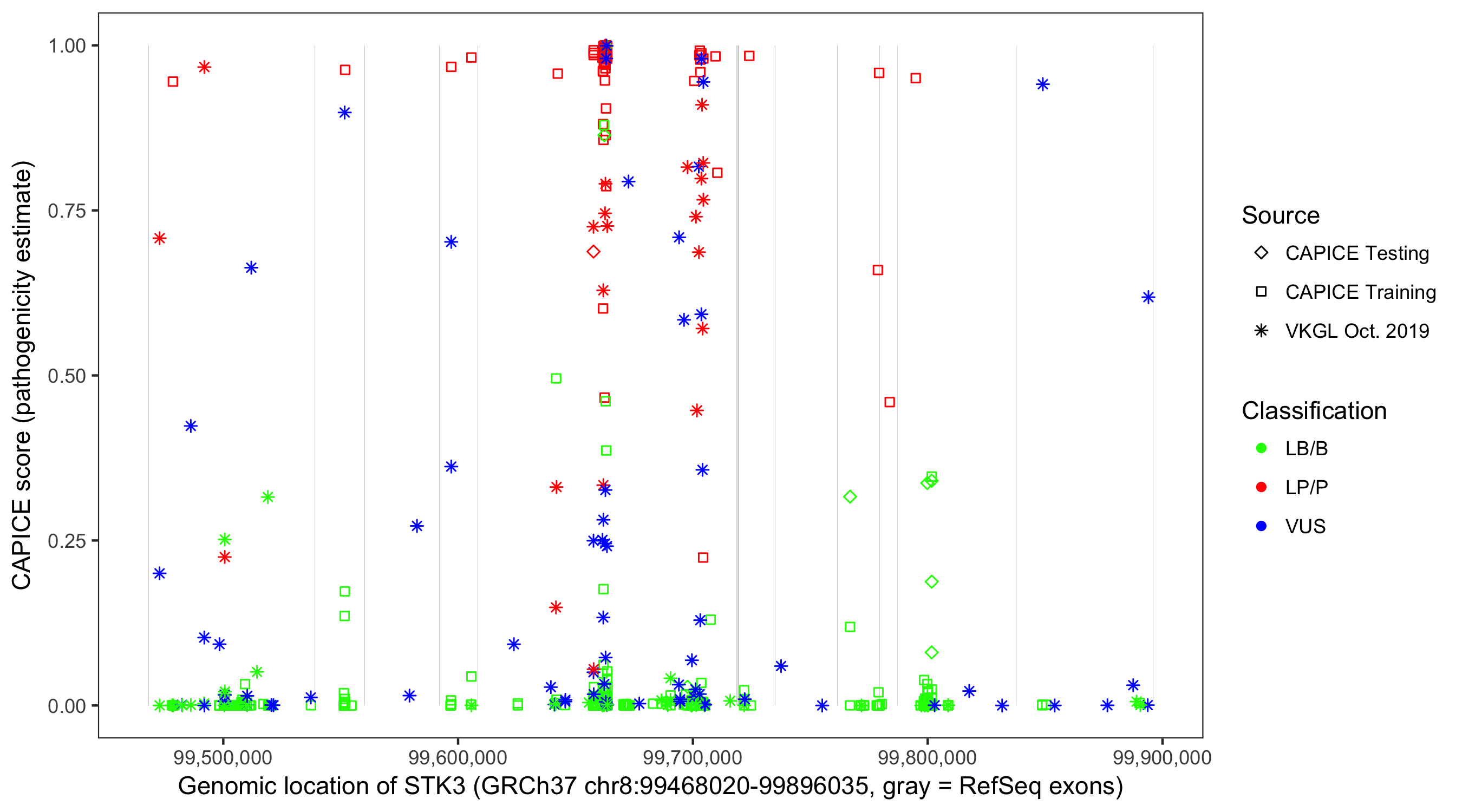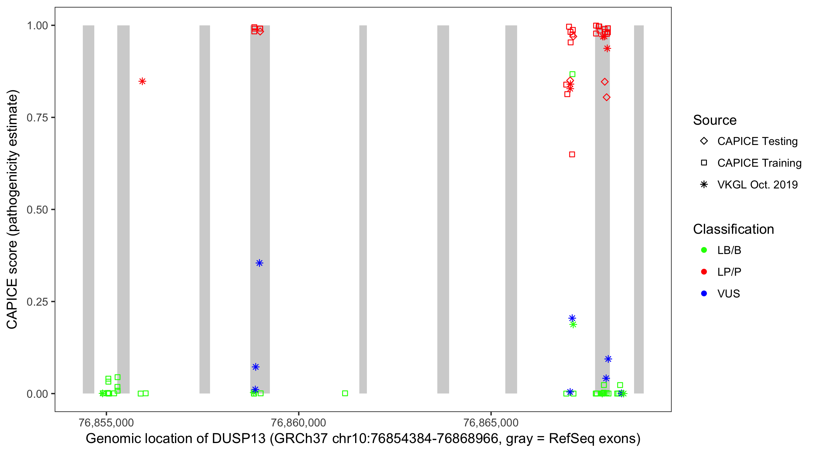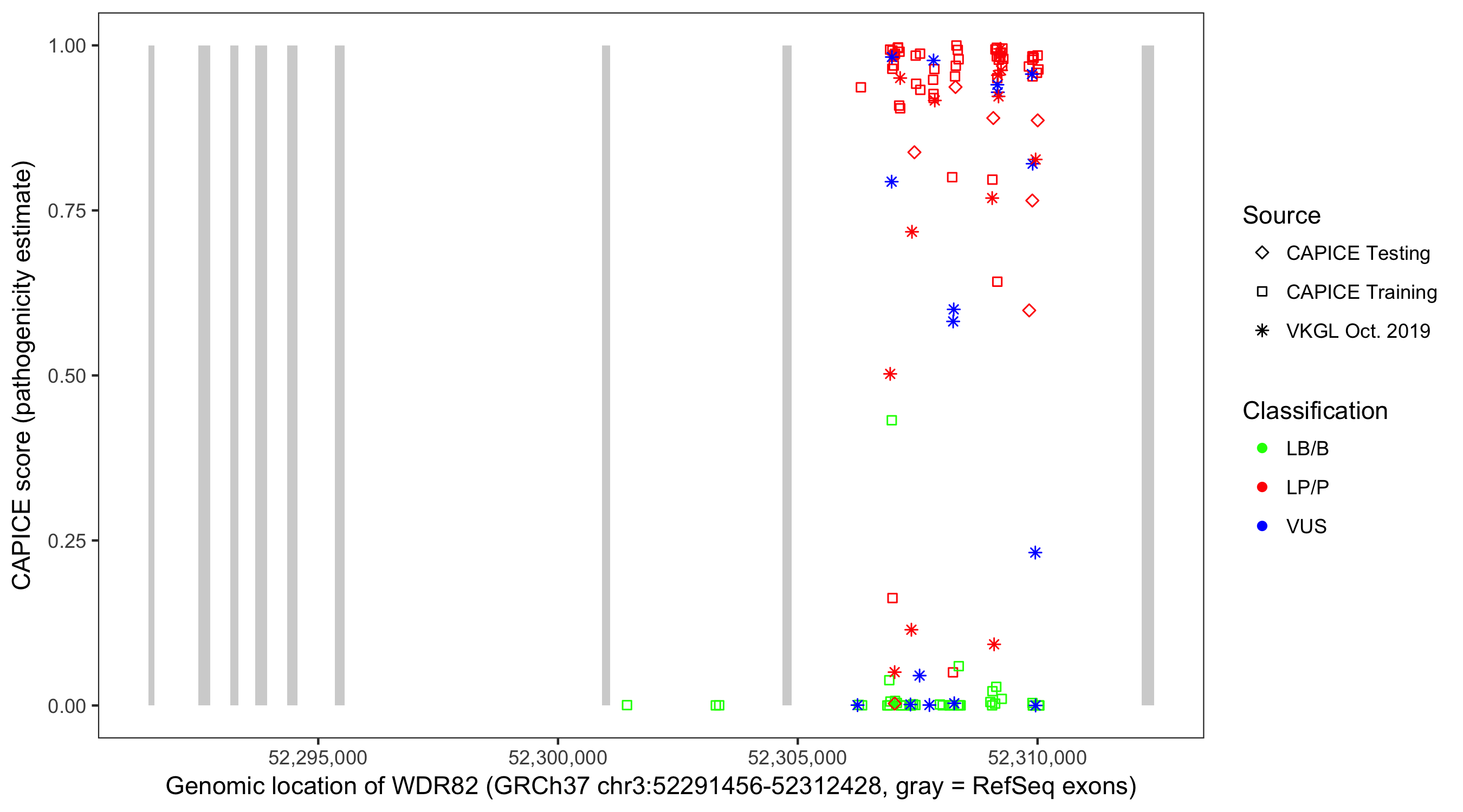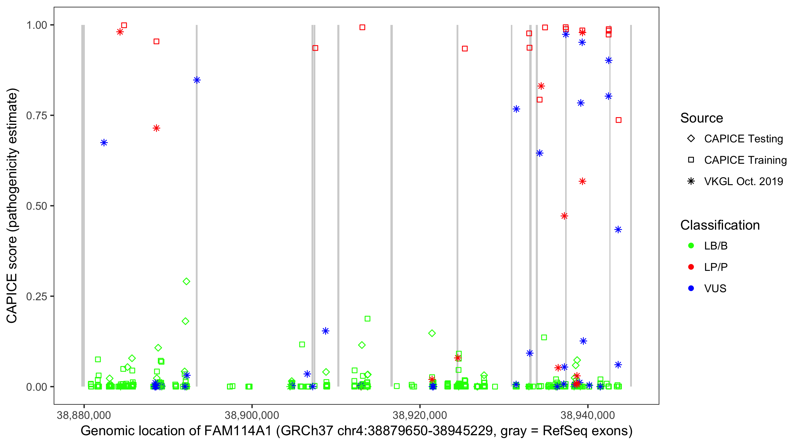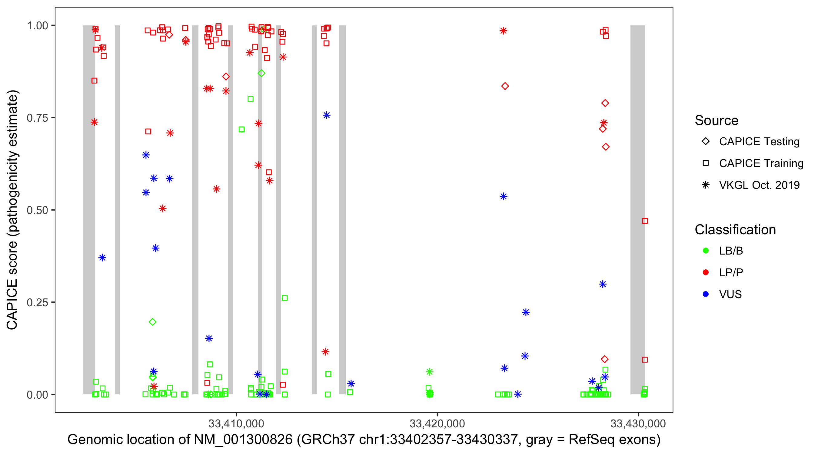 Shown are CAPICE train/test variants plus VKGL Oct 2019.