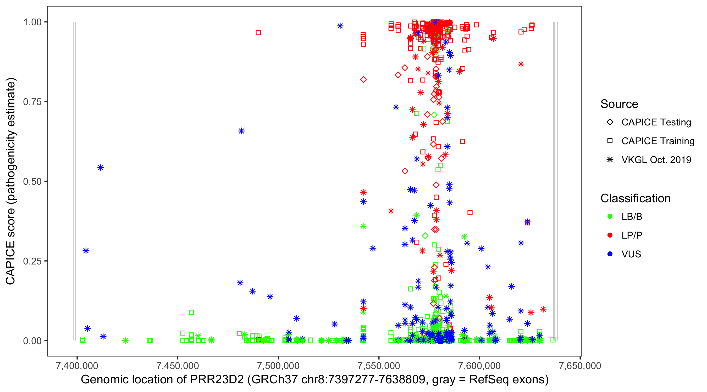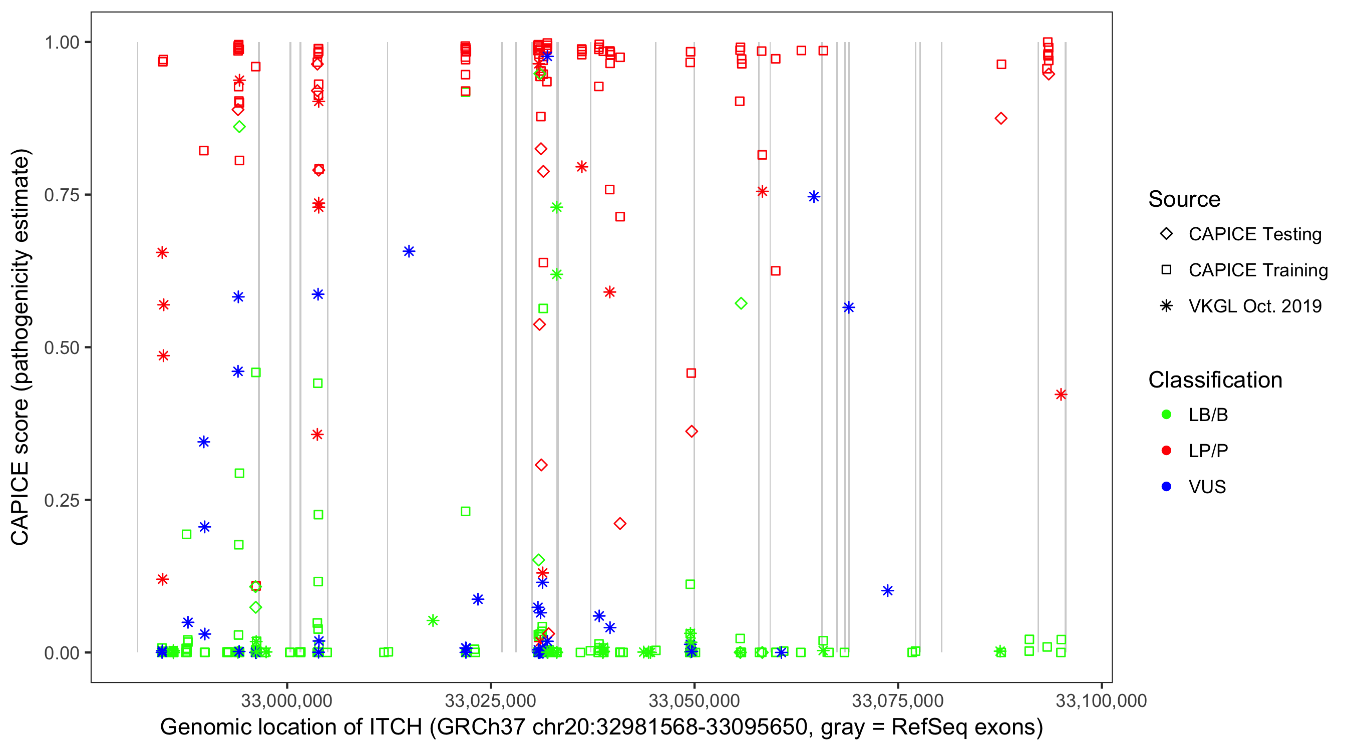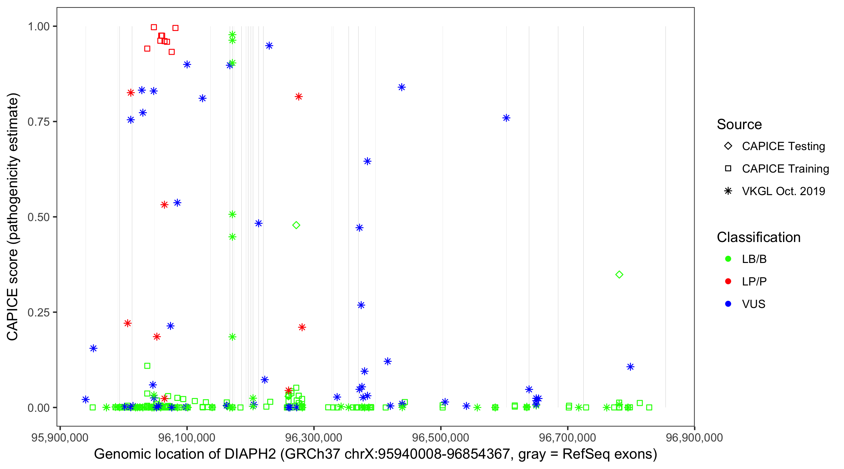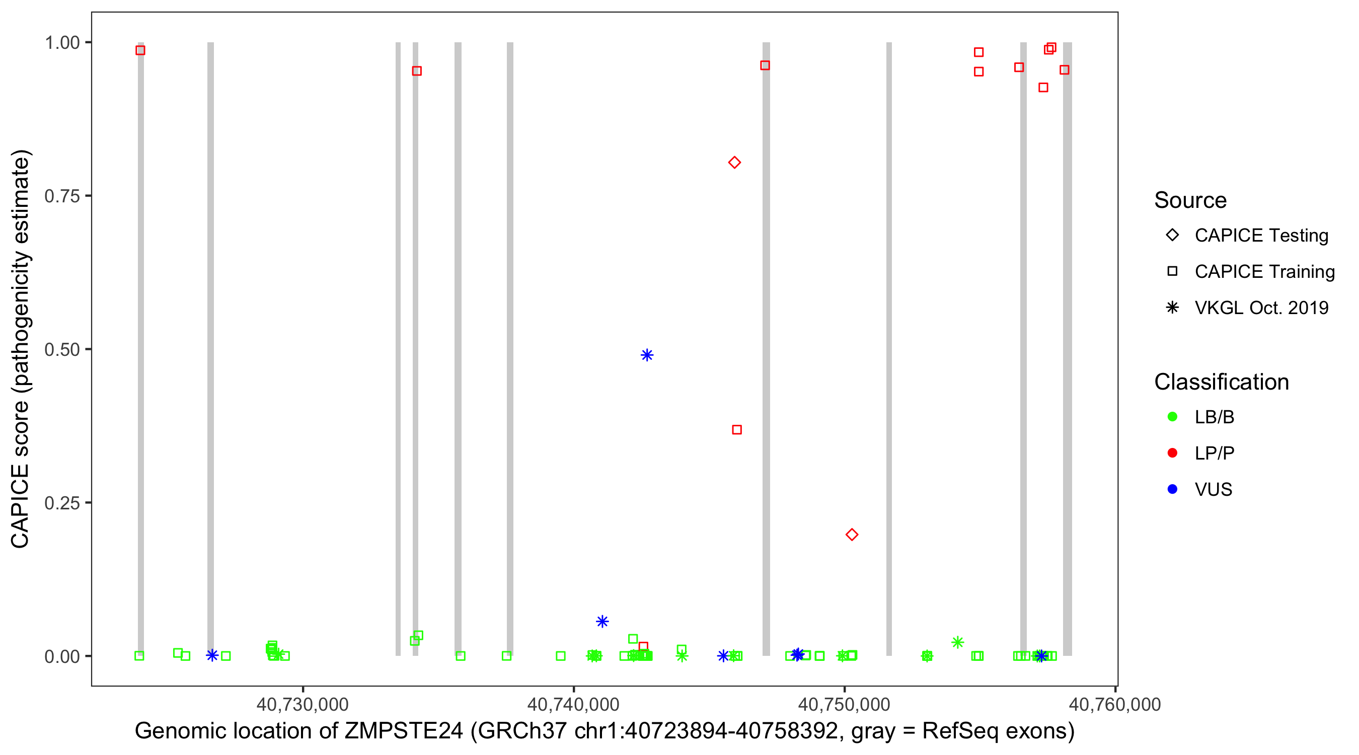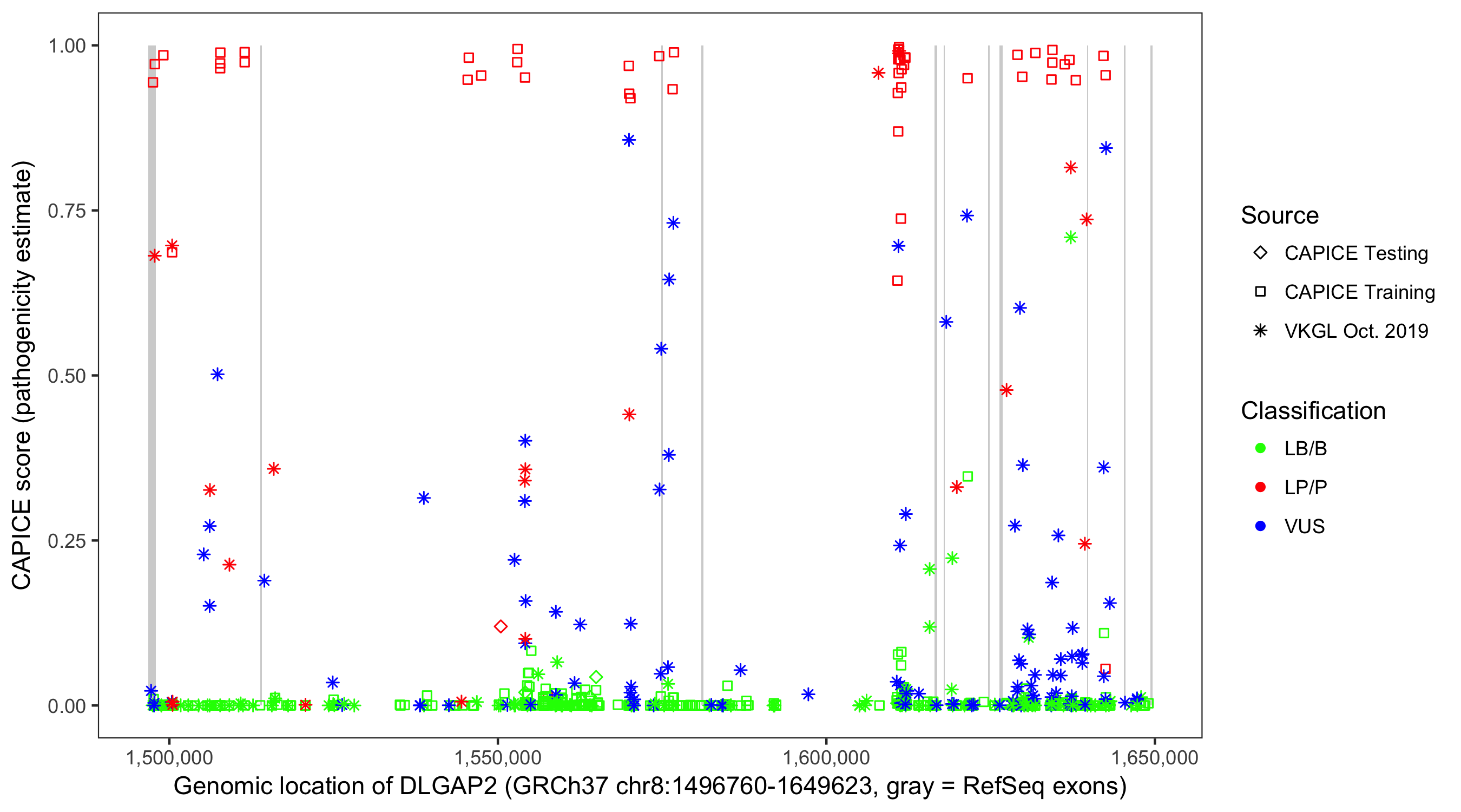 Shown are CAPICE train/test variants plus VKGL Oct 2019.