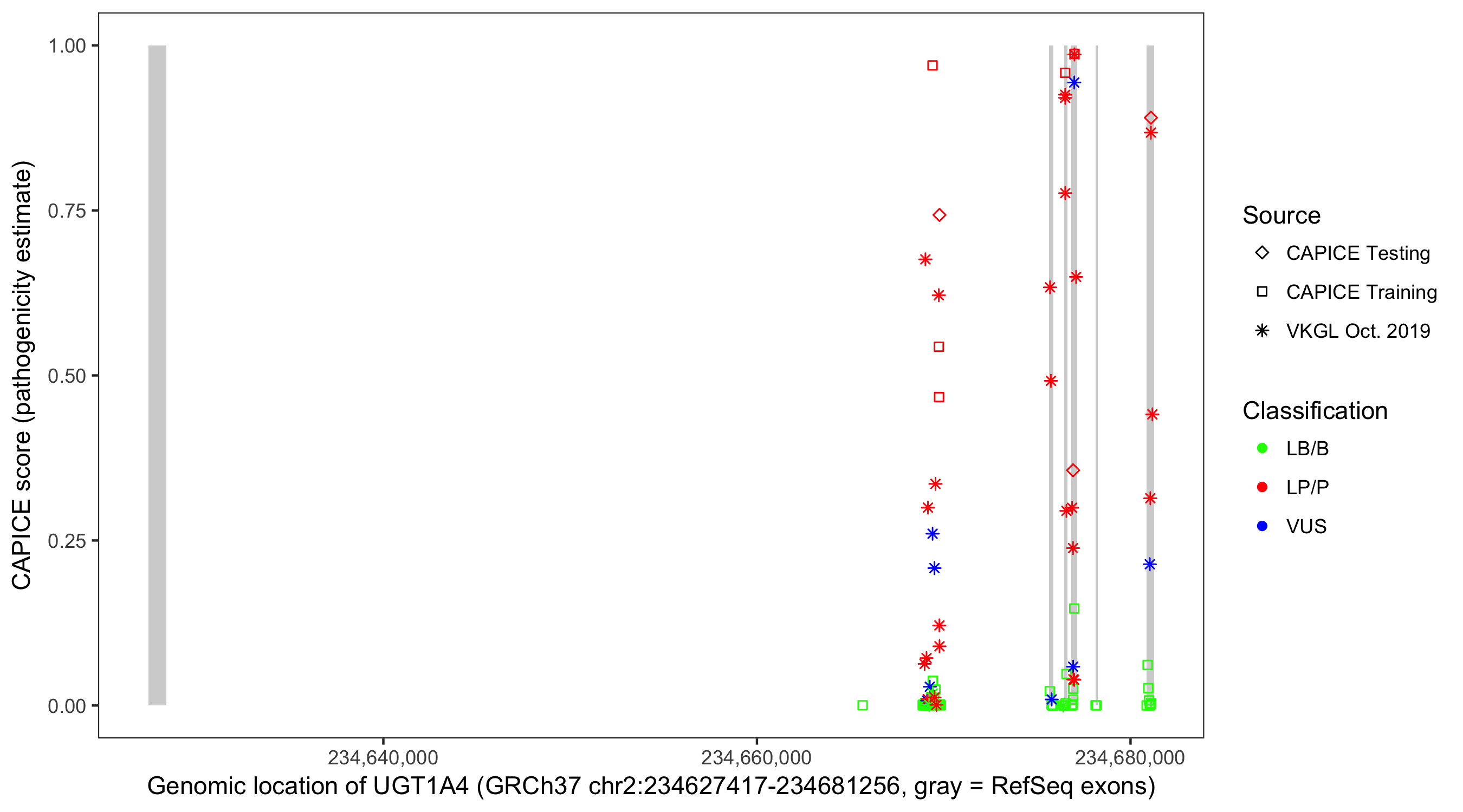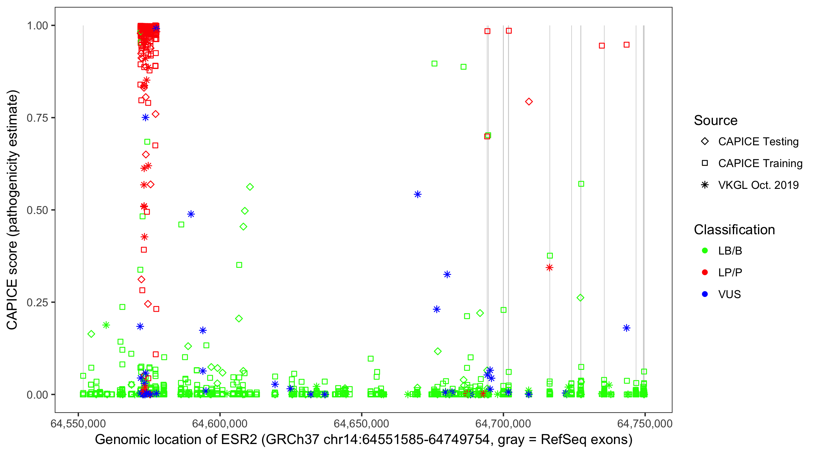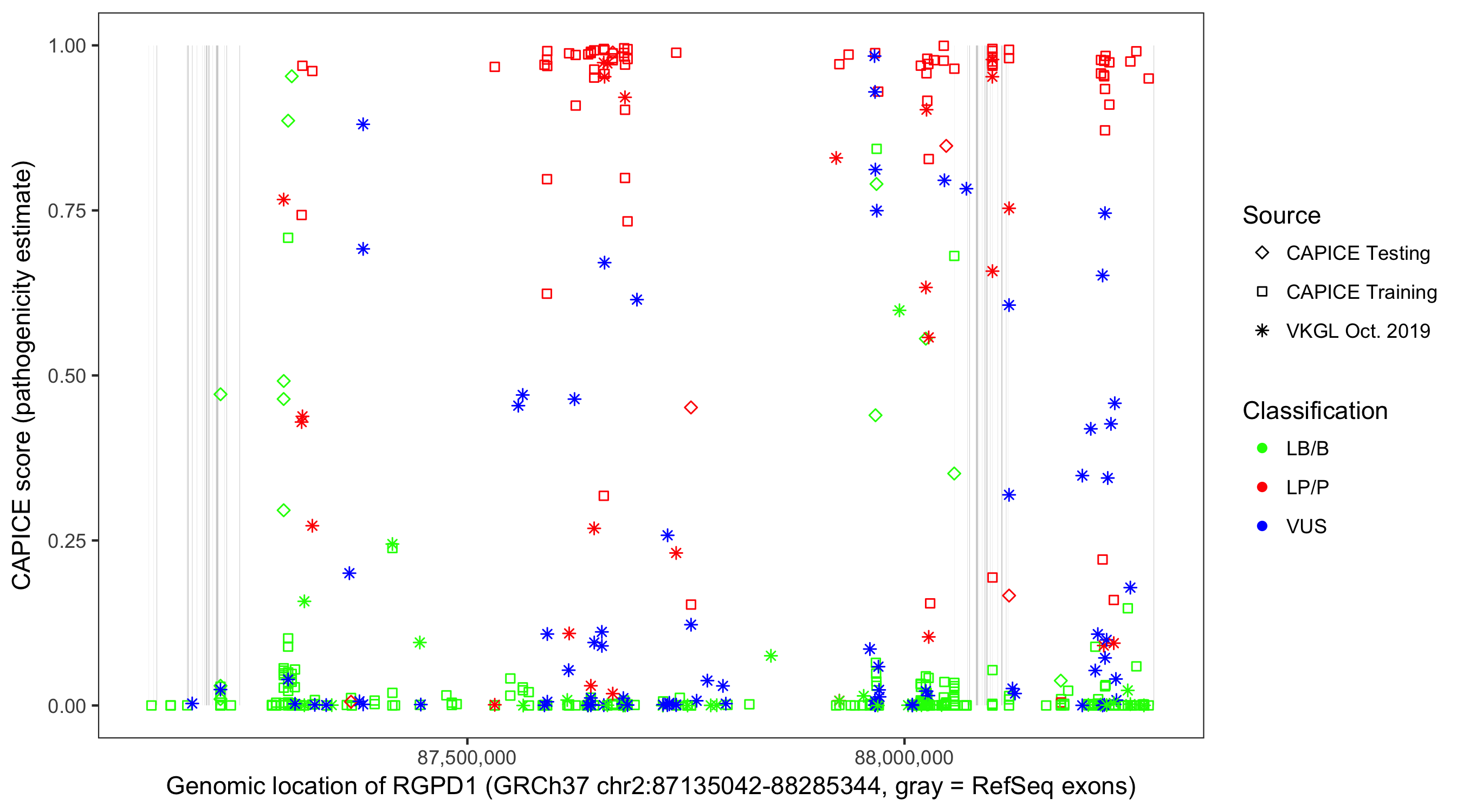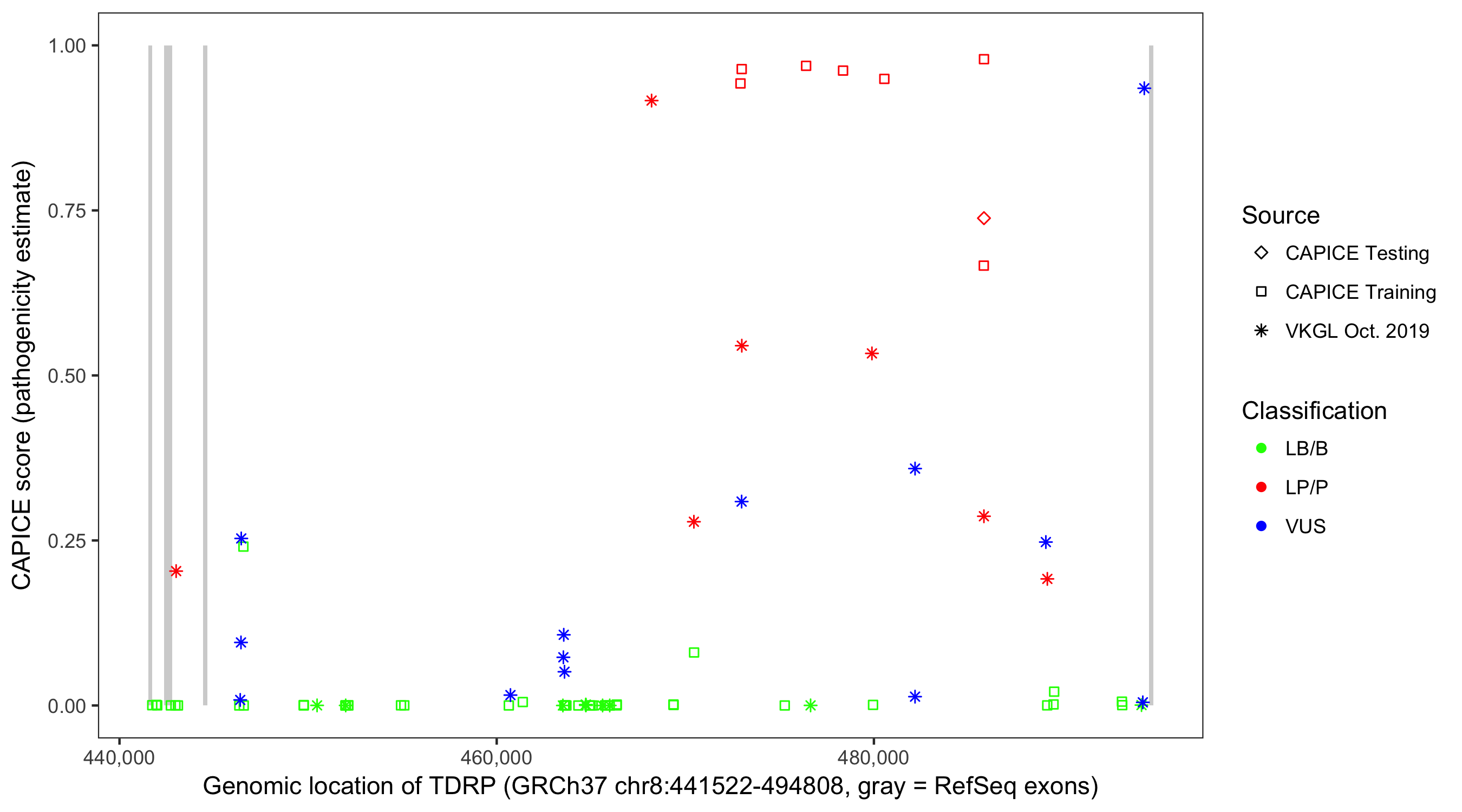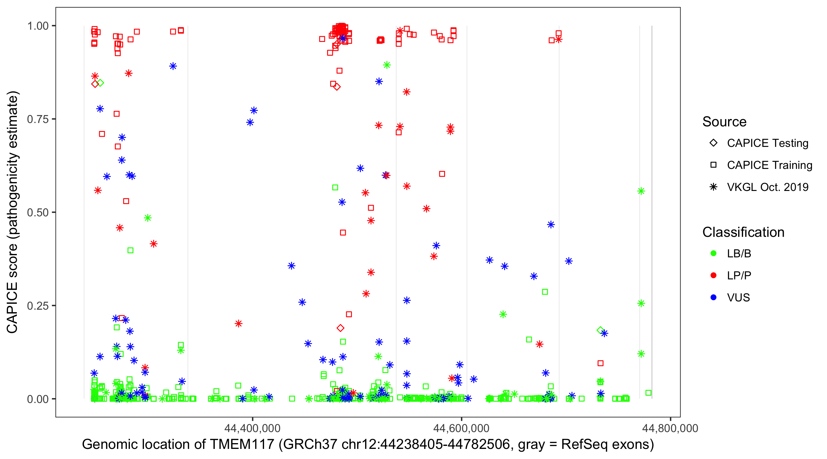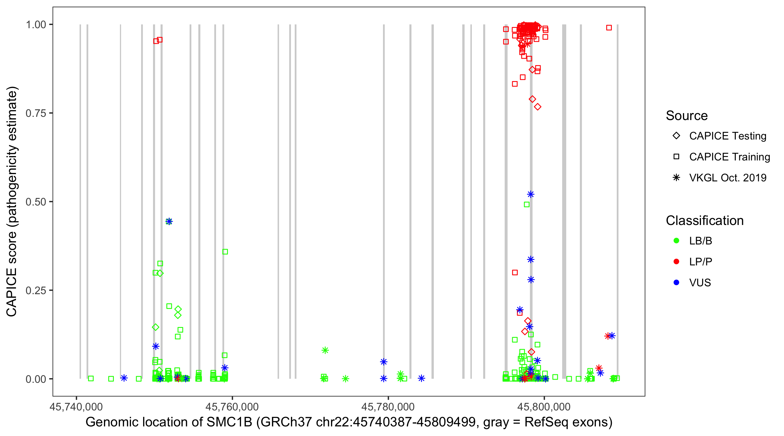 Shown are CAPICE train/test variants plus VKGL Oct 2019.