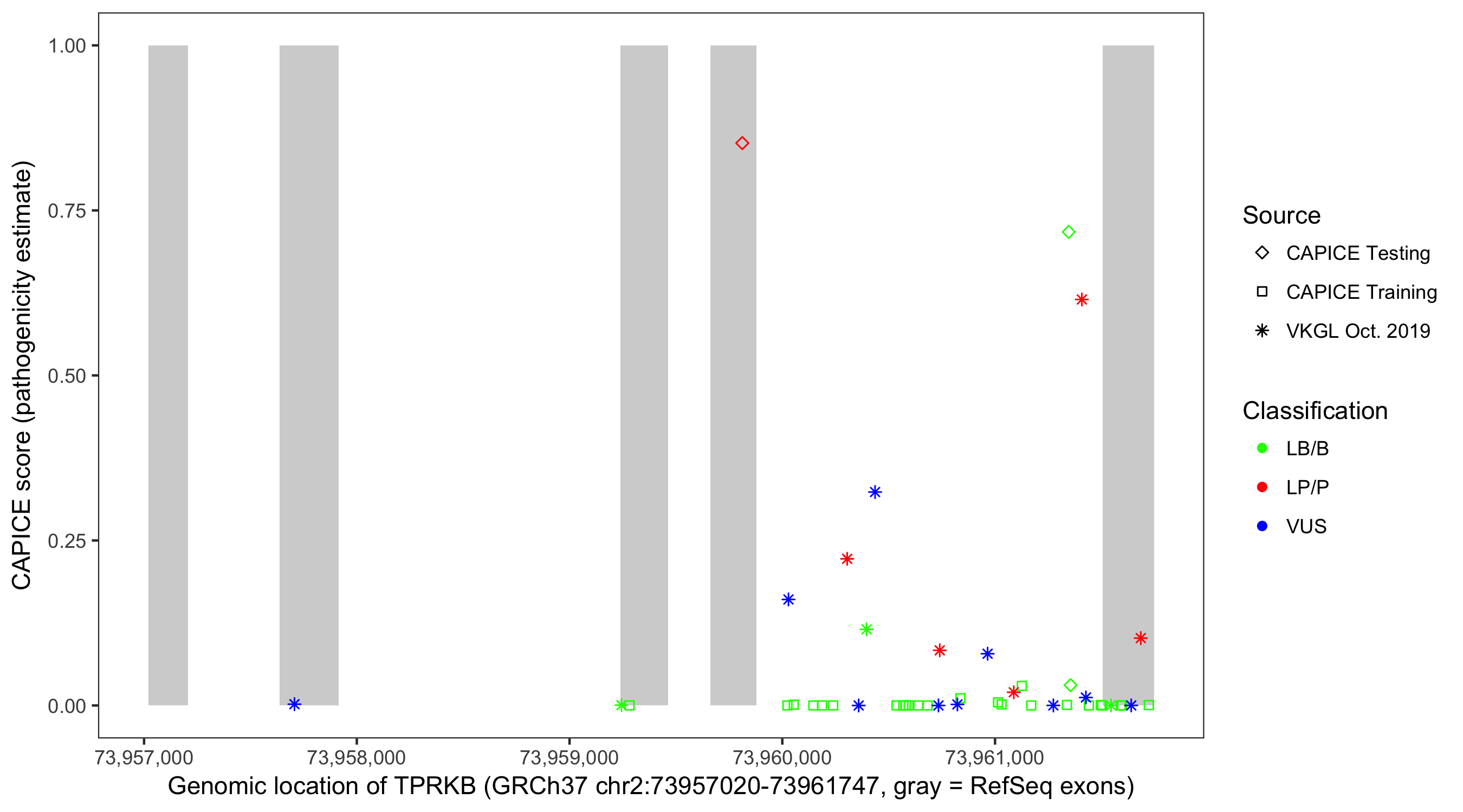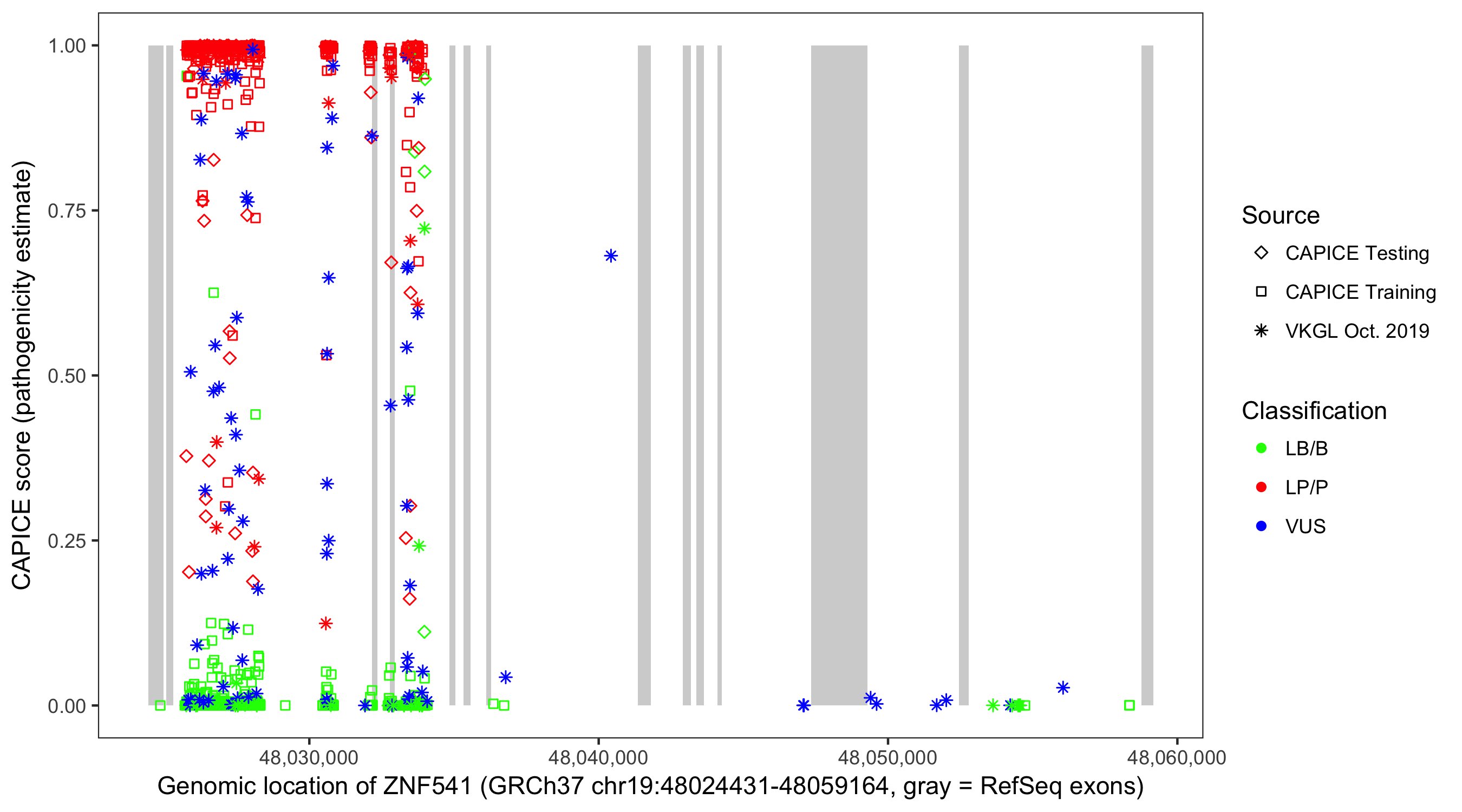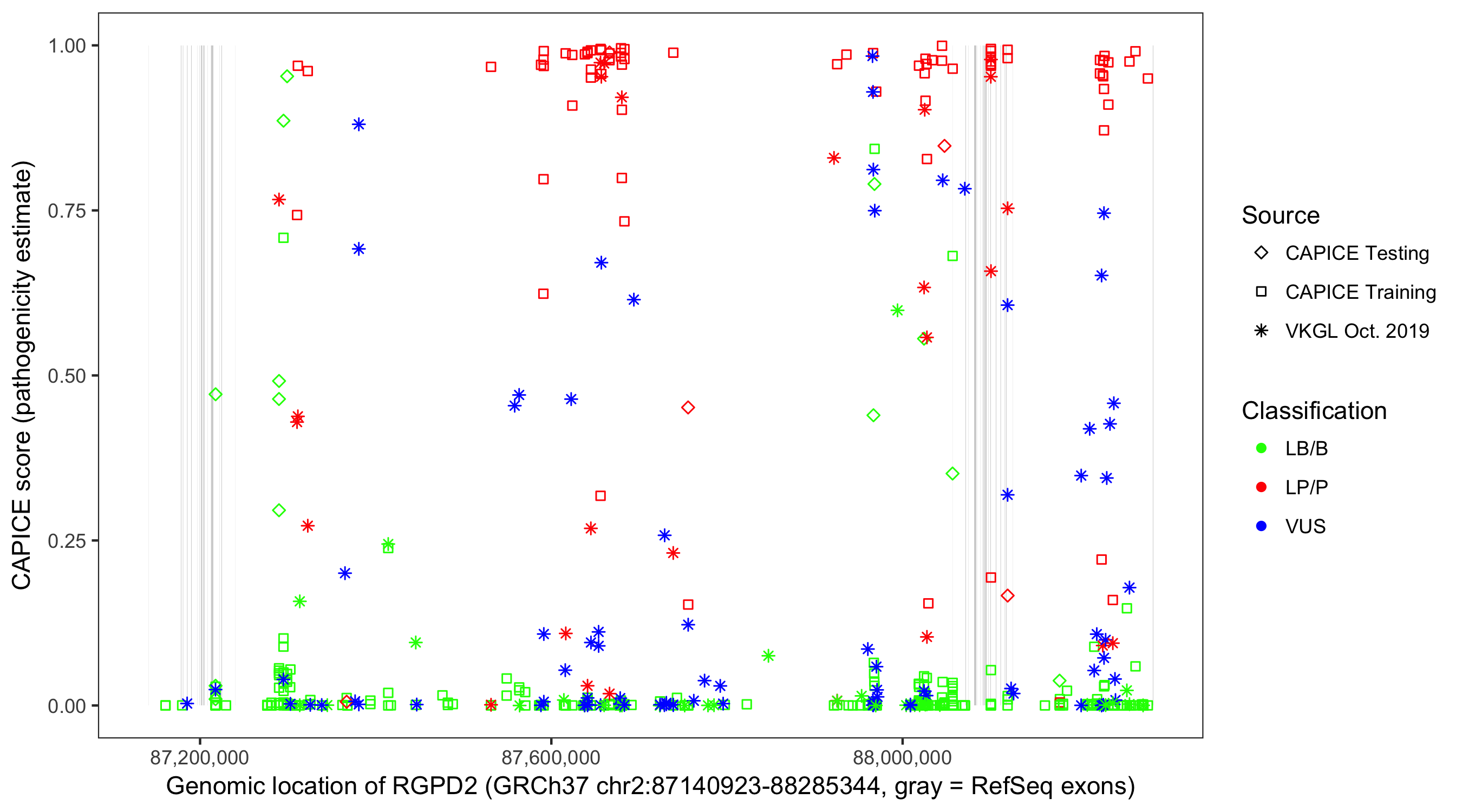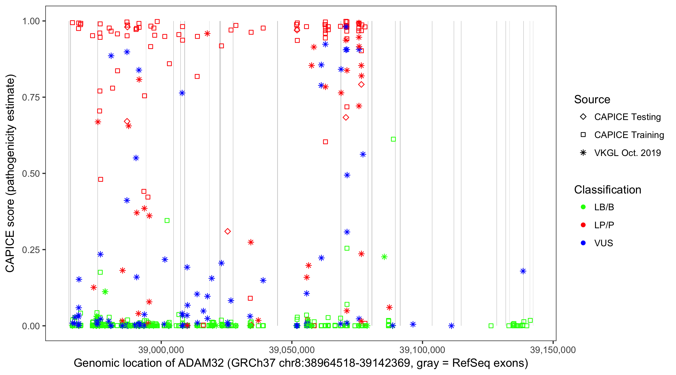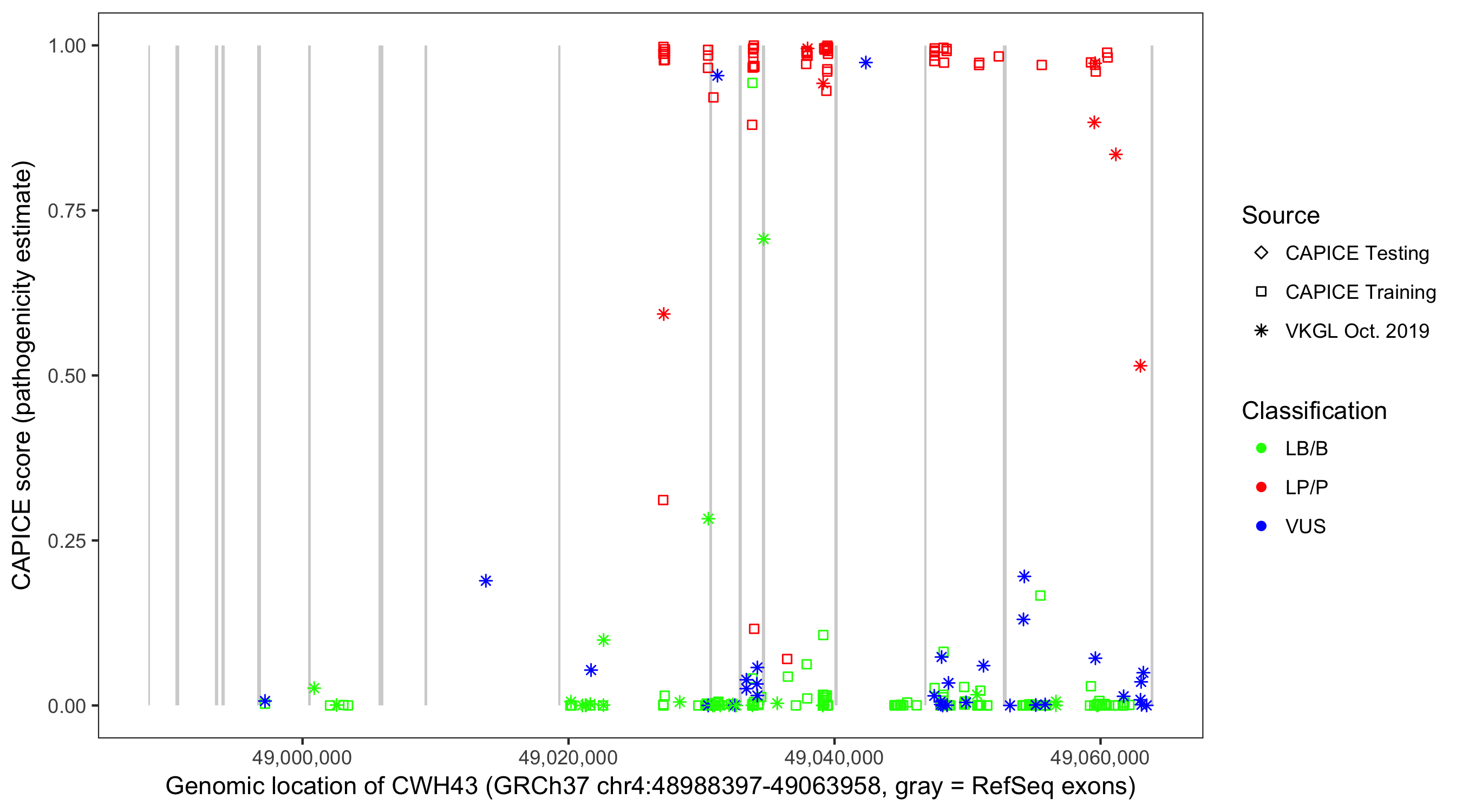 Shown are CAPICE train/test variants plus VKGL Oct 2019.