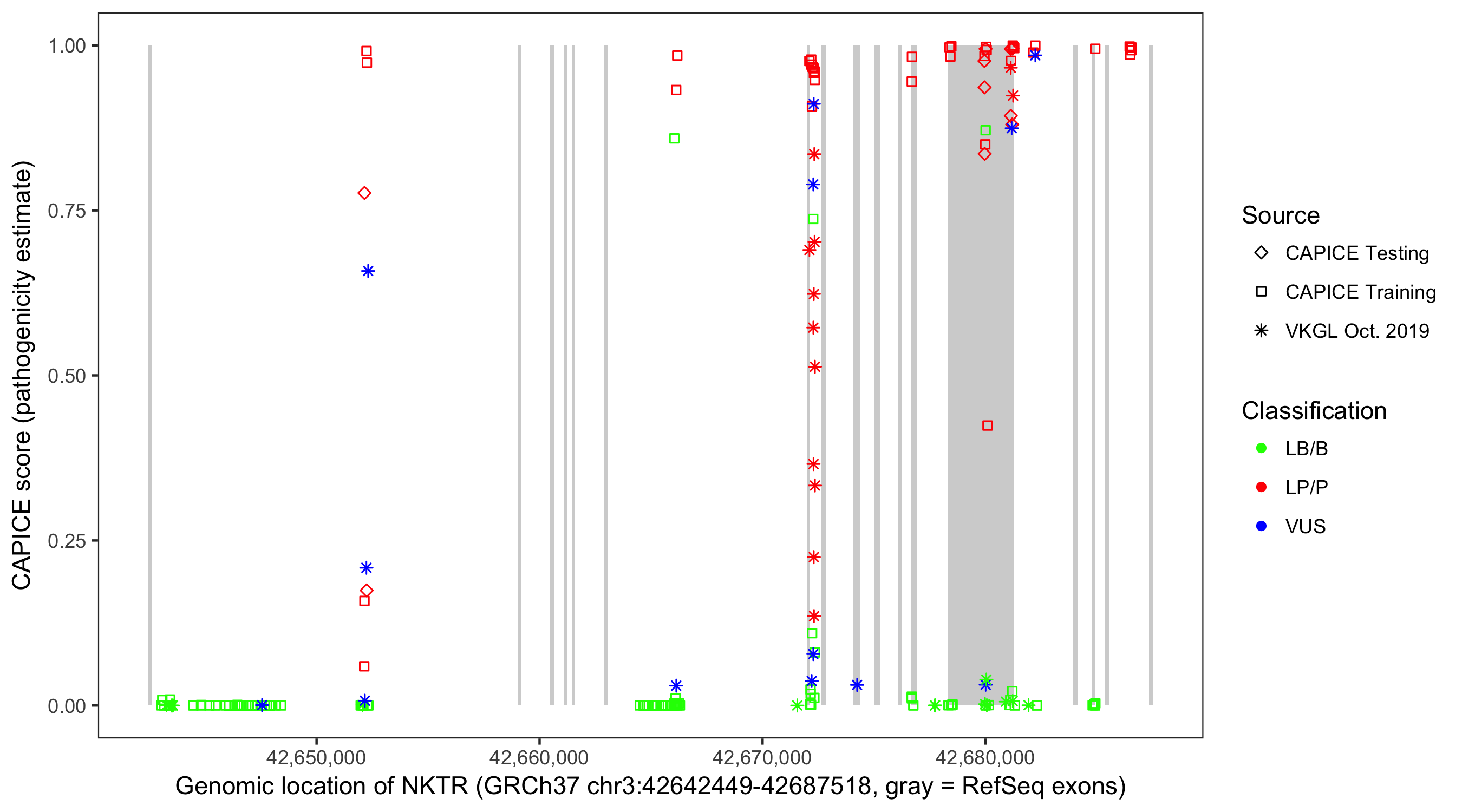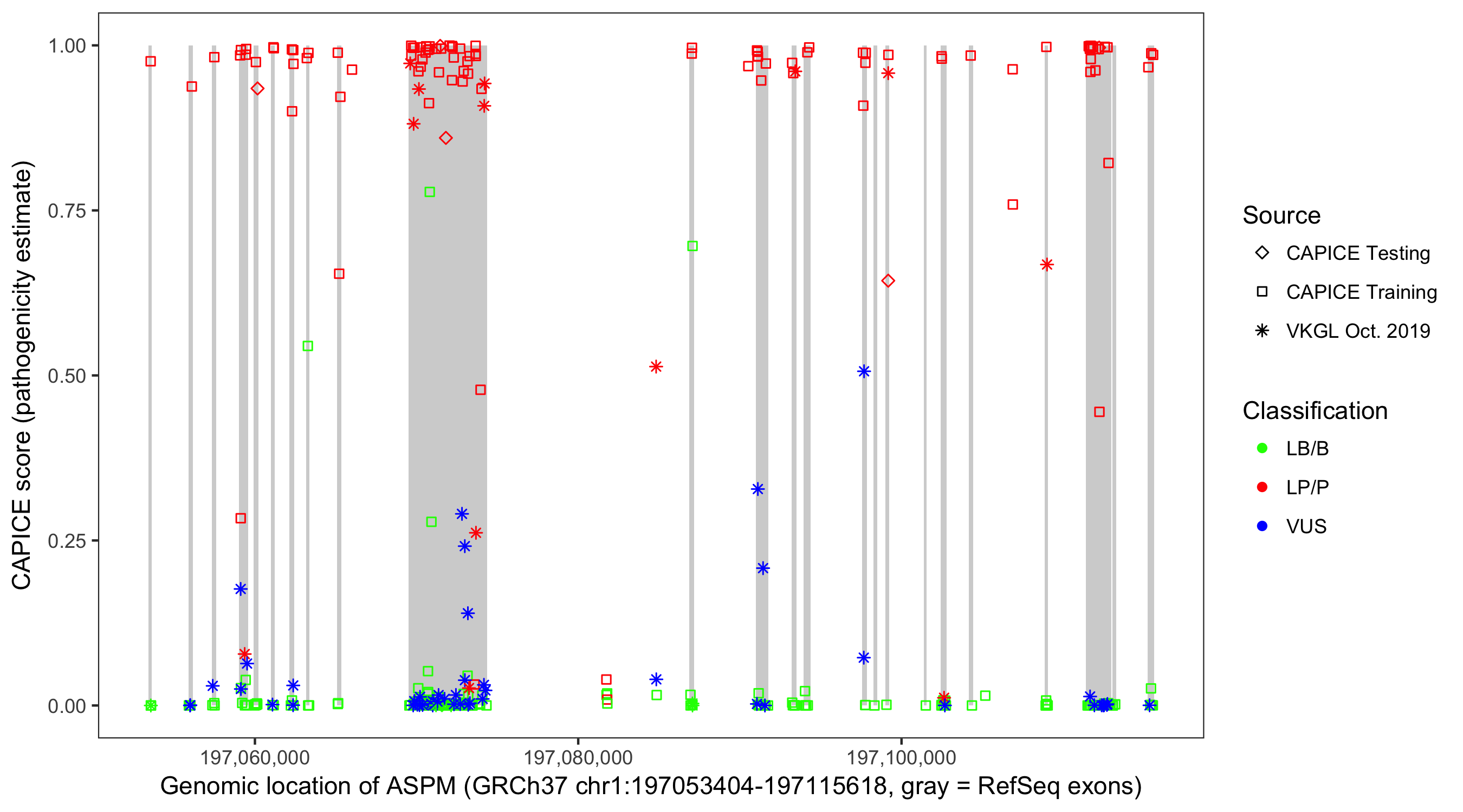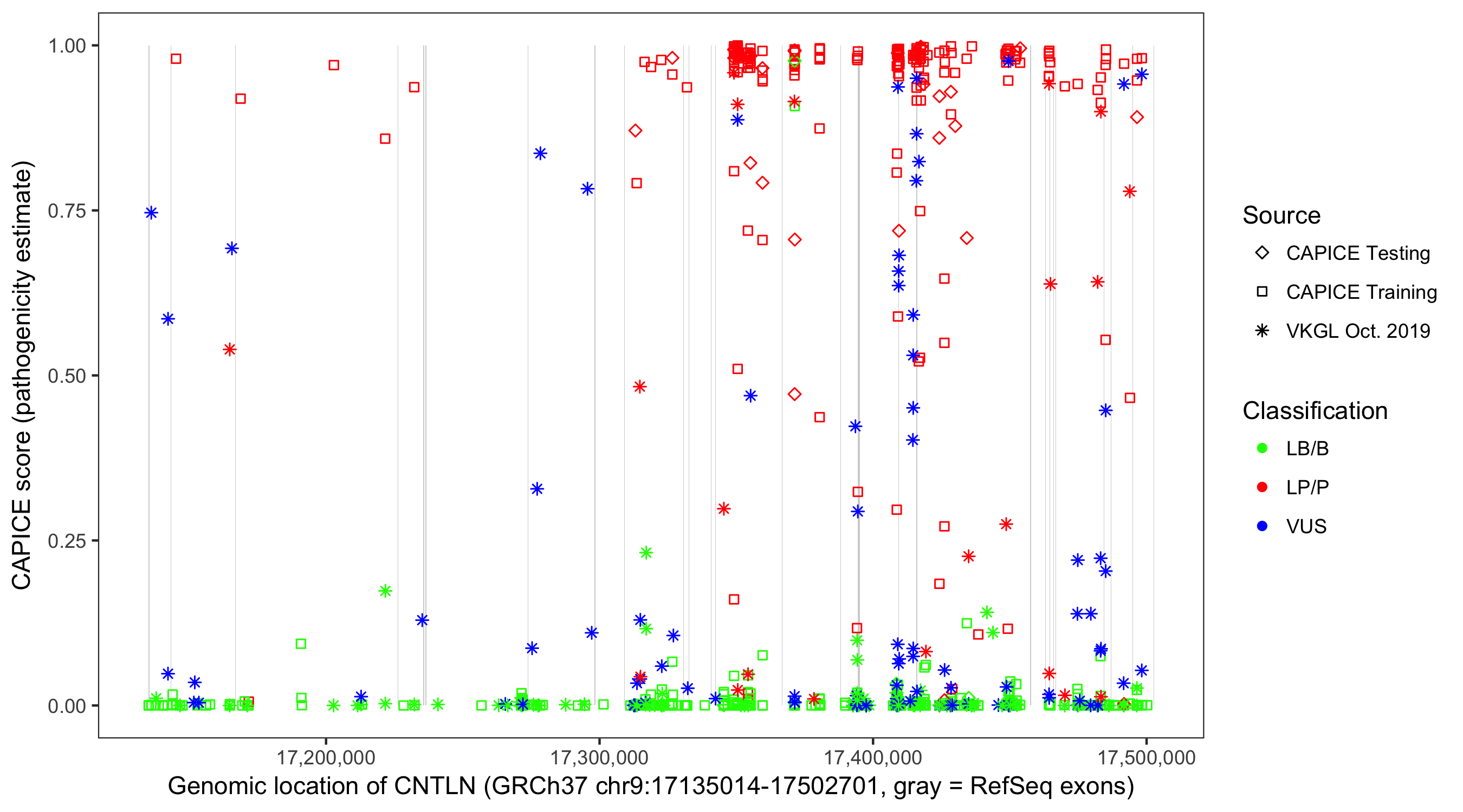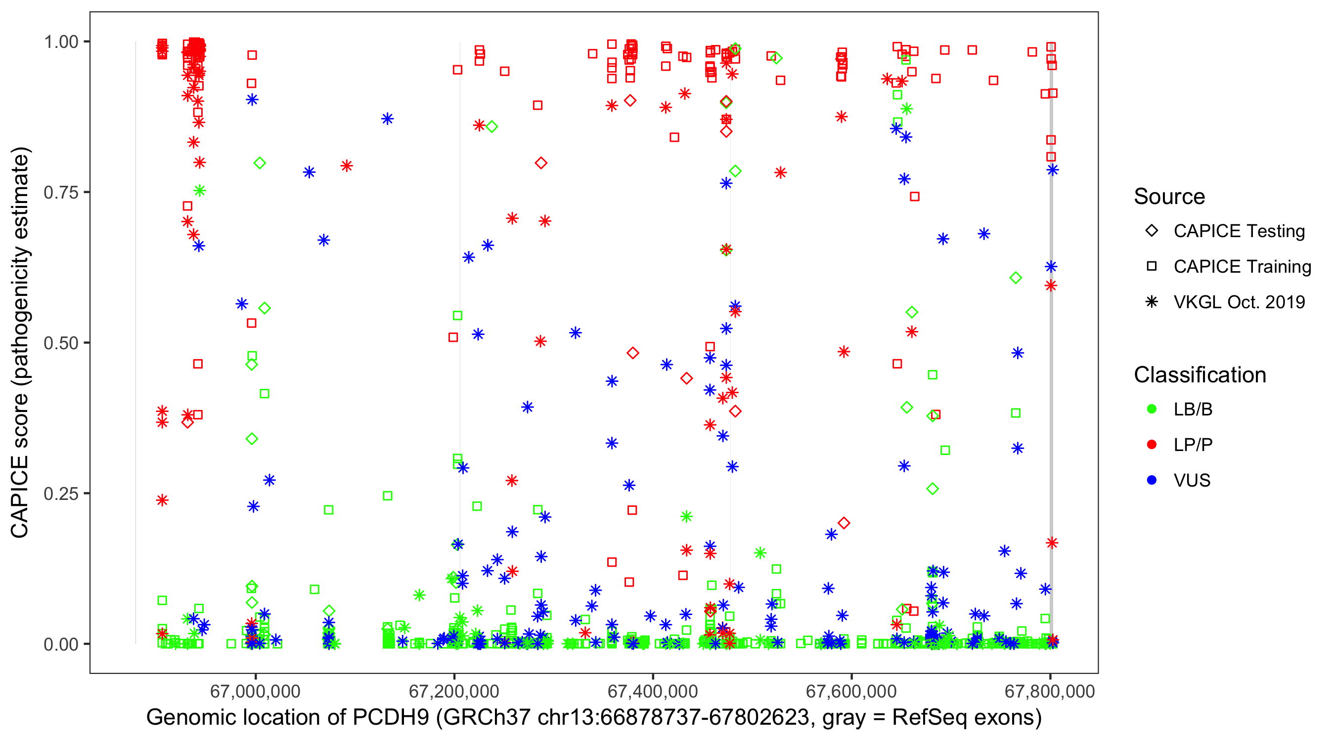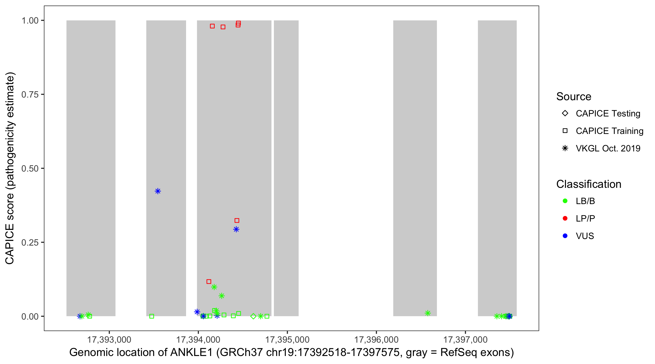 Shown are CAPICE train/test variants plus VKGL Oct 2019.