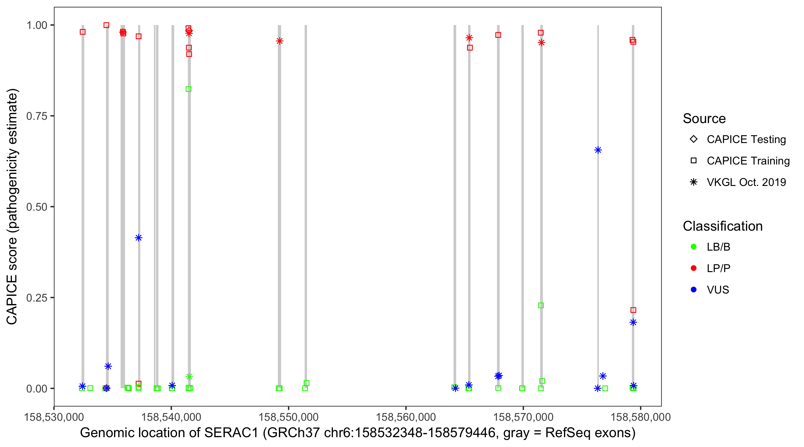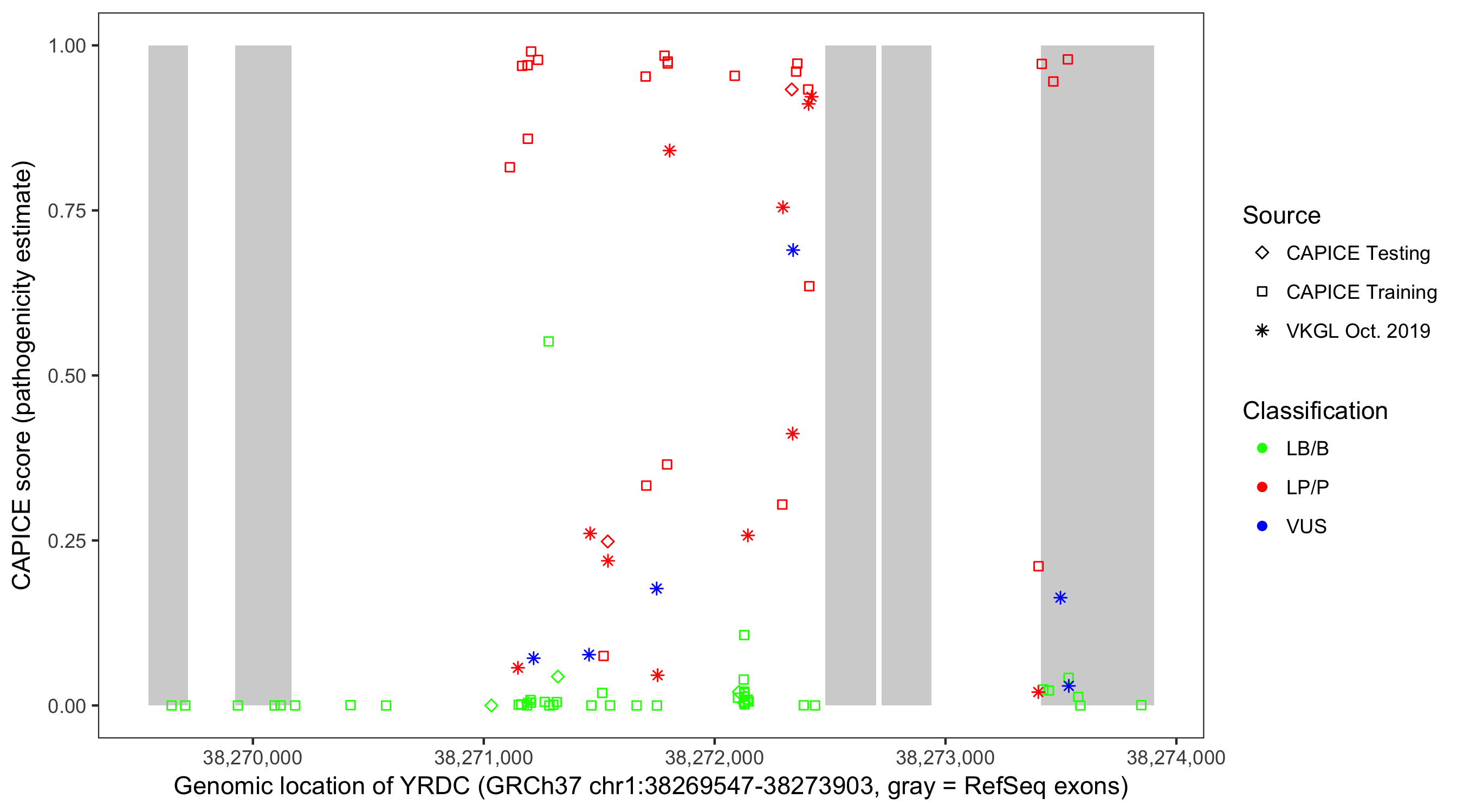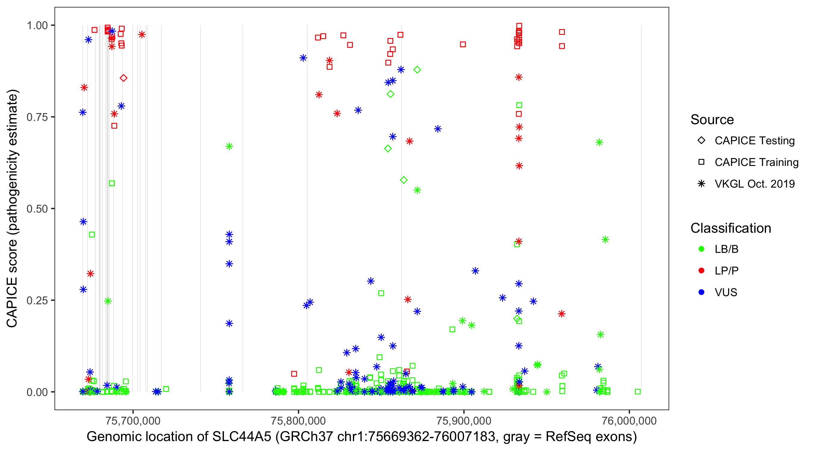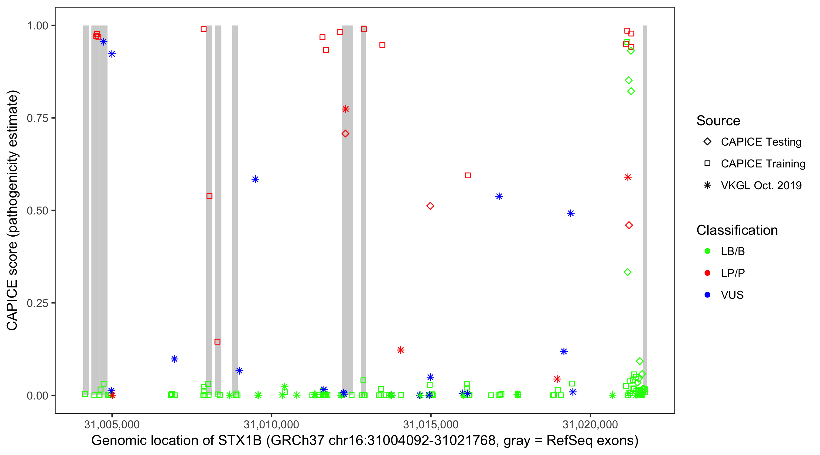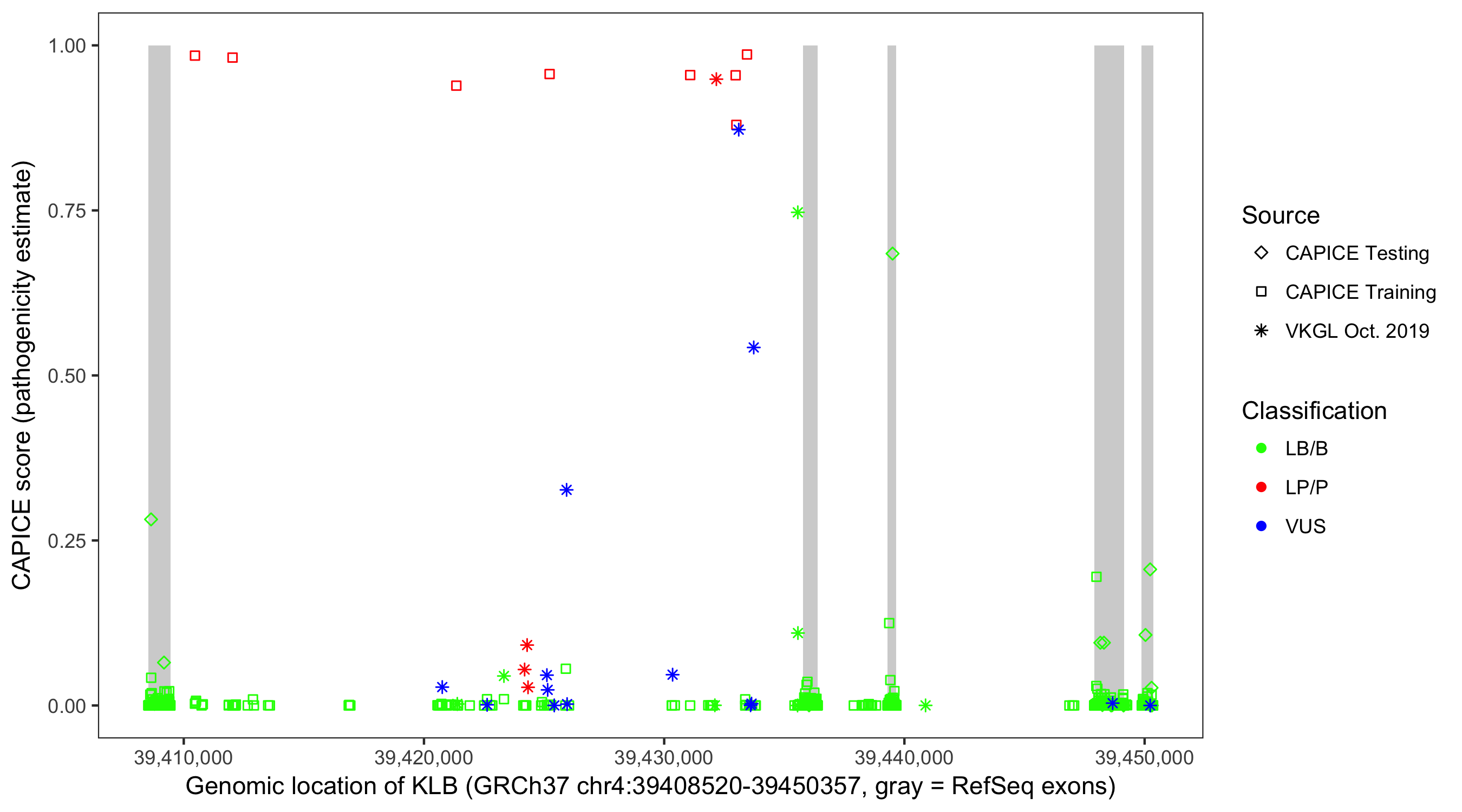 Shown are CAPICE train/test variants plus VKGL Oct 2019.