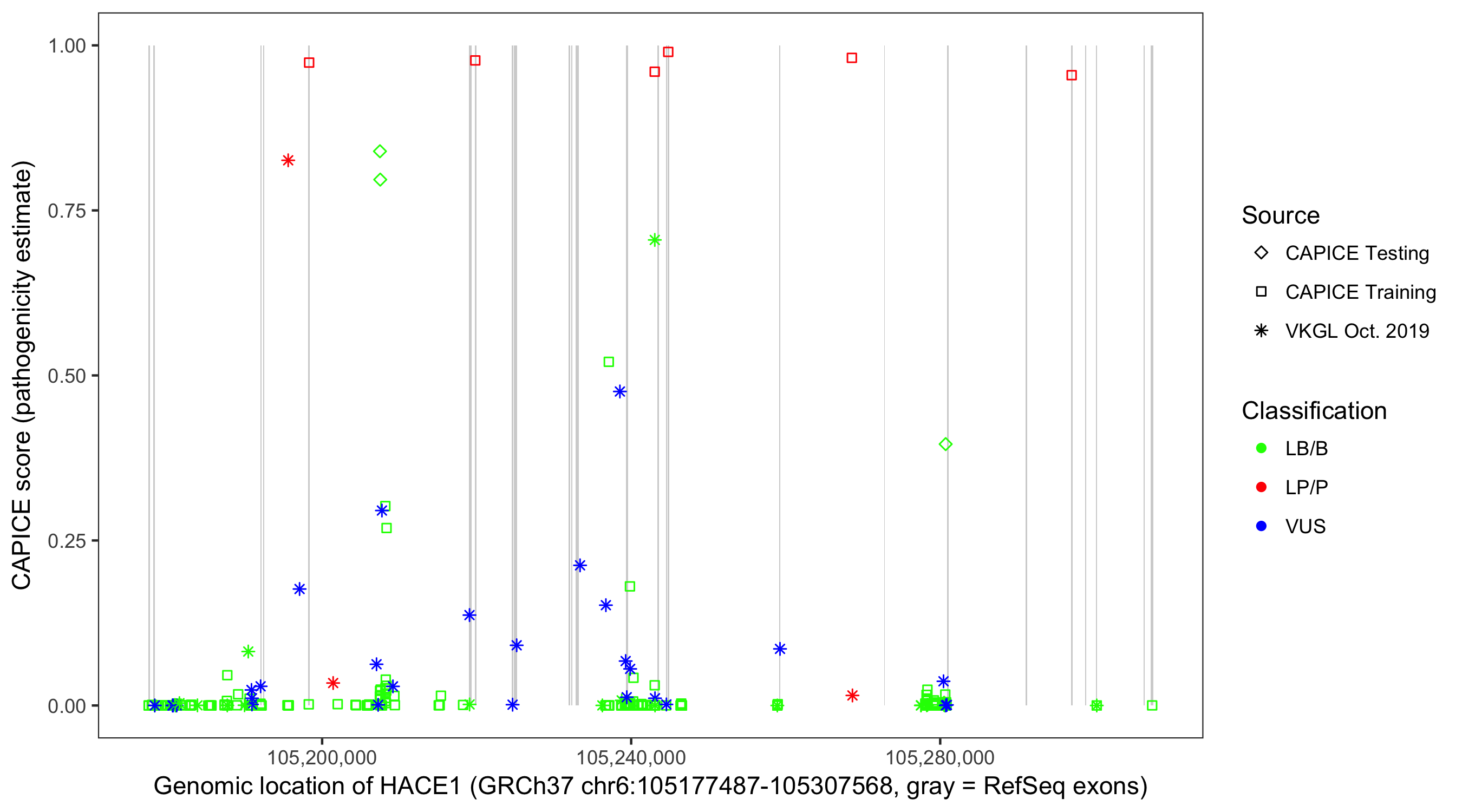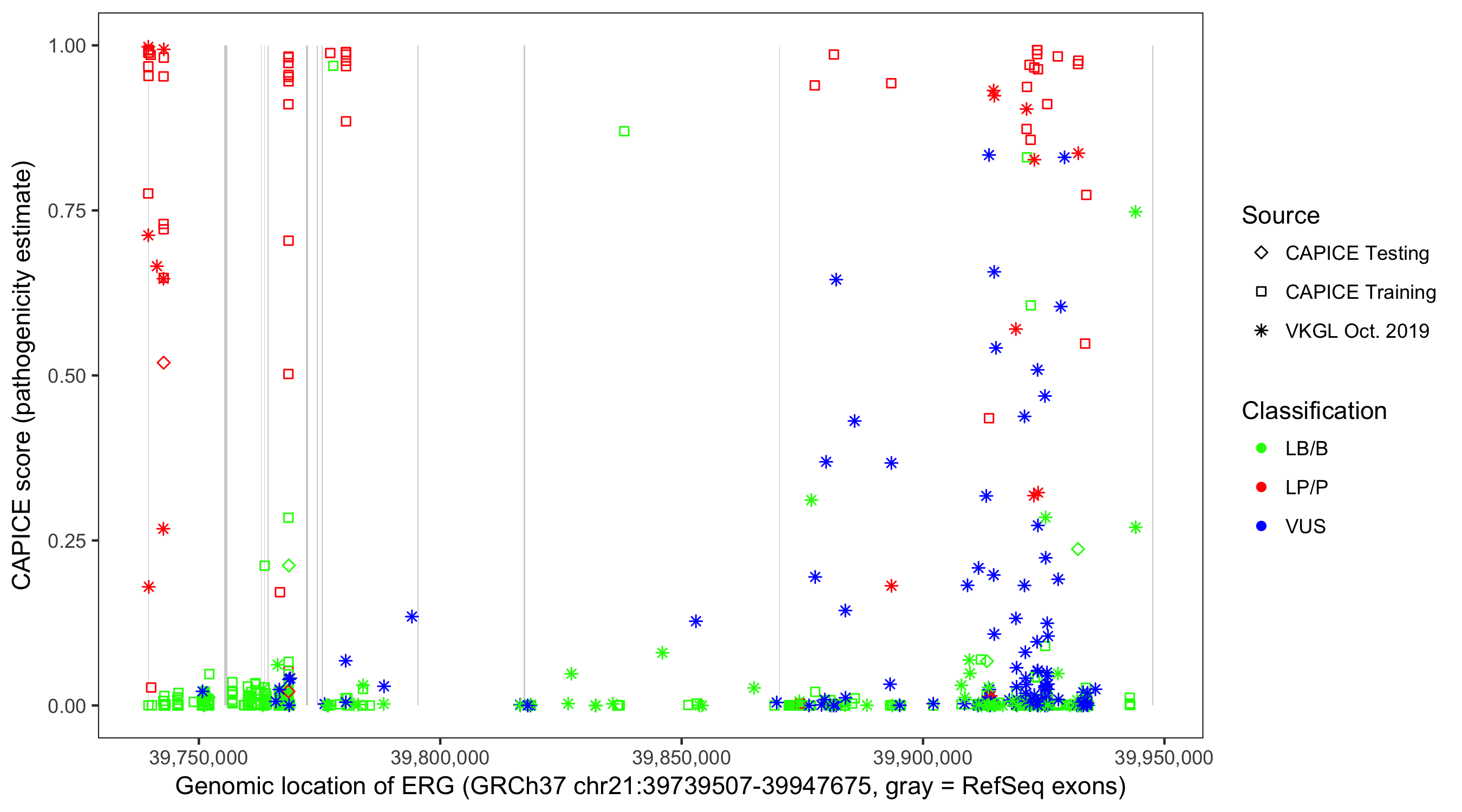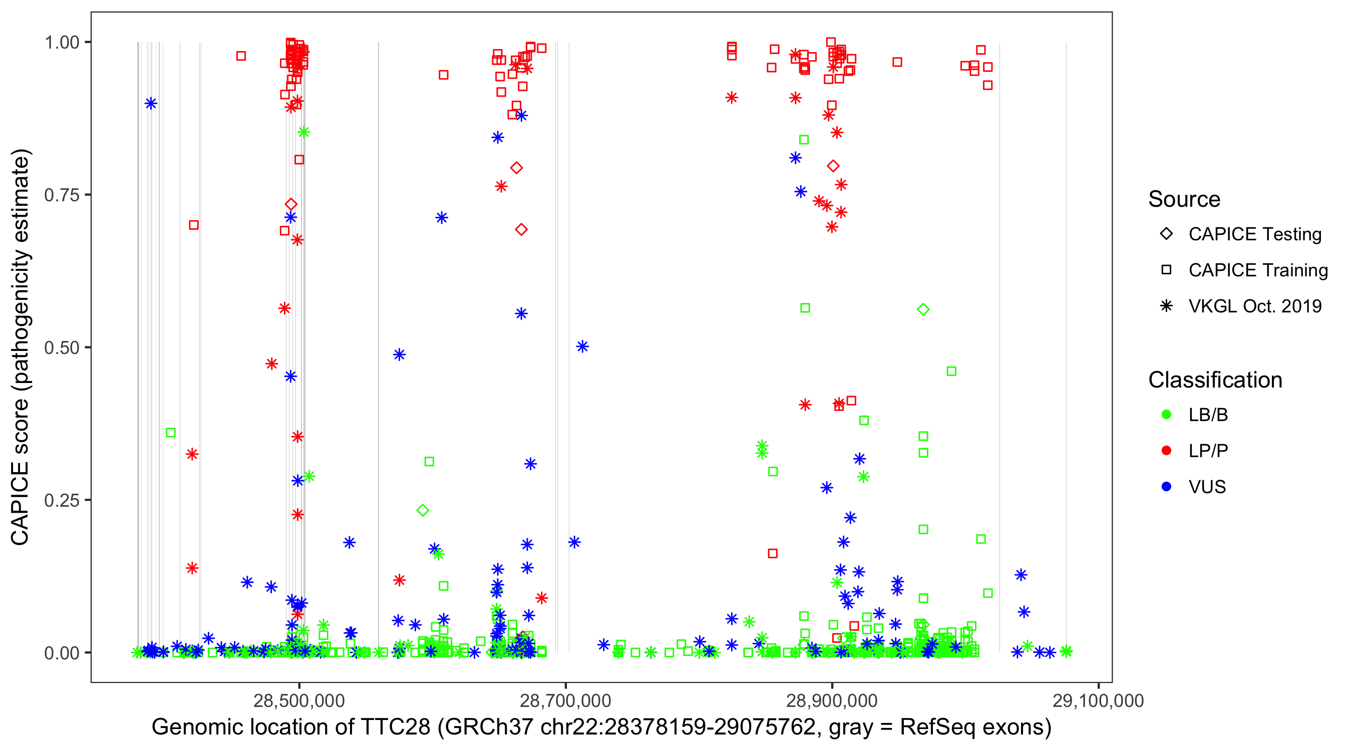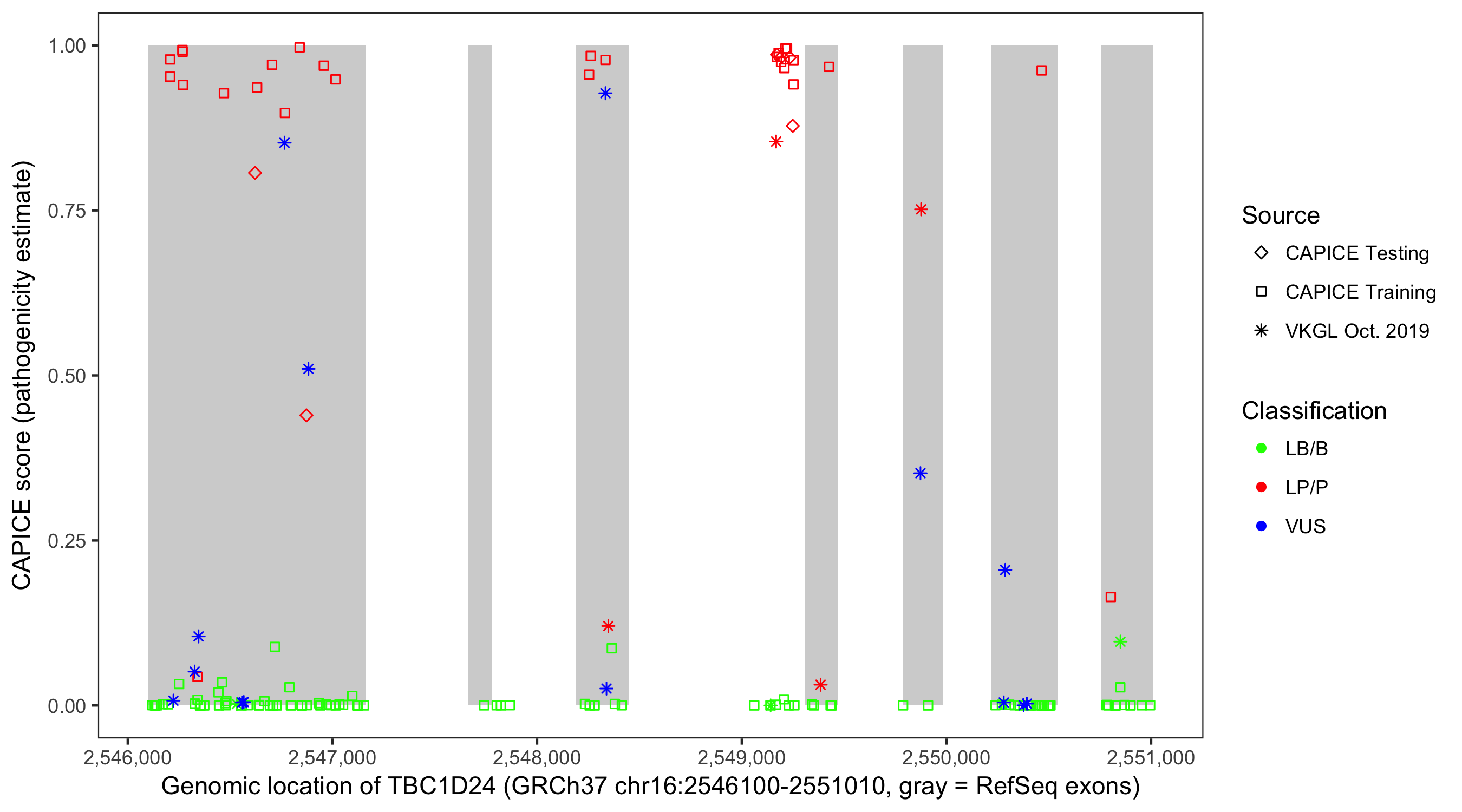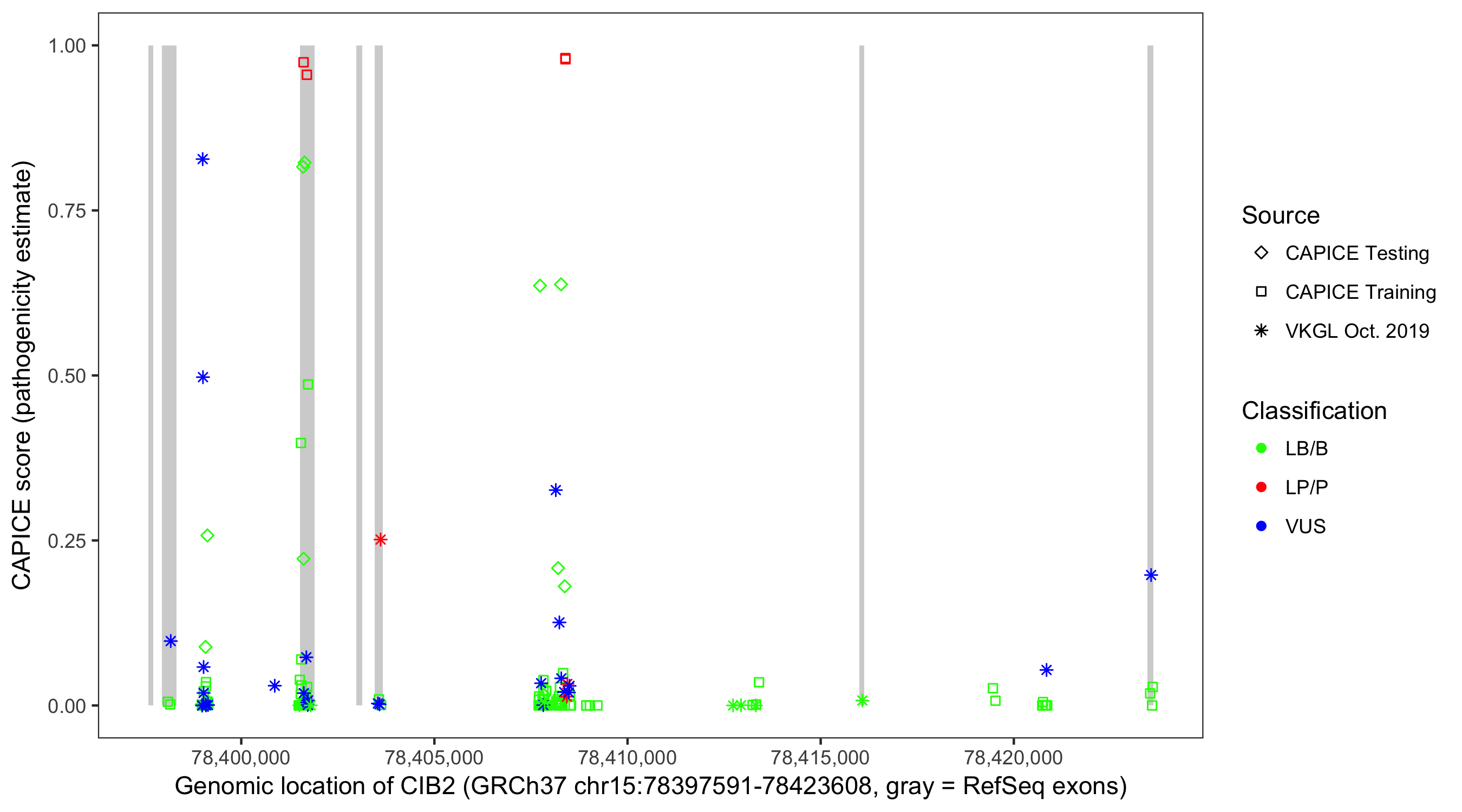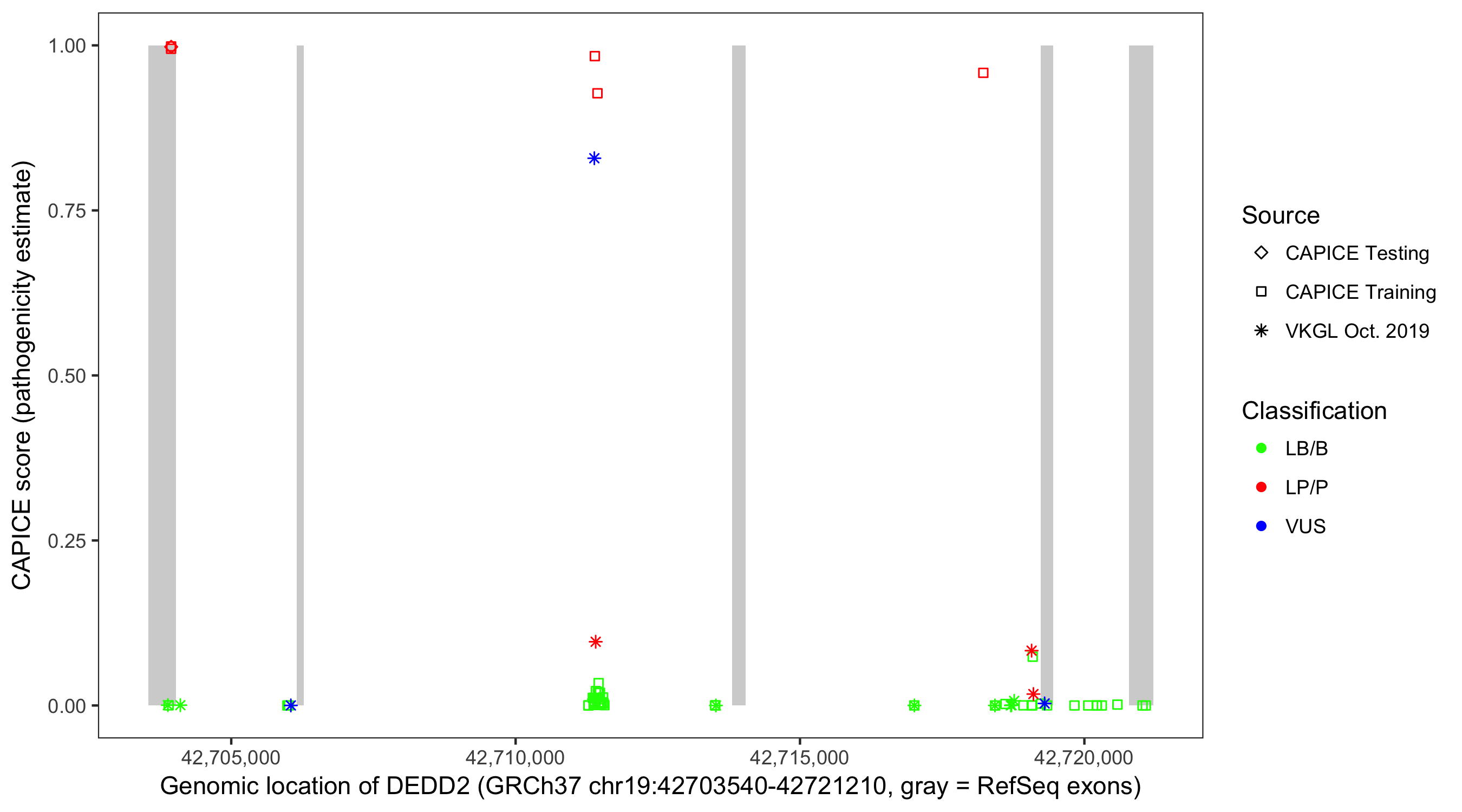 Shown are CAPICE train/test variants plus VKGL Oct 2019.