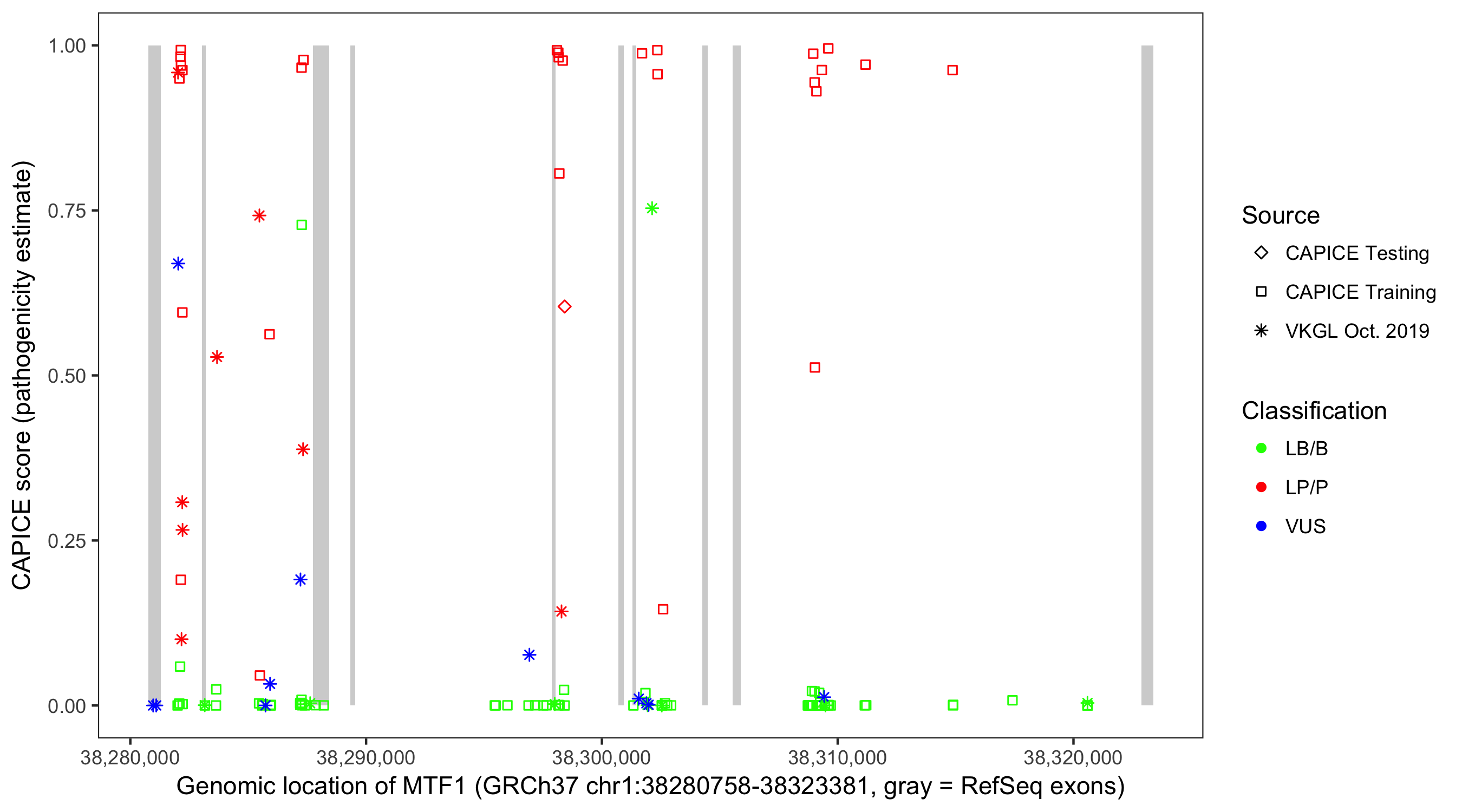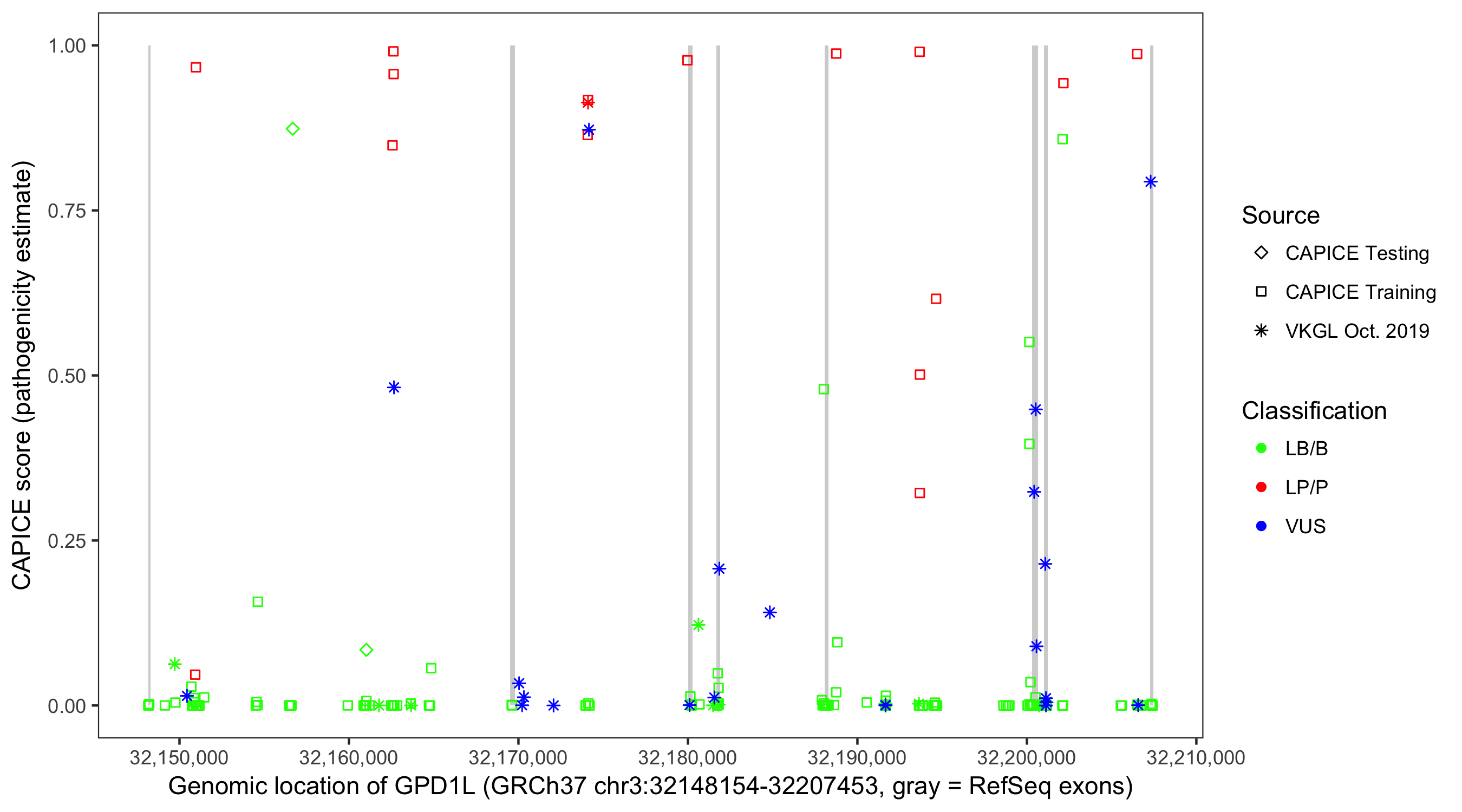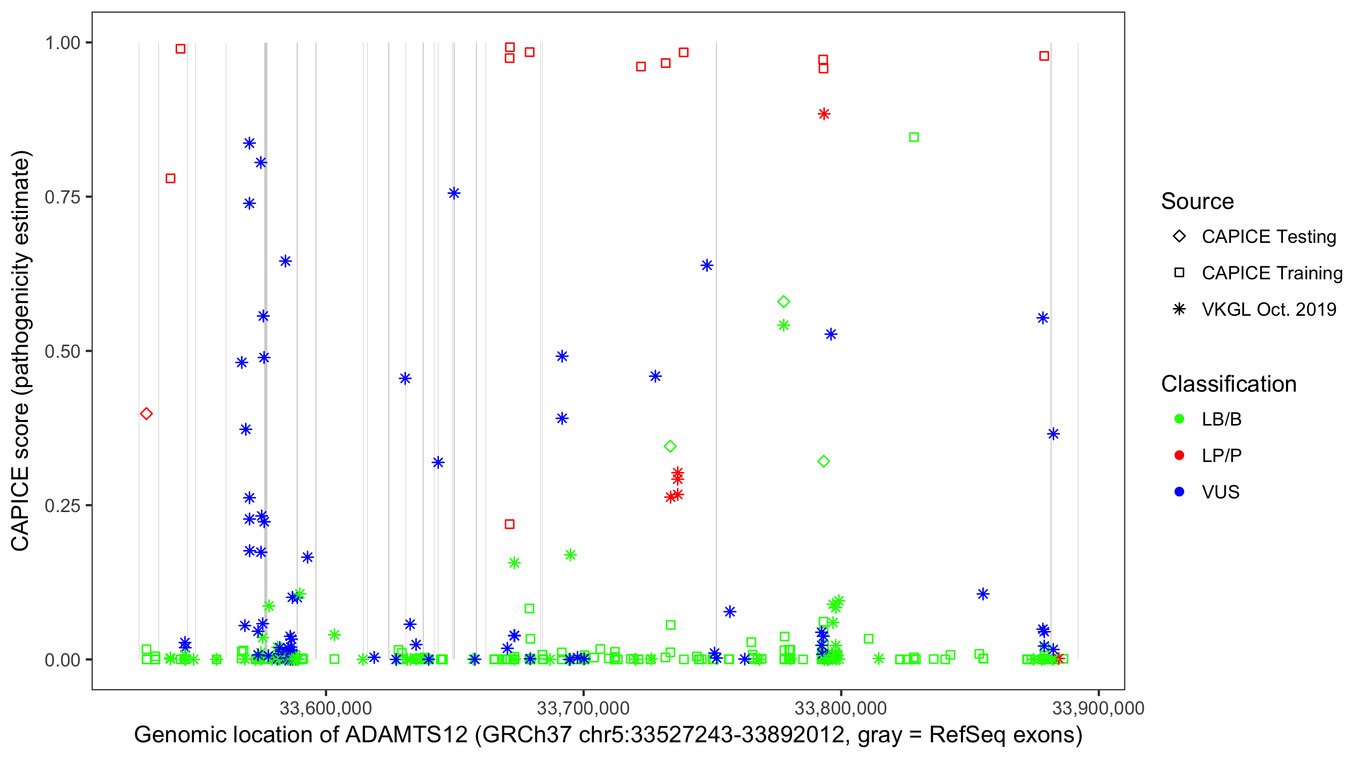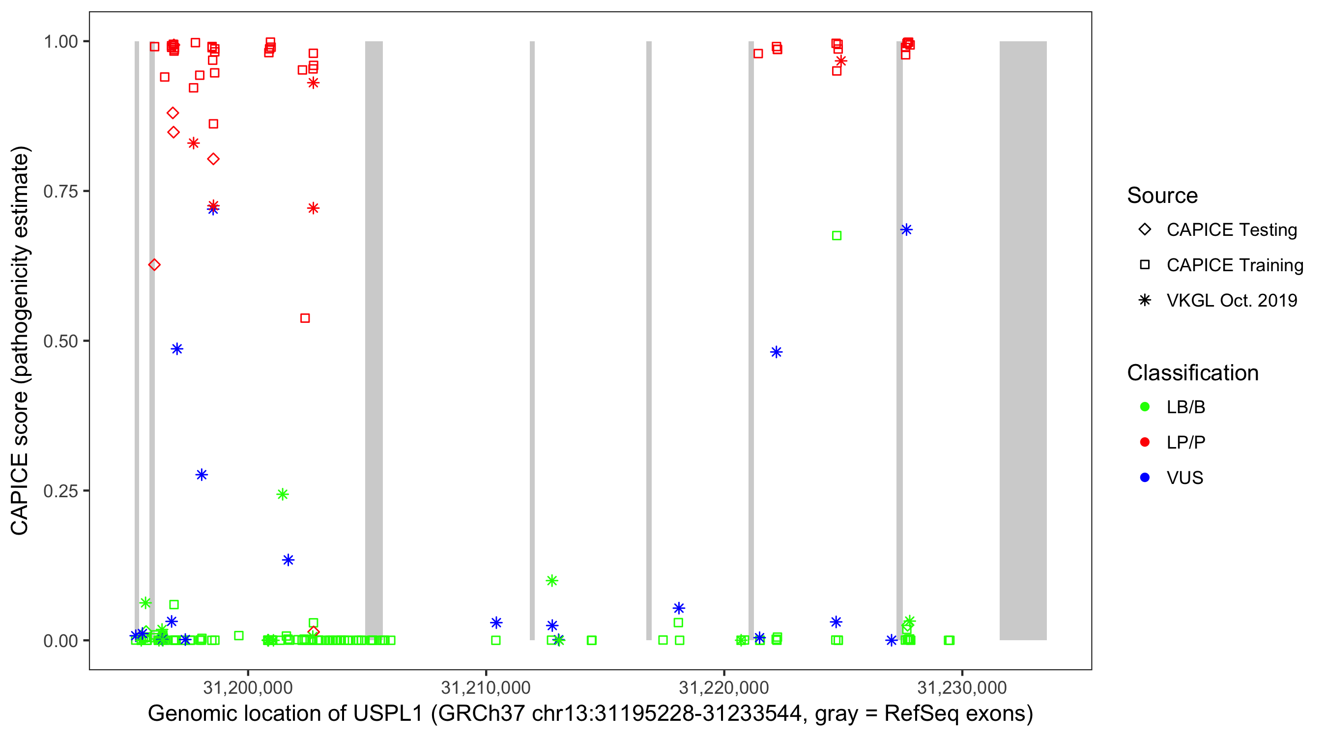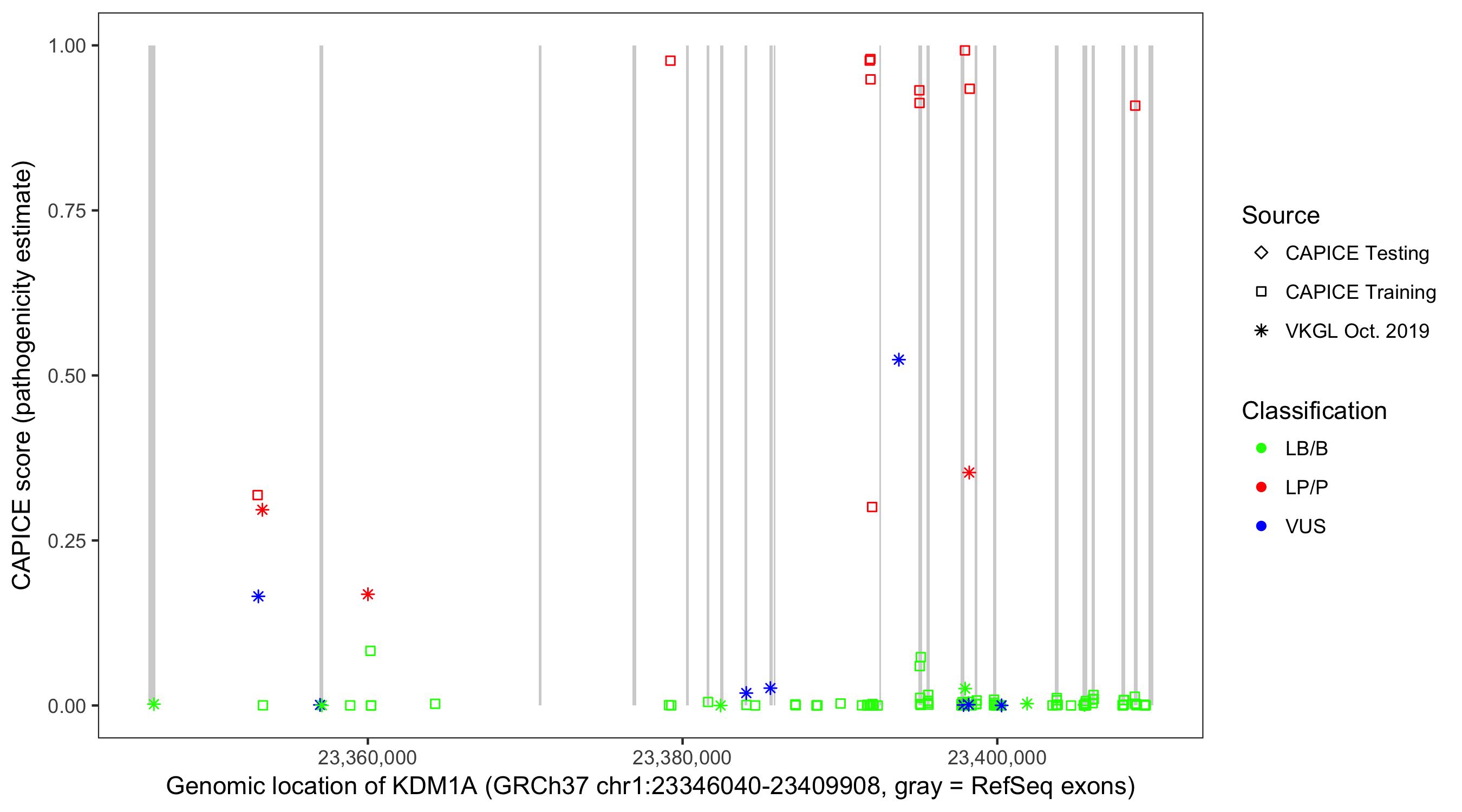 Shown are CAPICE train/test variants plus VKGL Oct 2019.