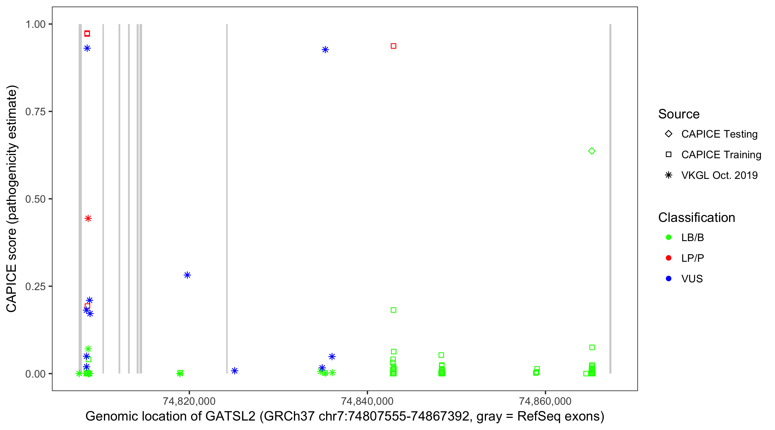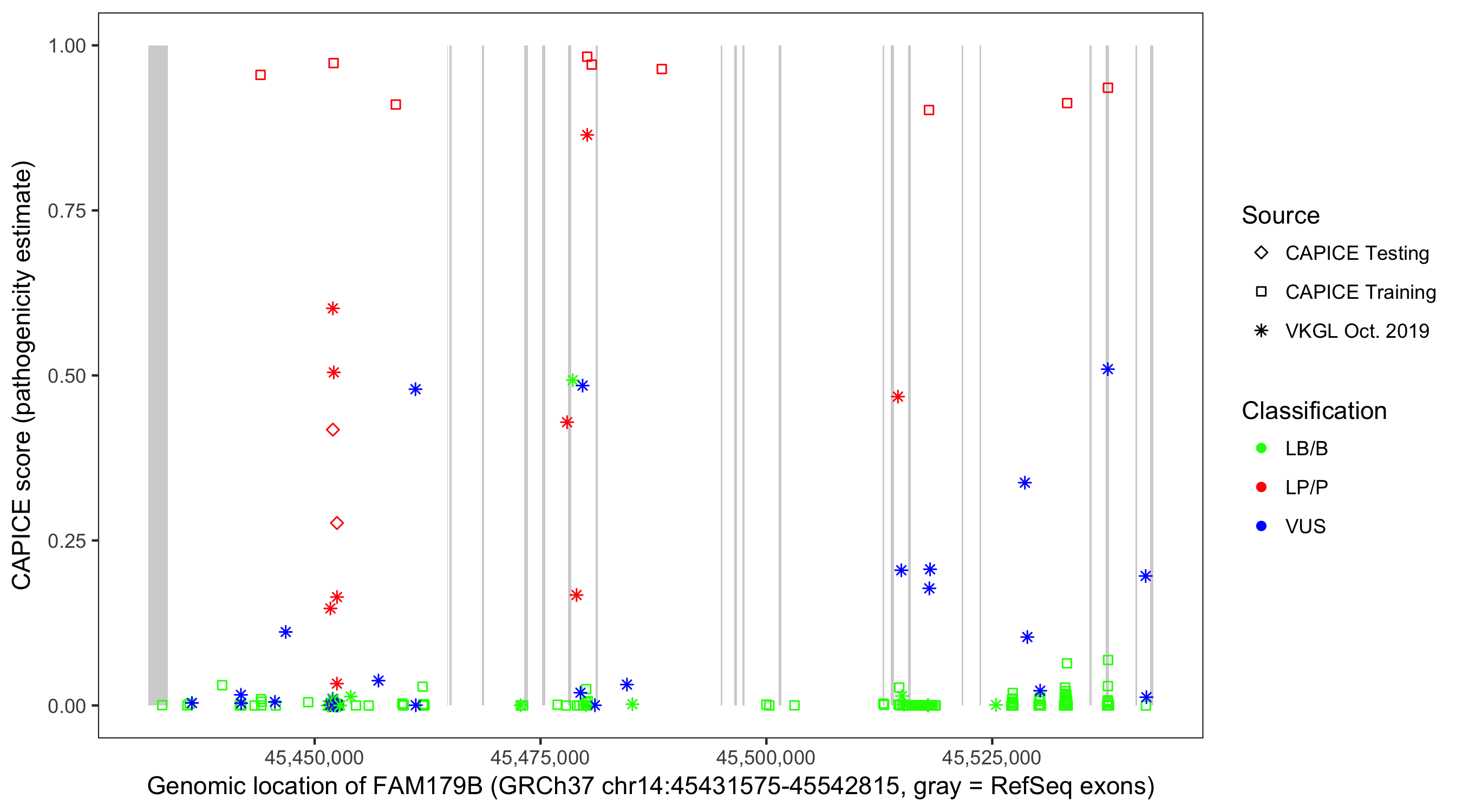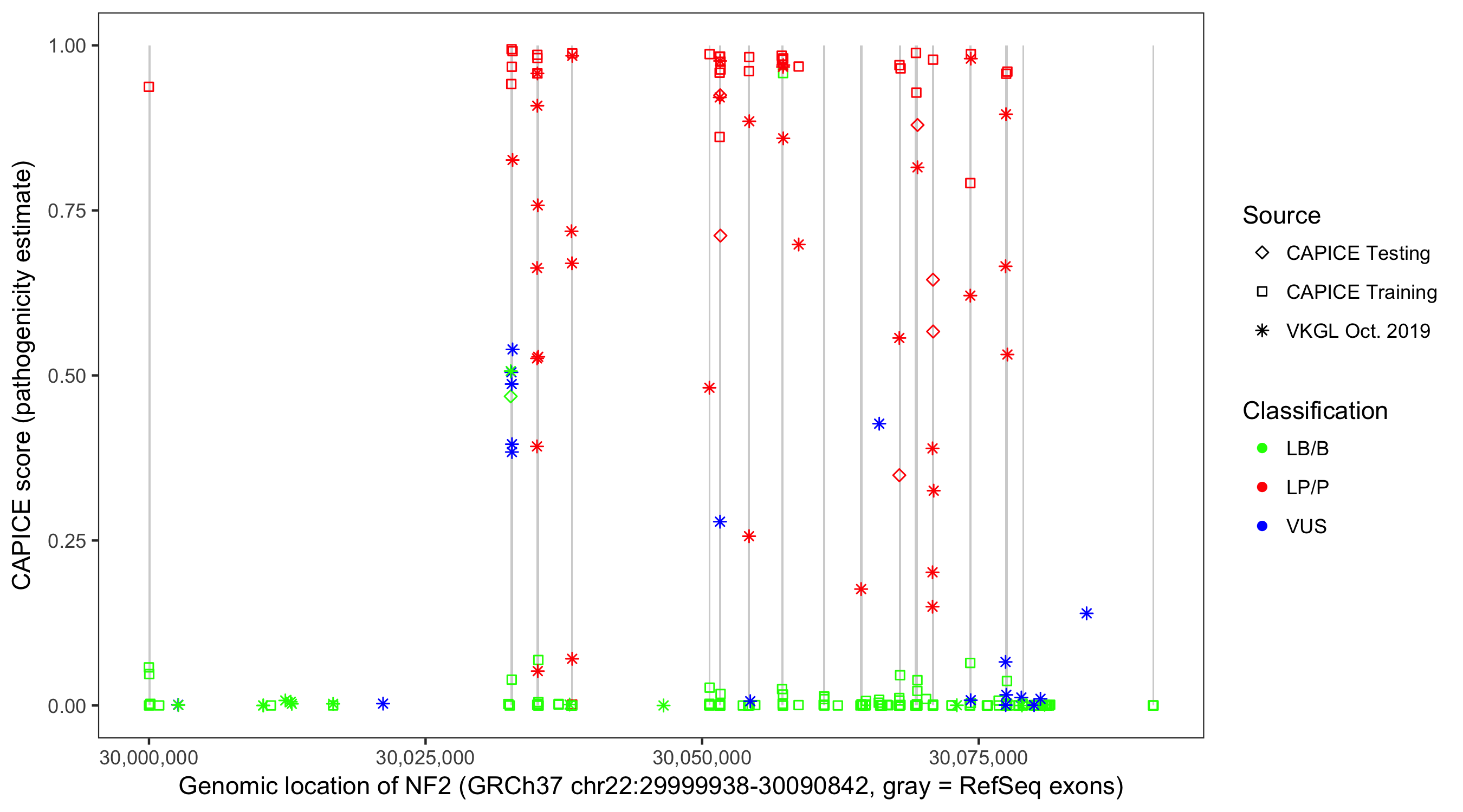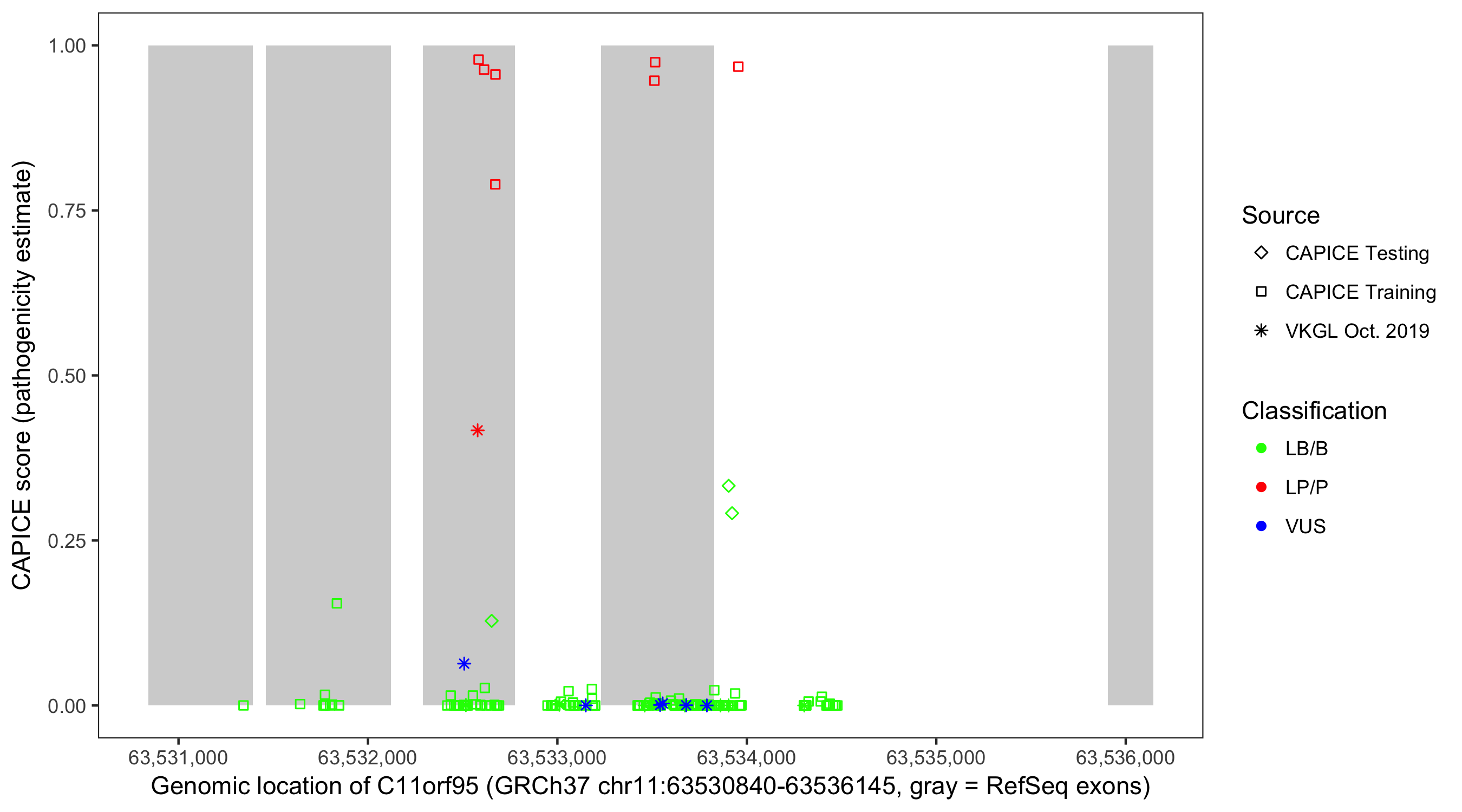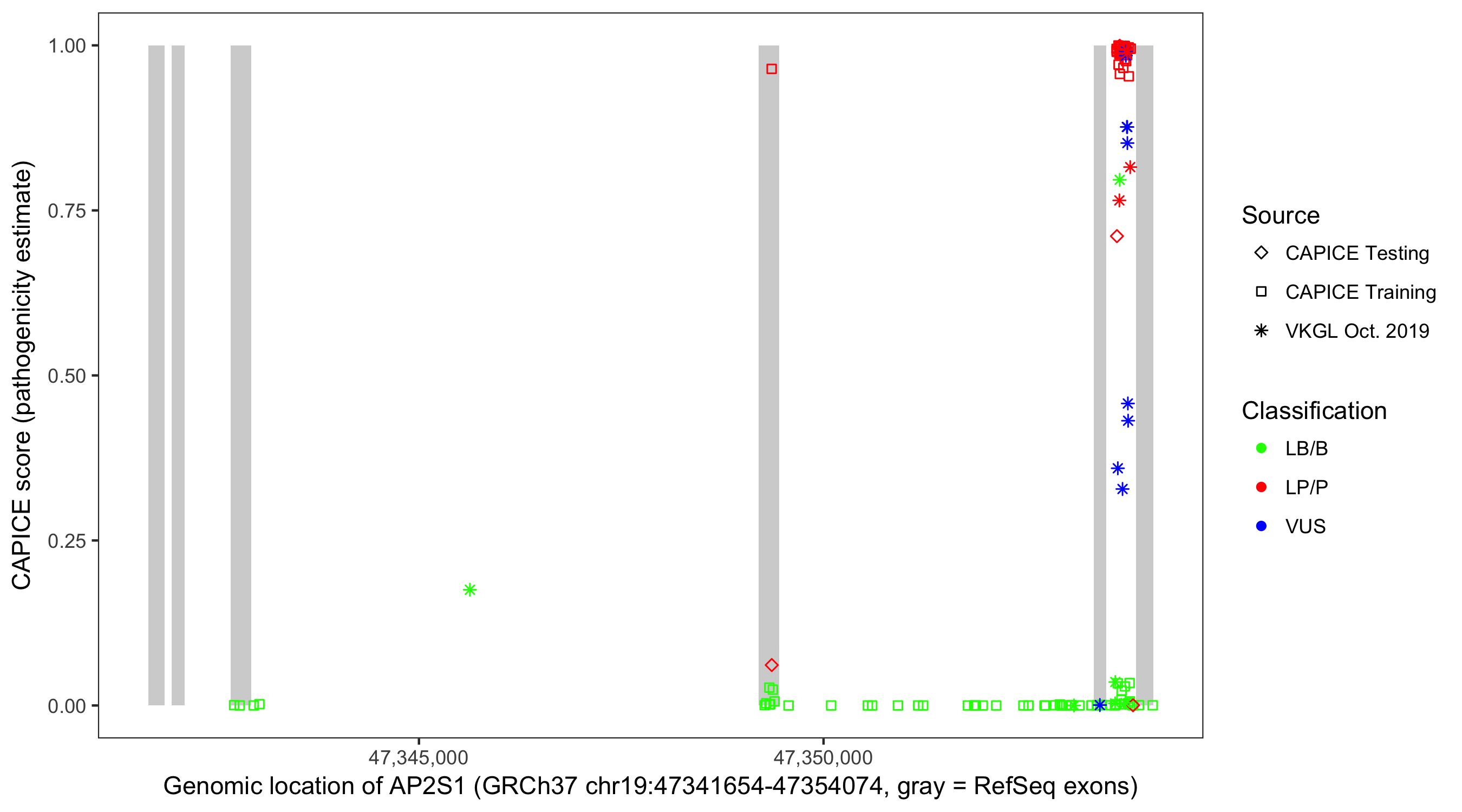 Shown are CAPICE train/test variants plus VKGL Oct 2019.