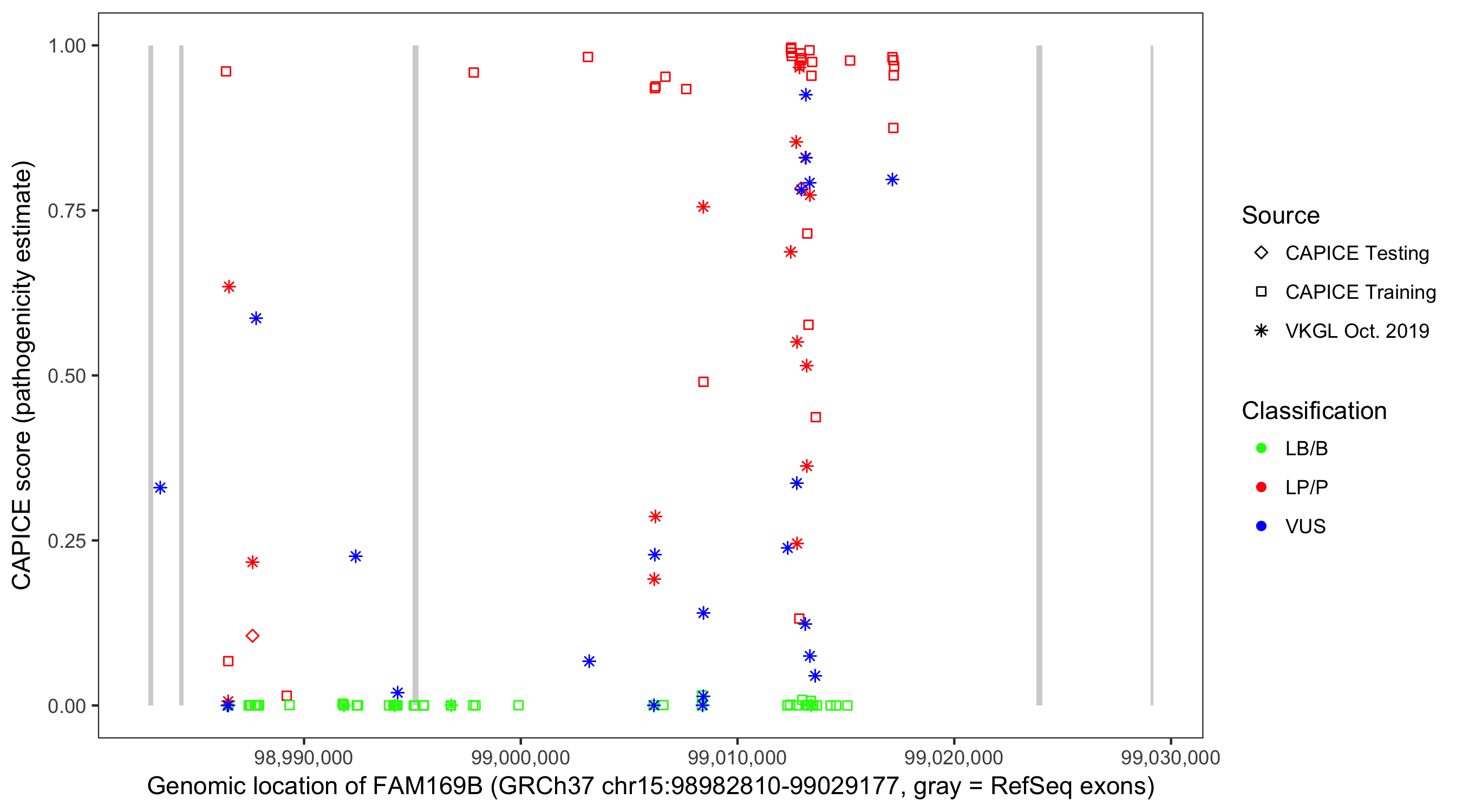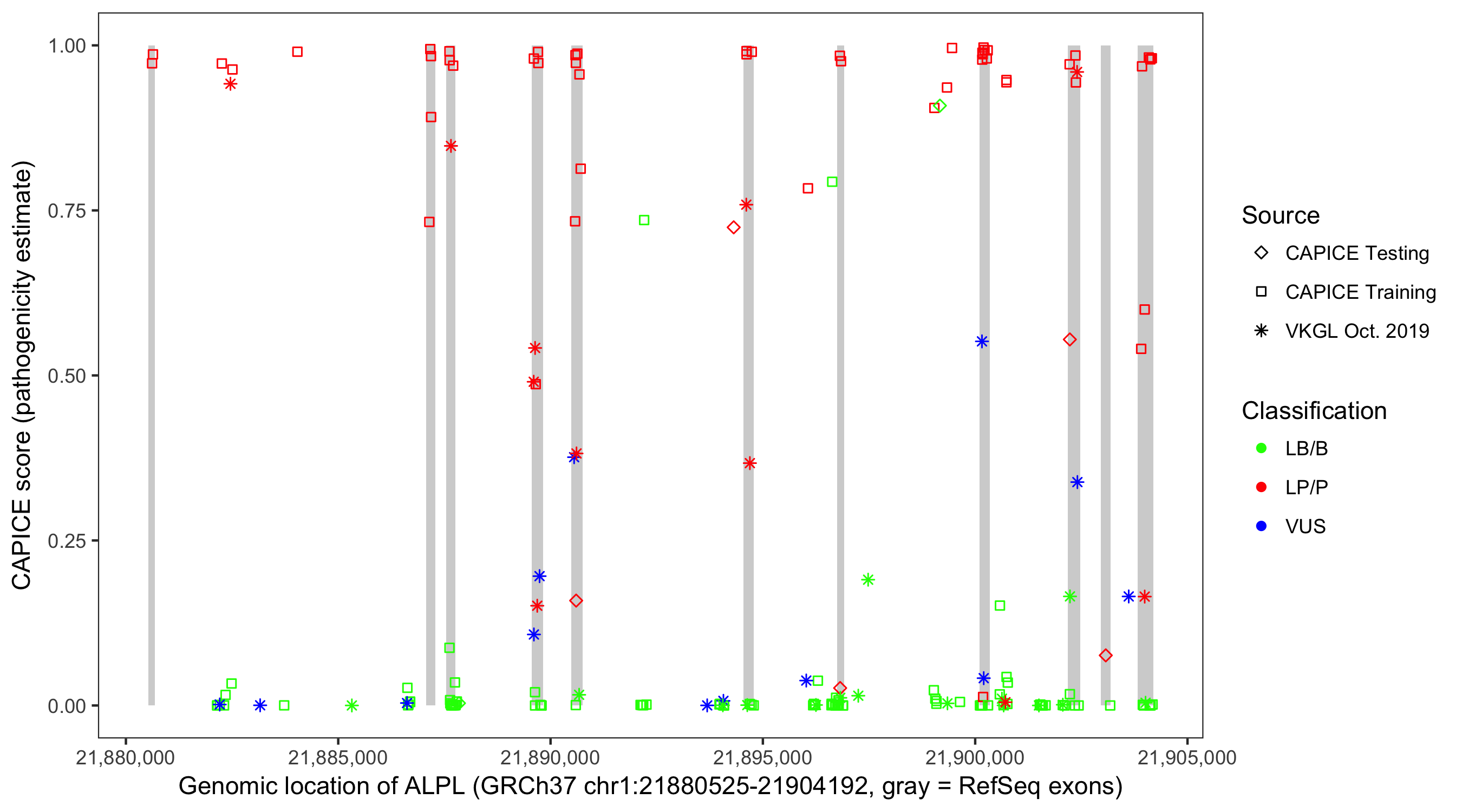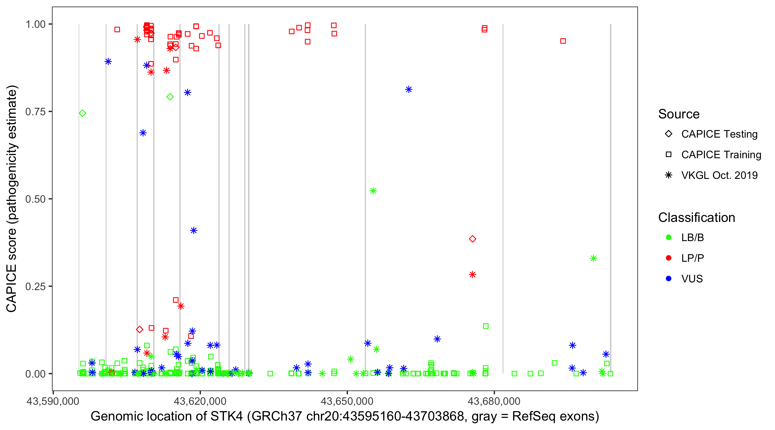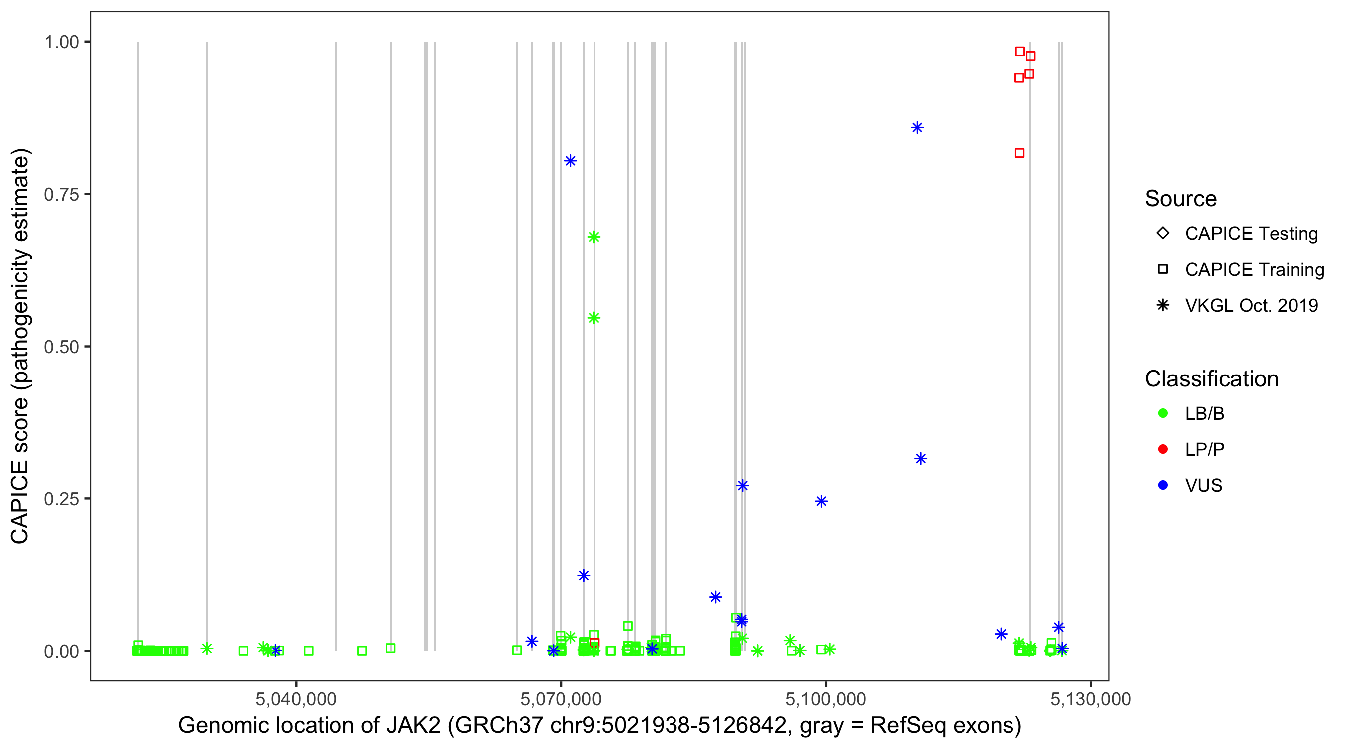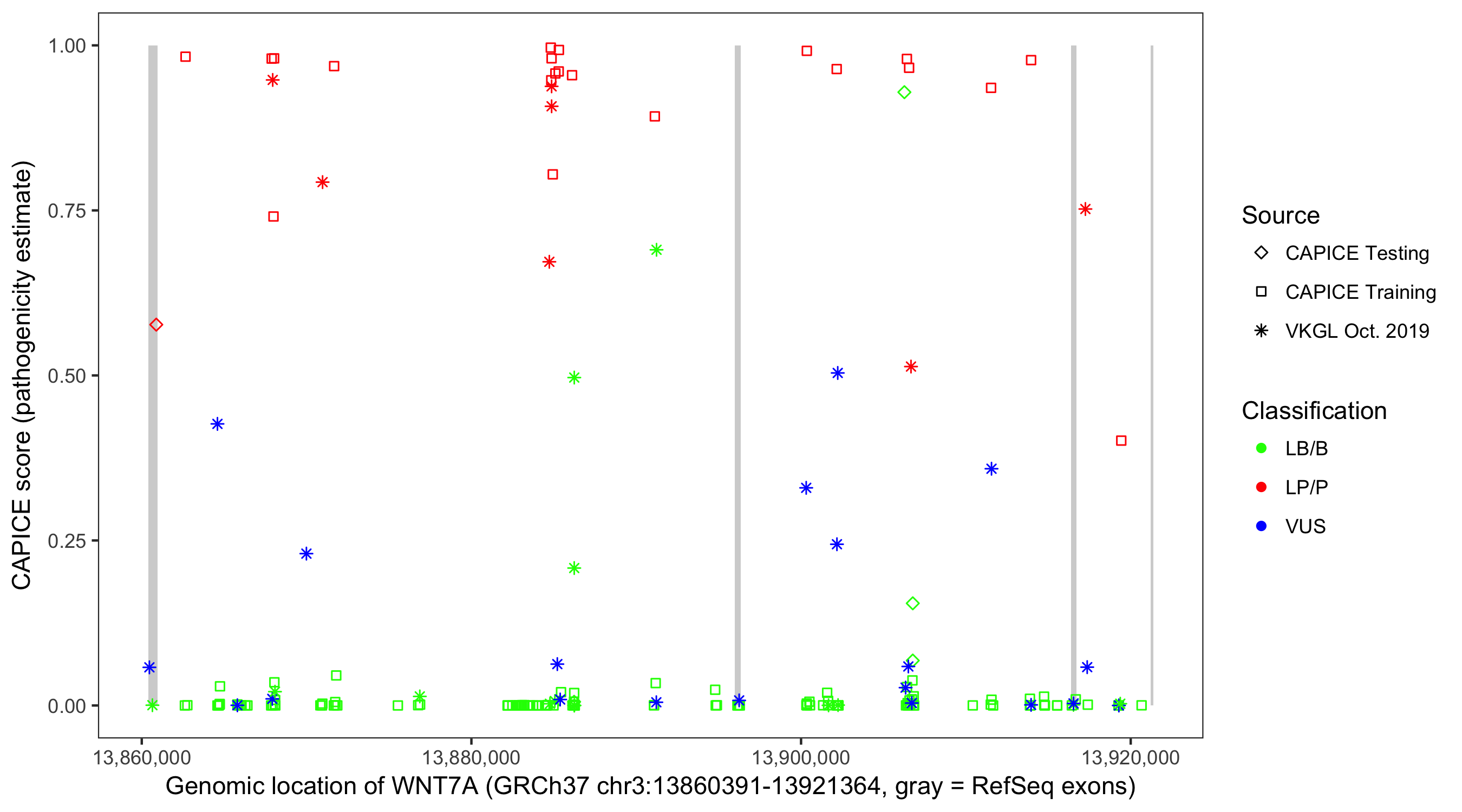 Shown are CAPICE train/test variants plus VKGL Oct 2019.