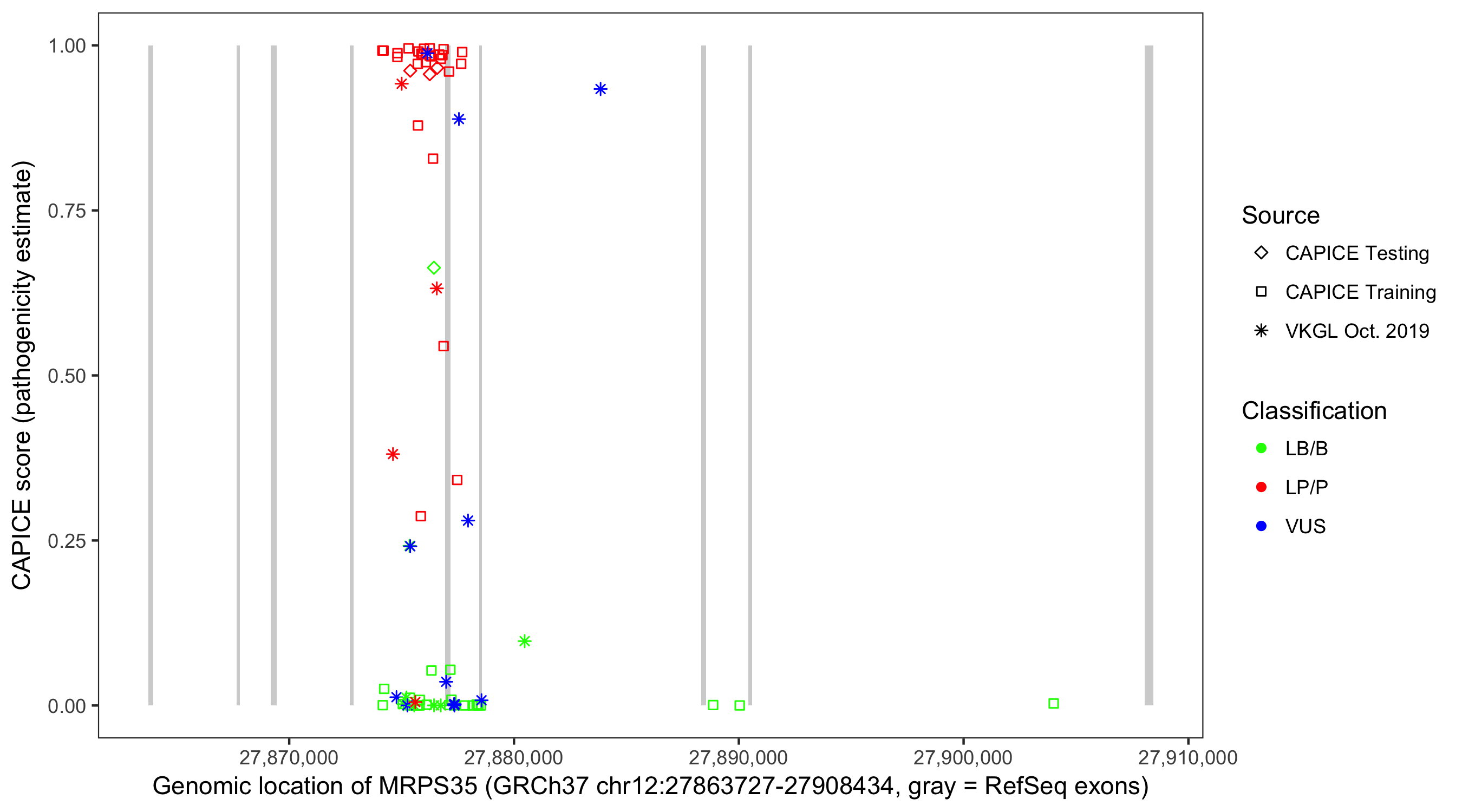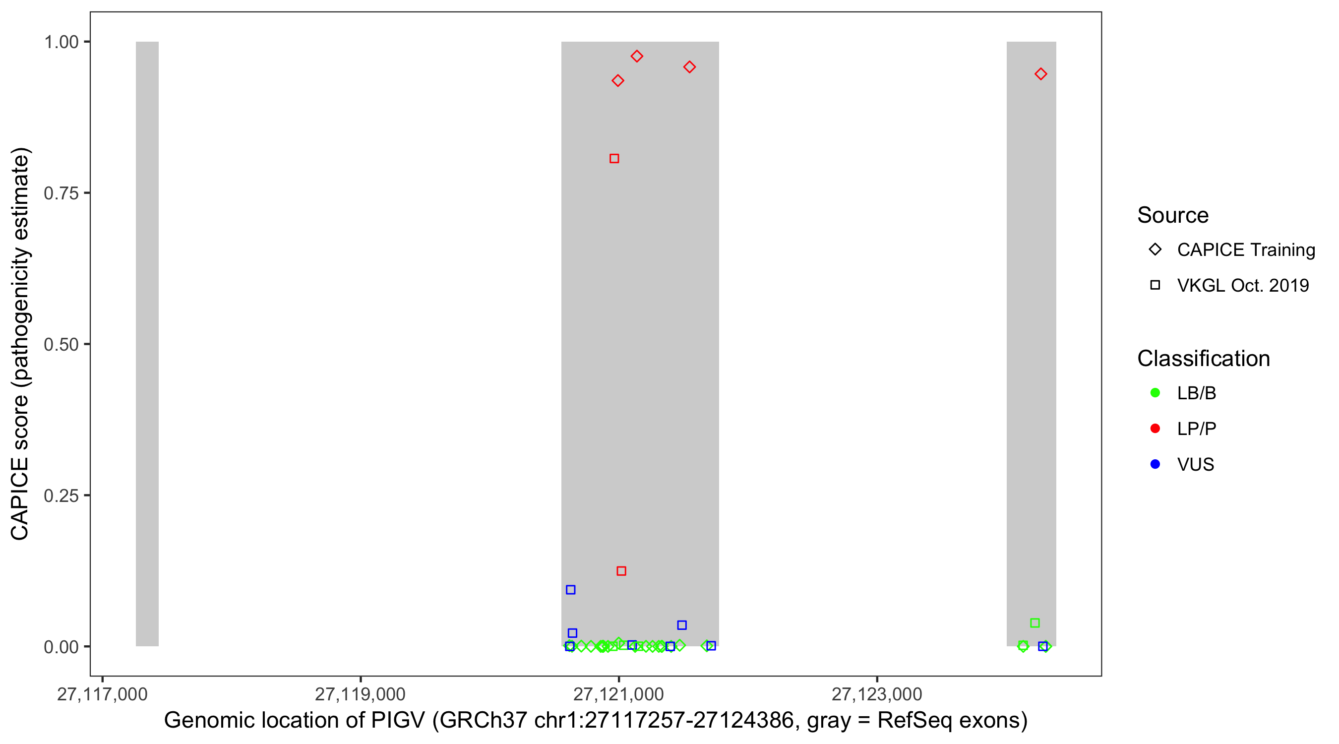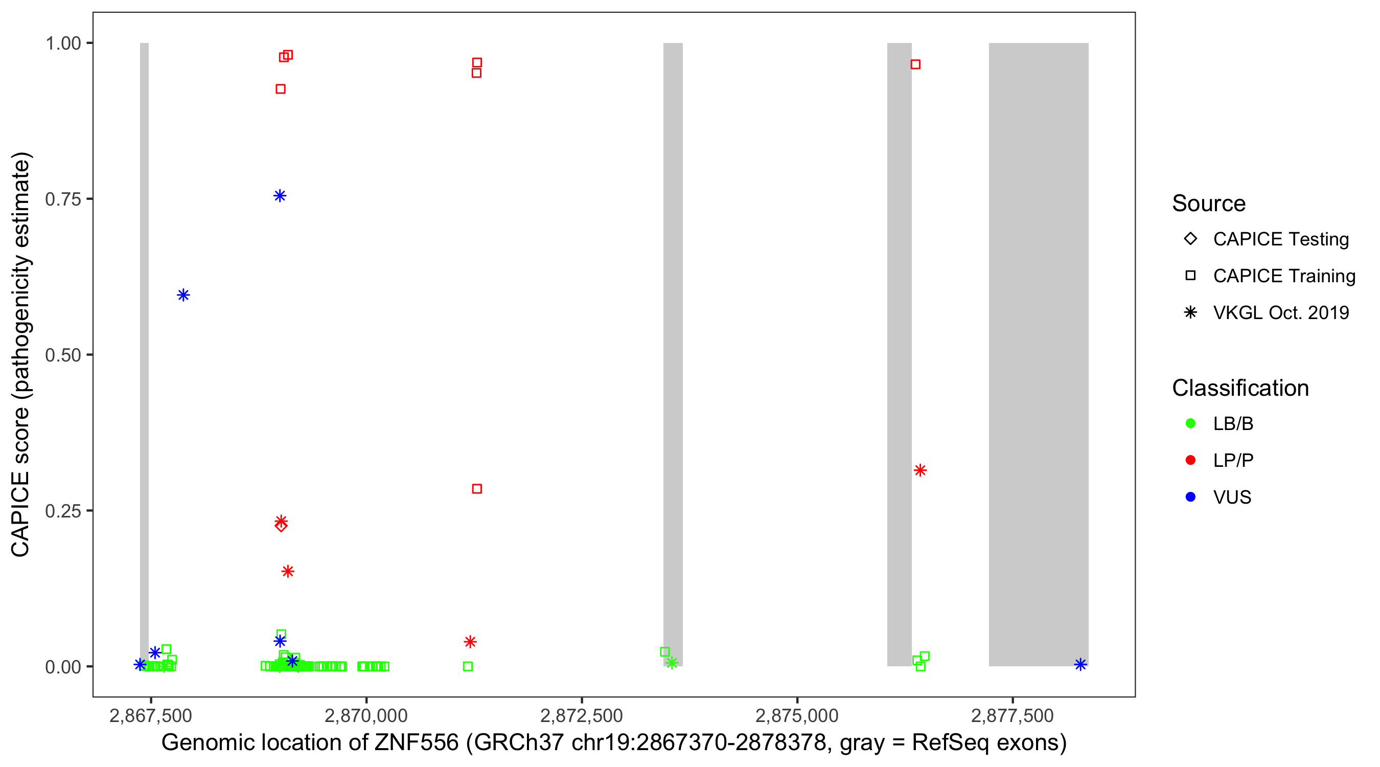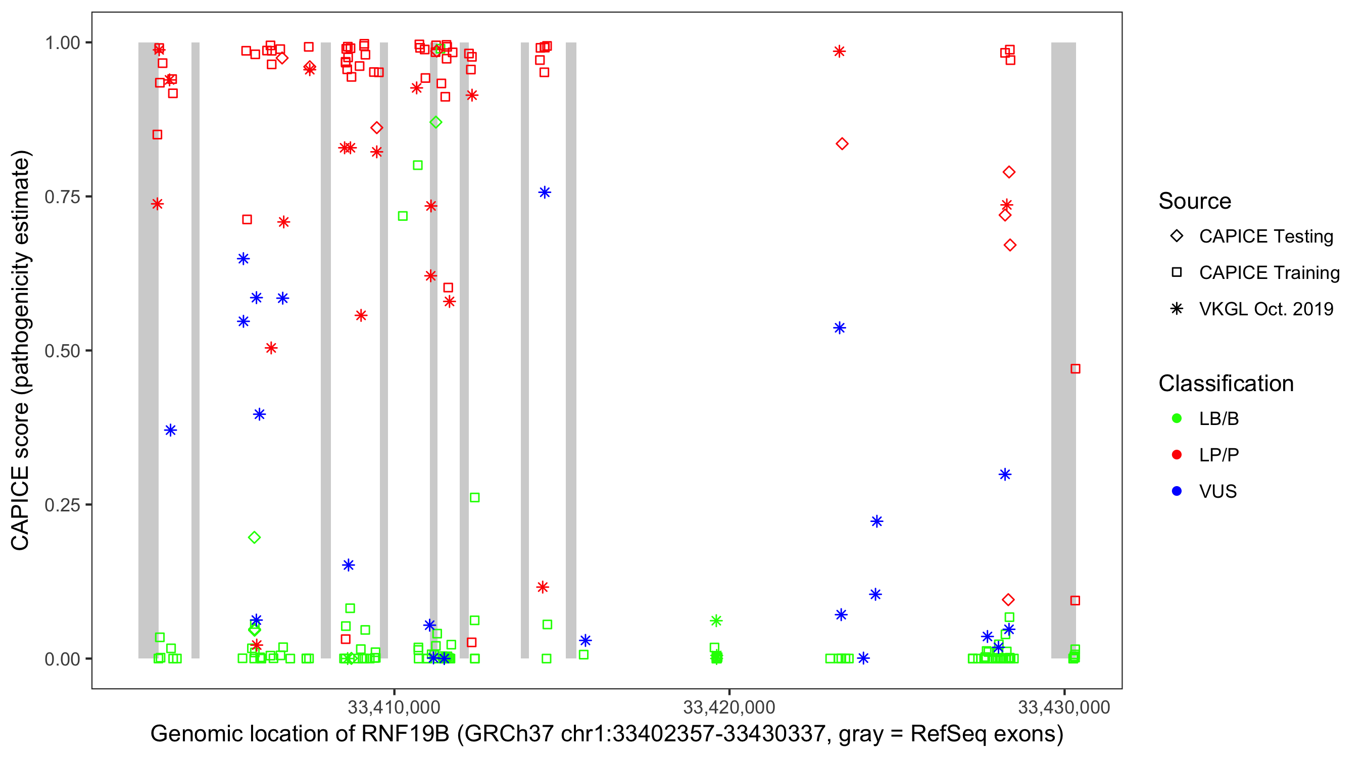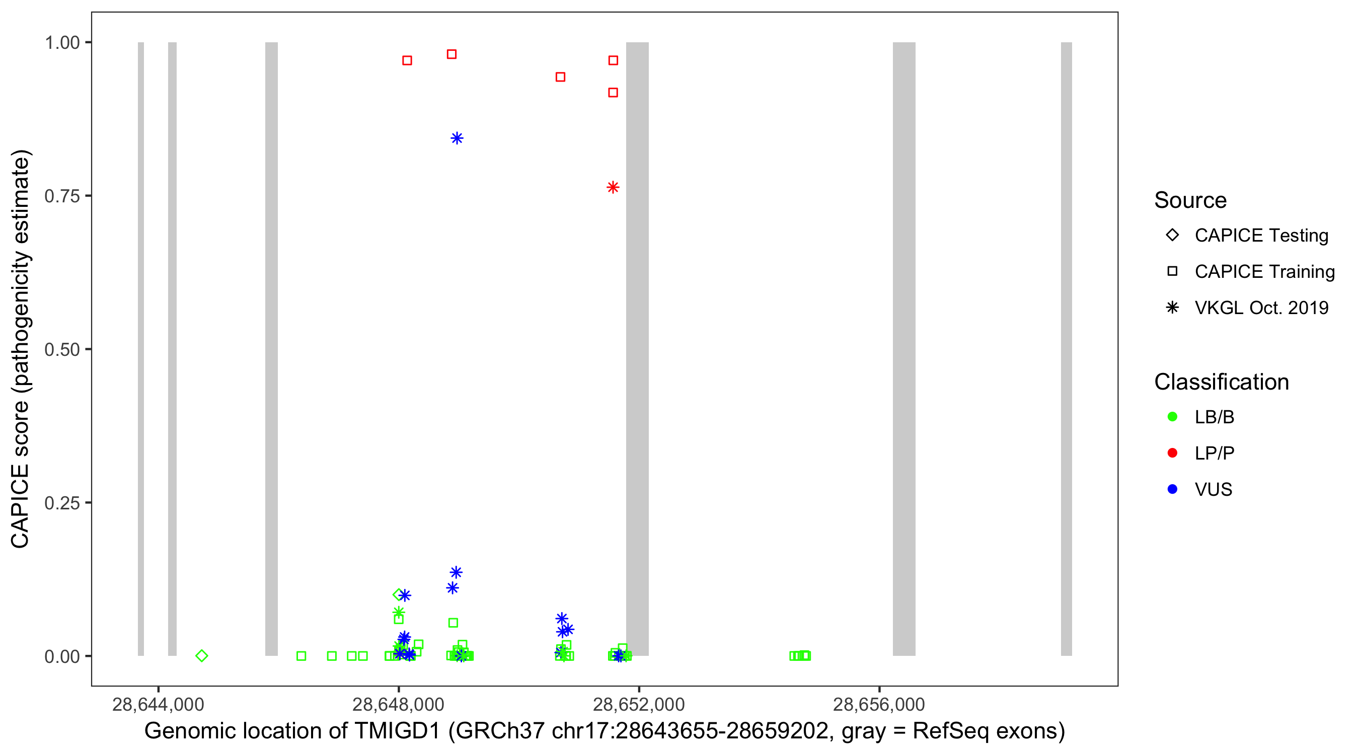 Shown are CAPICE train/test variants plus VKGL Oct 2019.