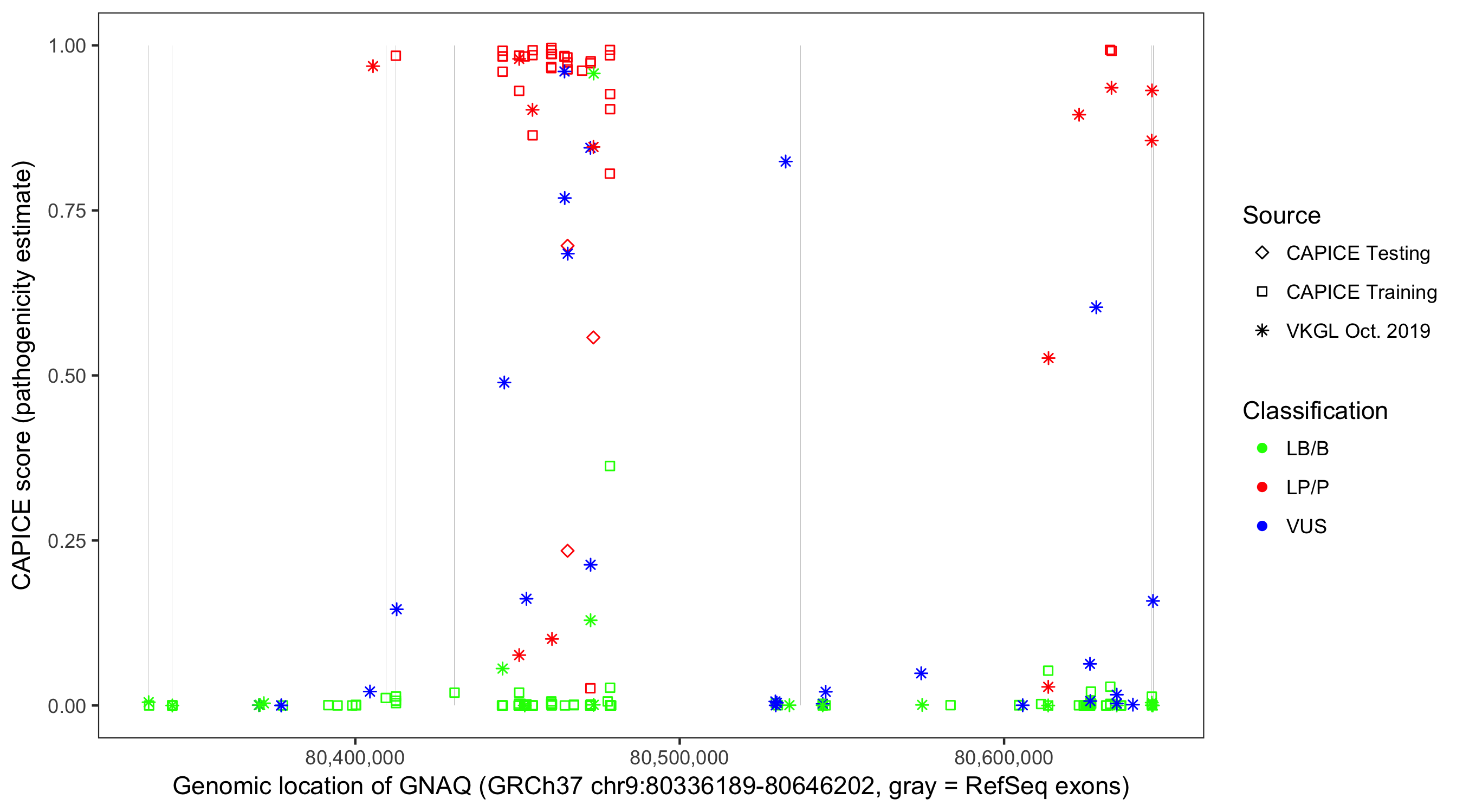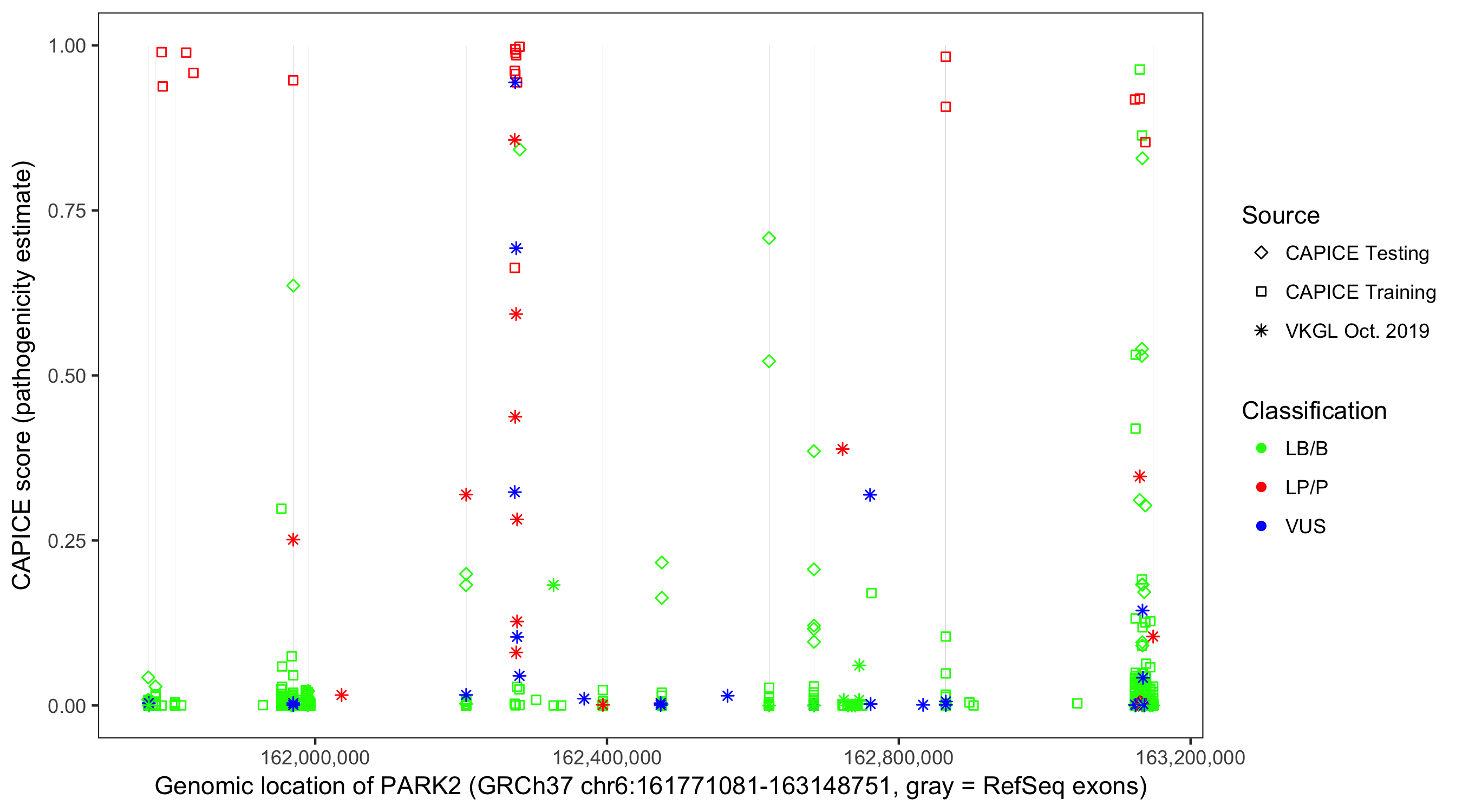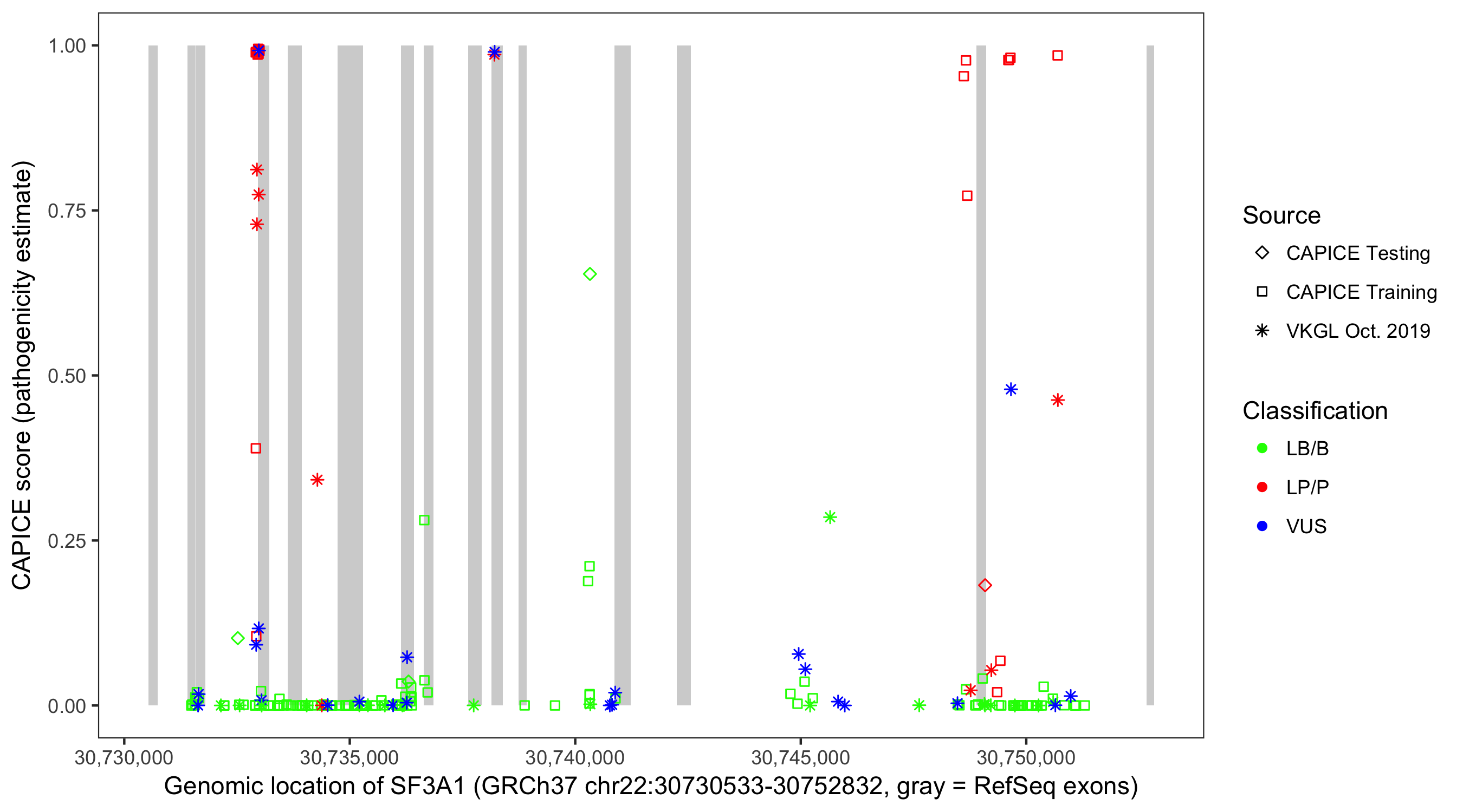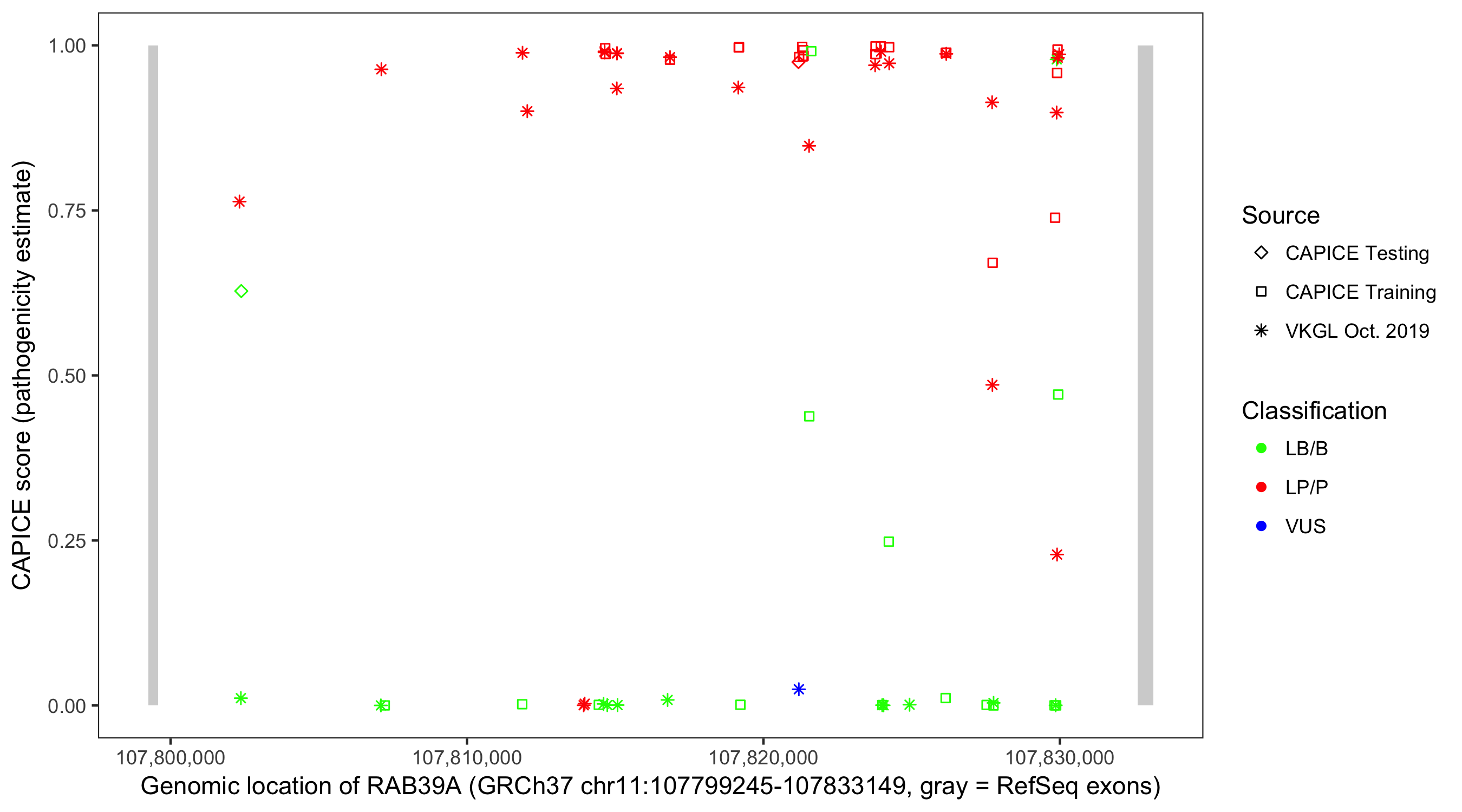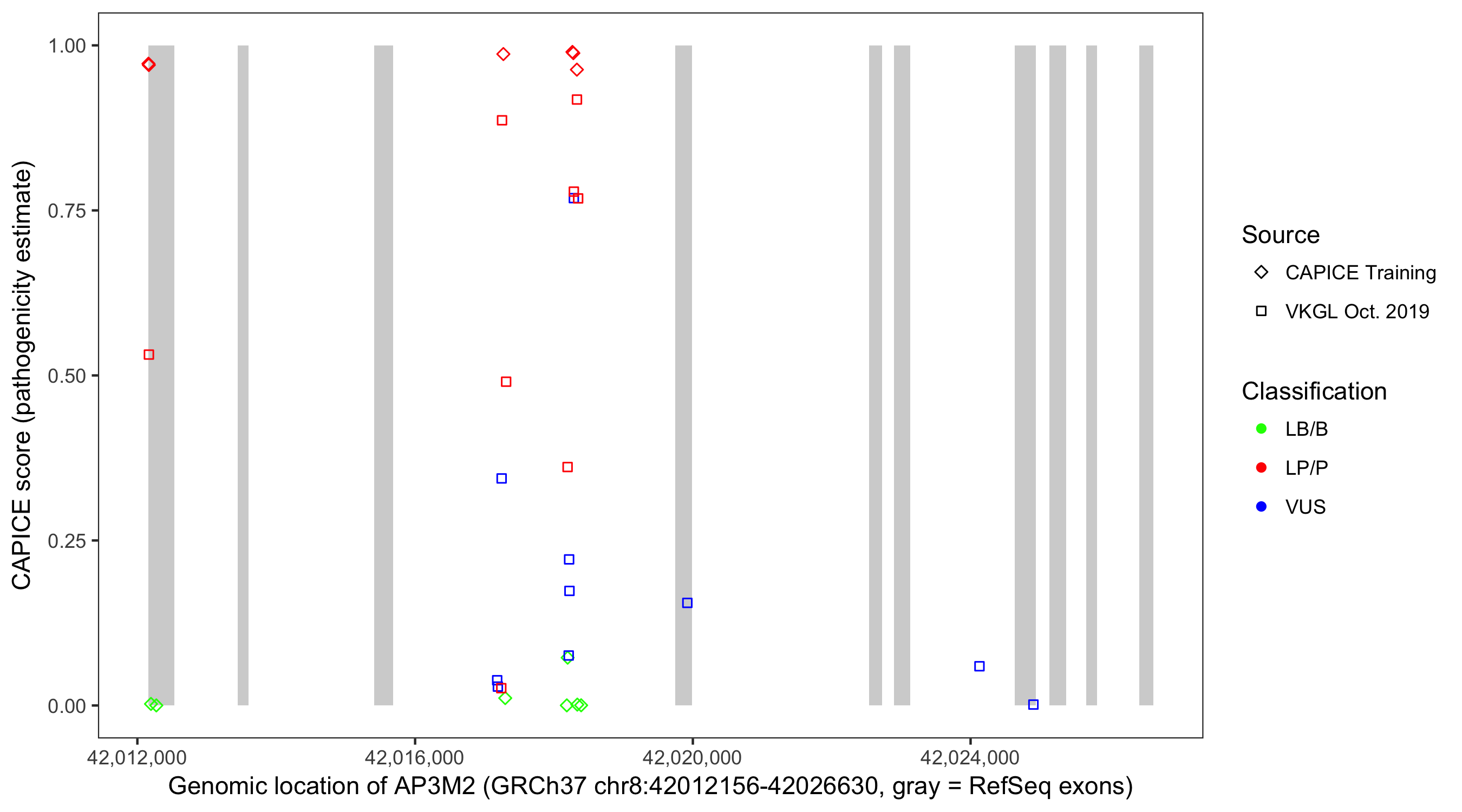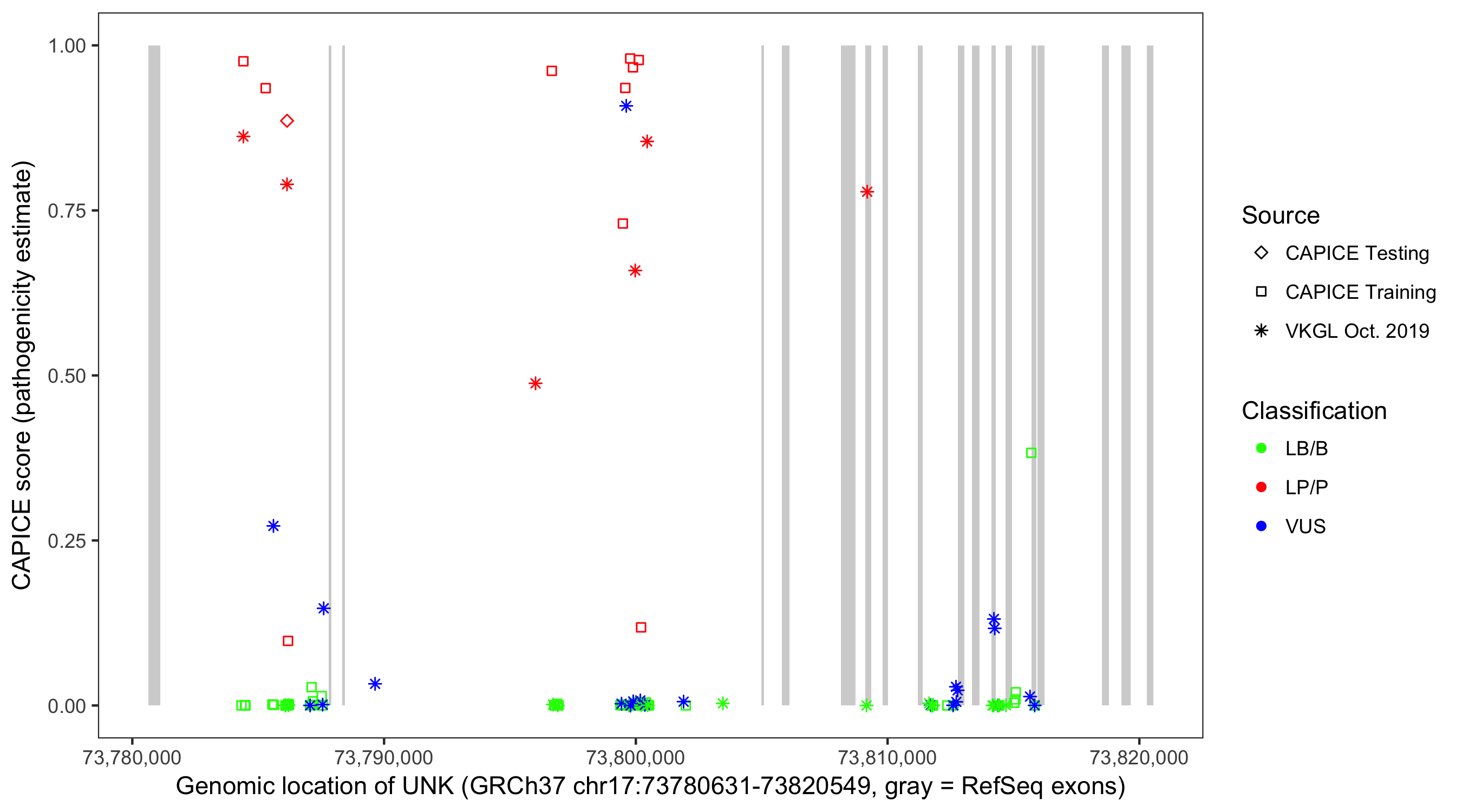 Shown are CAPICE train/test variants plus VKGL Oct 2019.