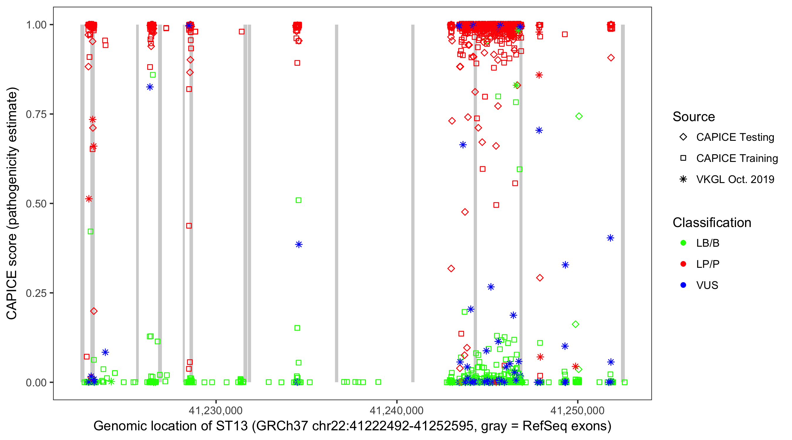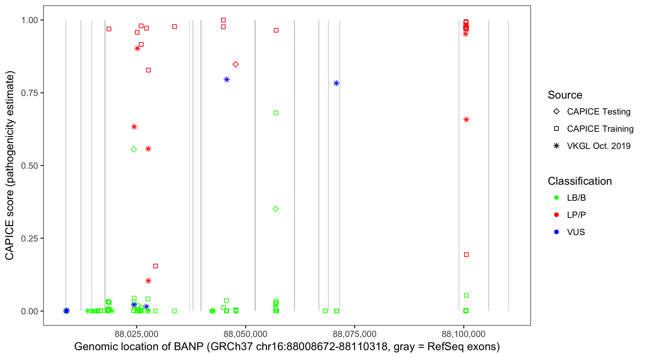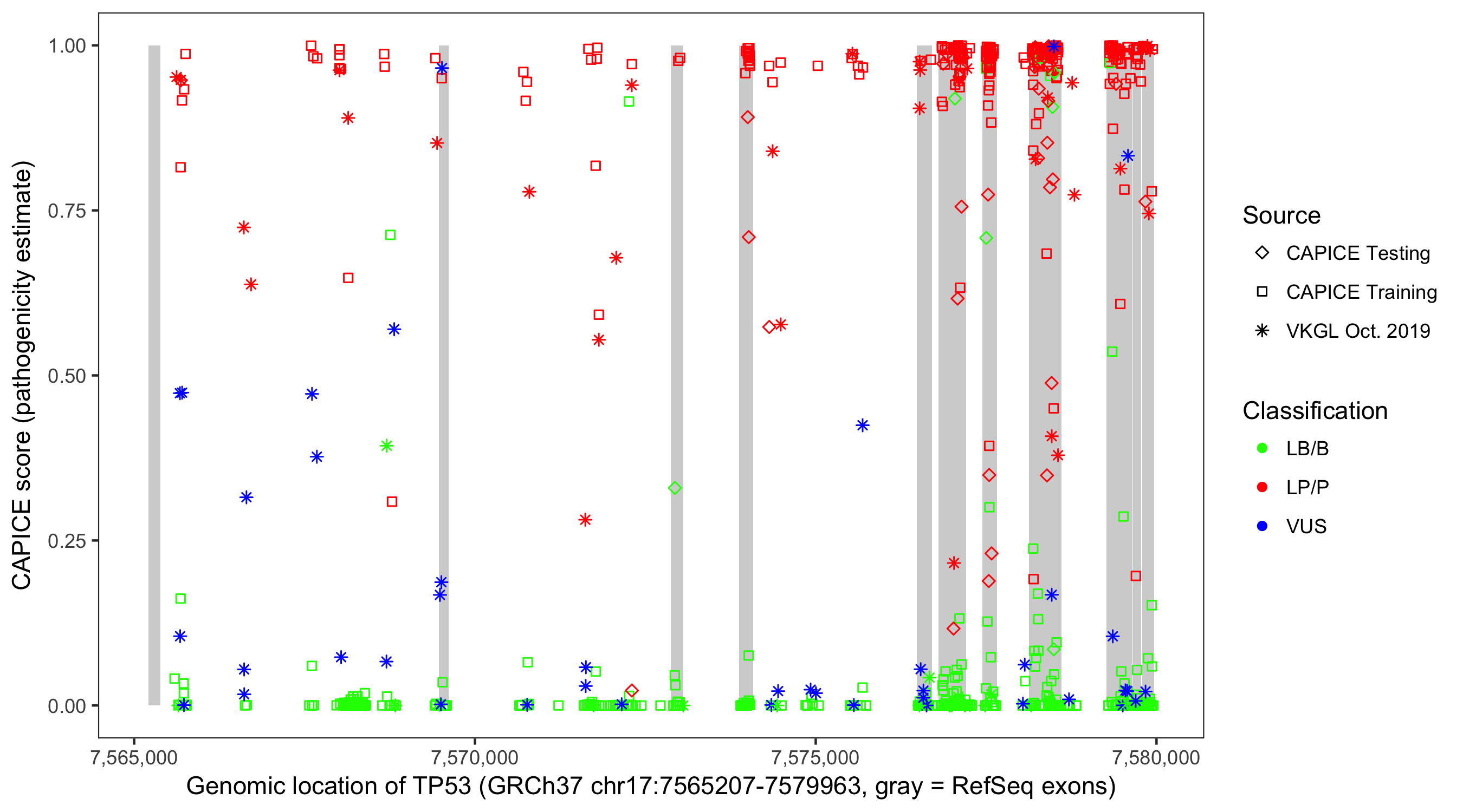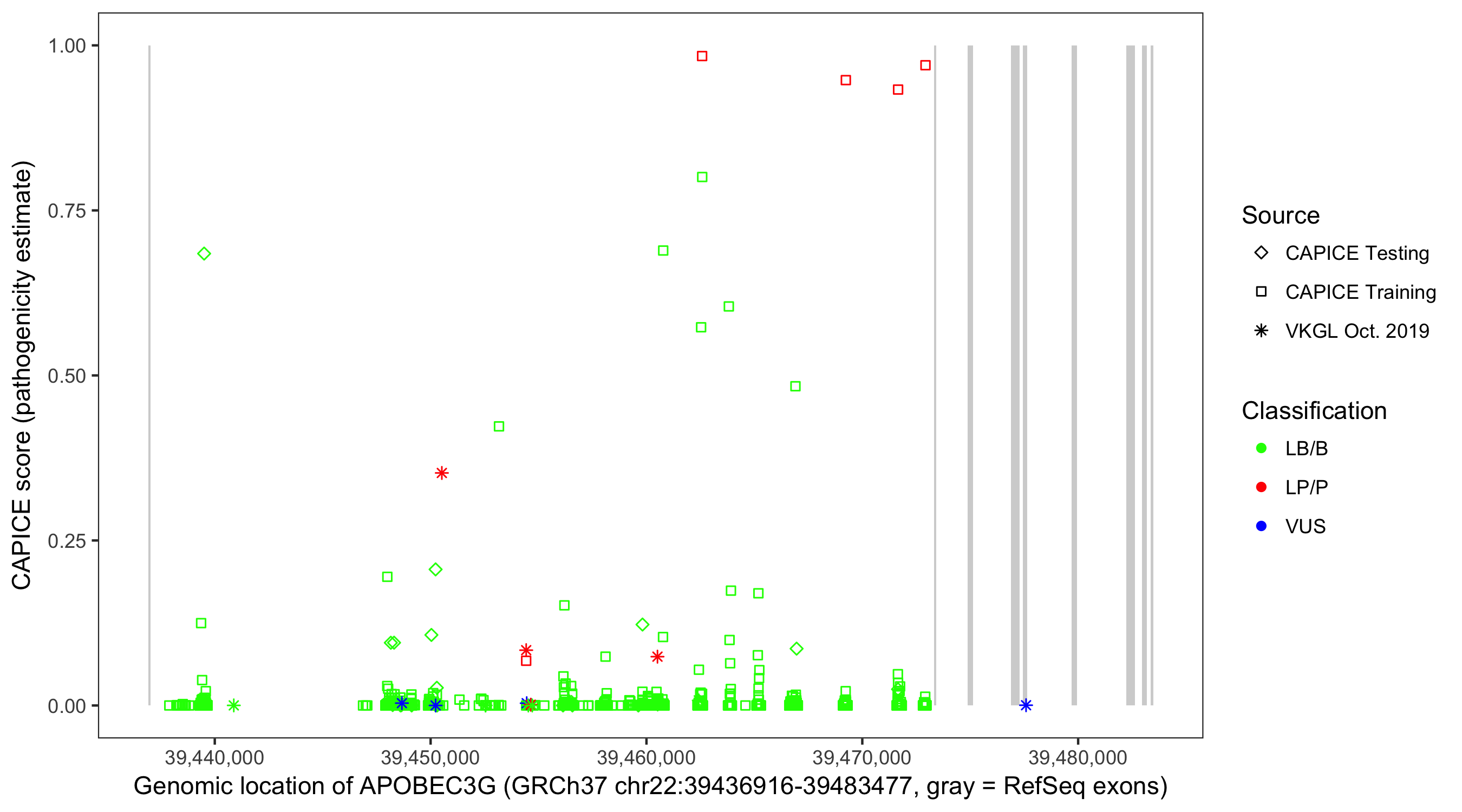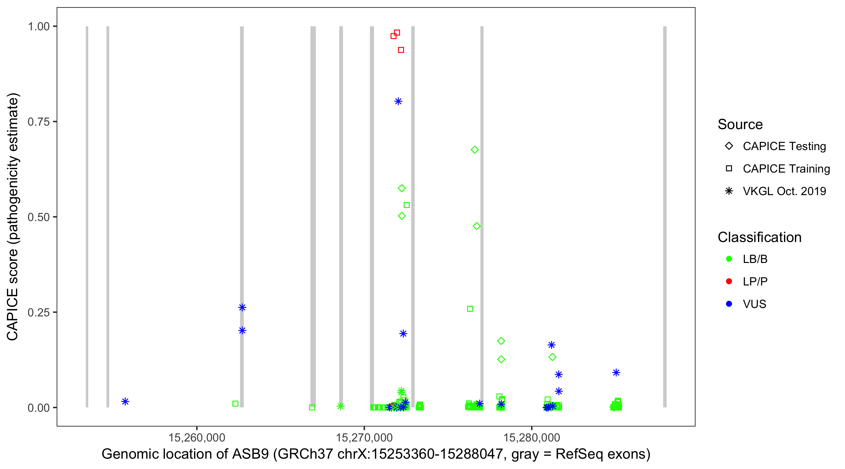 Shown are CAPICE train/test variants plus VKGL Oct 2019.