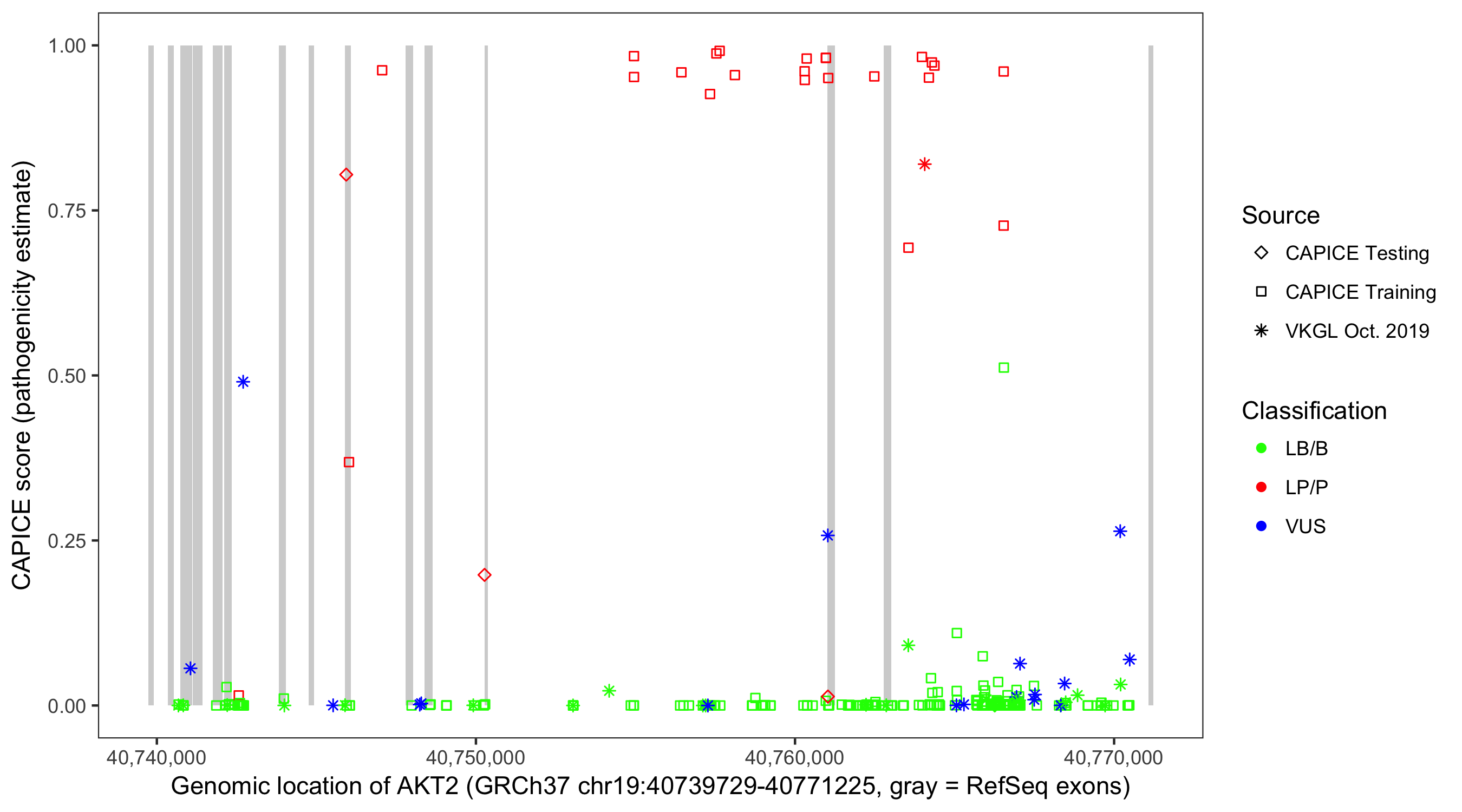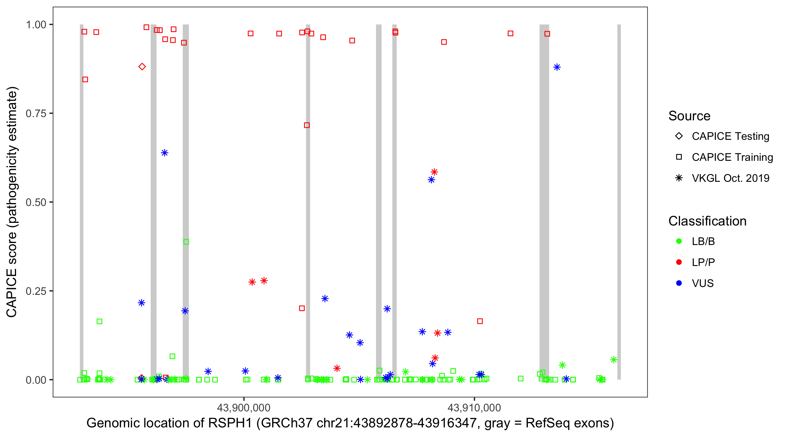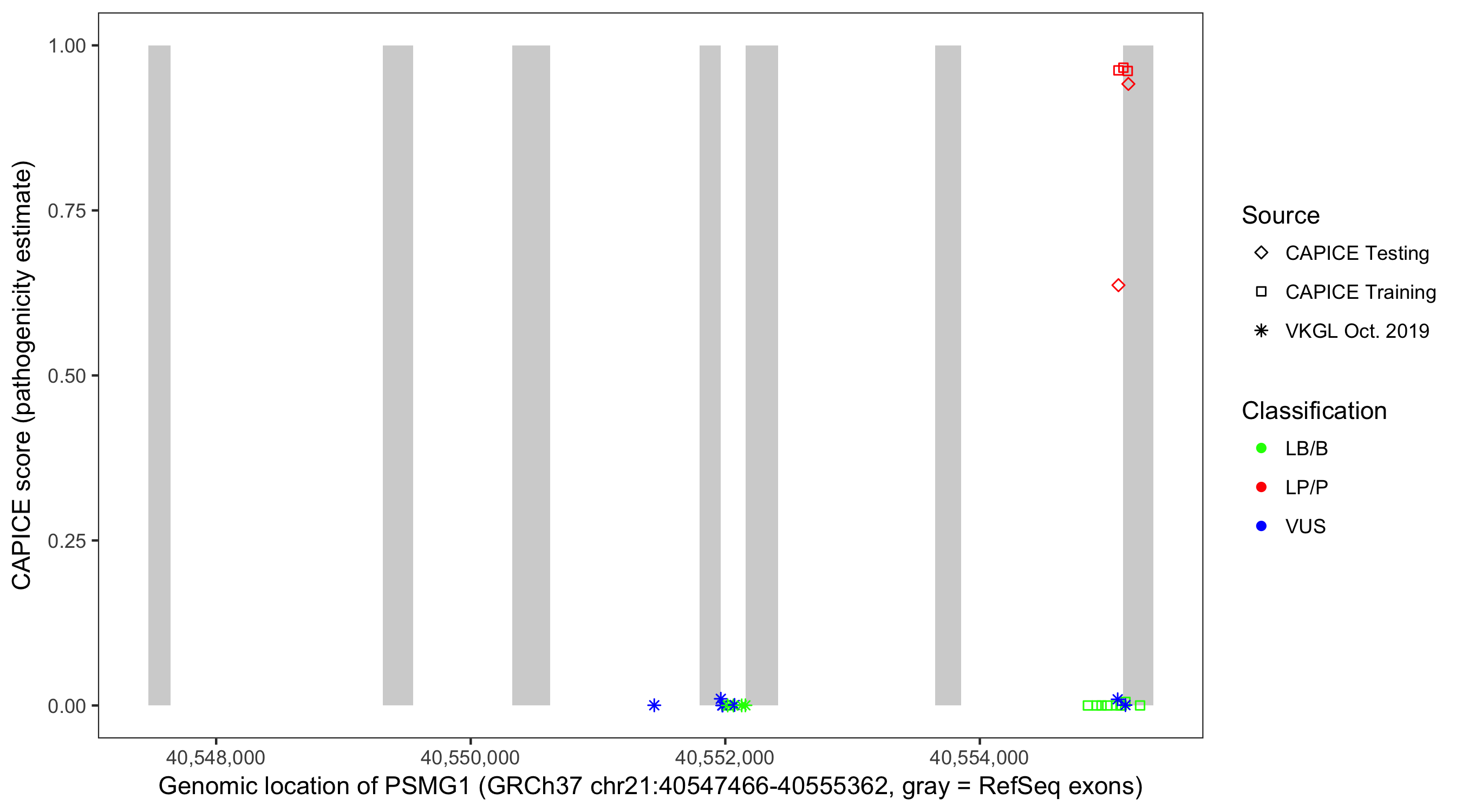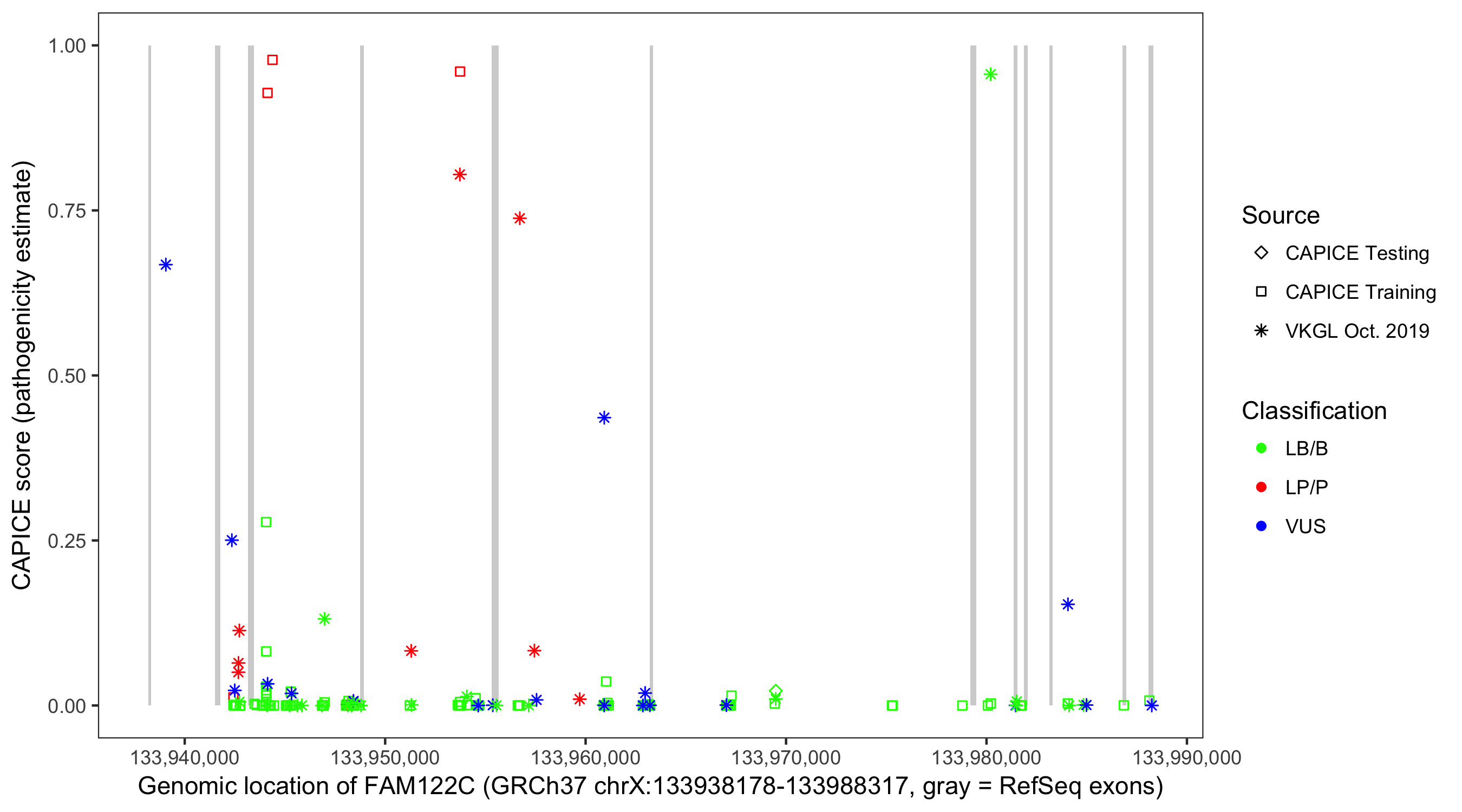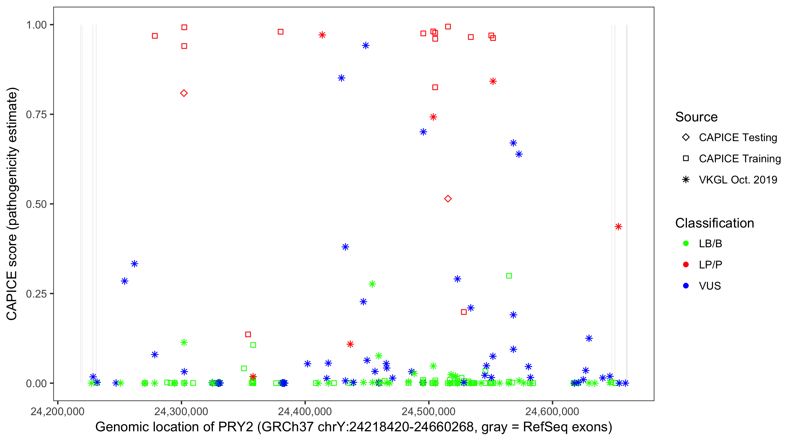 Shown are CAPICE train/test variants plus VKGL Oct 2019.