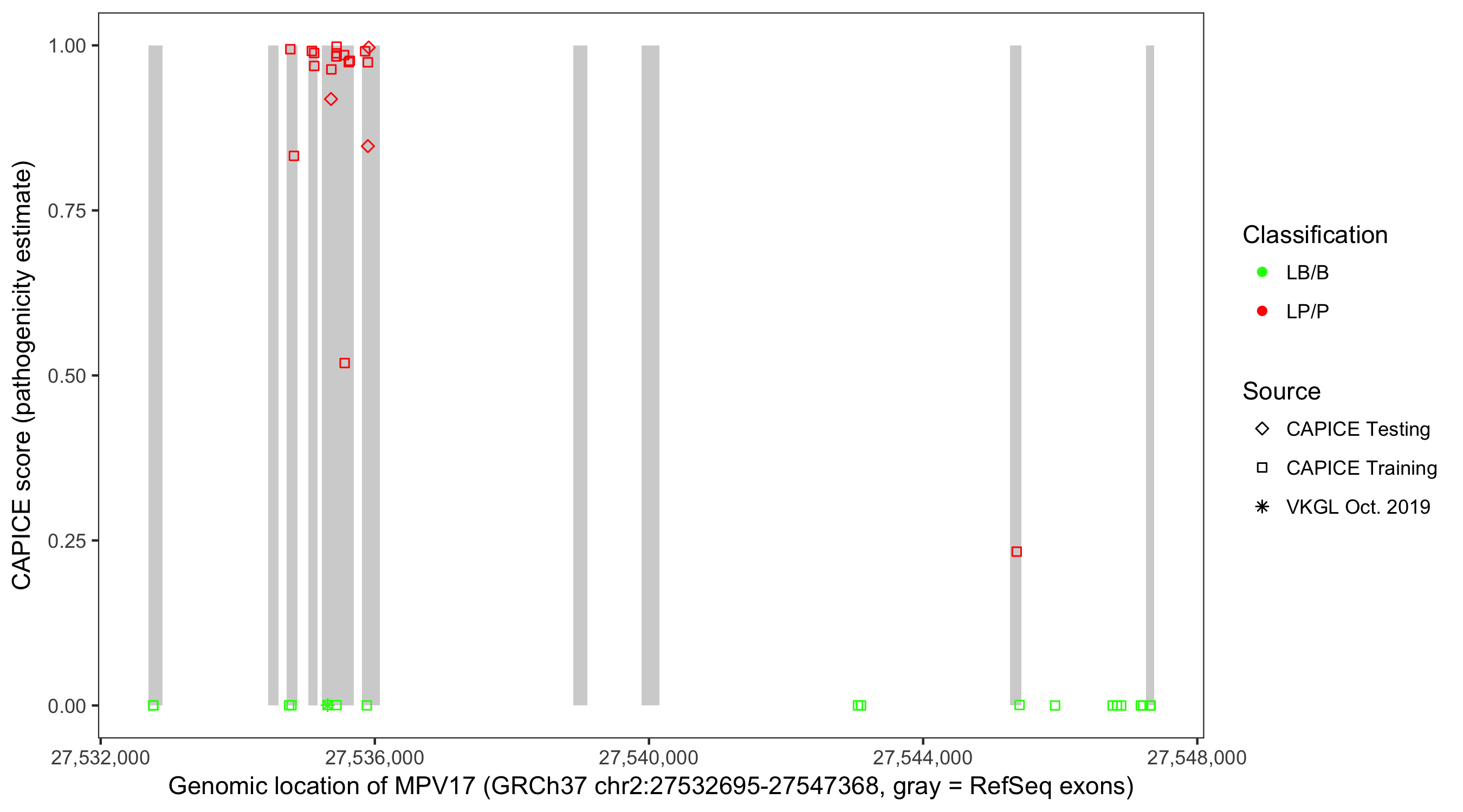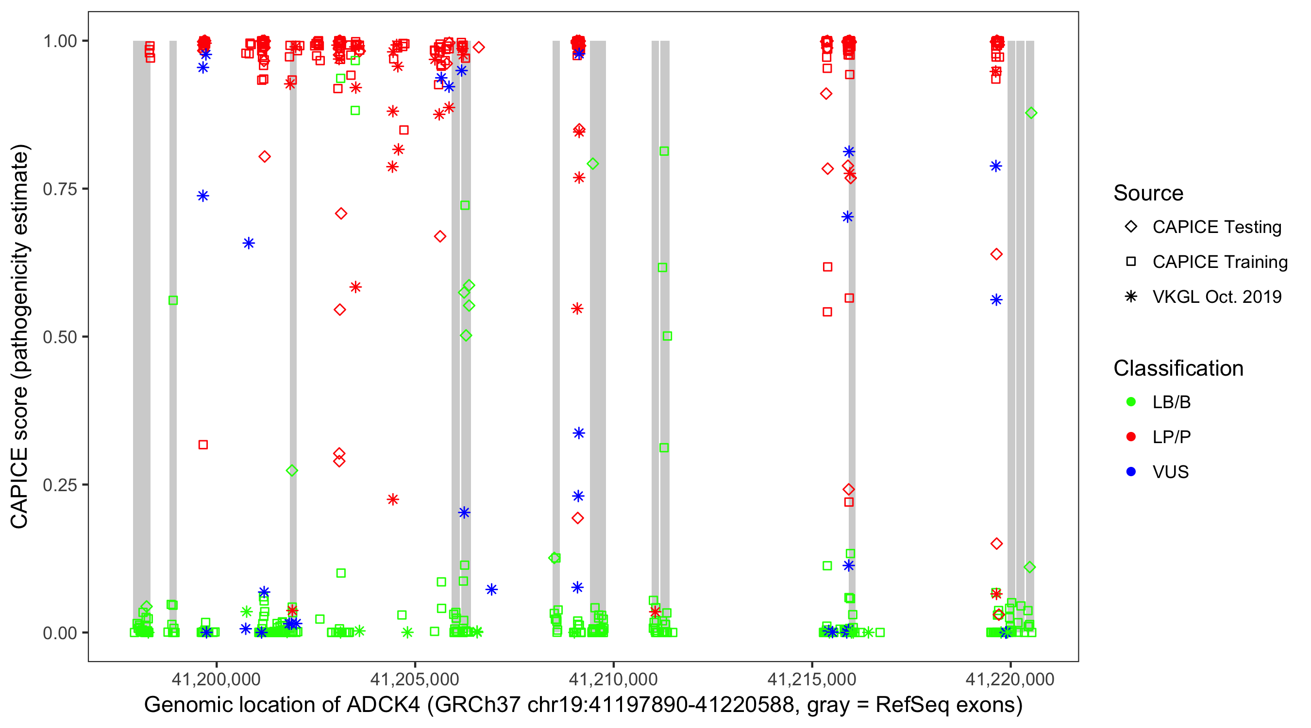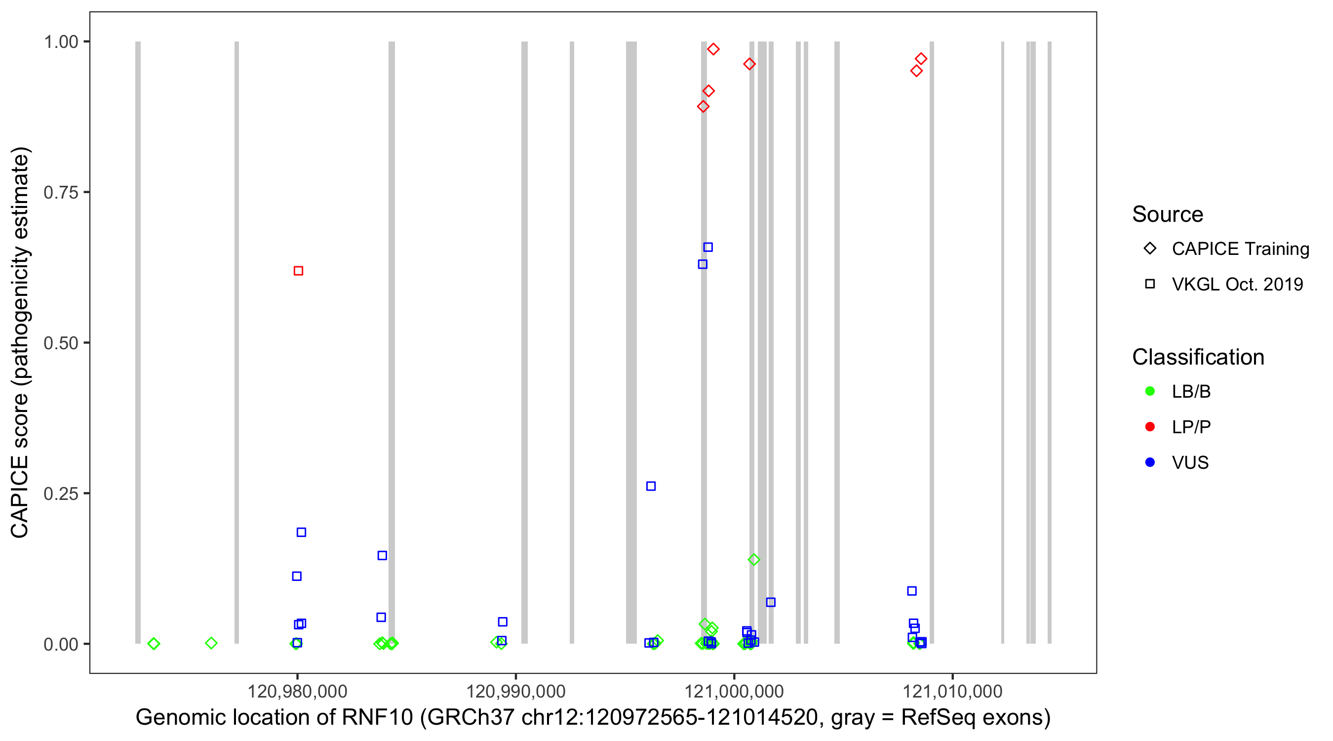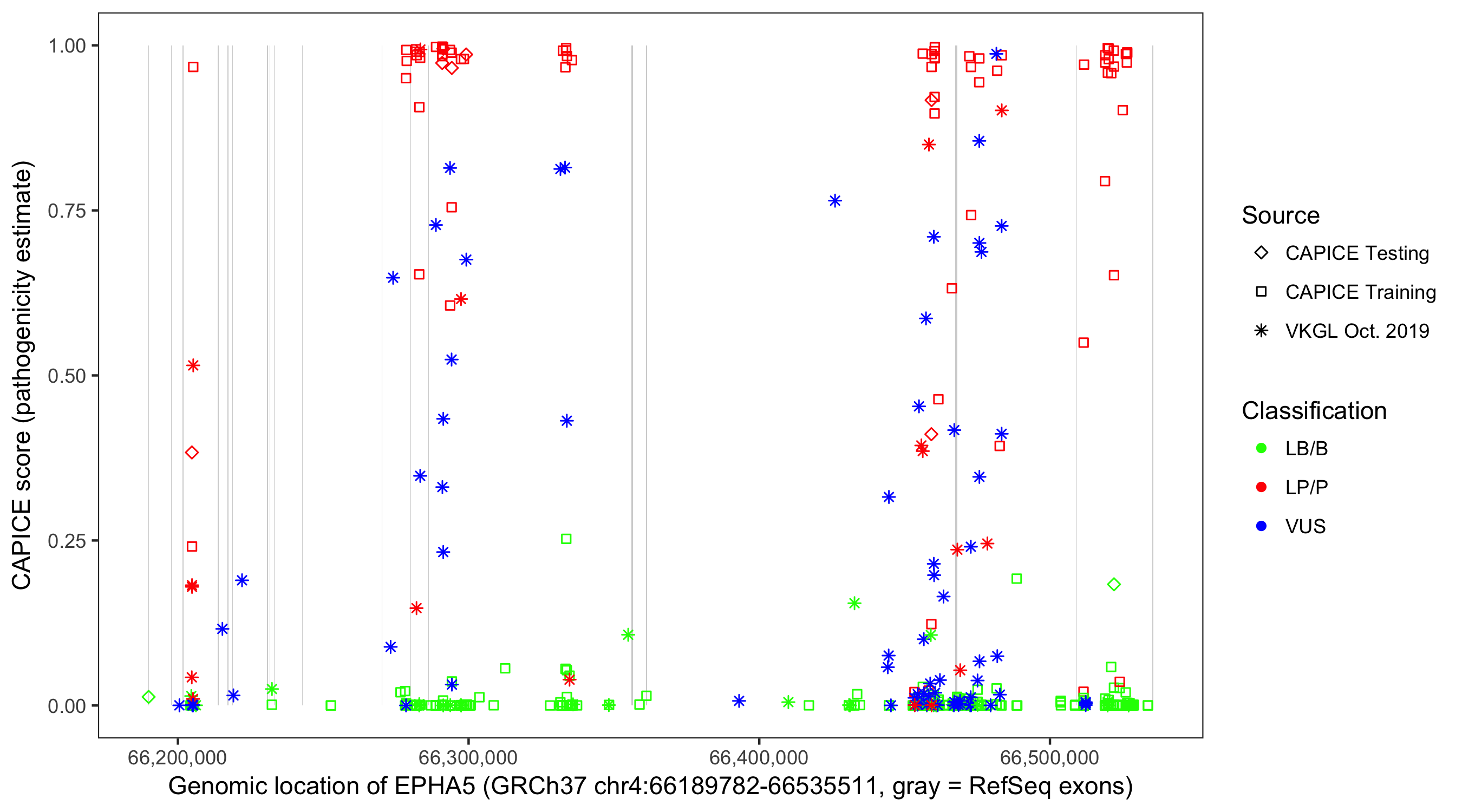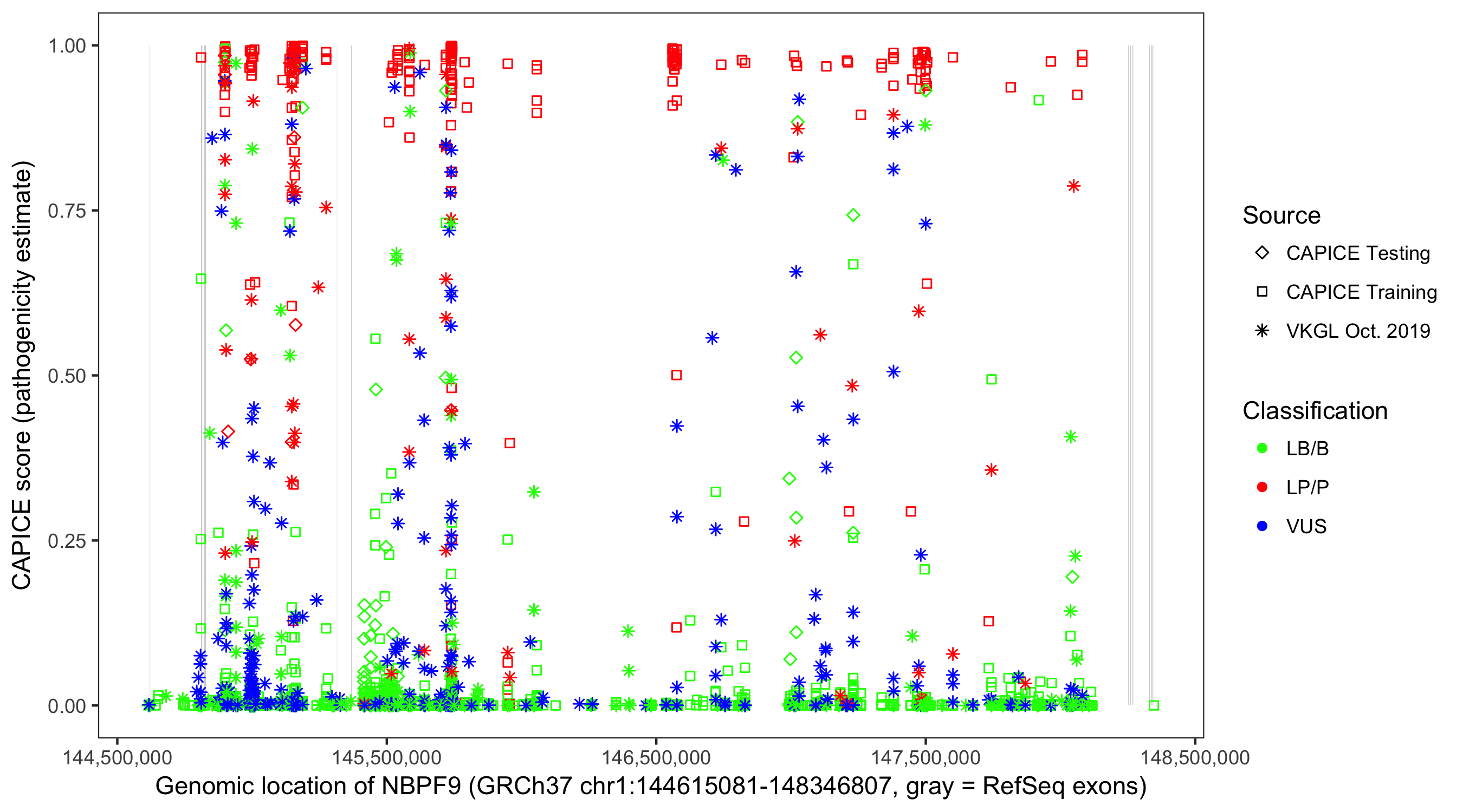 Shown are CAPICE train/test variants plus VKGL Oct 2019.