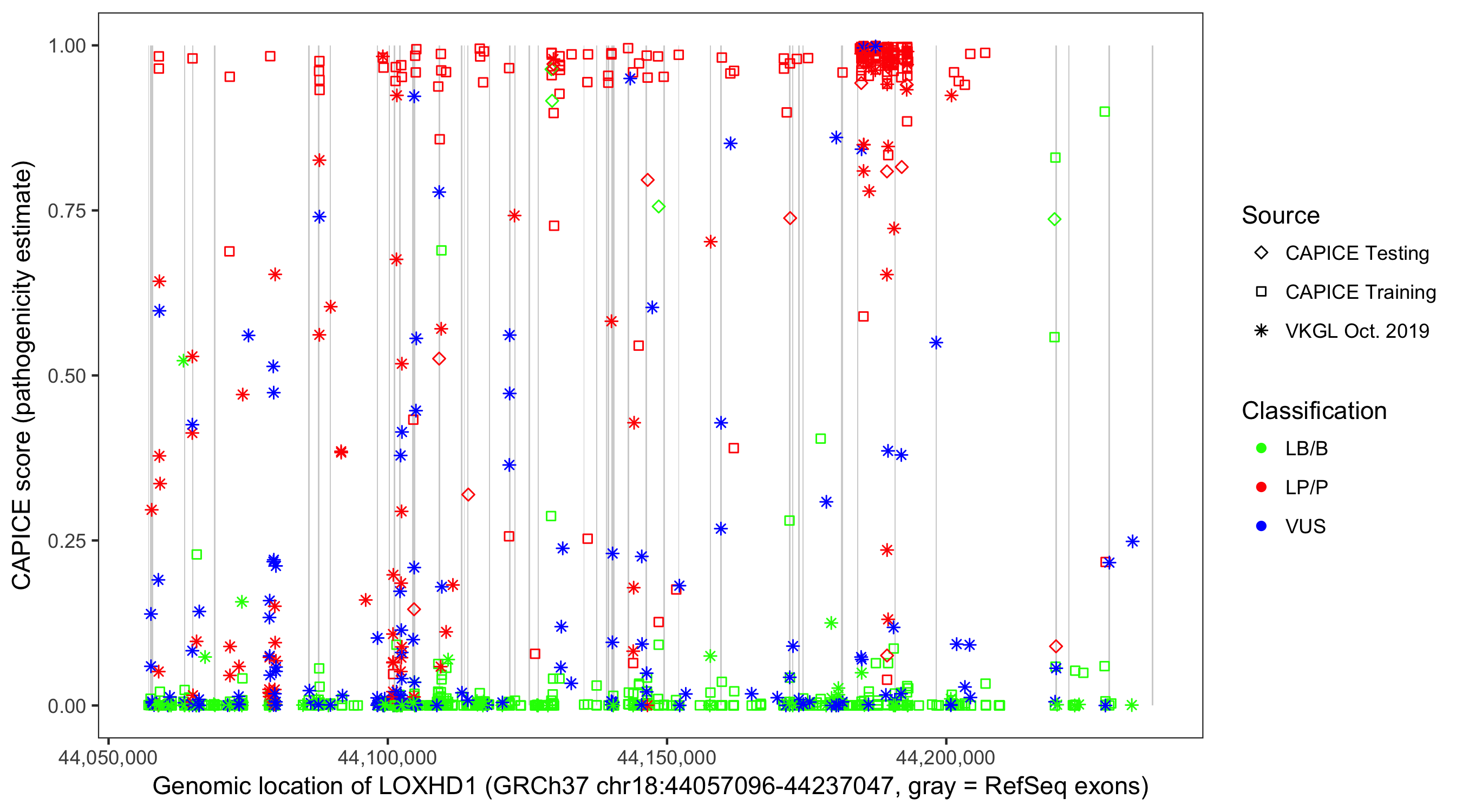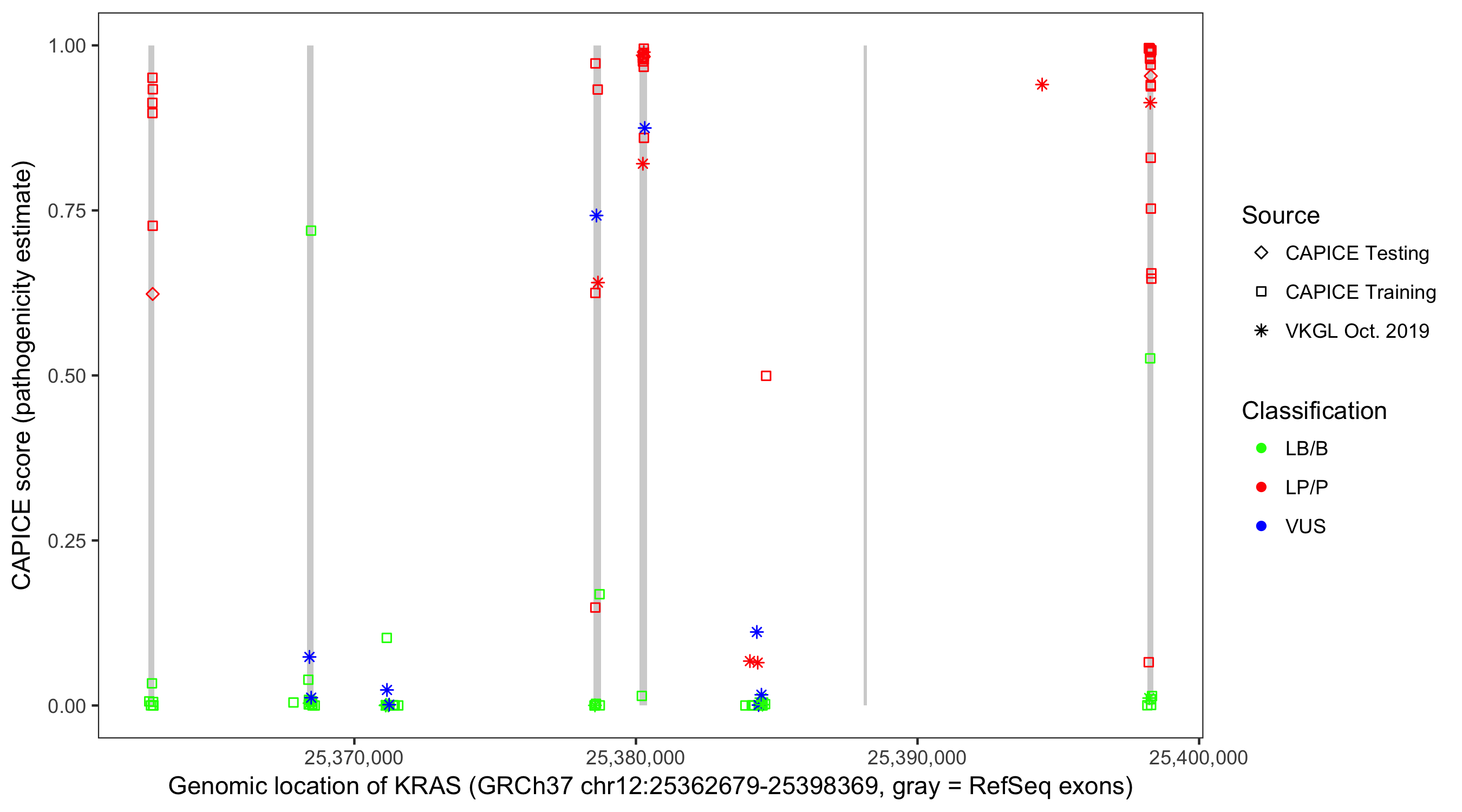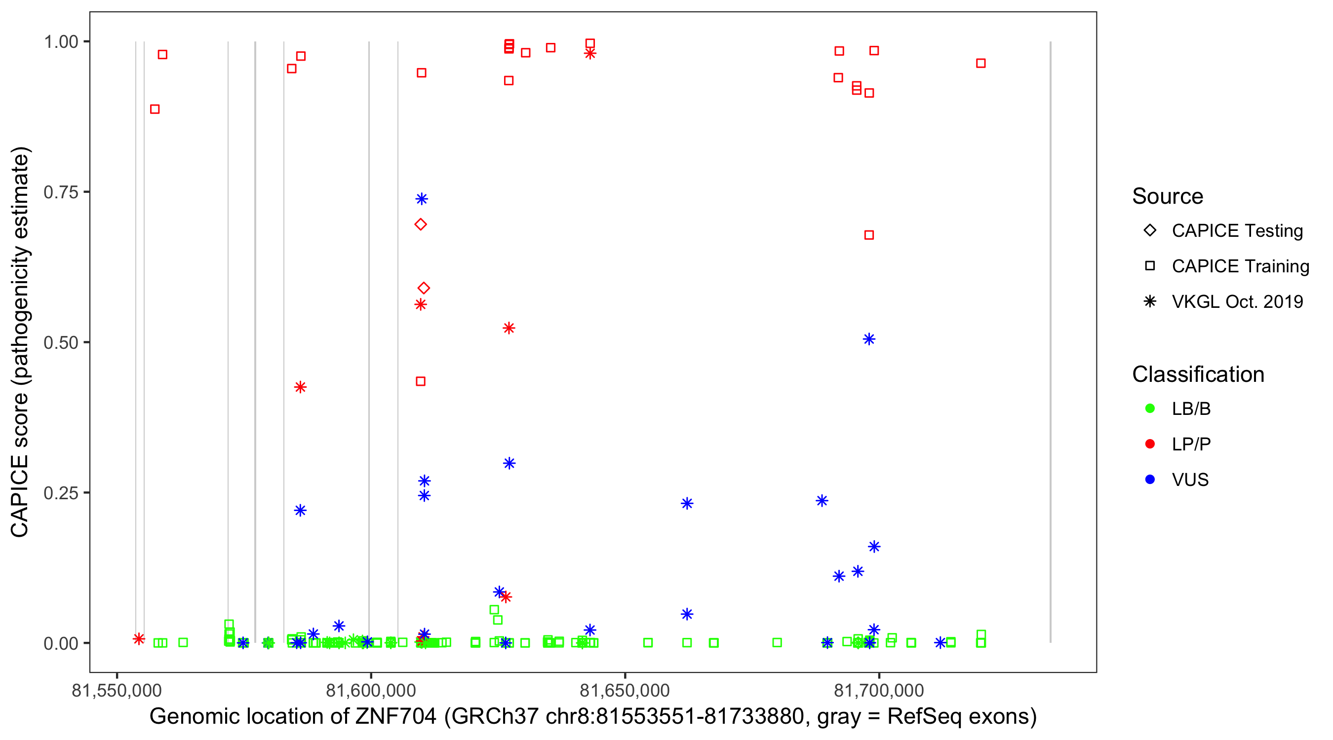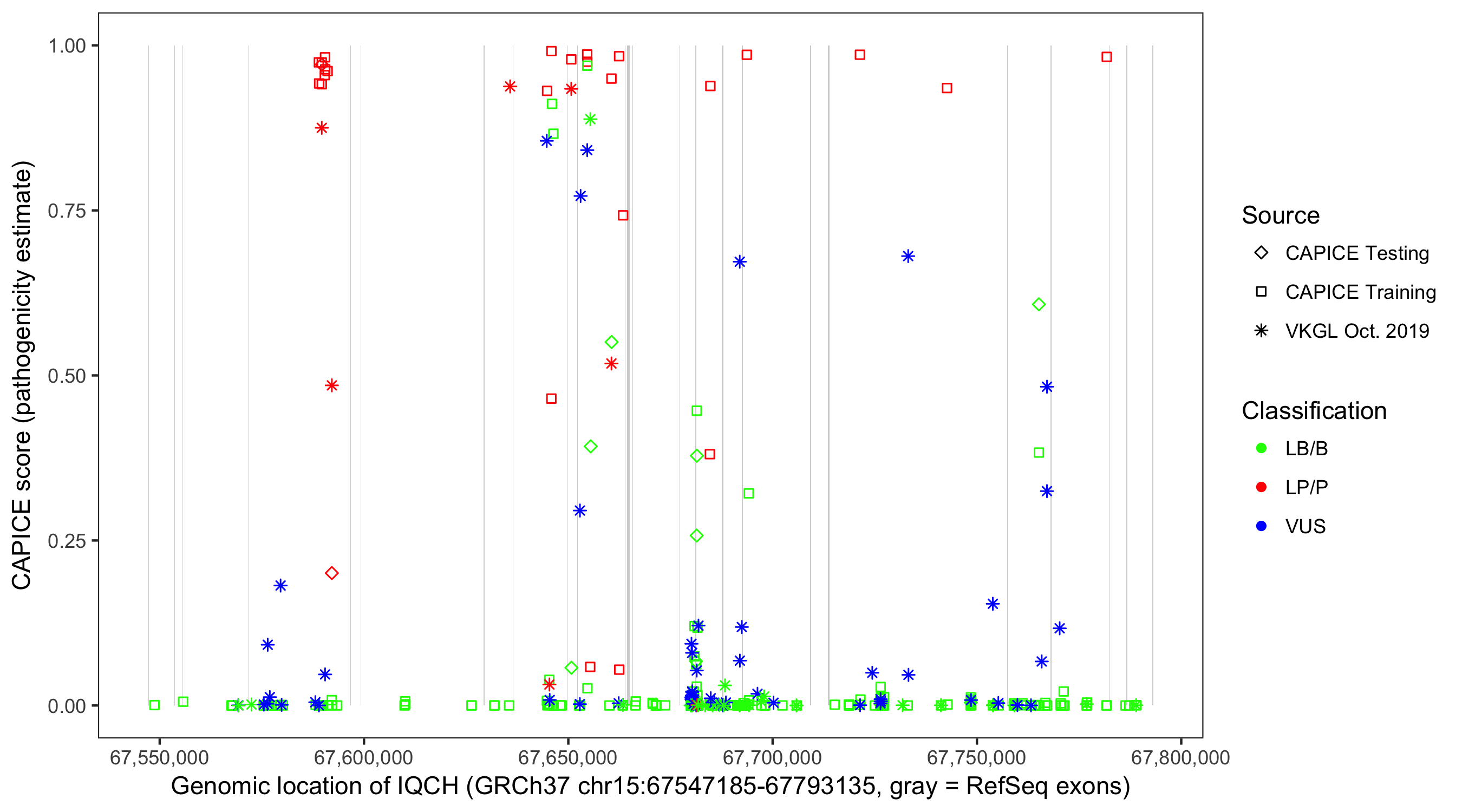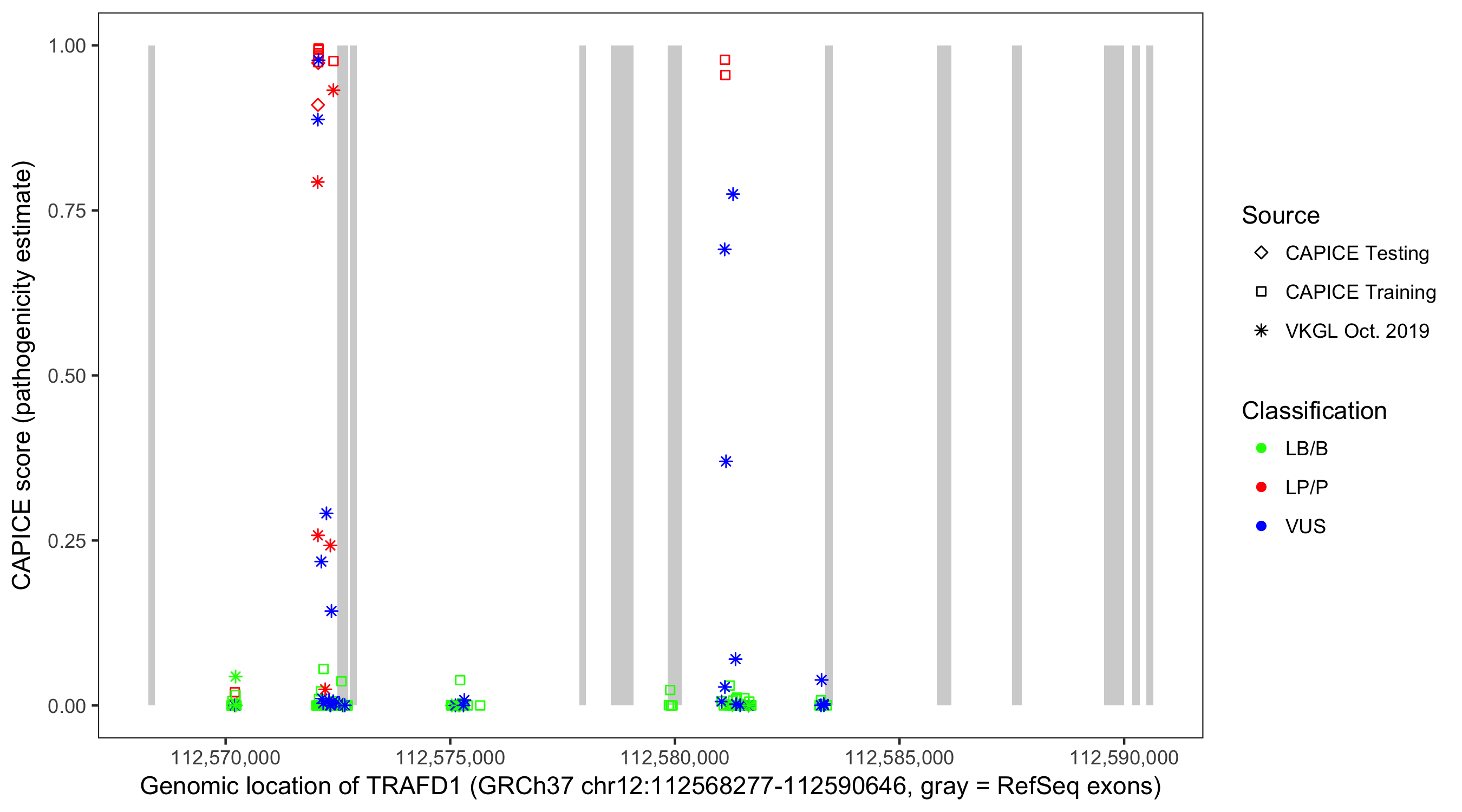 Shown are CAPICE train/test variants plus VKGL Oct 2019.