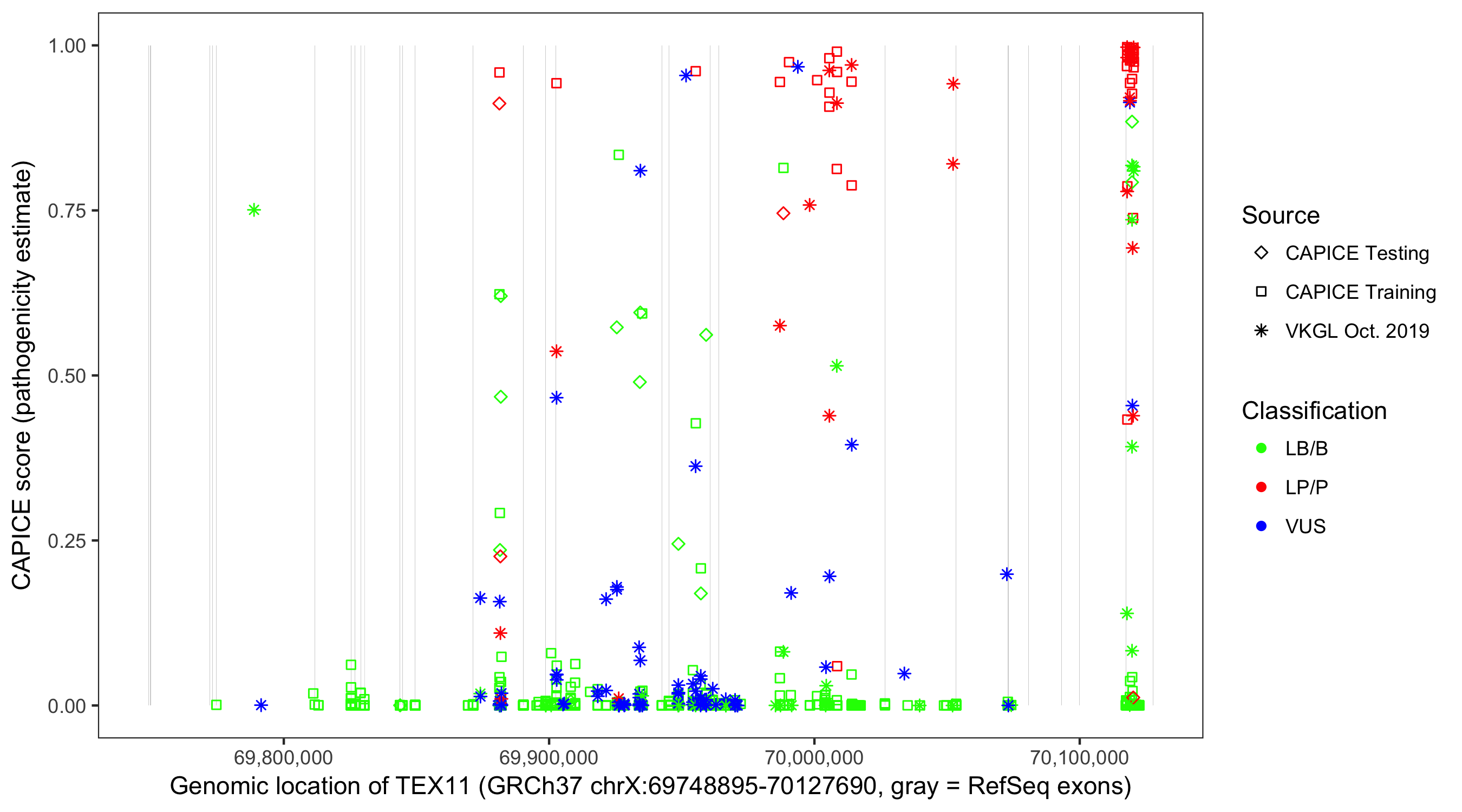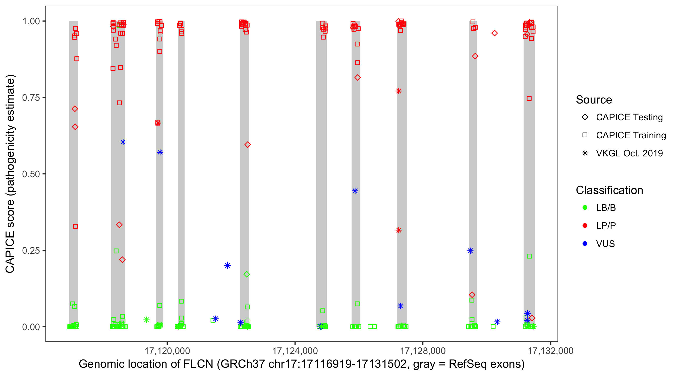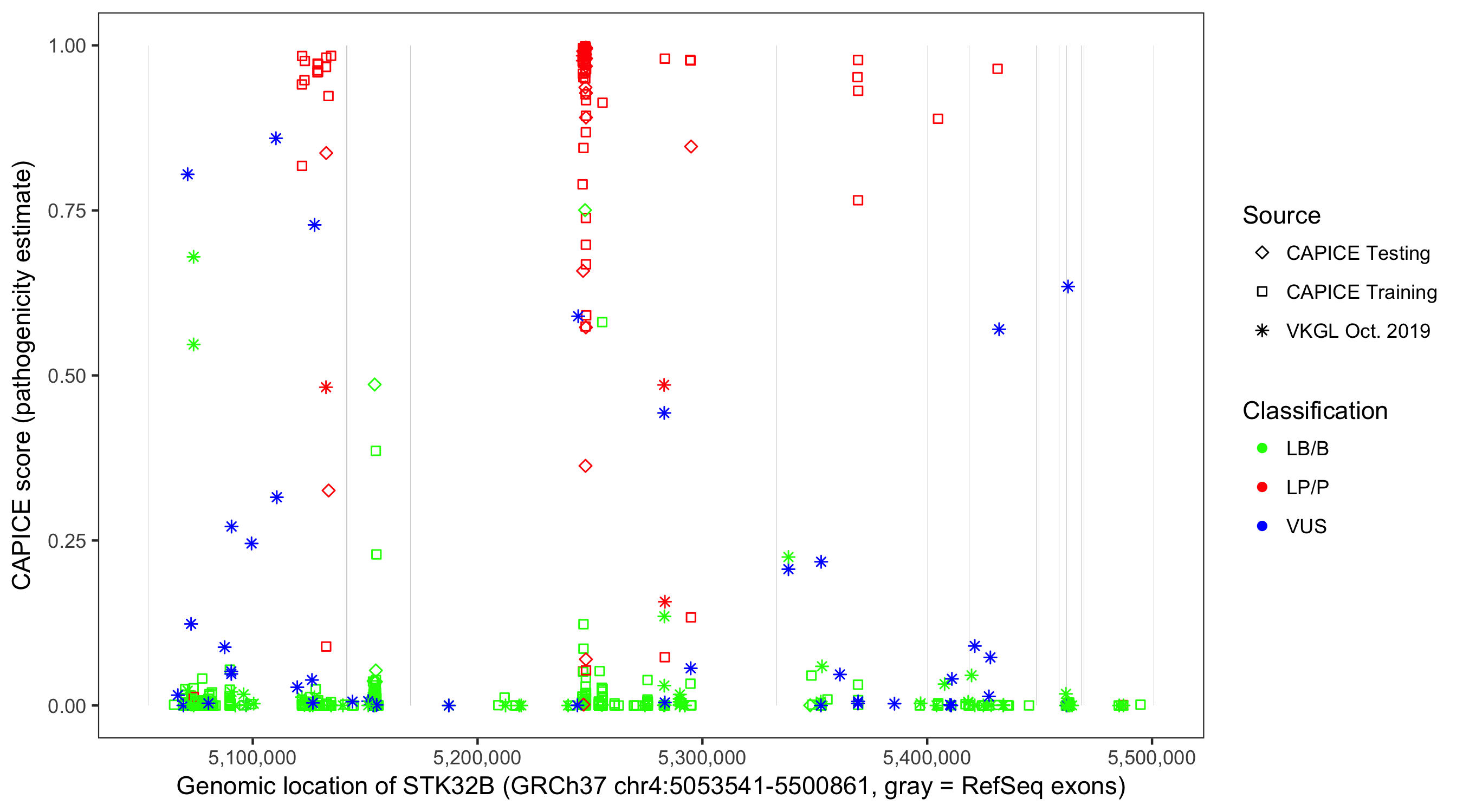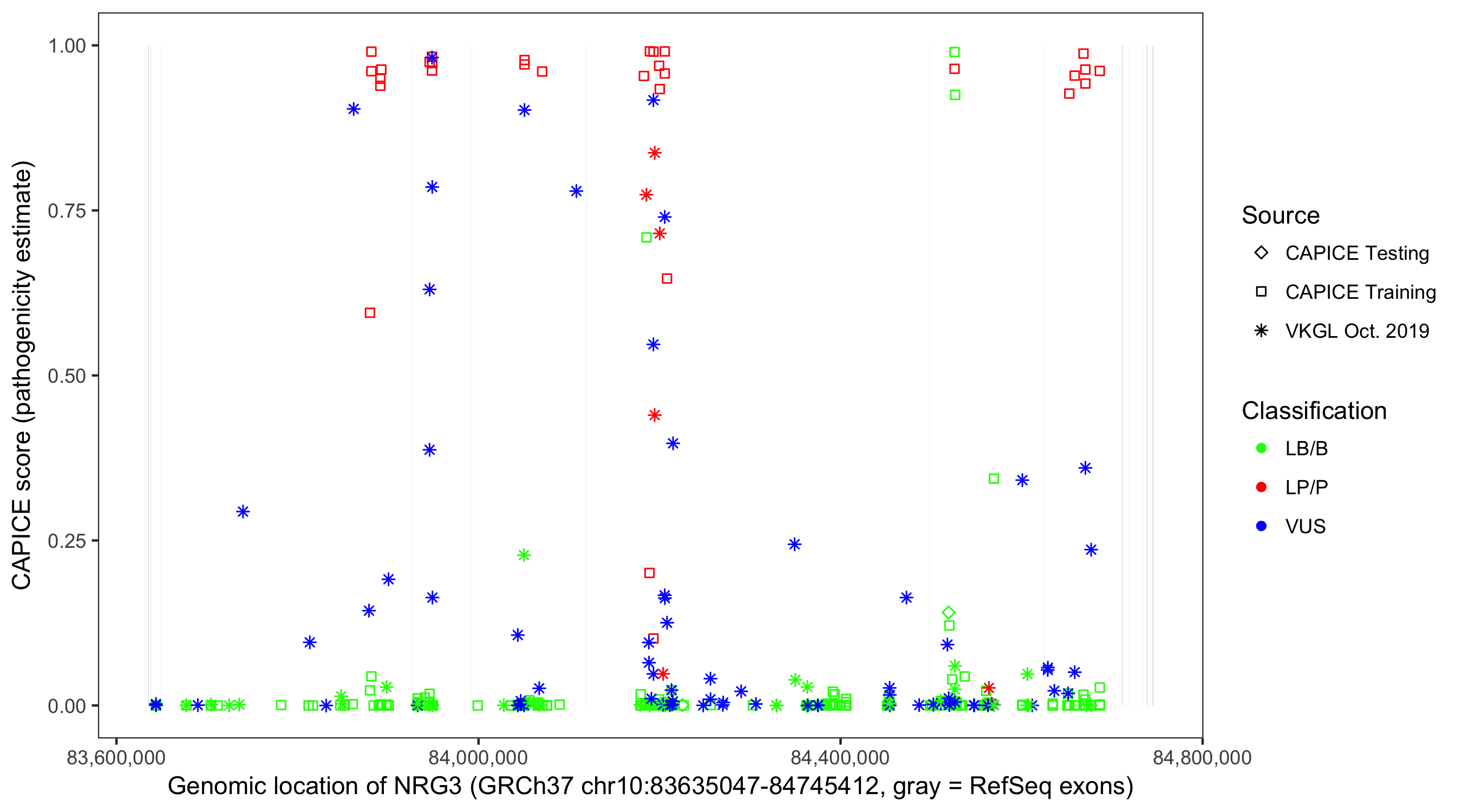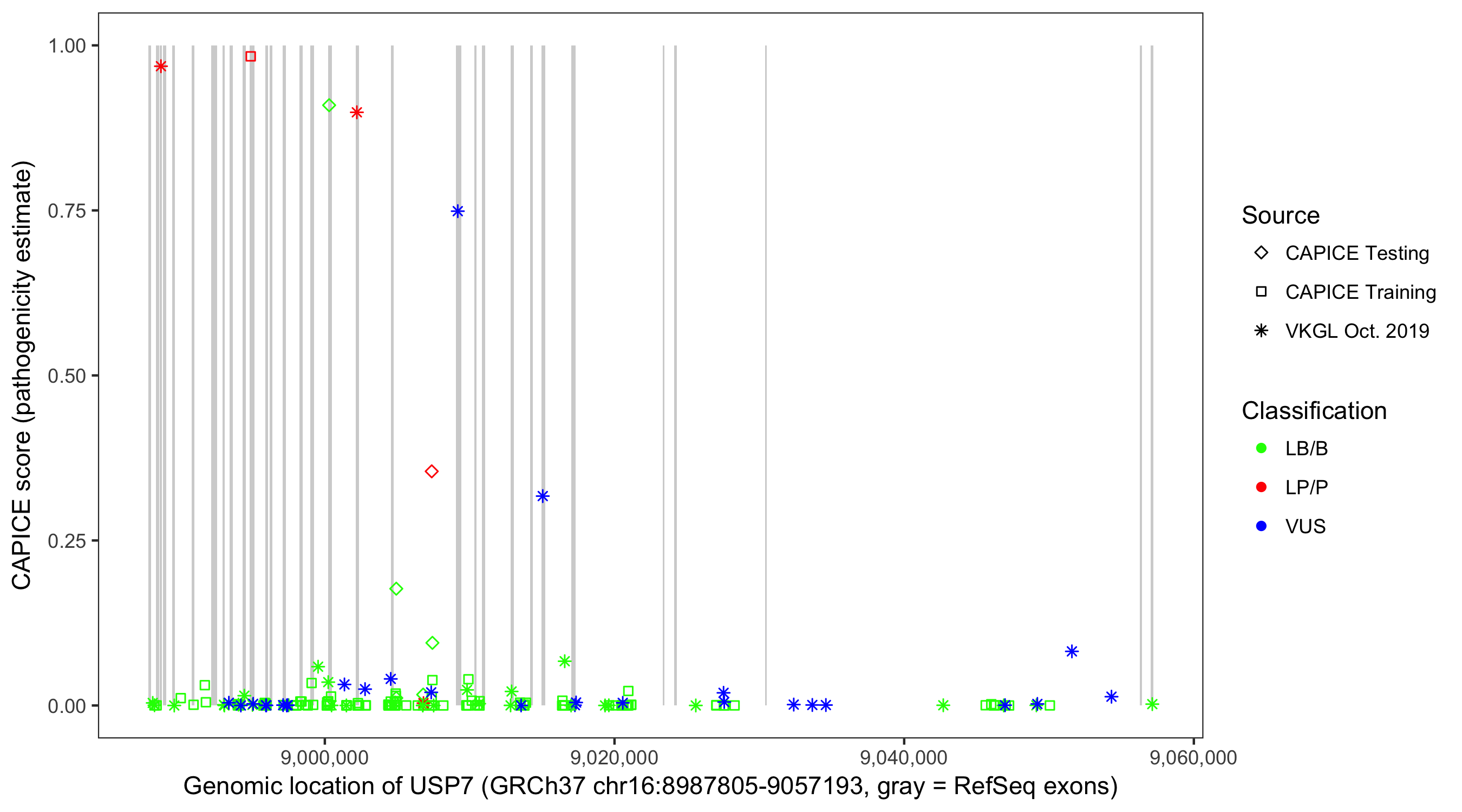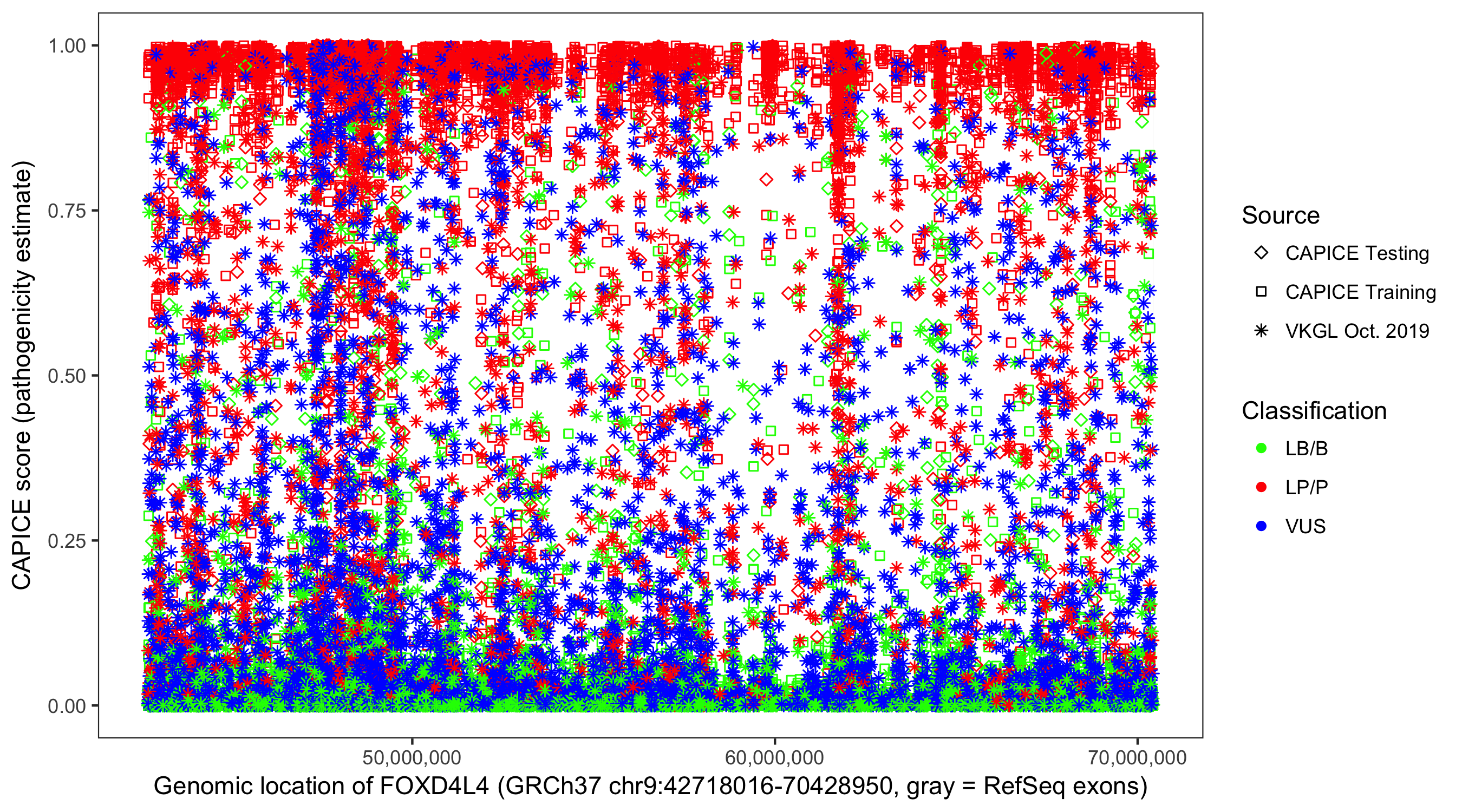 Shown are CAPICE train/test variants plus VKGL Oct 2019.