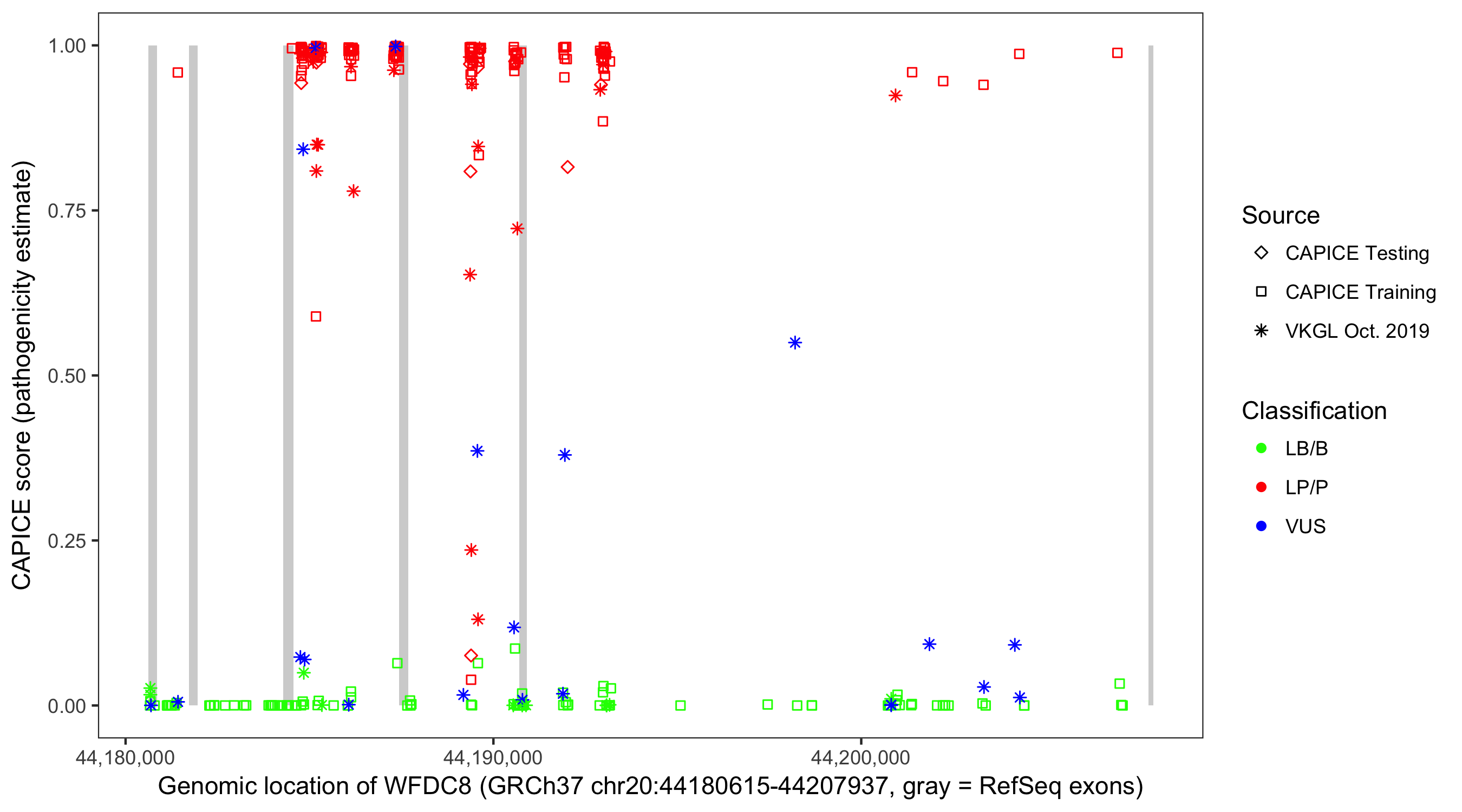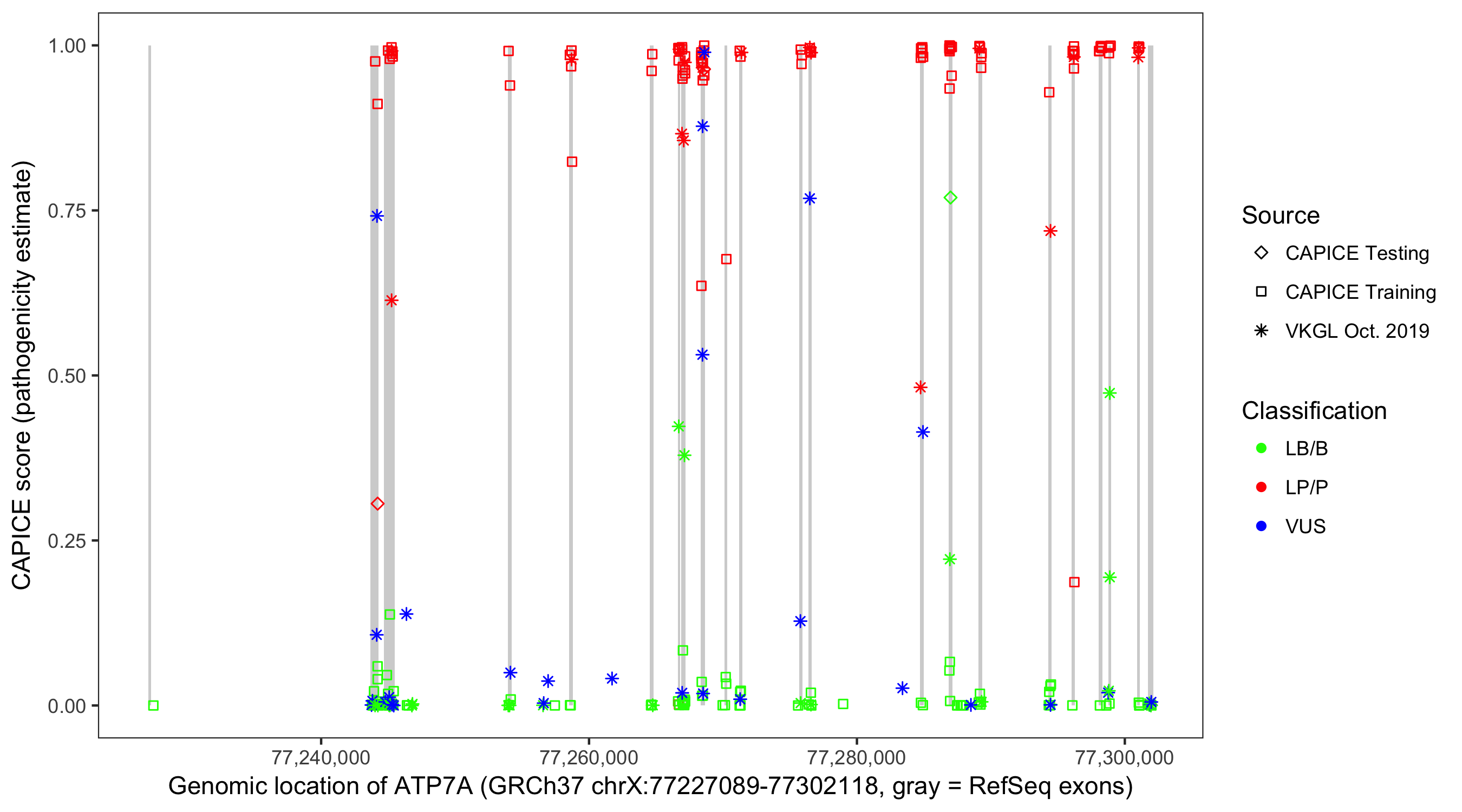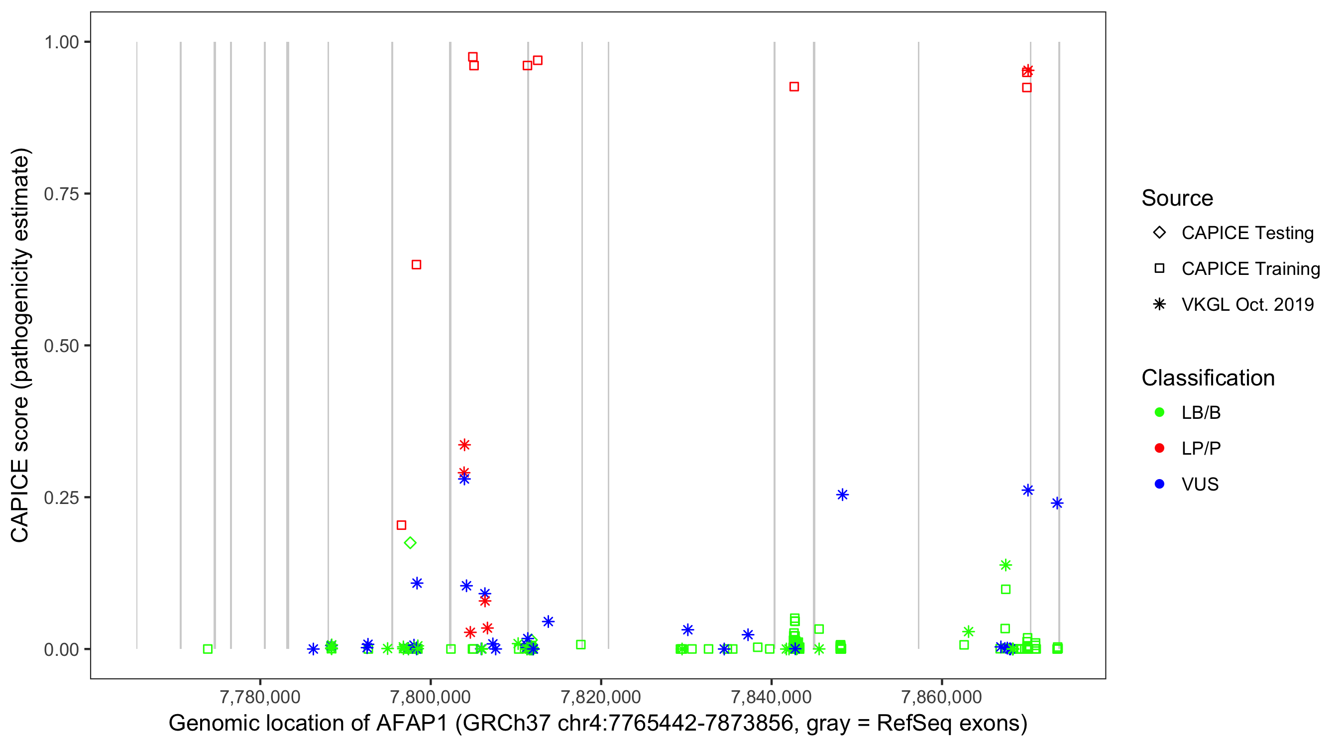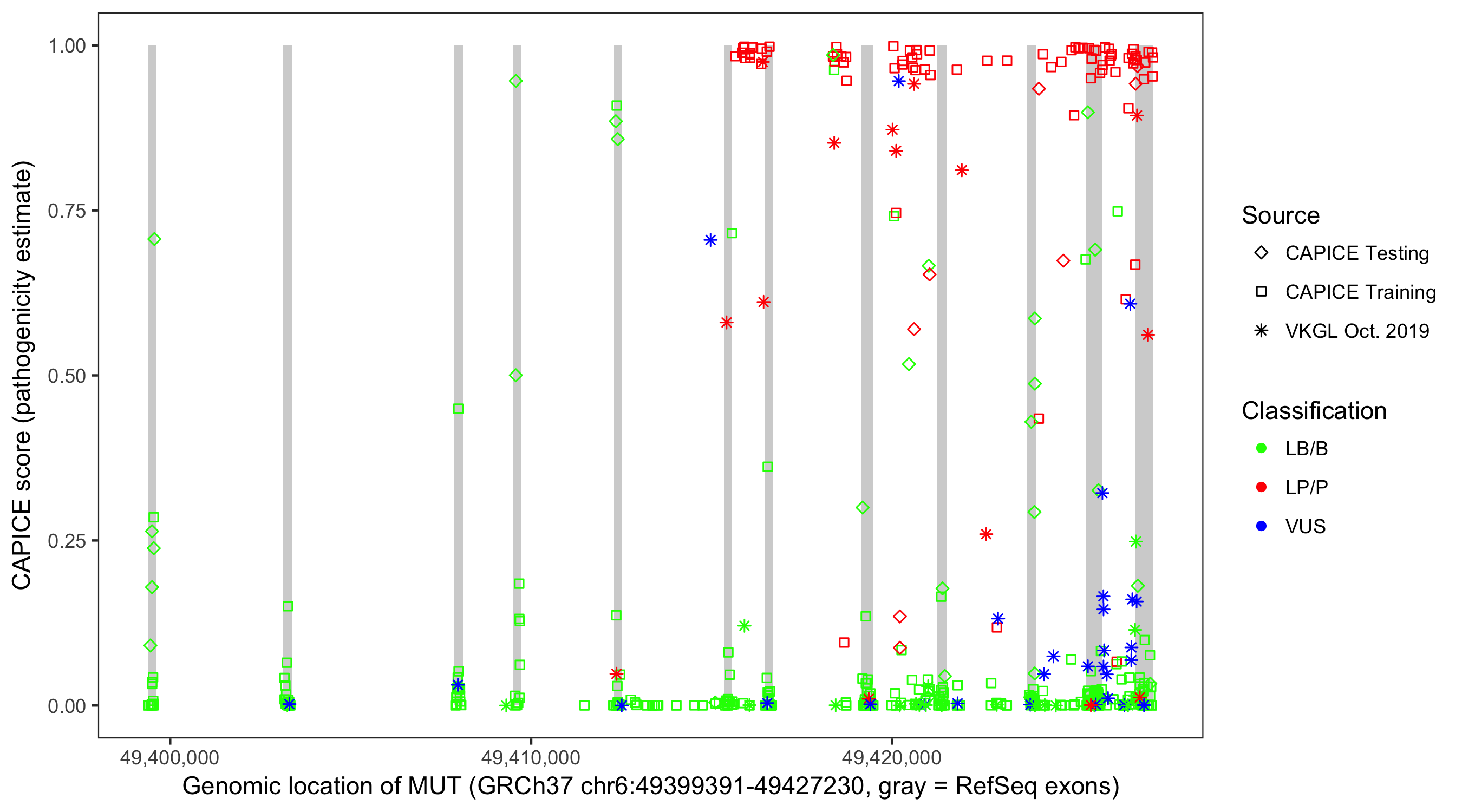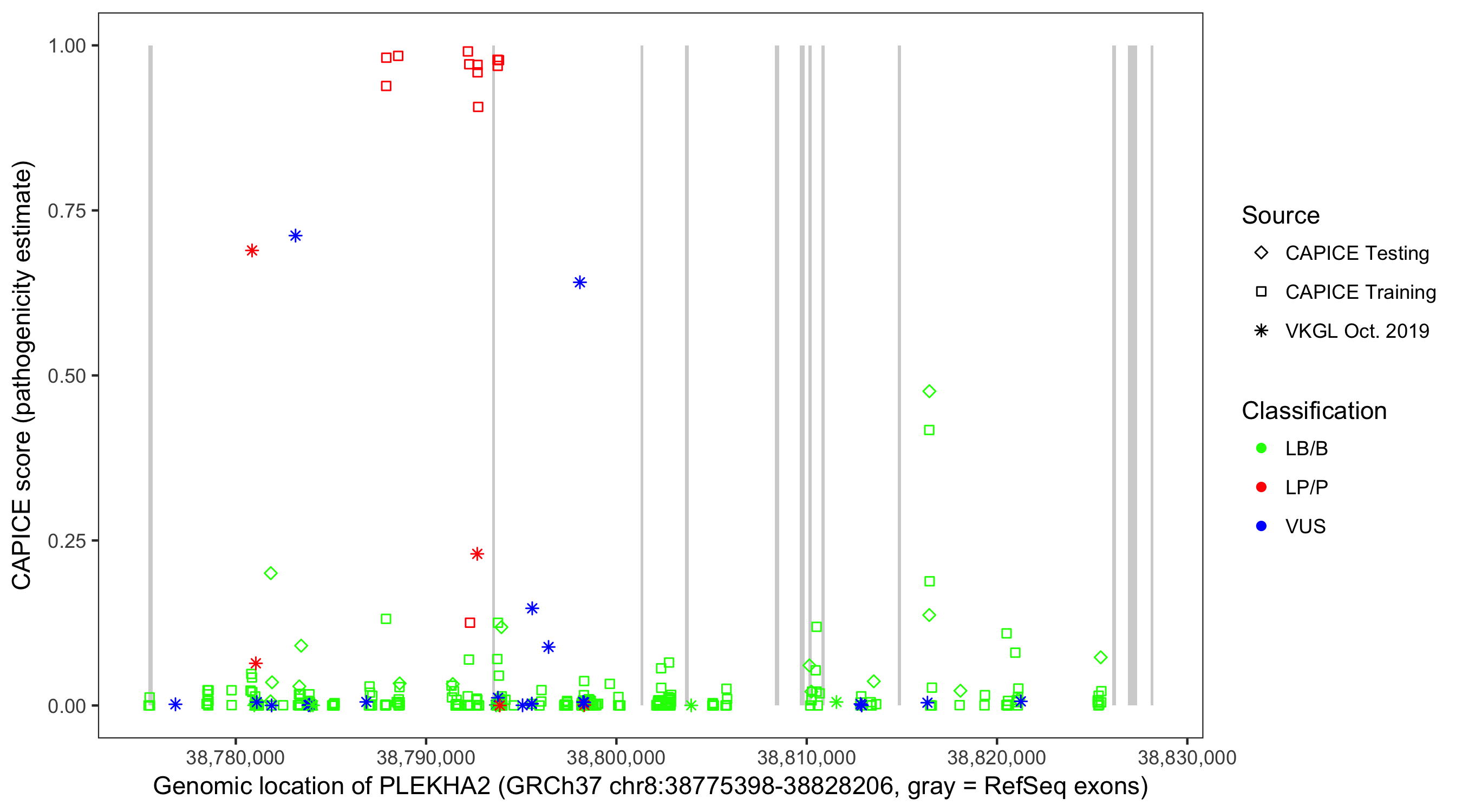 Shown are CAPICE train/test variants plus VKGL Oct 2019.
