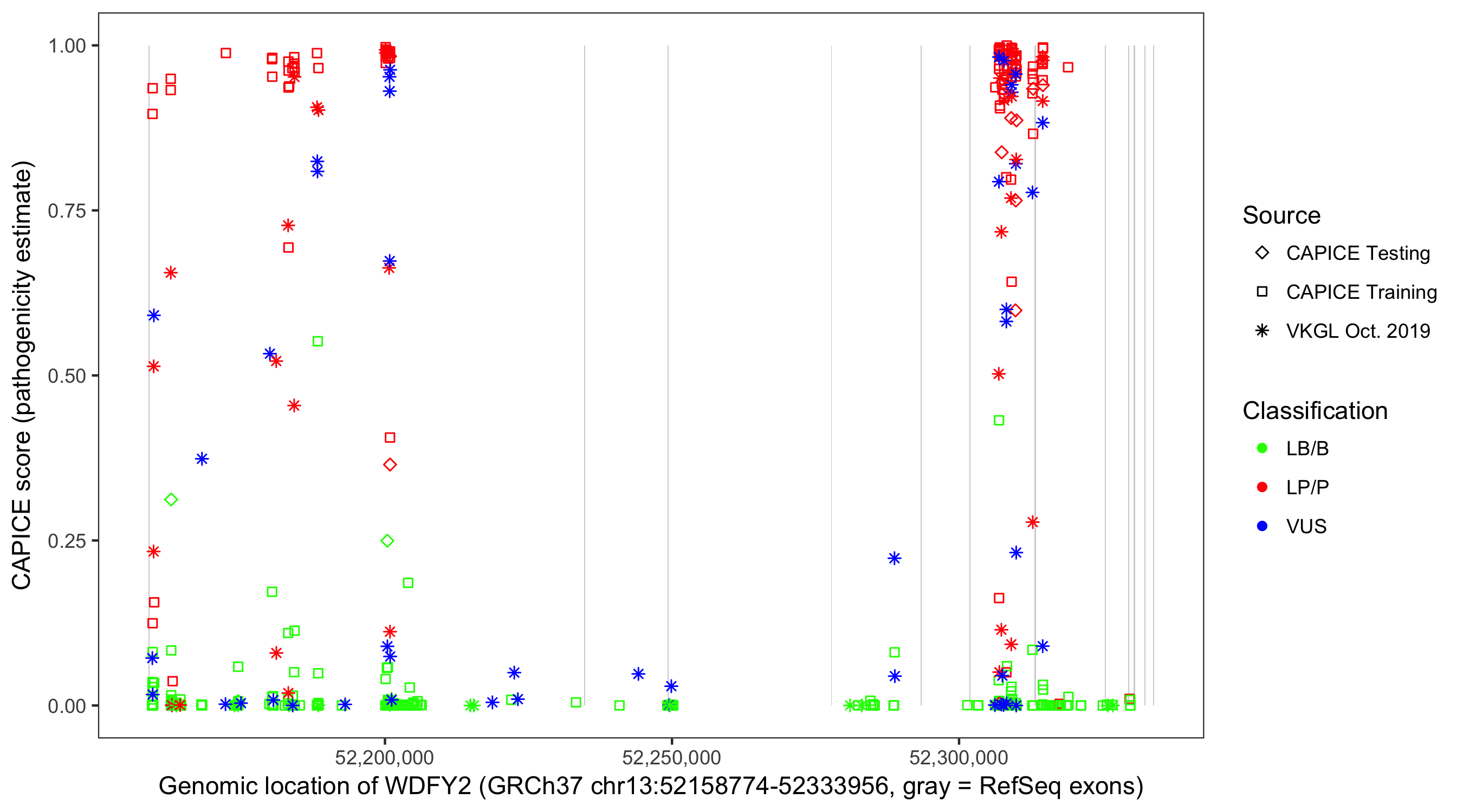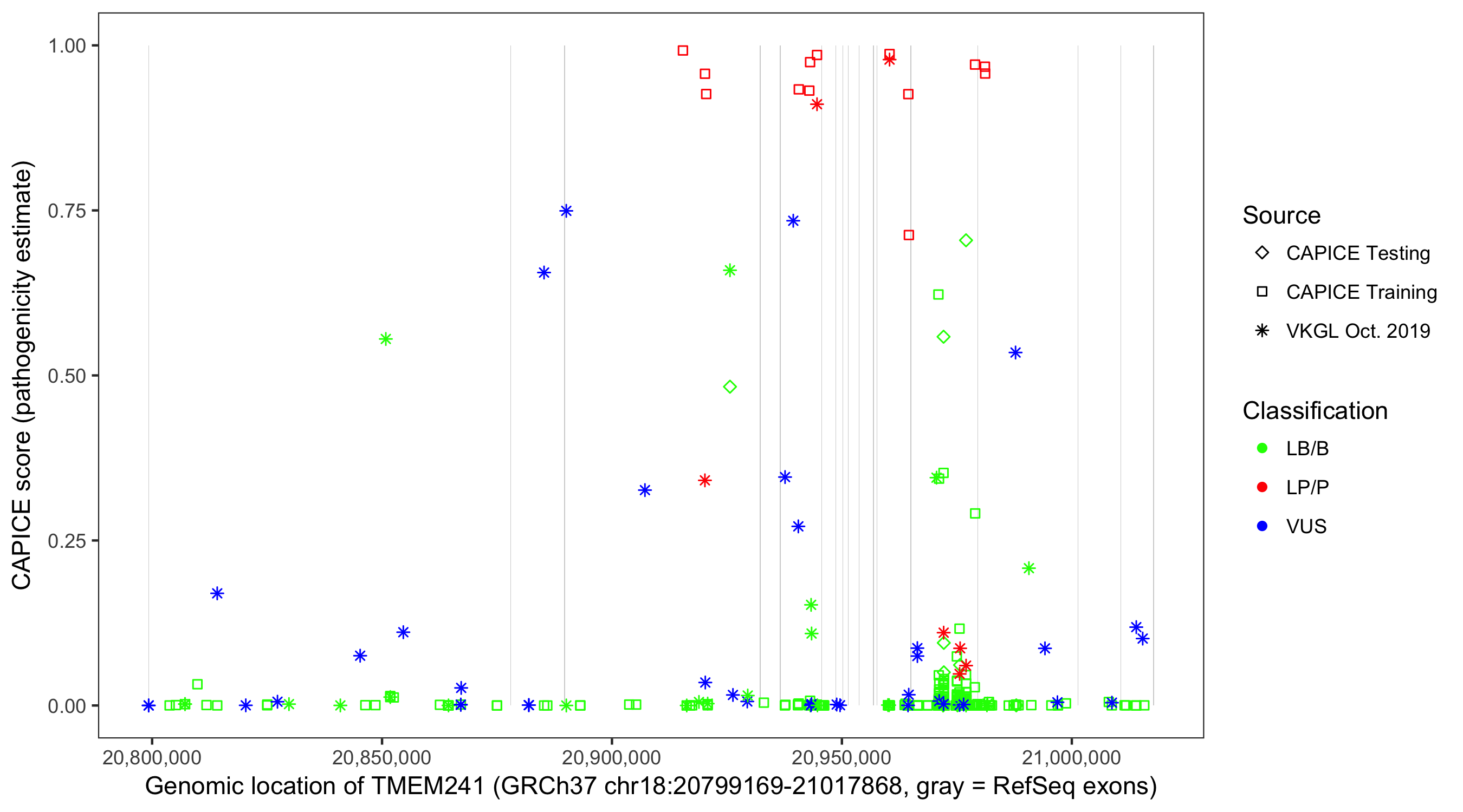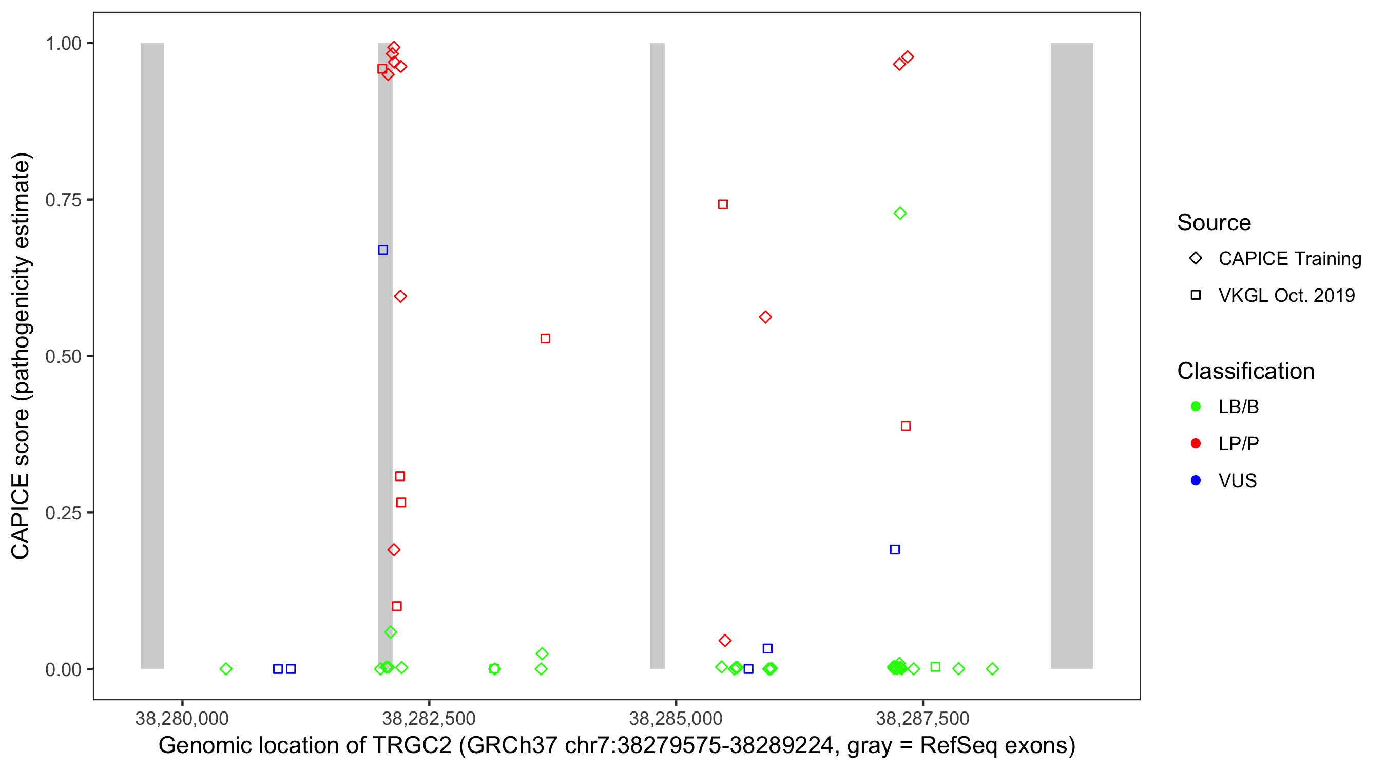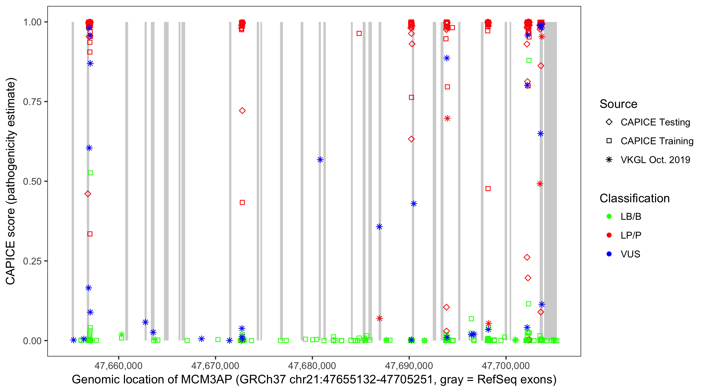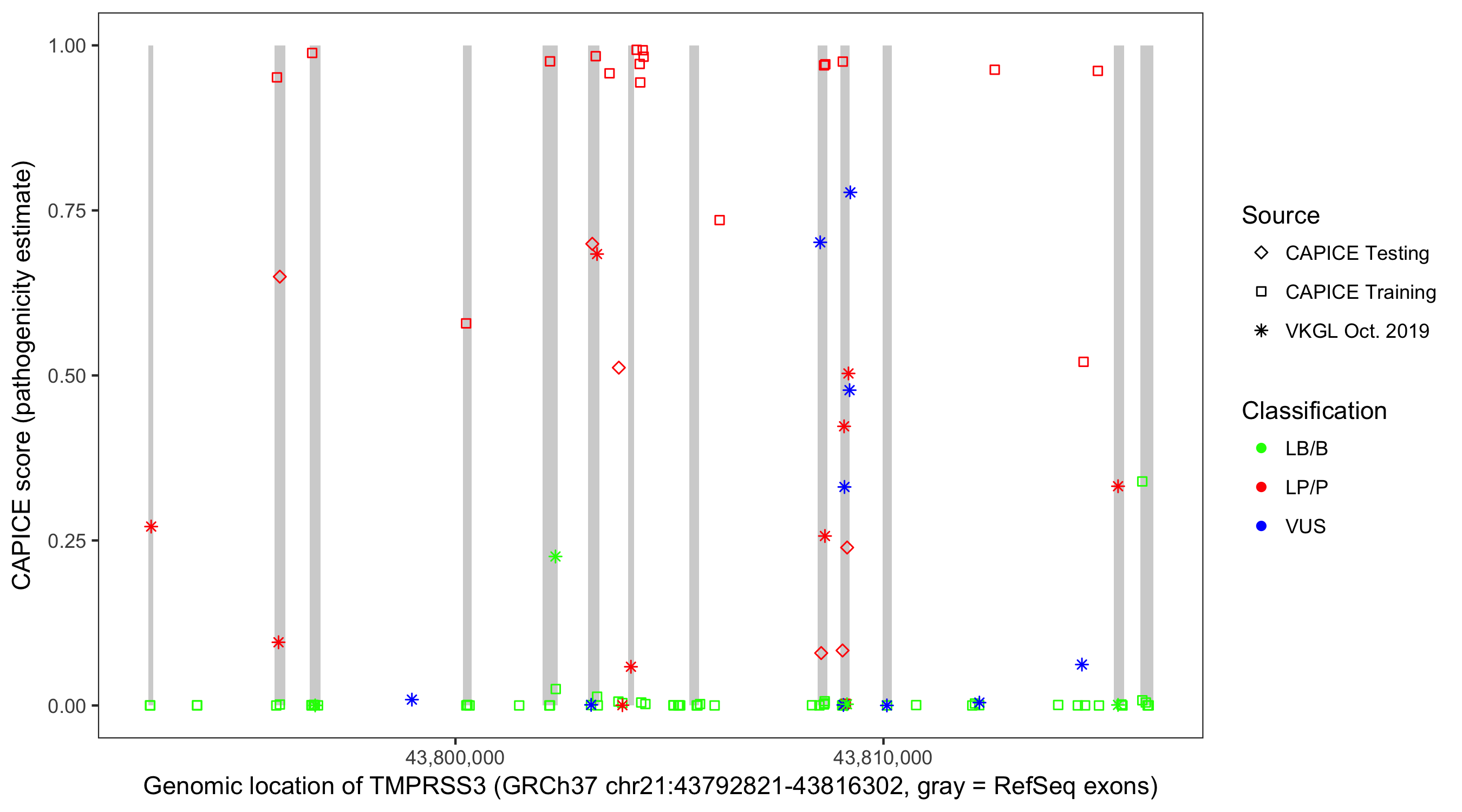 Shown are CAPICE train/test variants plus VKGL Oct 2019.