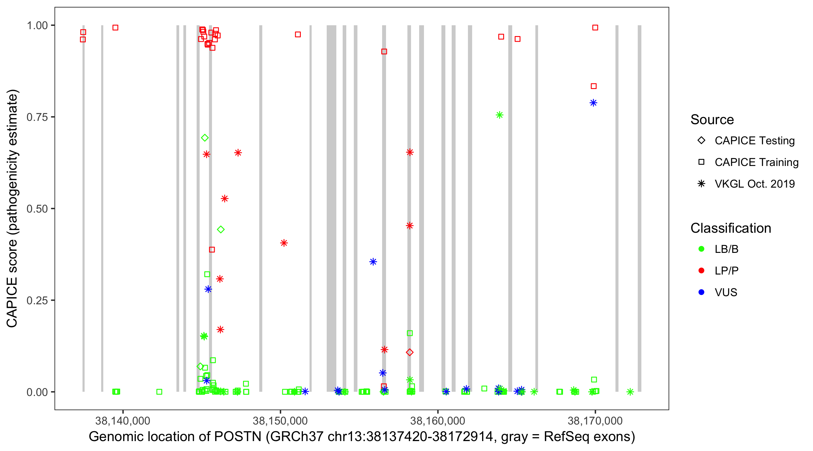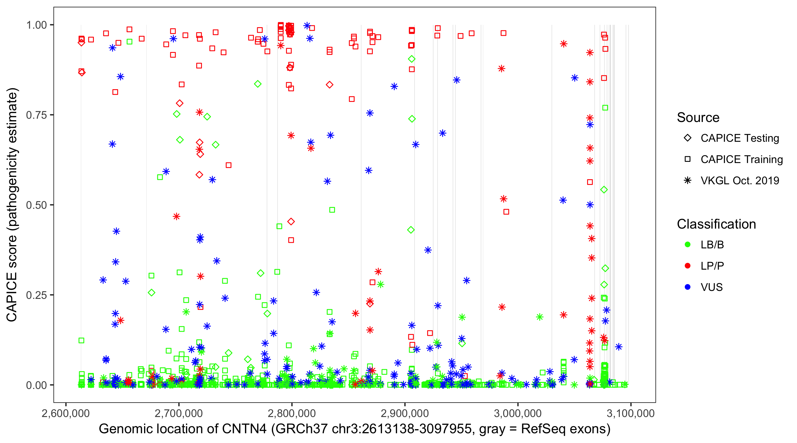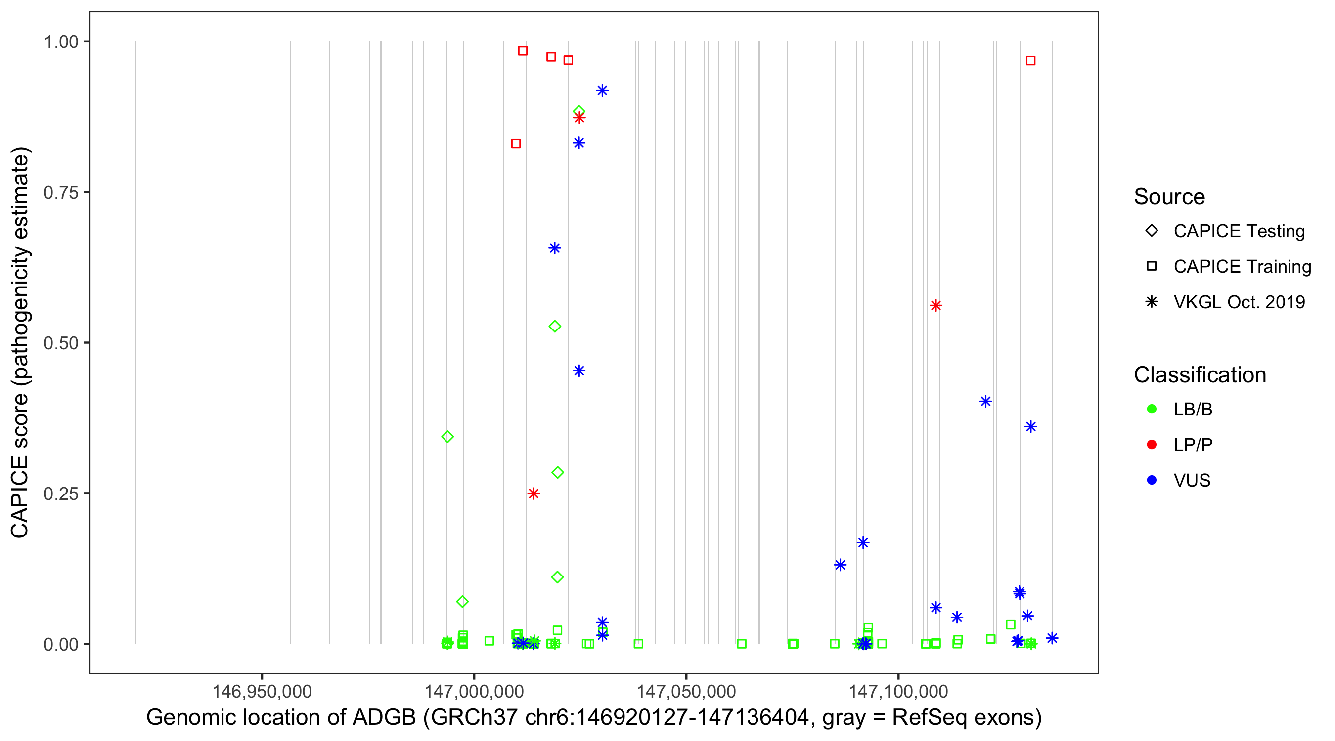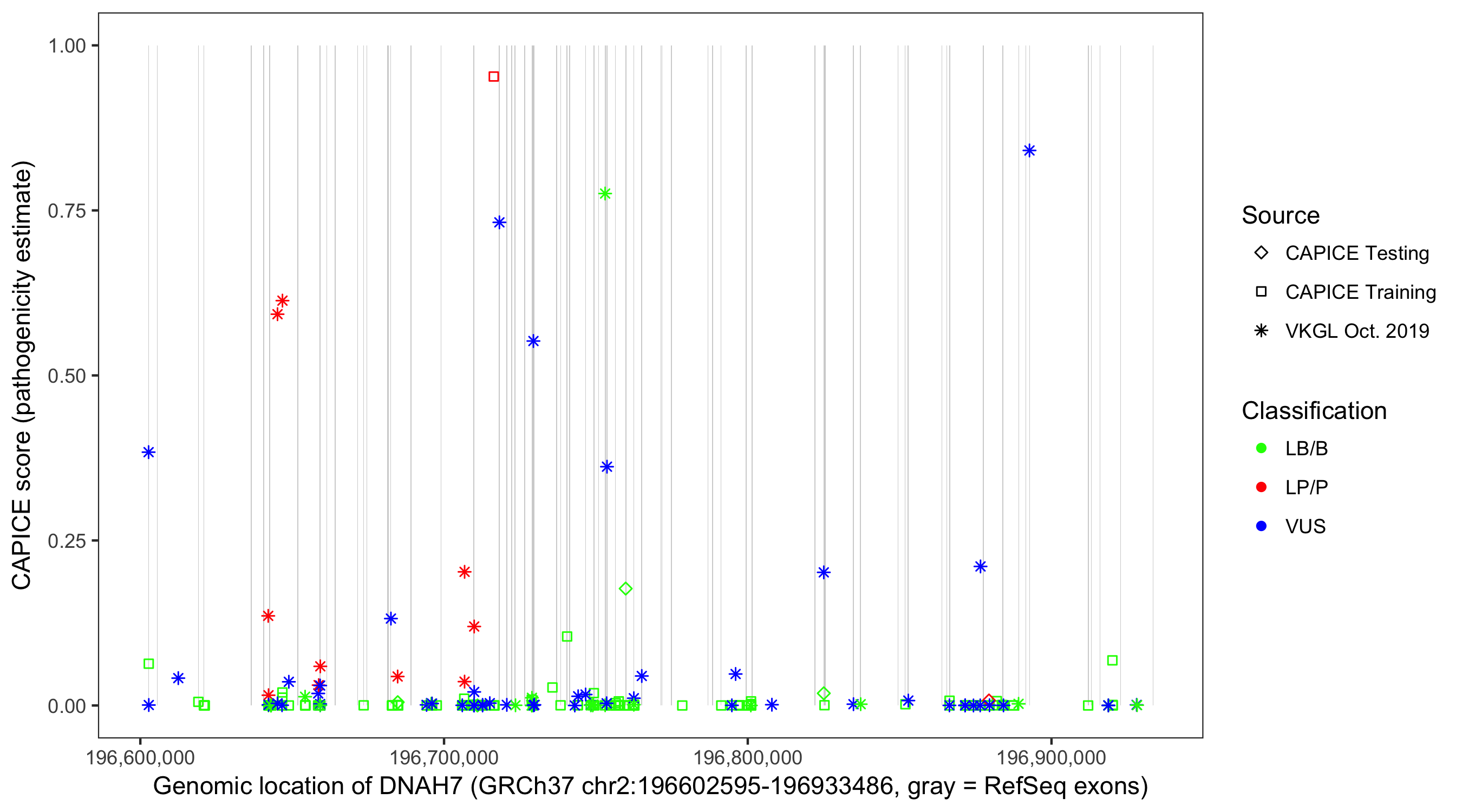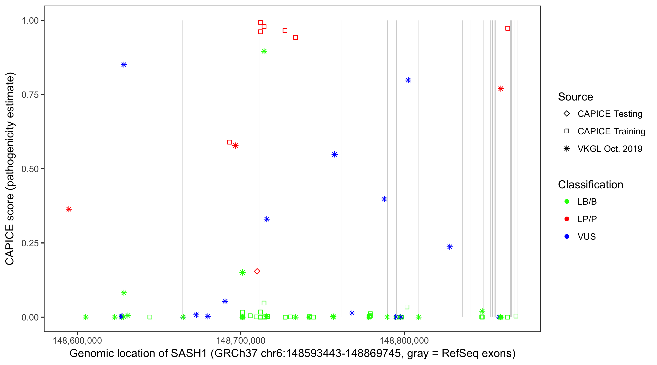 Shown are CAPICE train/test variants plus VKGL Oct 2019.