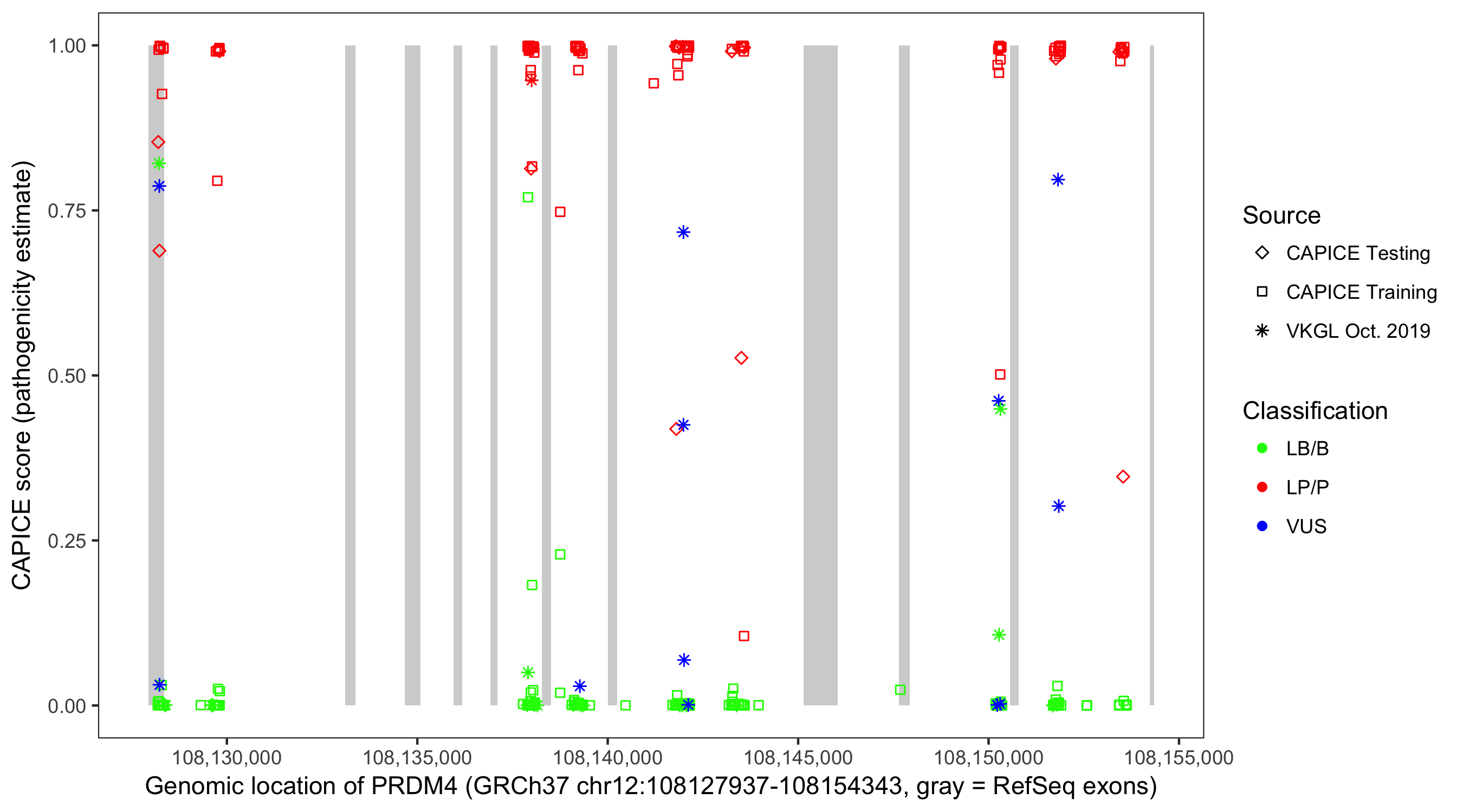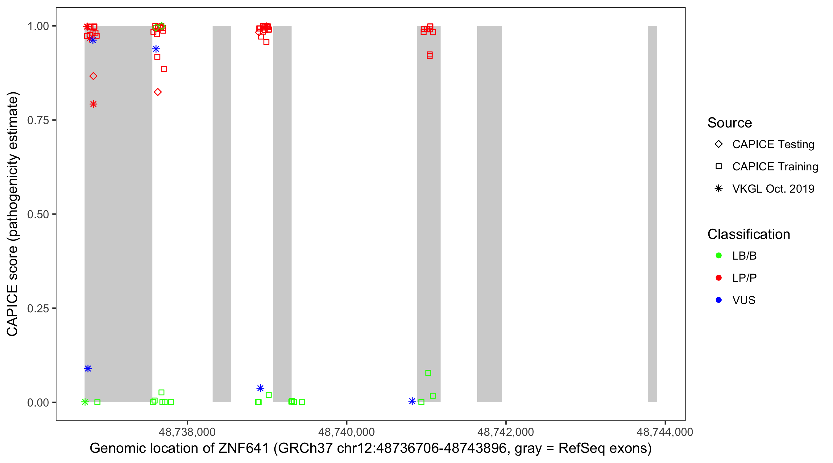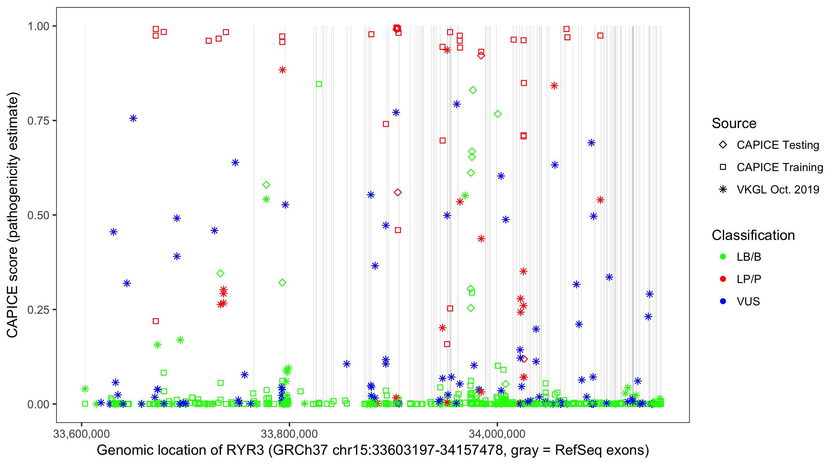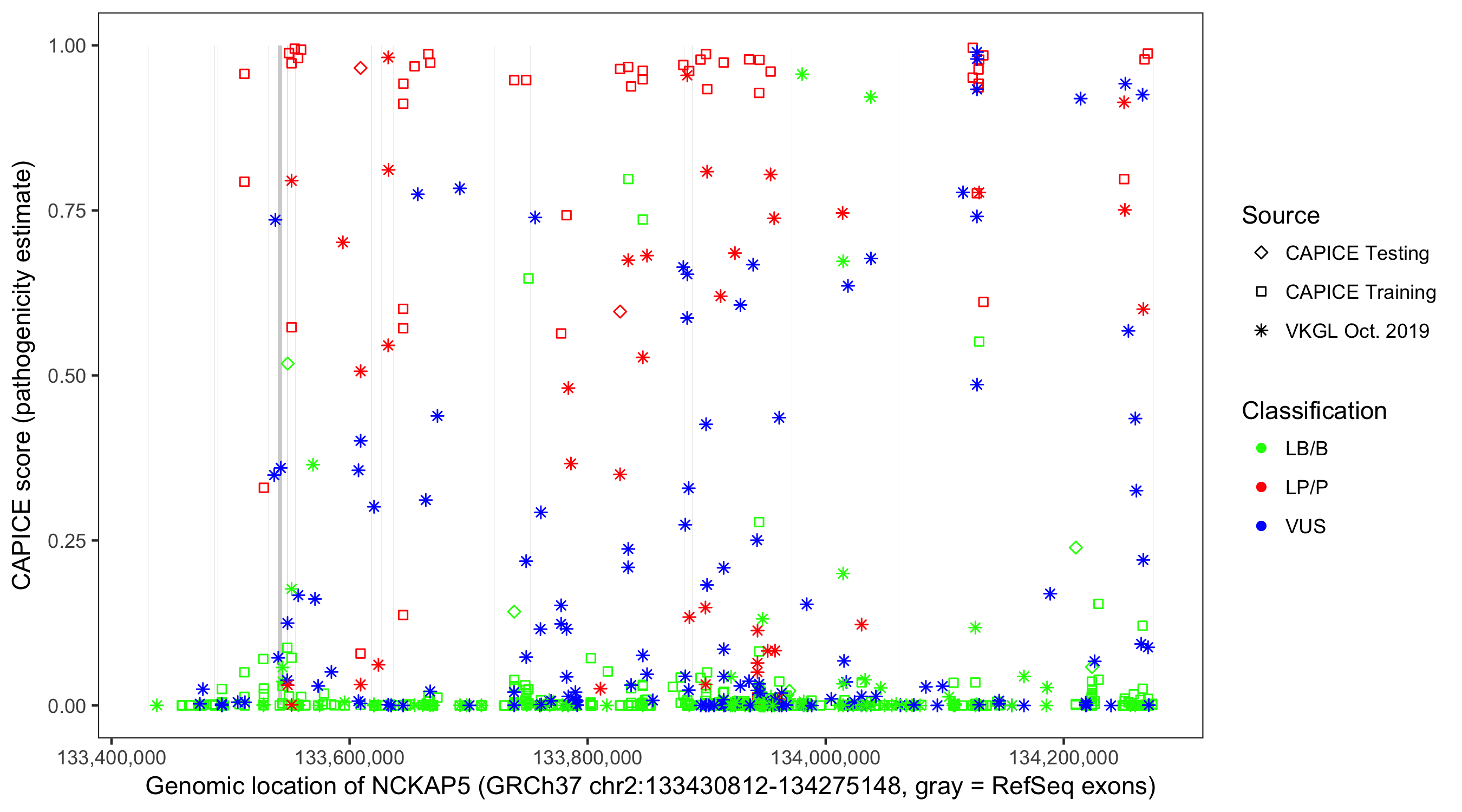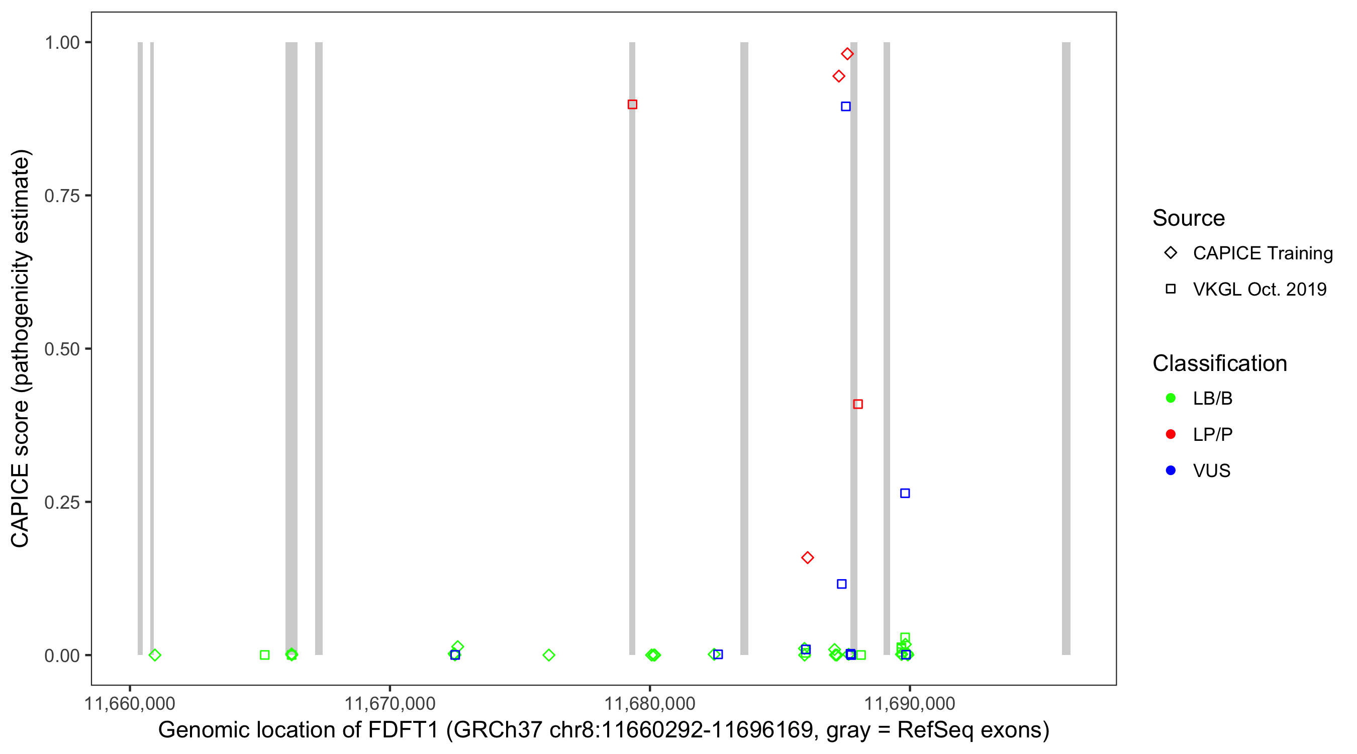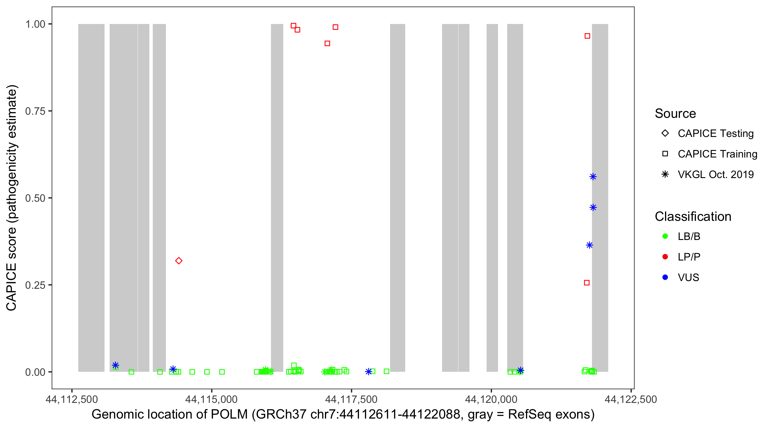 Shown are CAPICE train/test variants plus VKGL Oct 2019.
