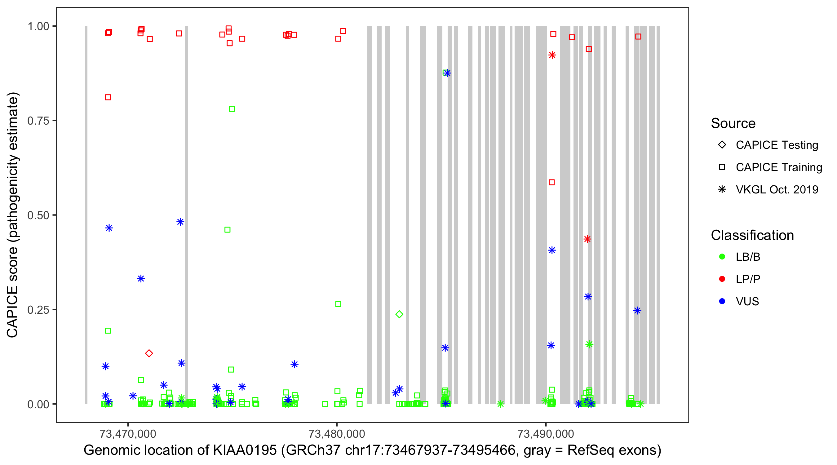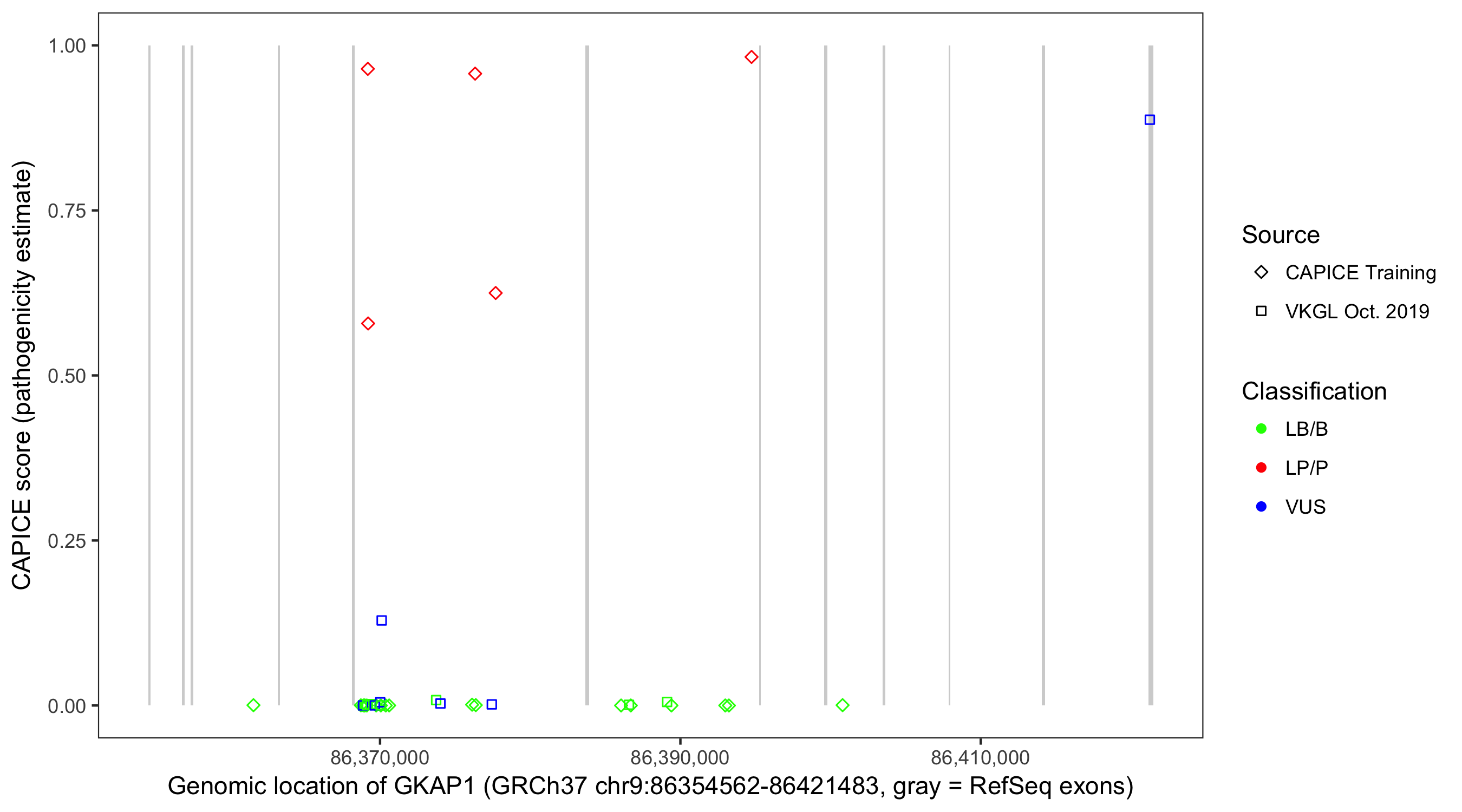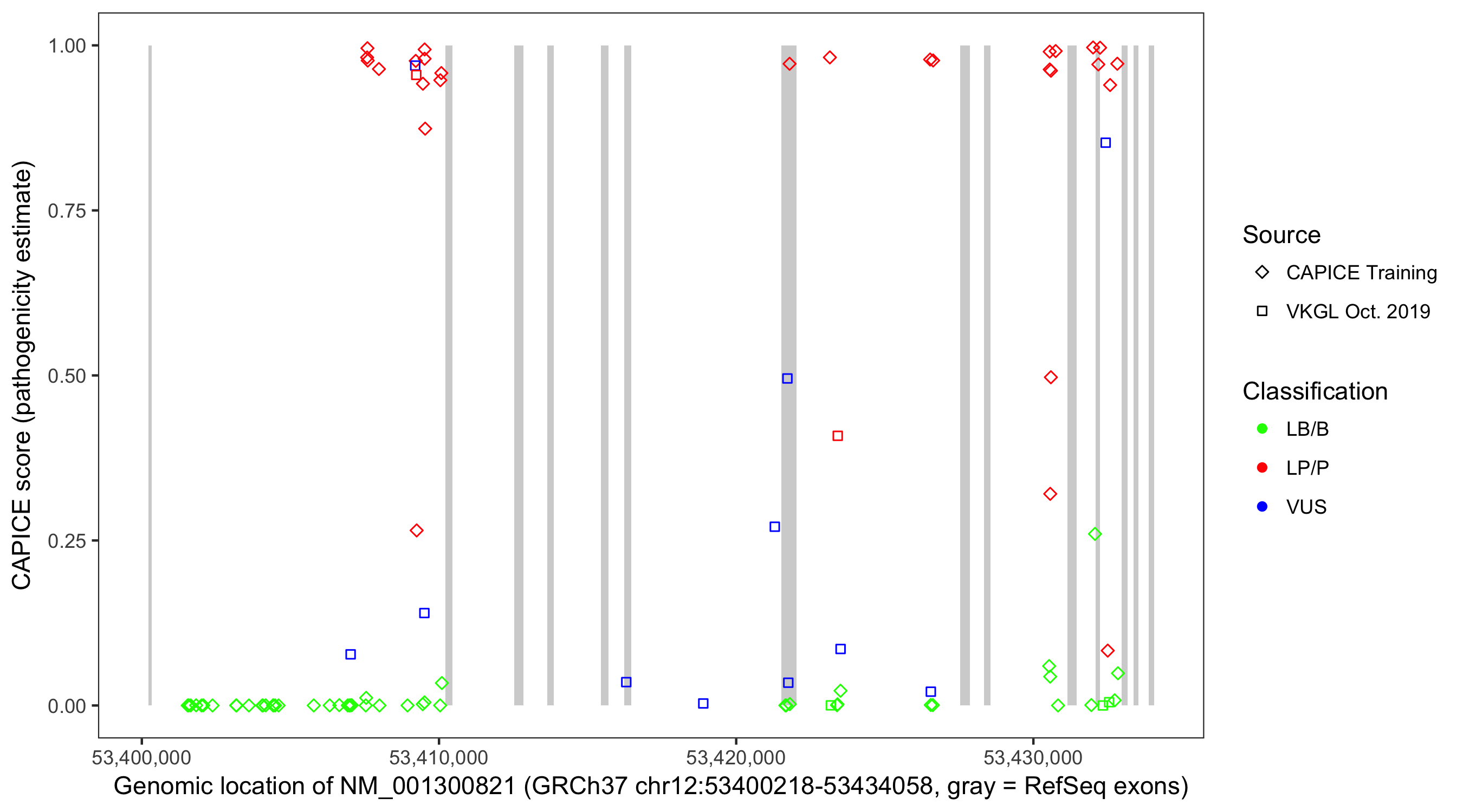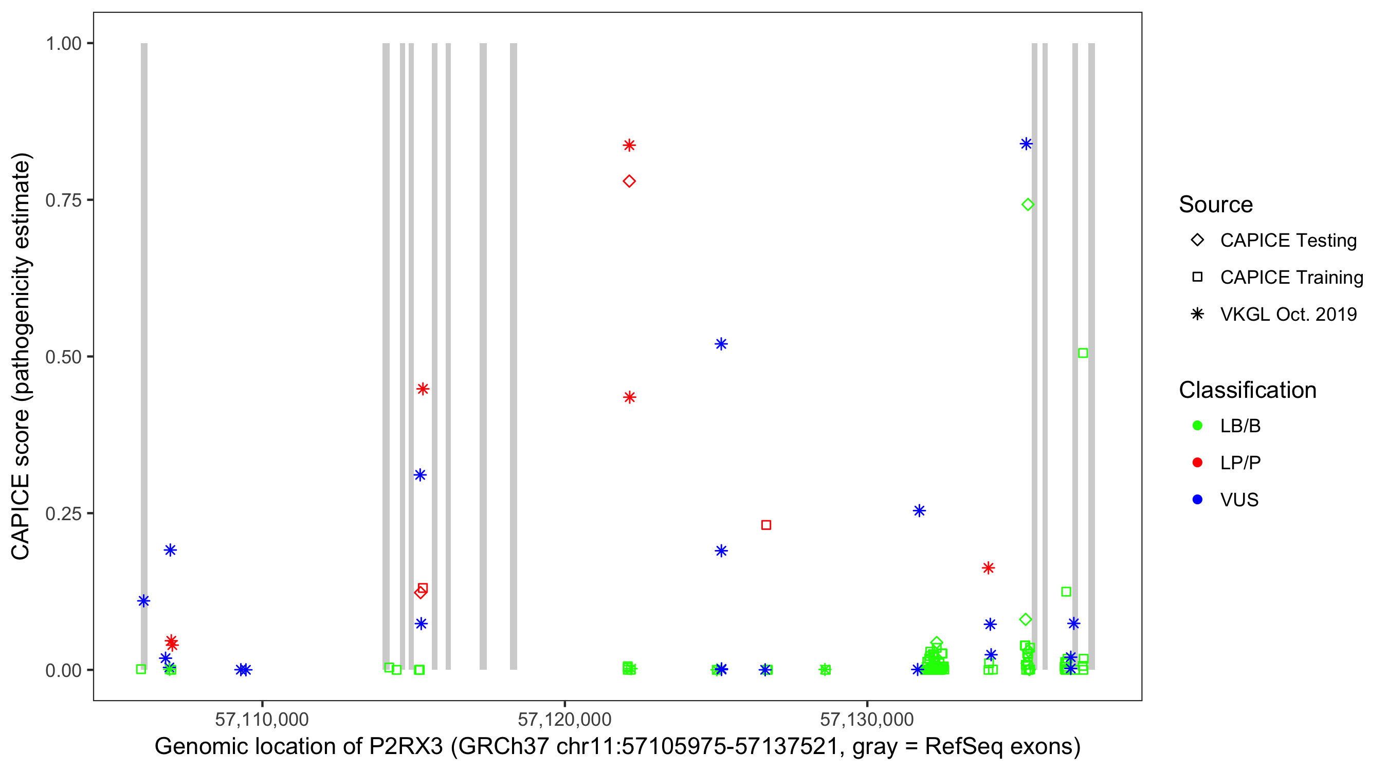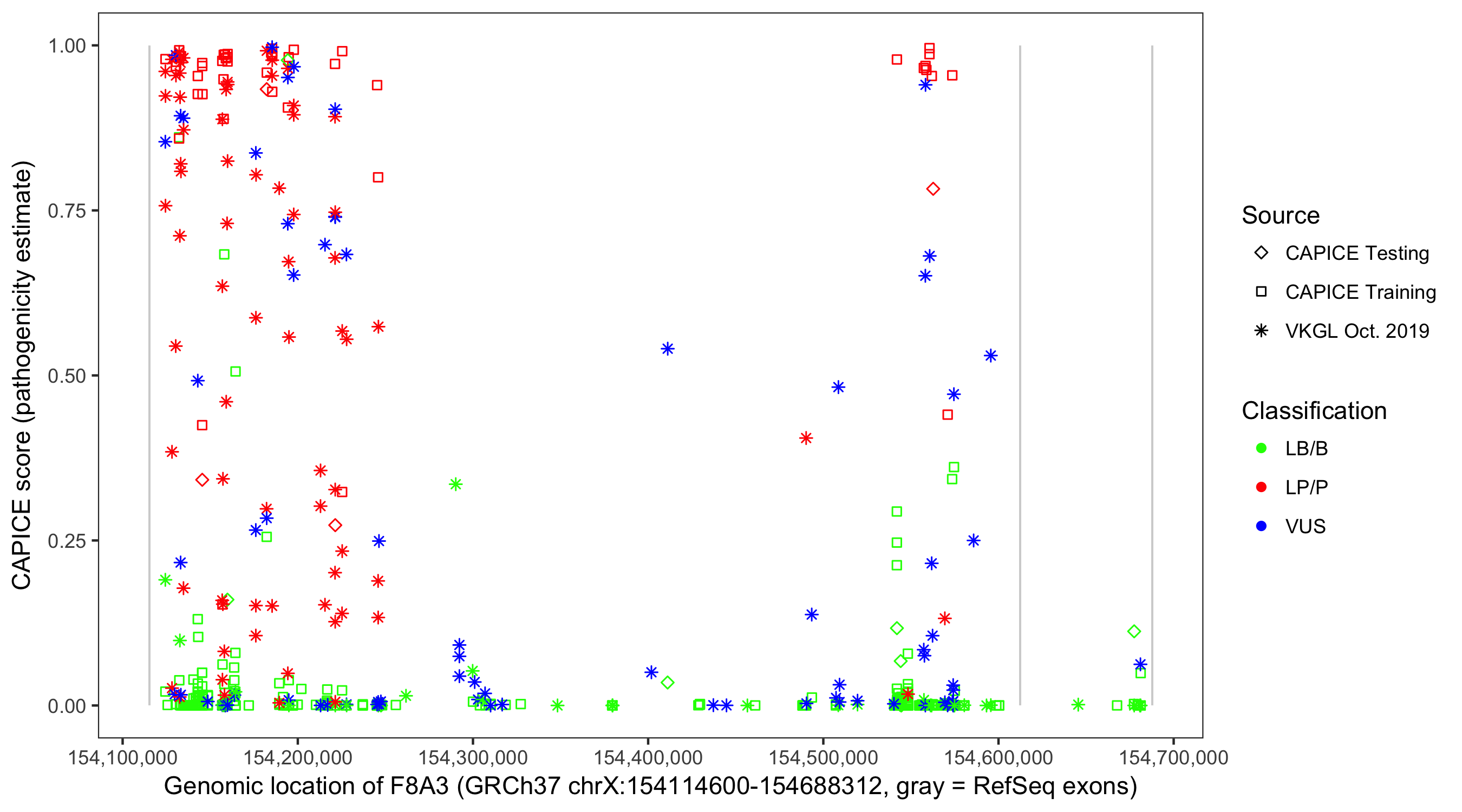 Shown are CAPICE train/test variants plus VKGL Oct 2019.