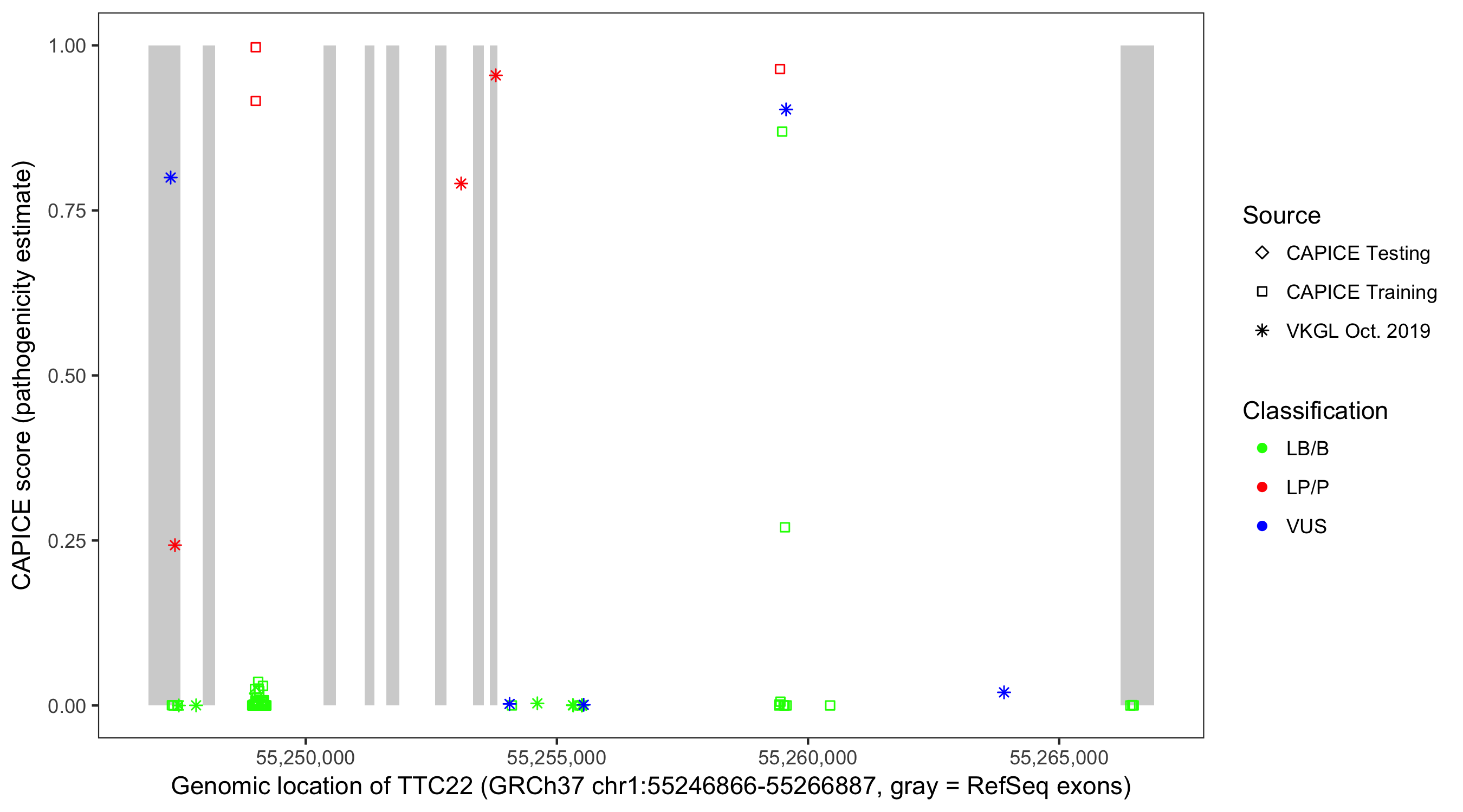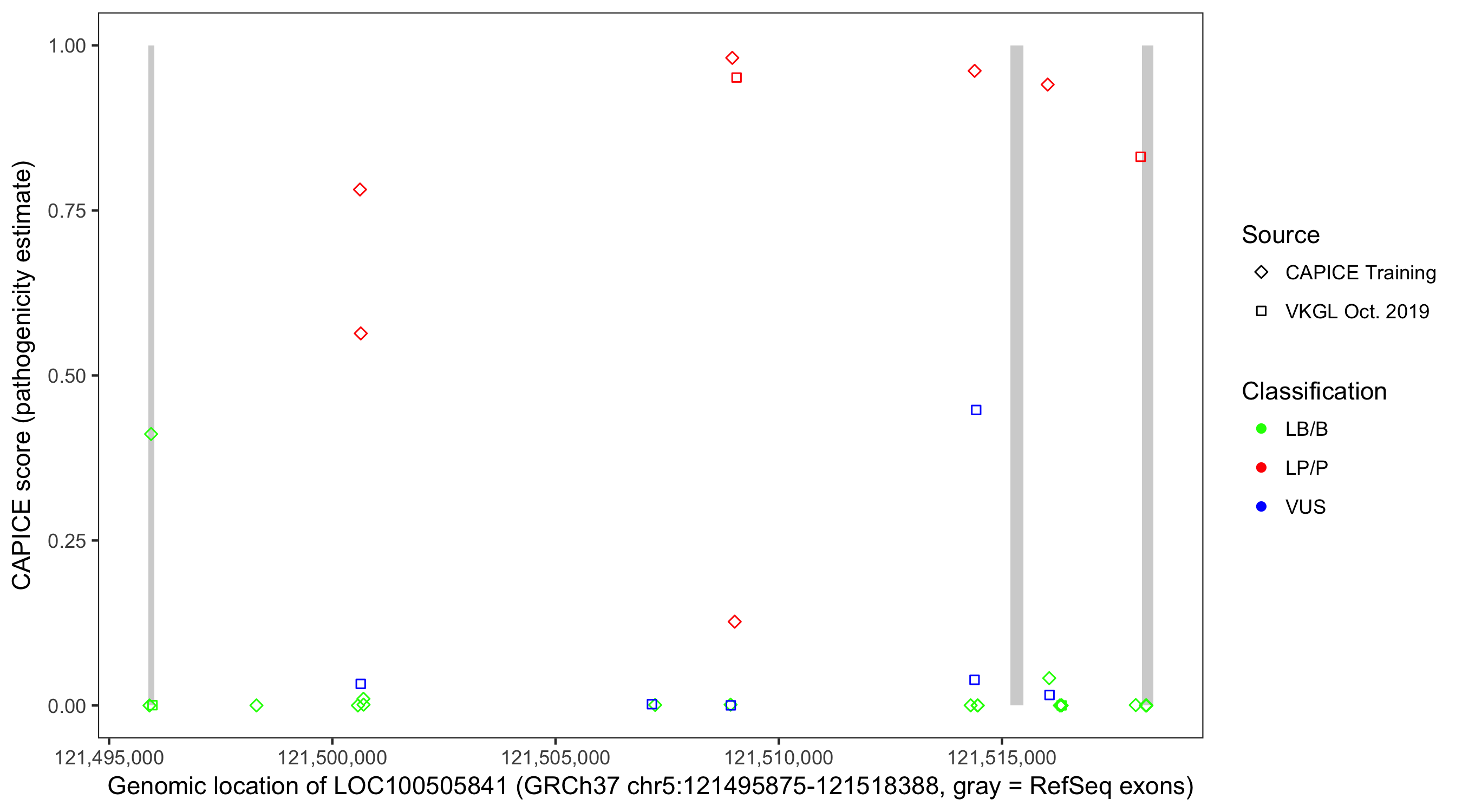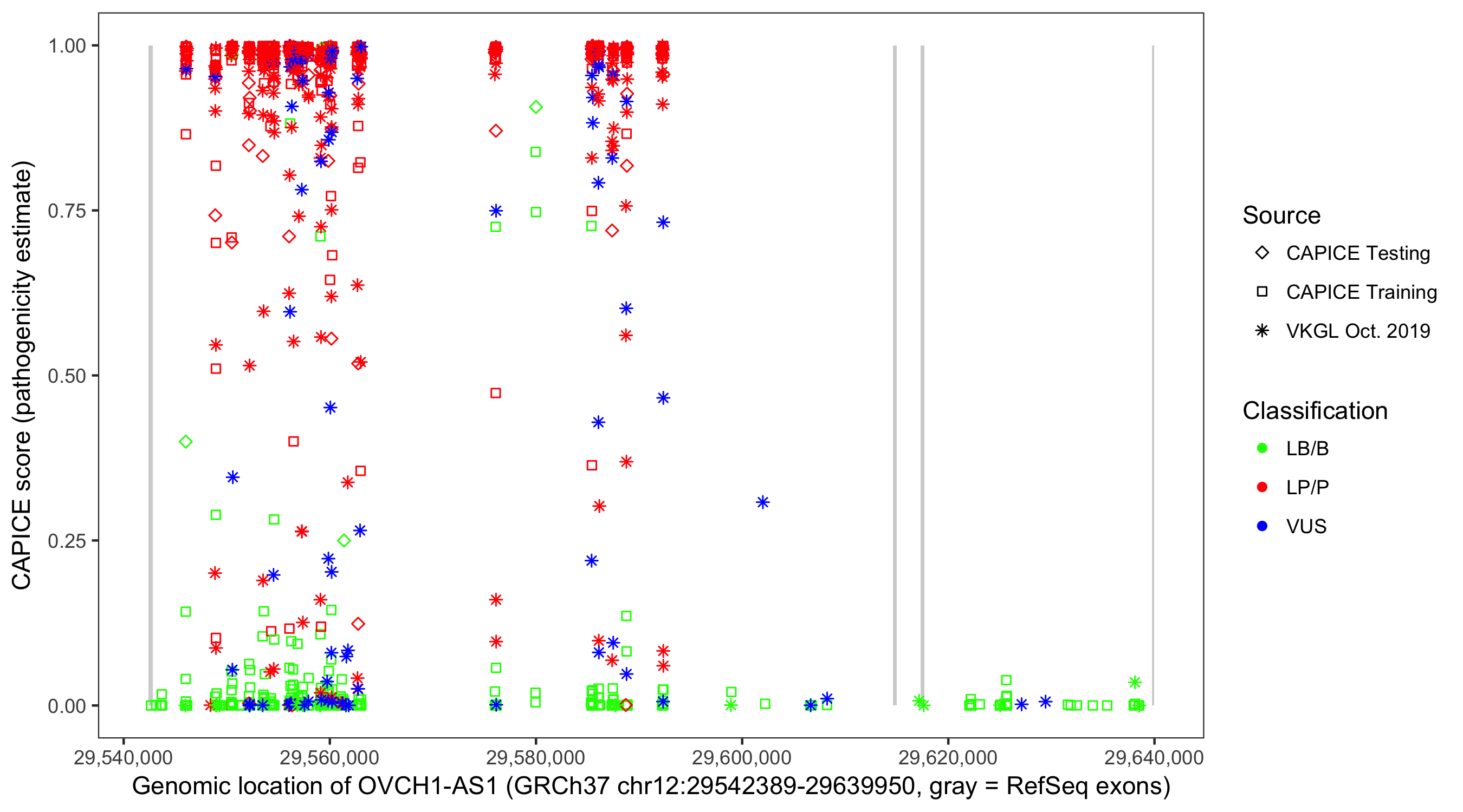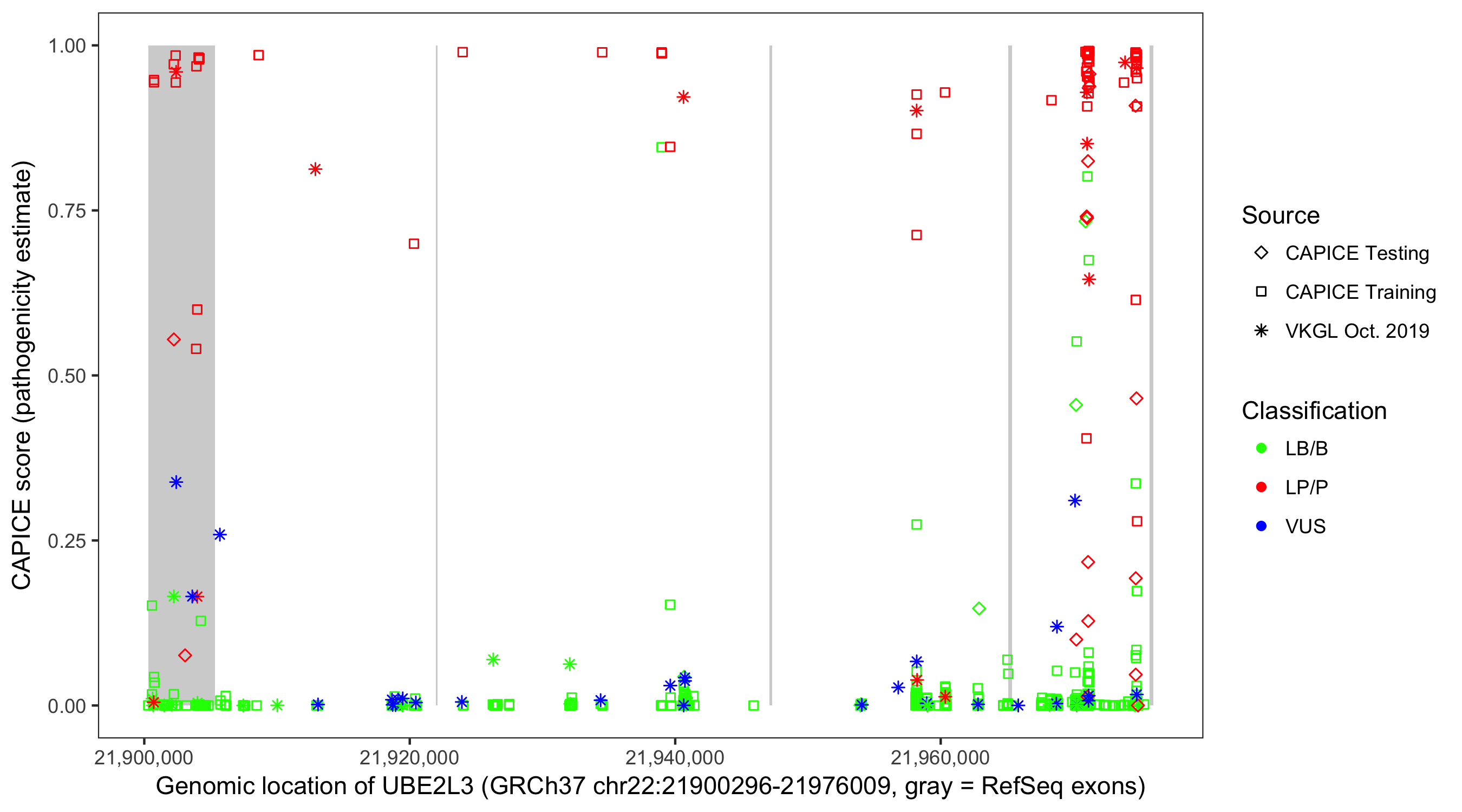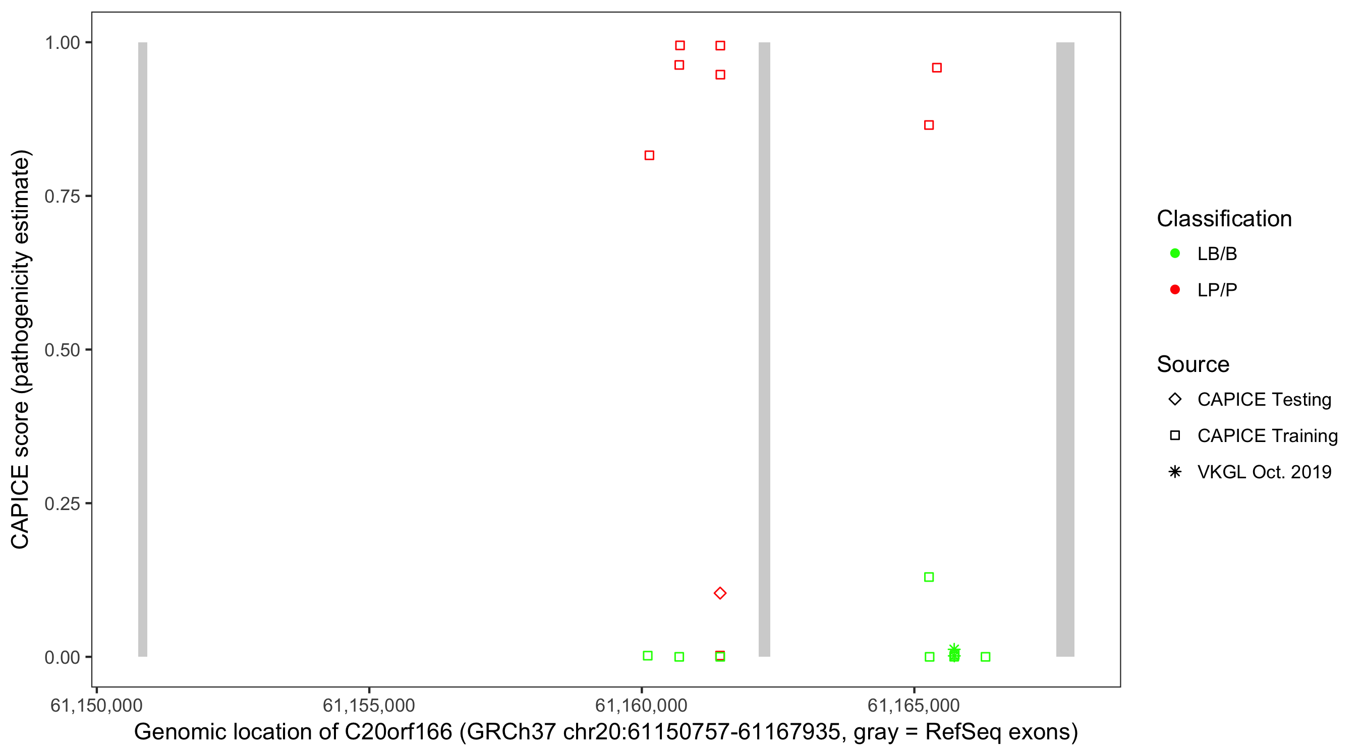 Shown are CAPICE train/test variants plus VKGL Oct 2019.