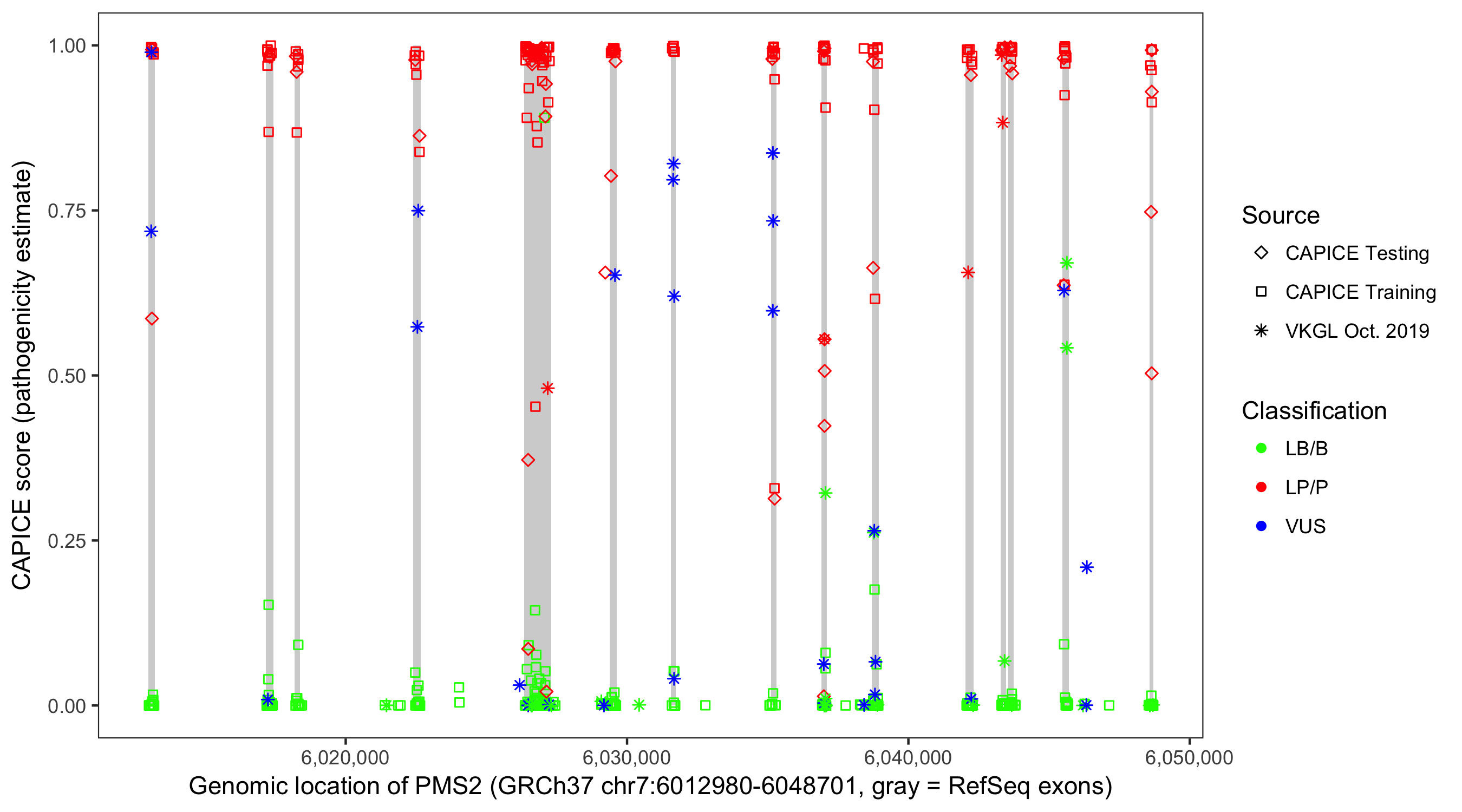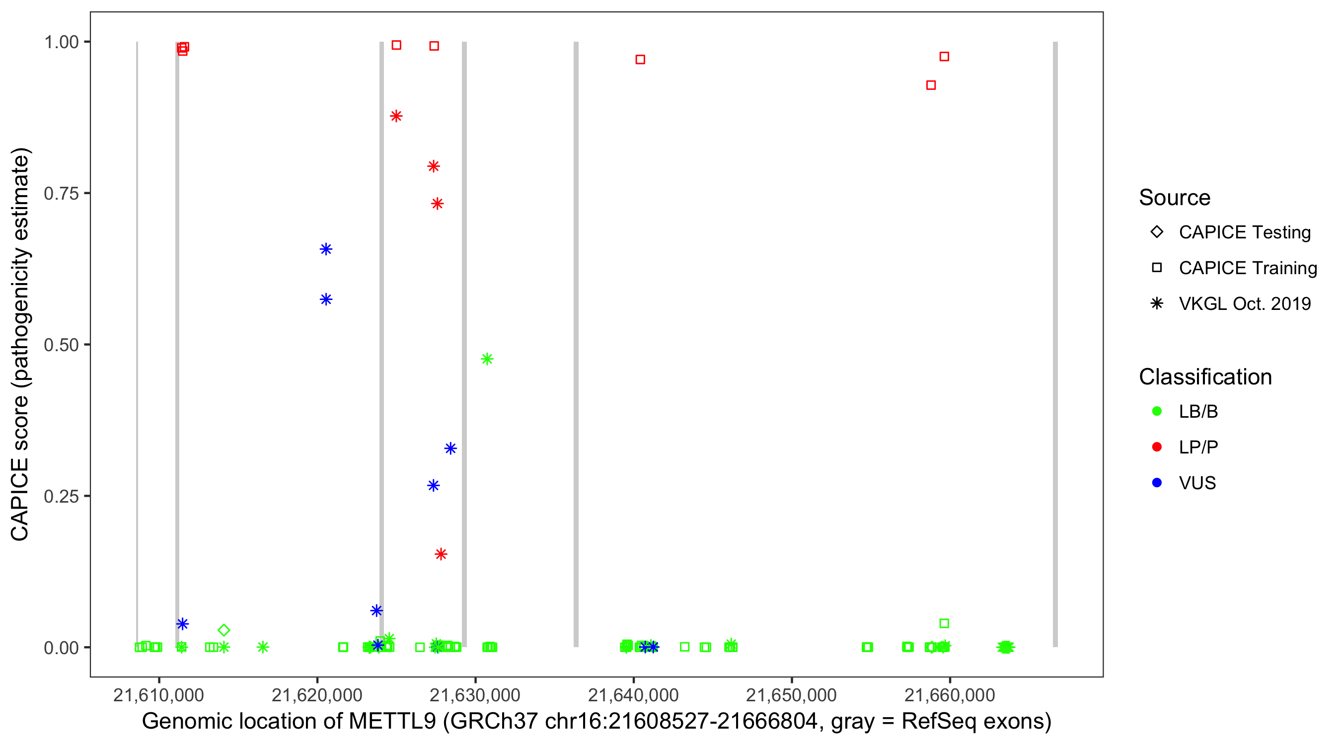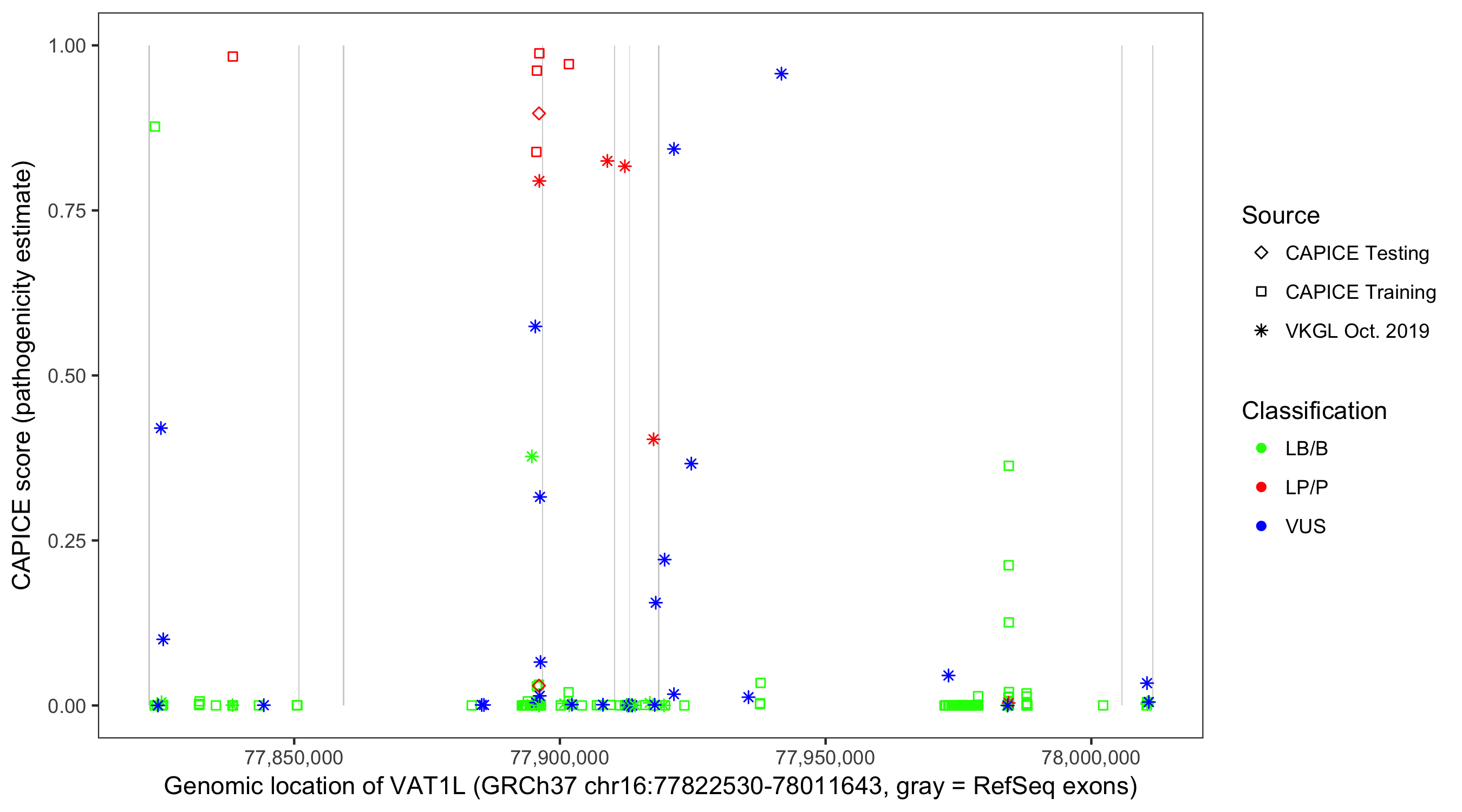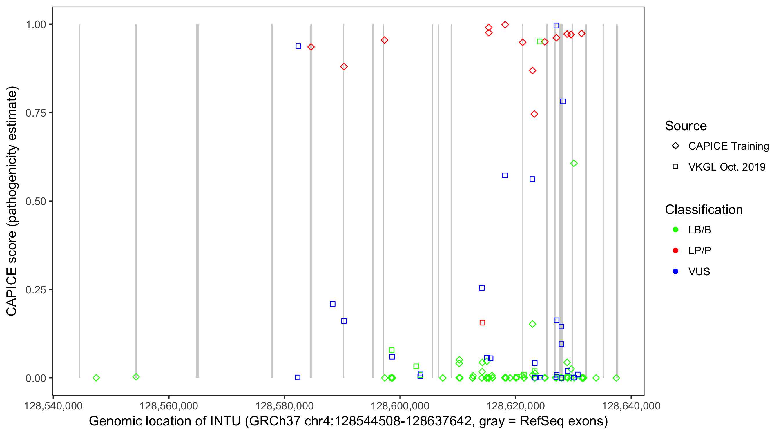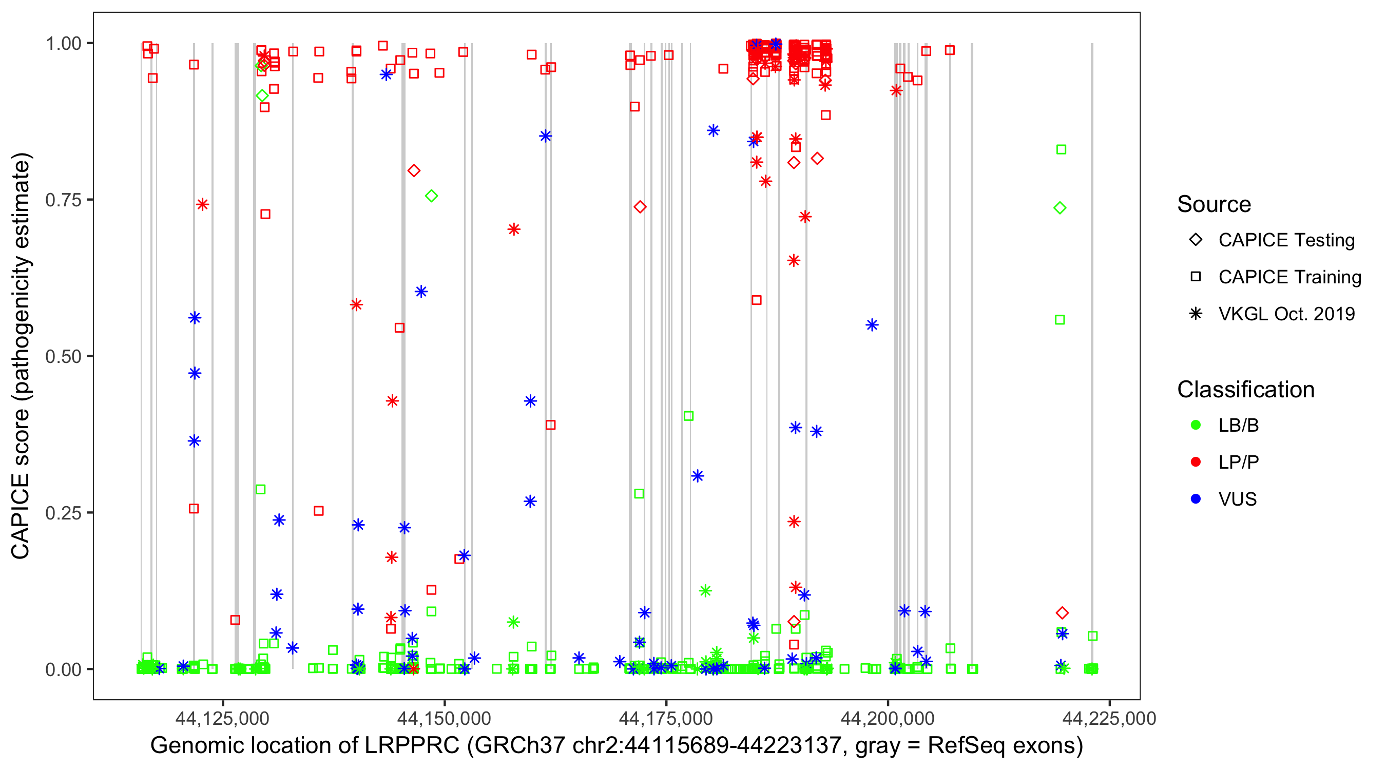 Shown are CAPICE train/test variants plus VKGL Oct 2019.