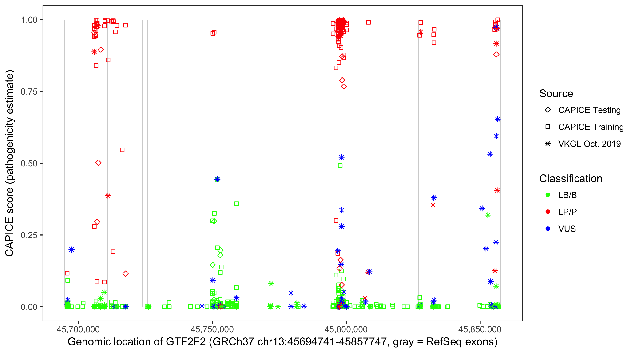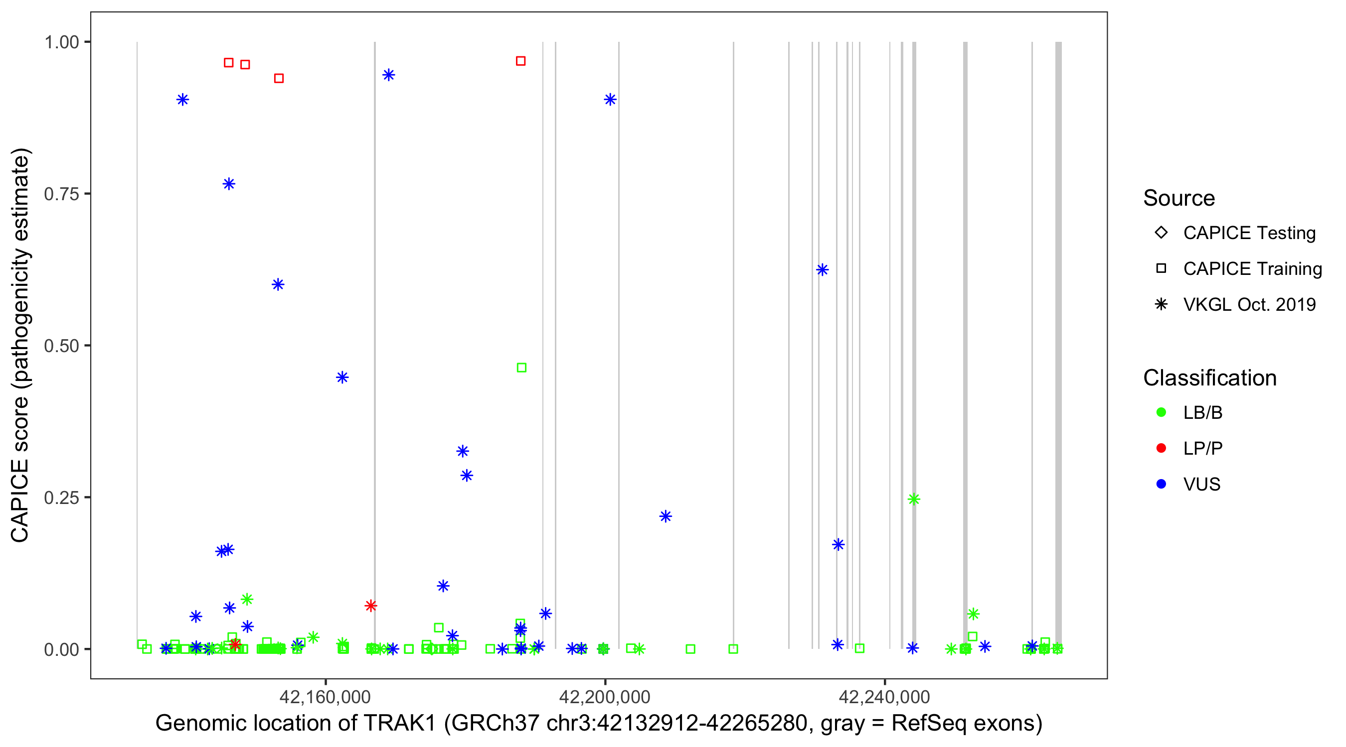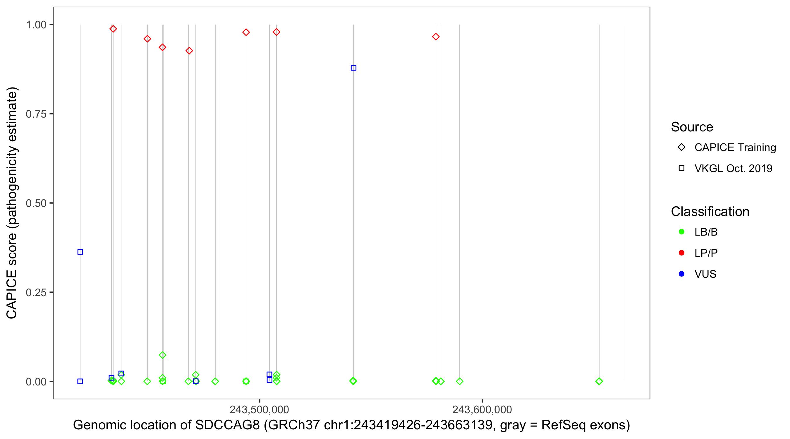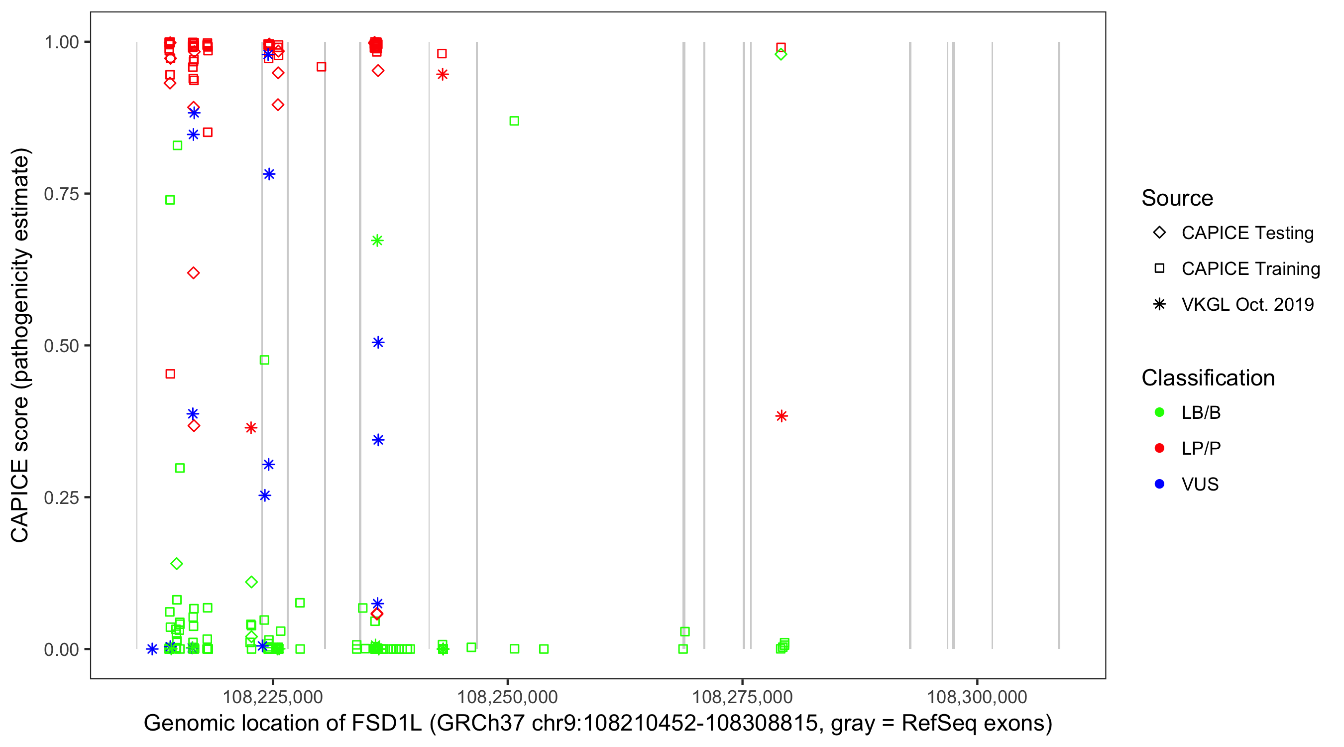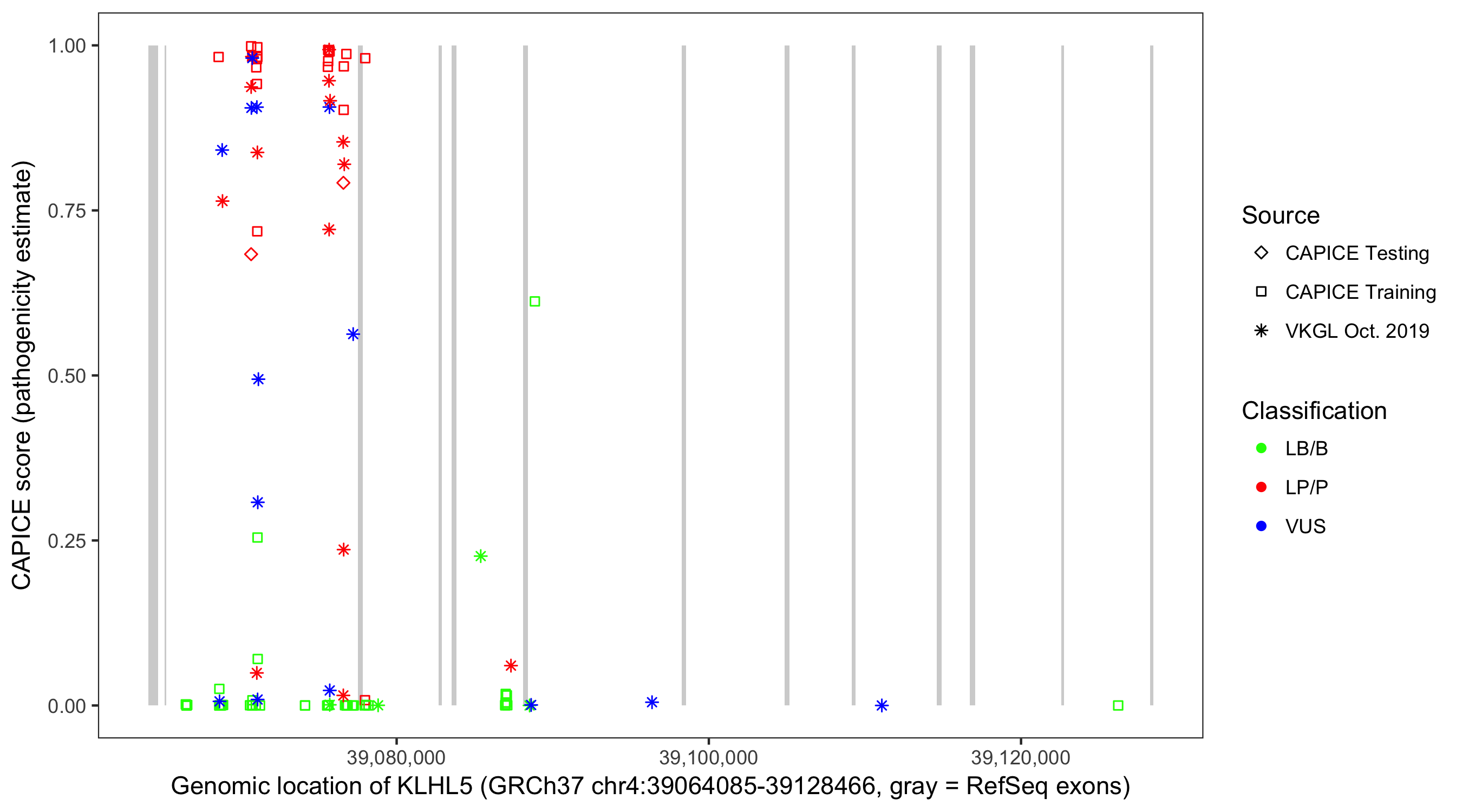 Shown are CAPICE train/test variants plus VKGL Oct 2019.