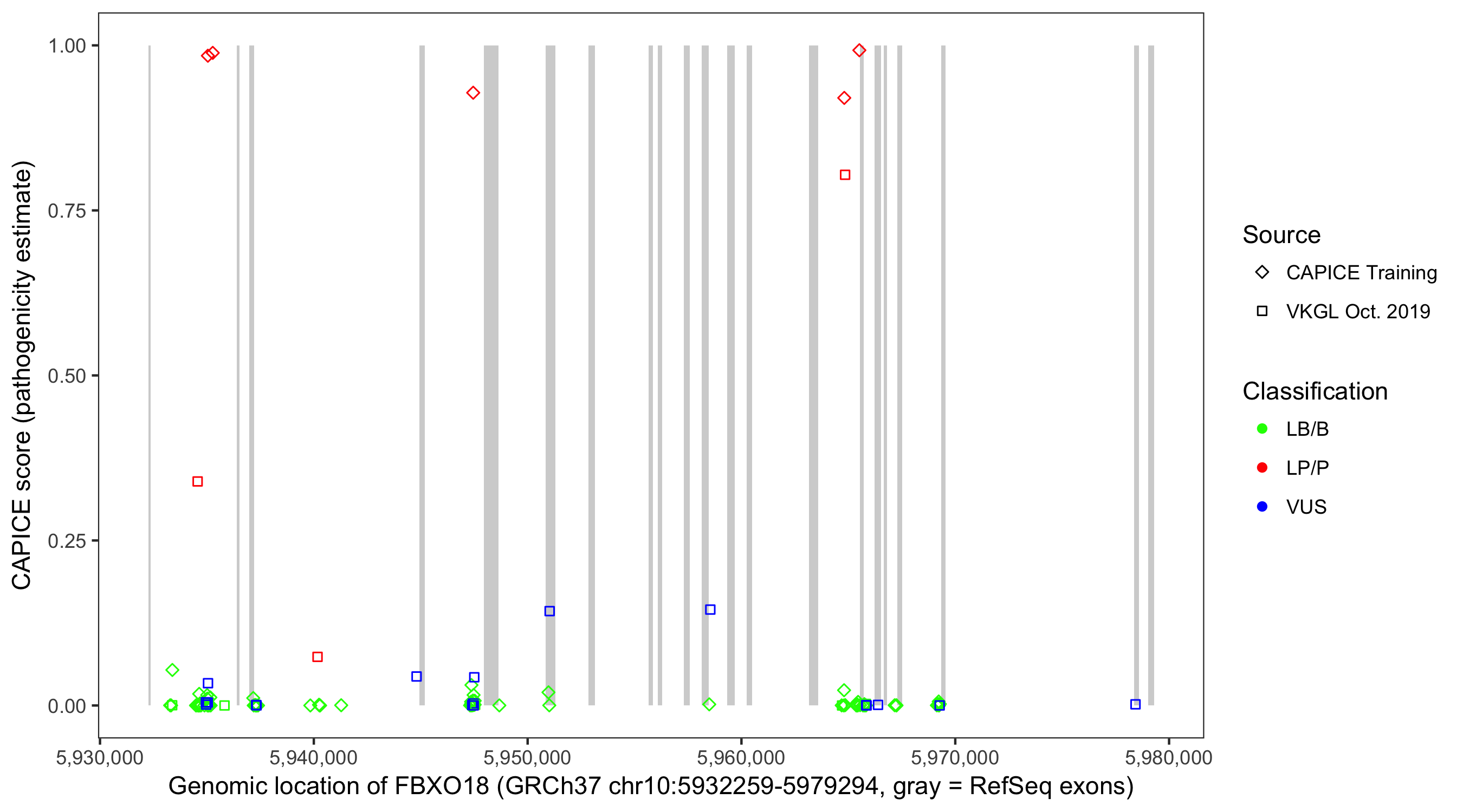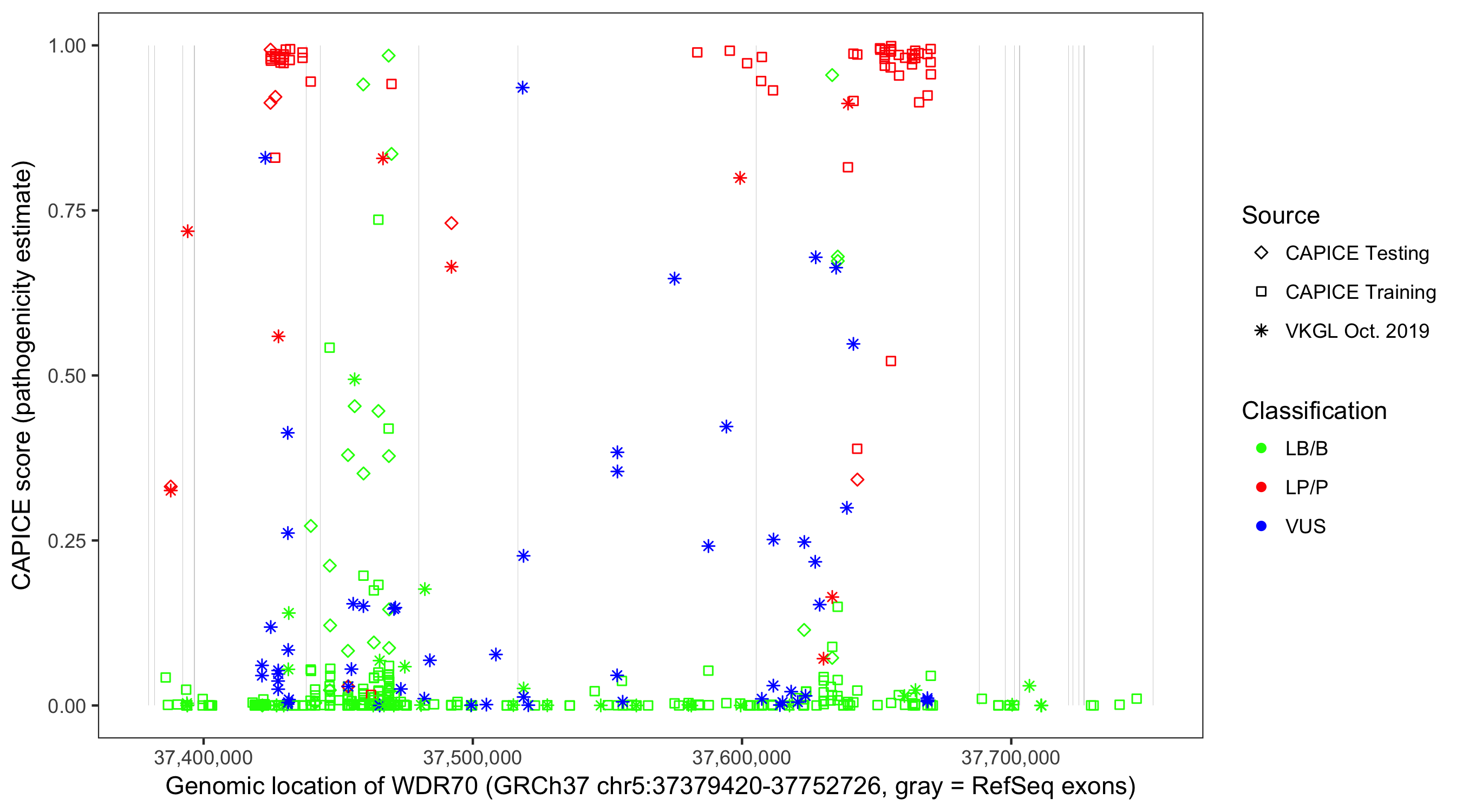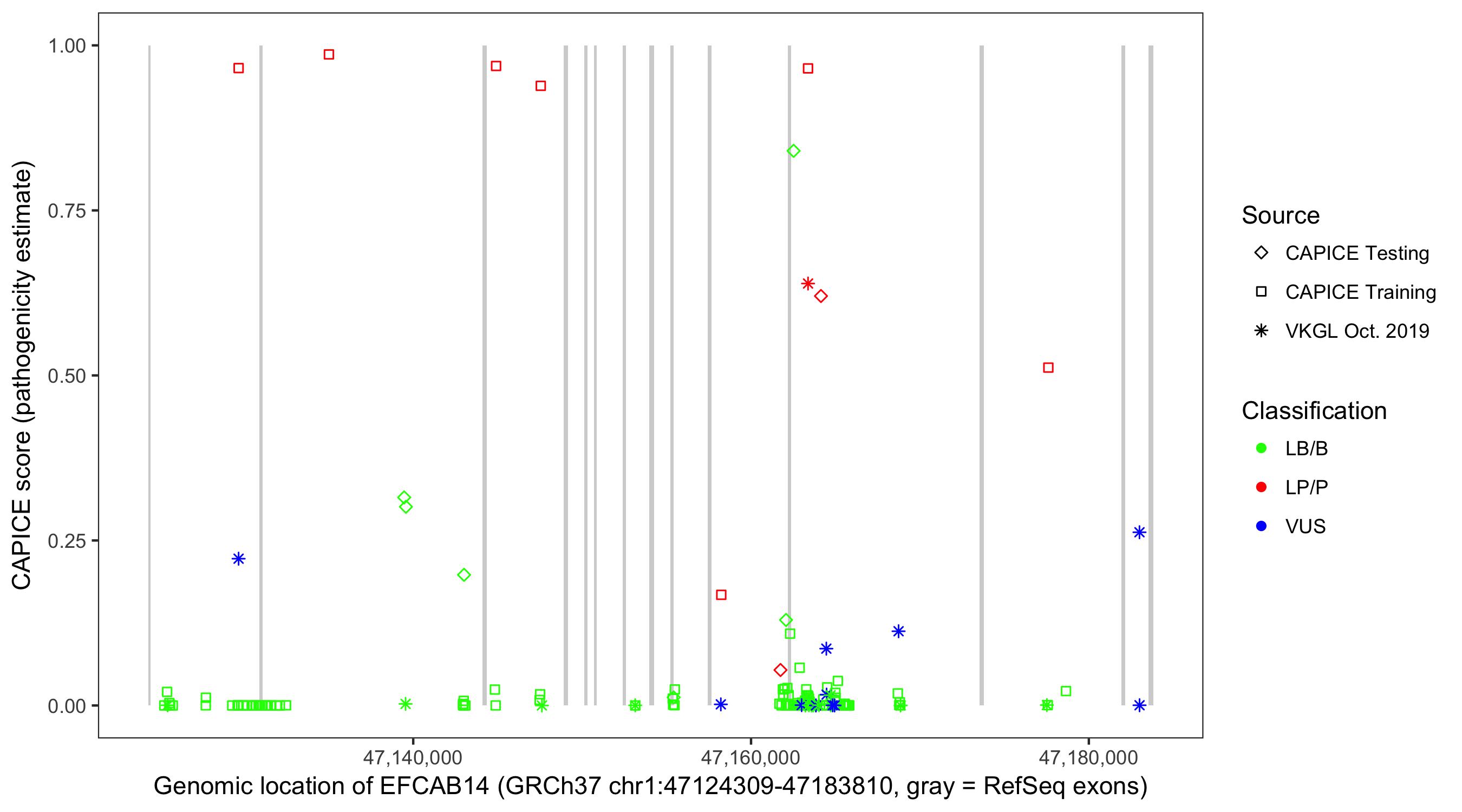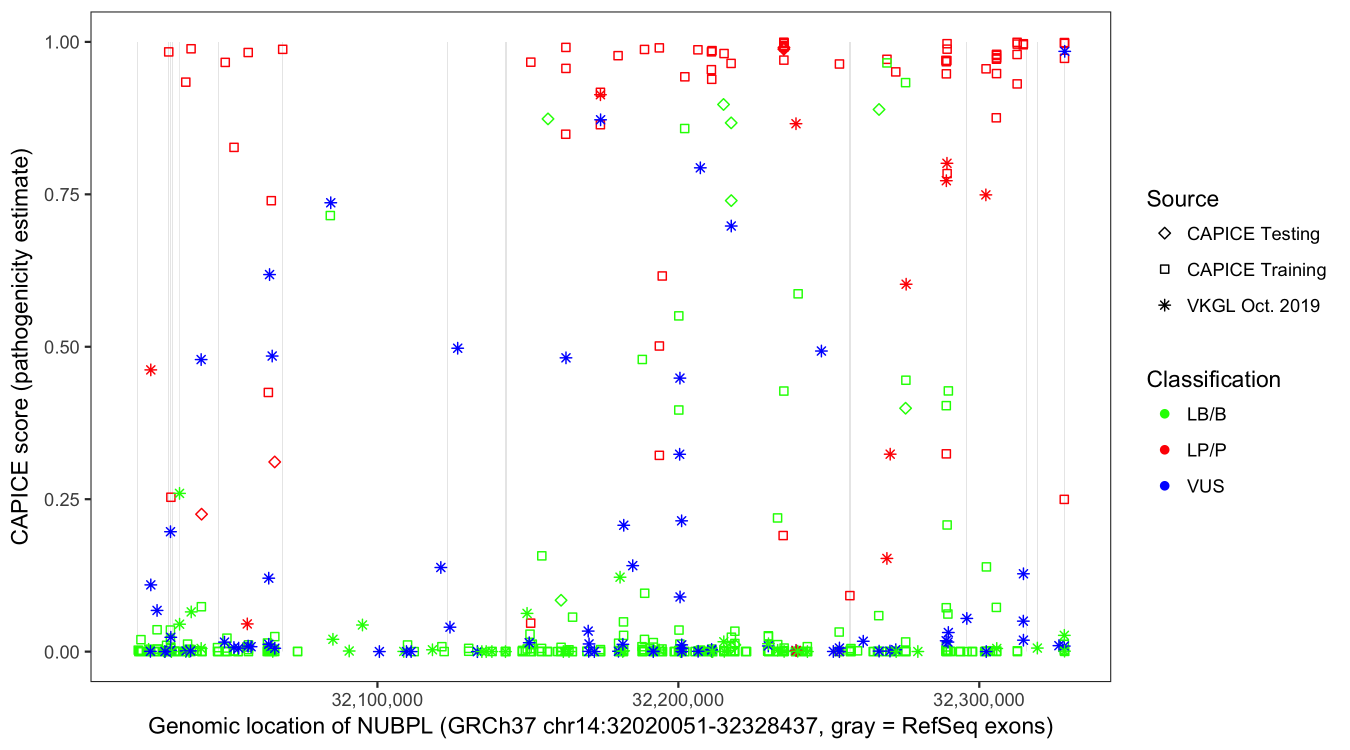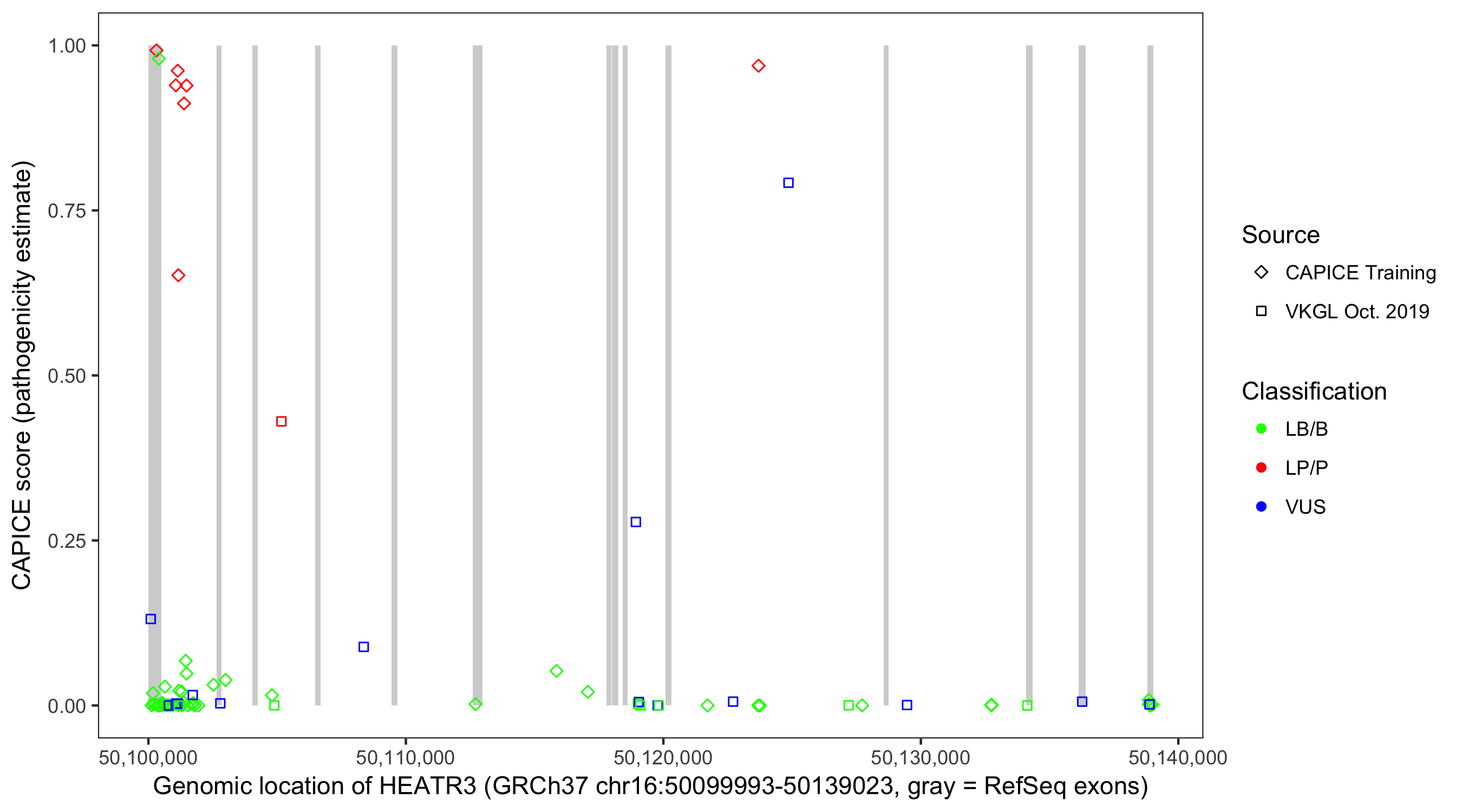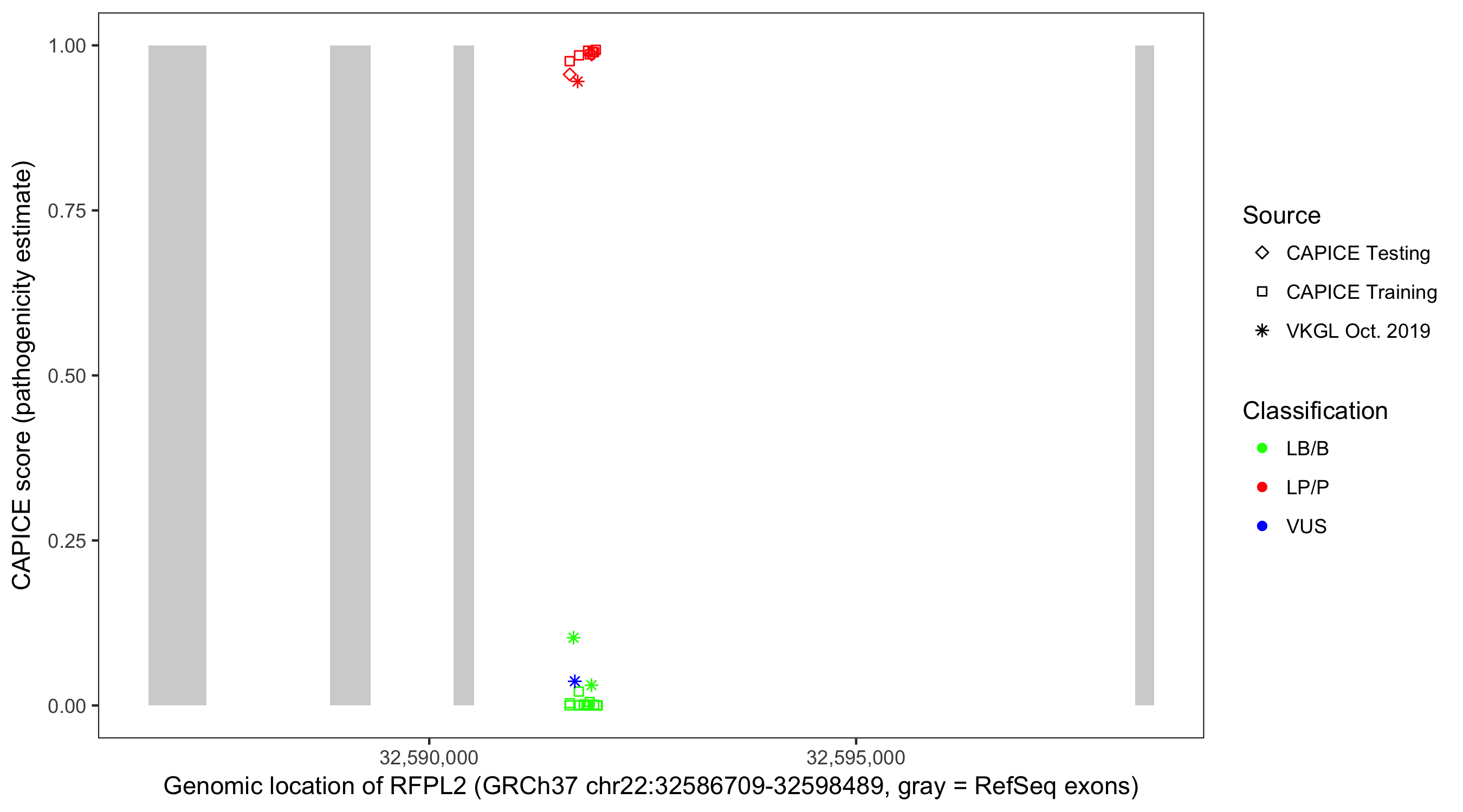 Shown are CAPICE train/test variants plus VKGL Oct 2019.