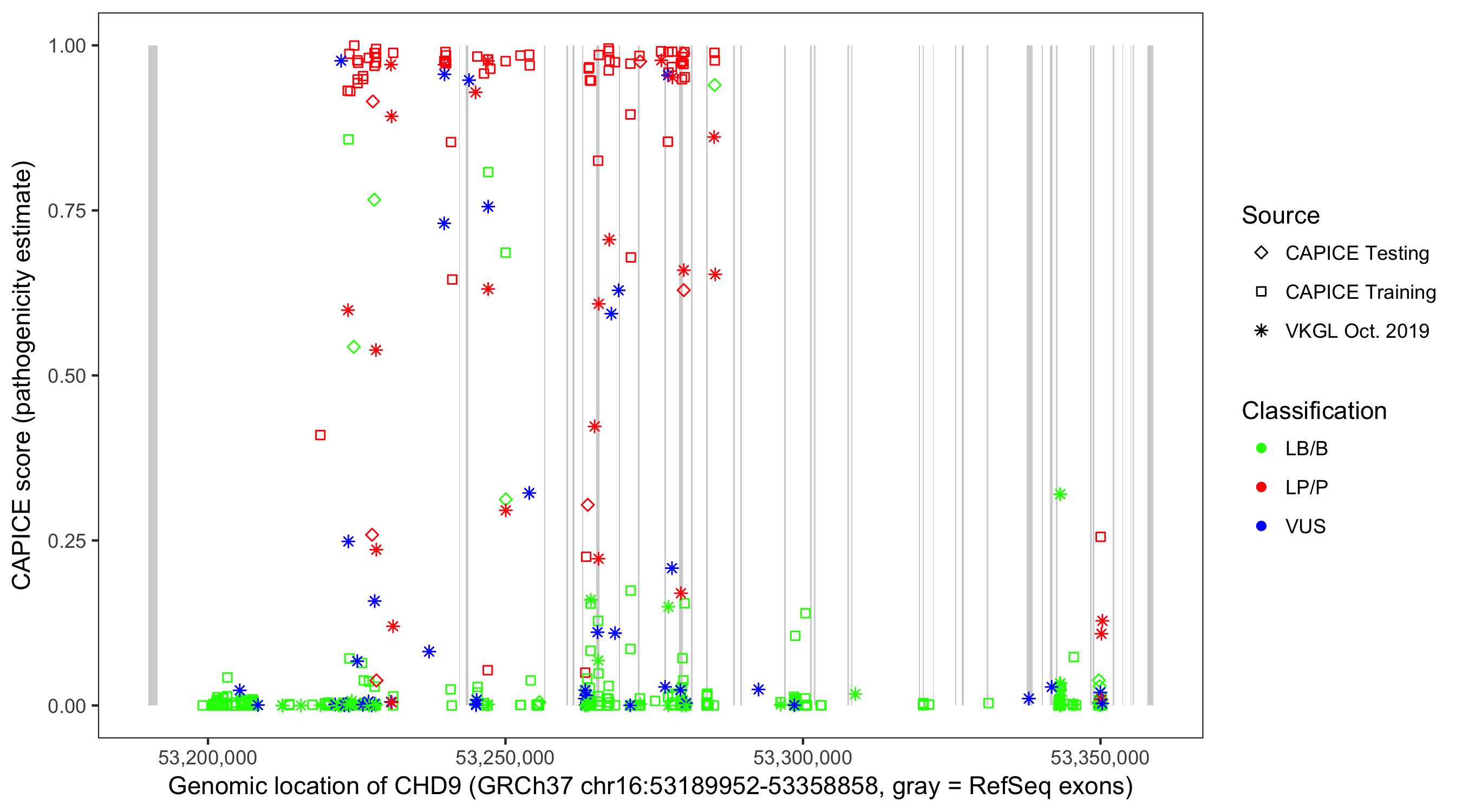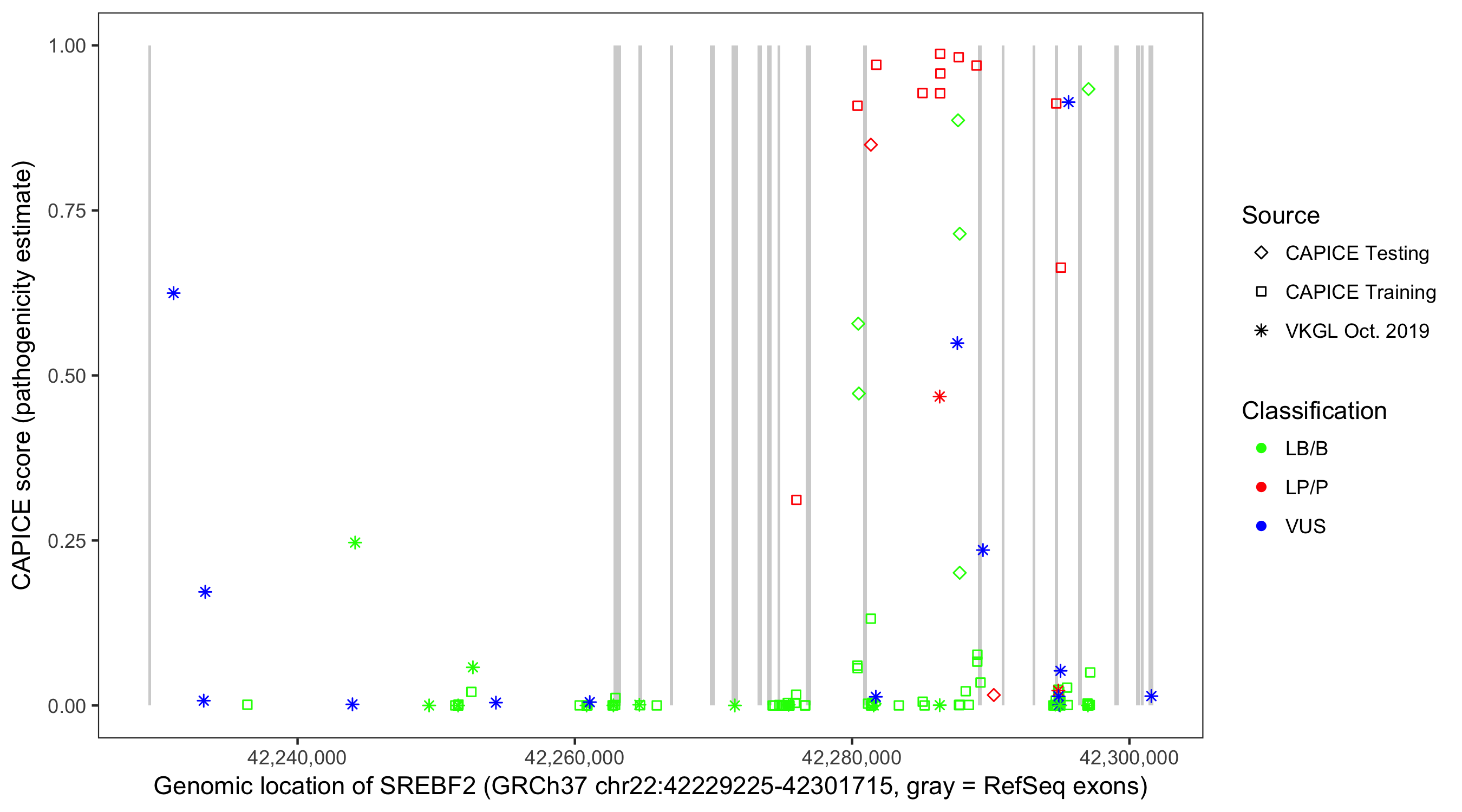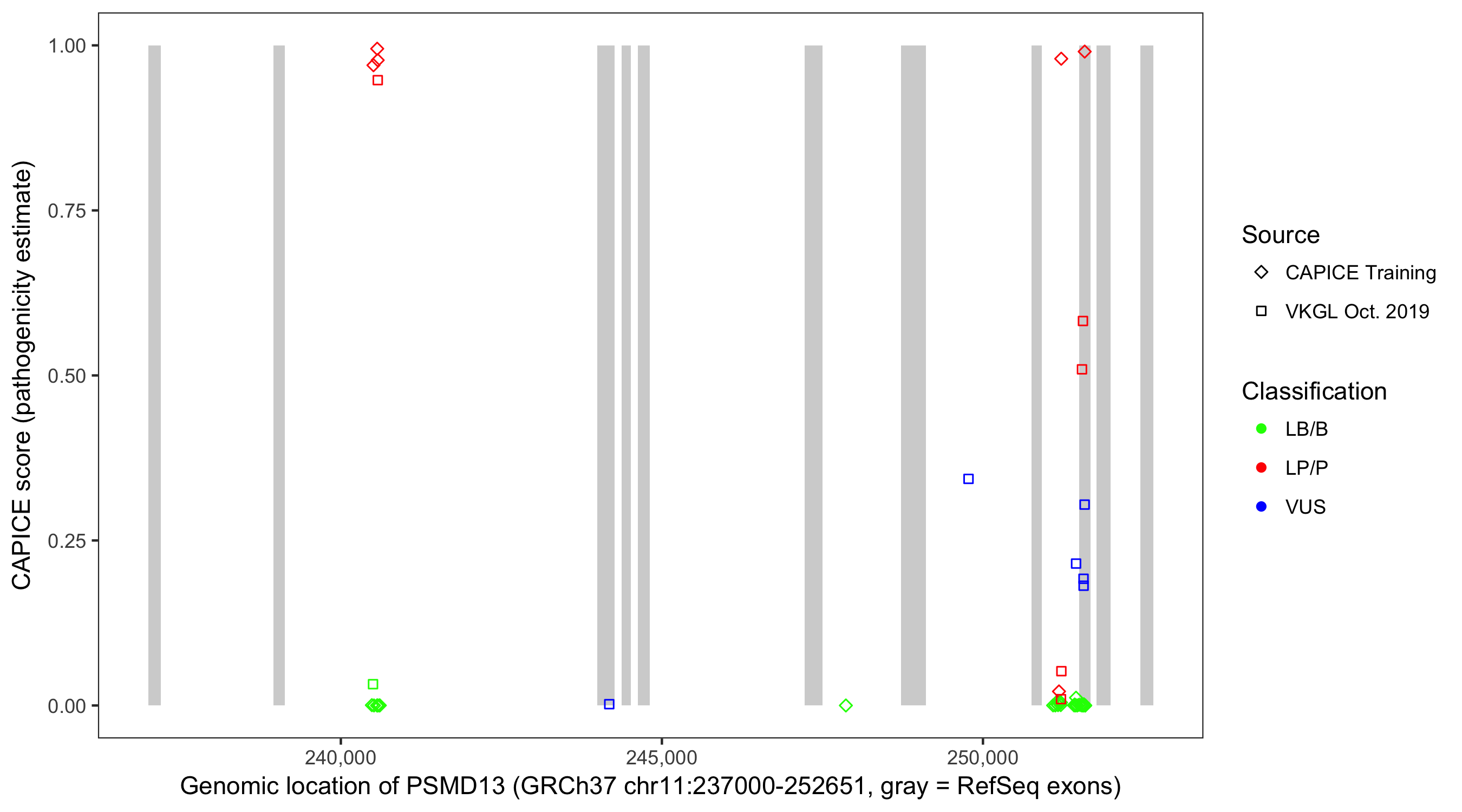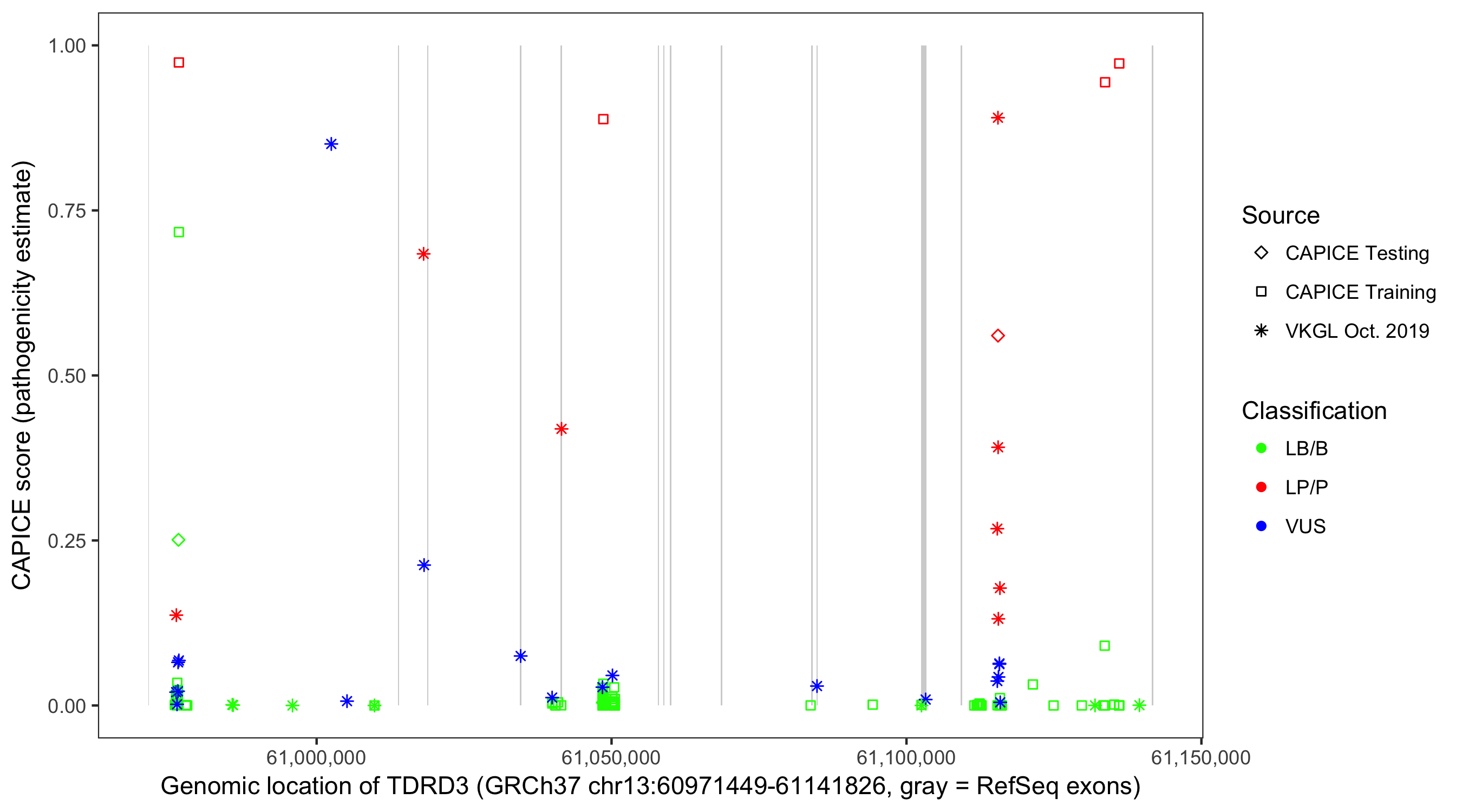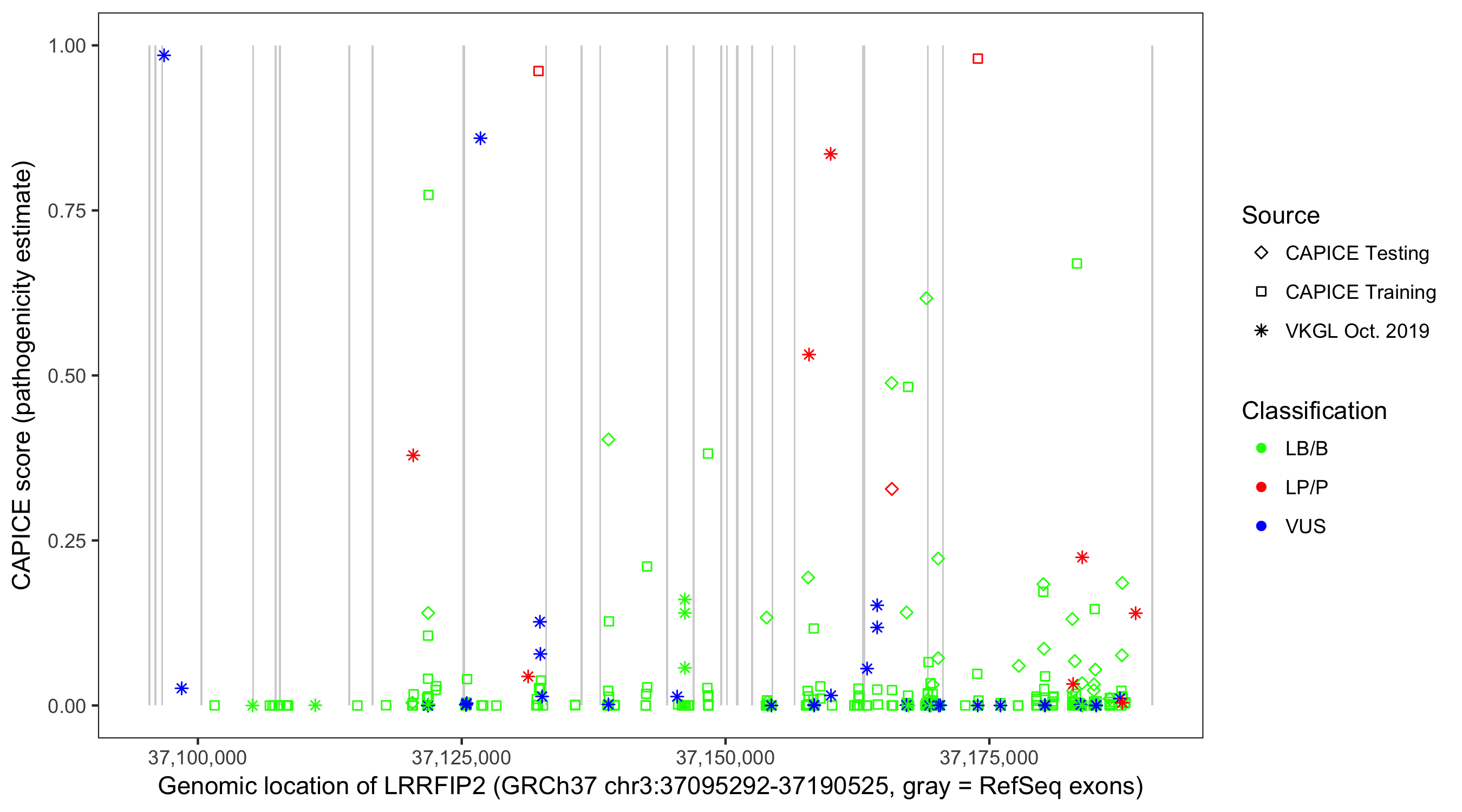 Shown are CAPICE train/test variants plus VKGL Oct 2019.