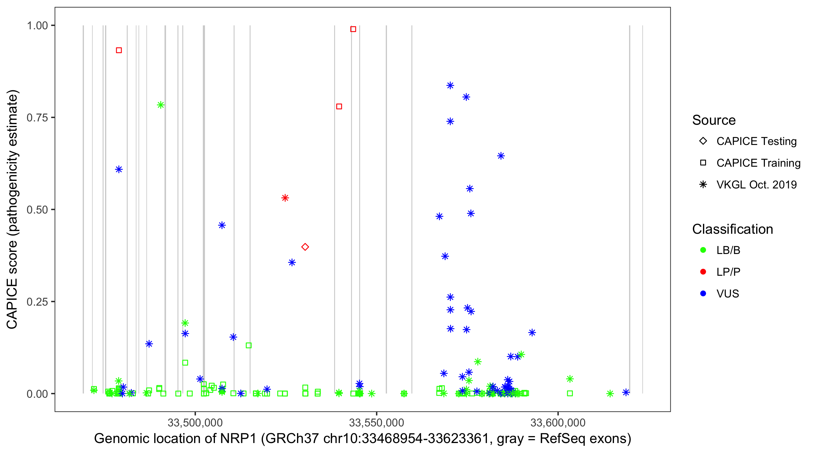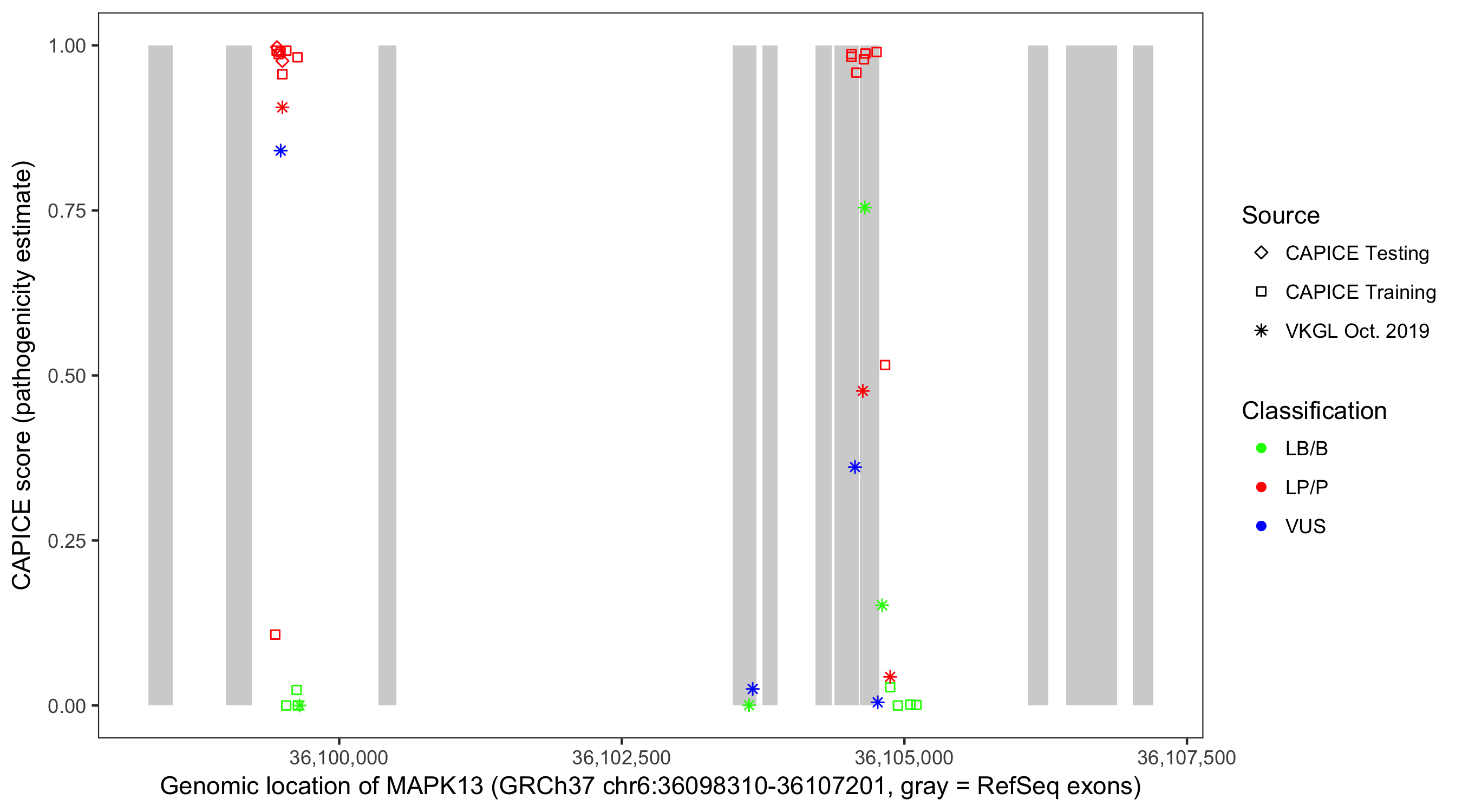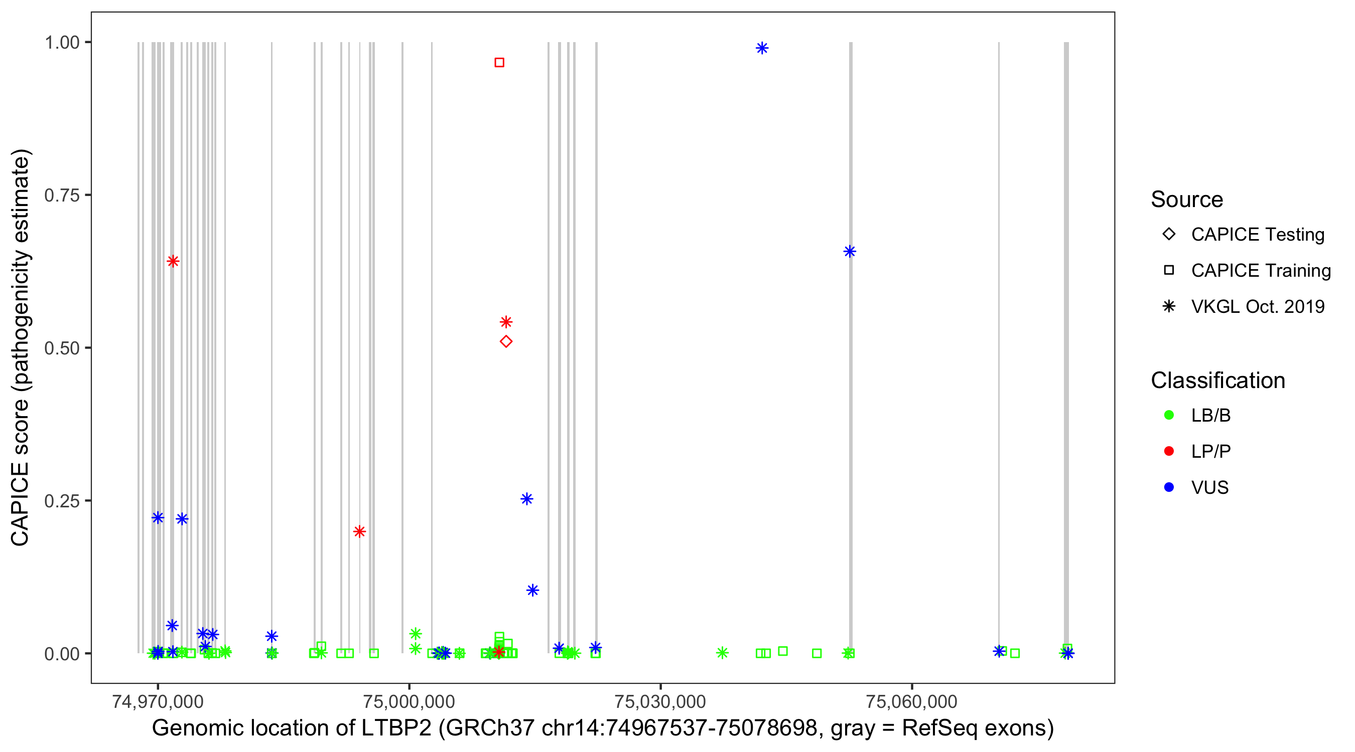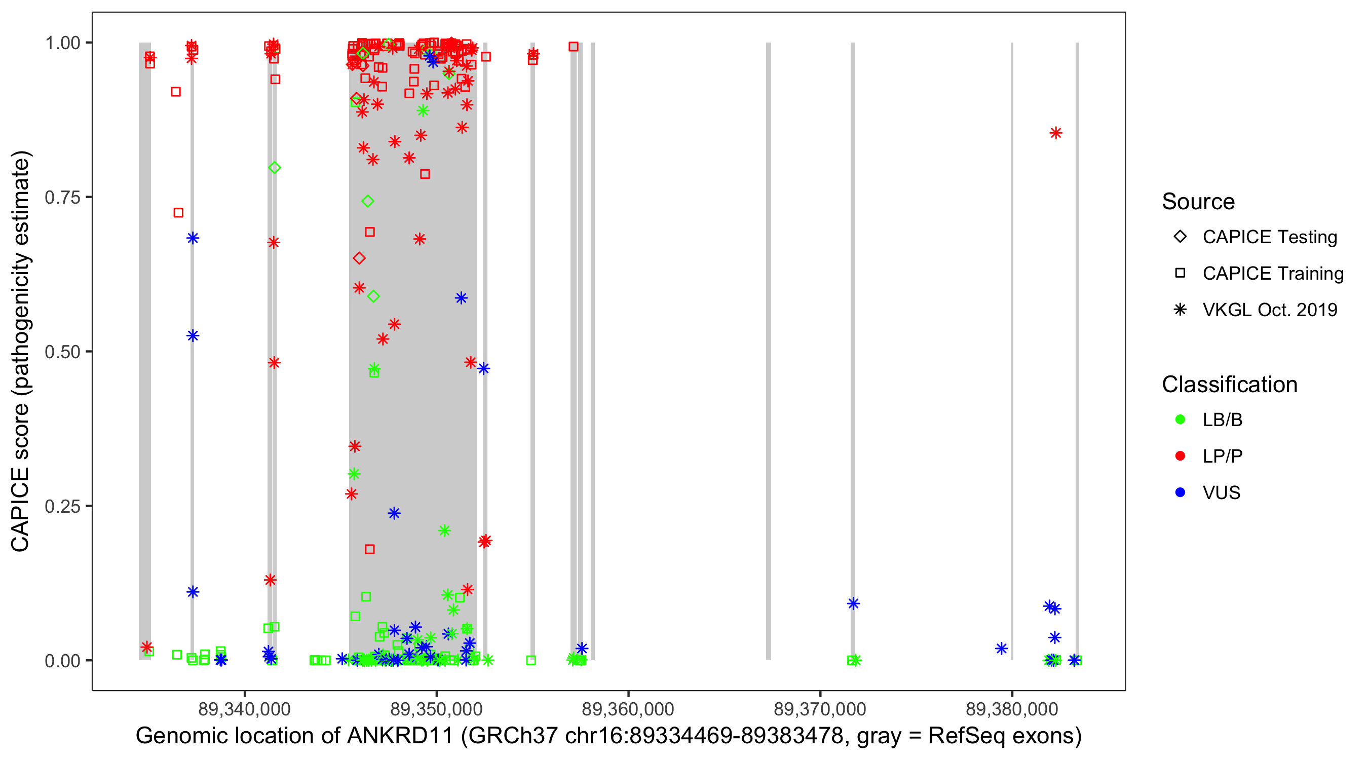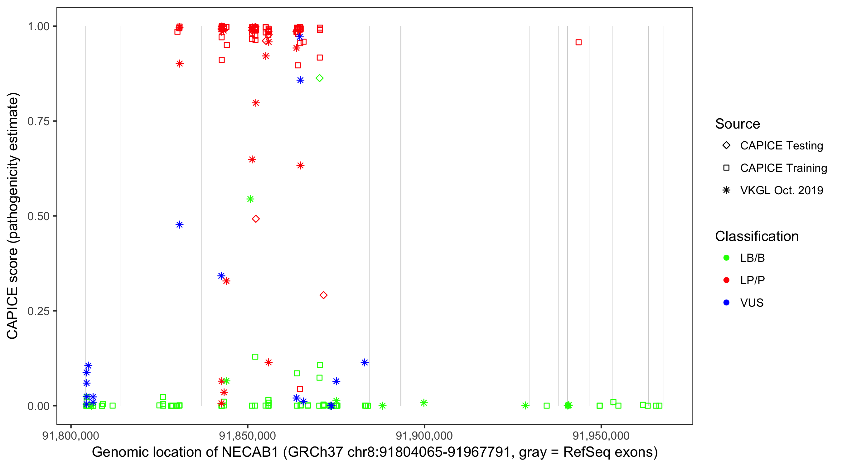 Shown are CAPICE train/test variants plus VKGL Oct 2019.