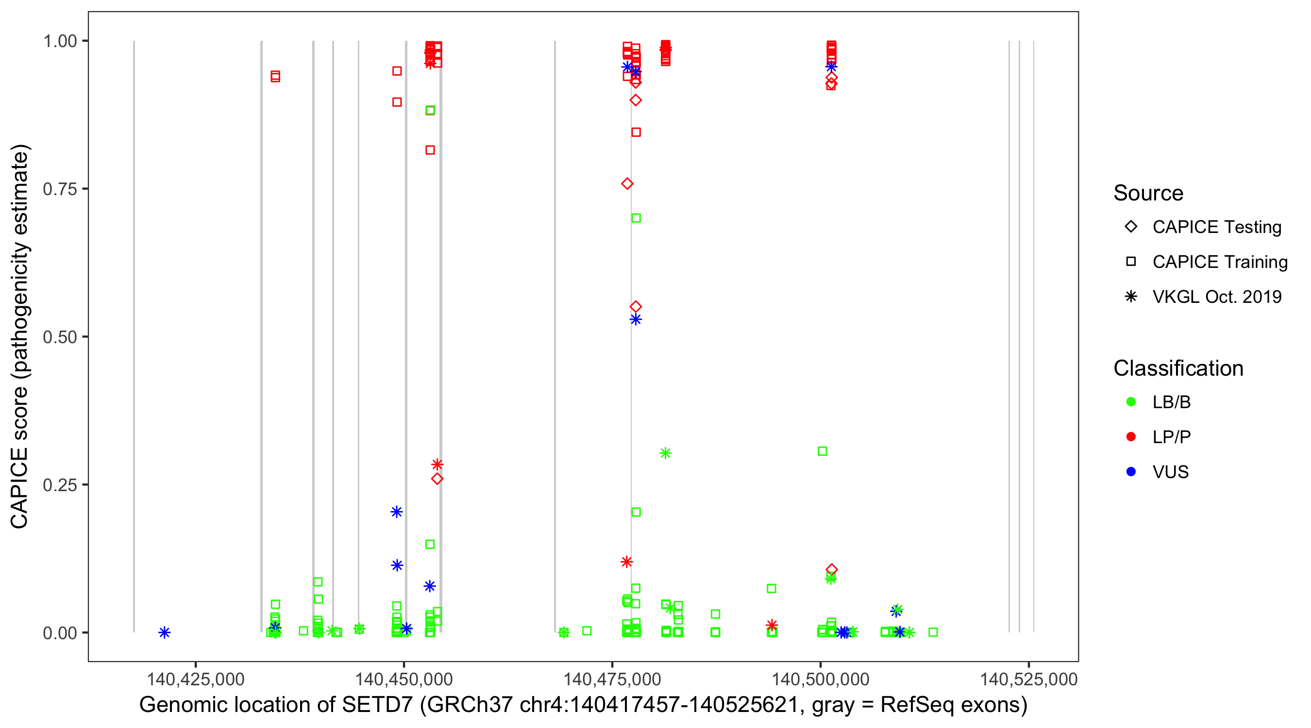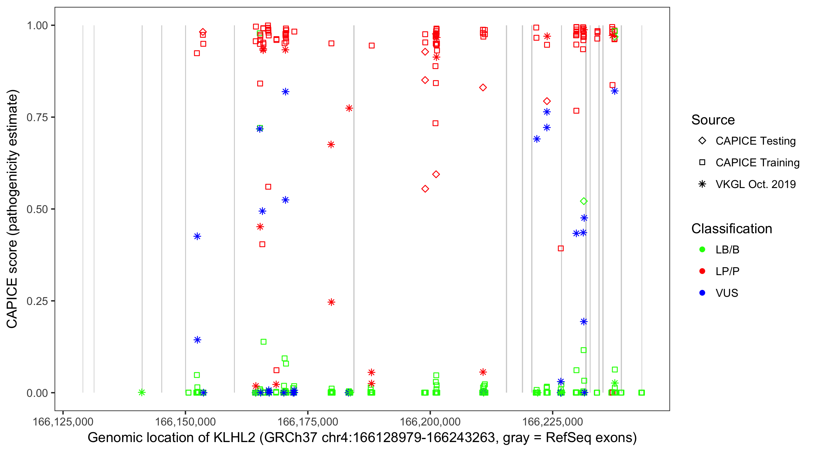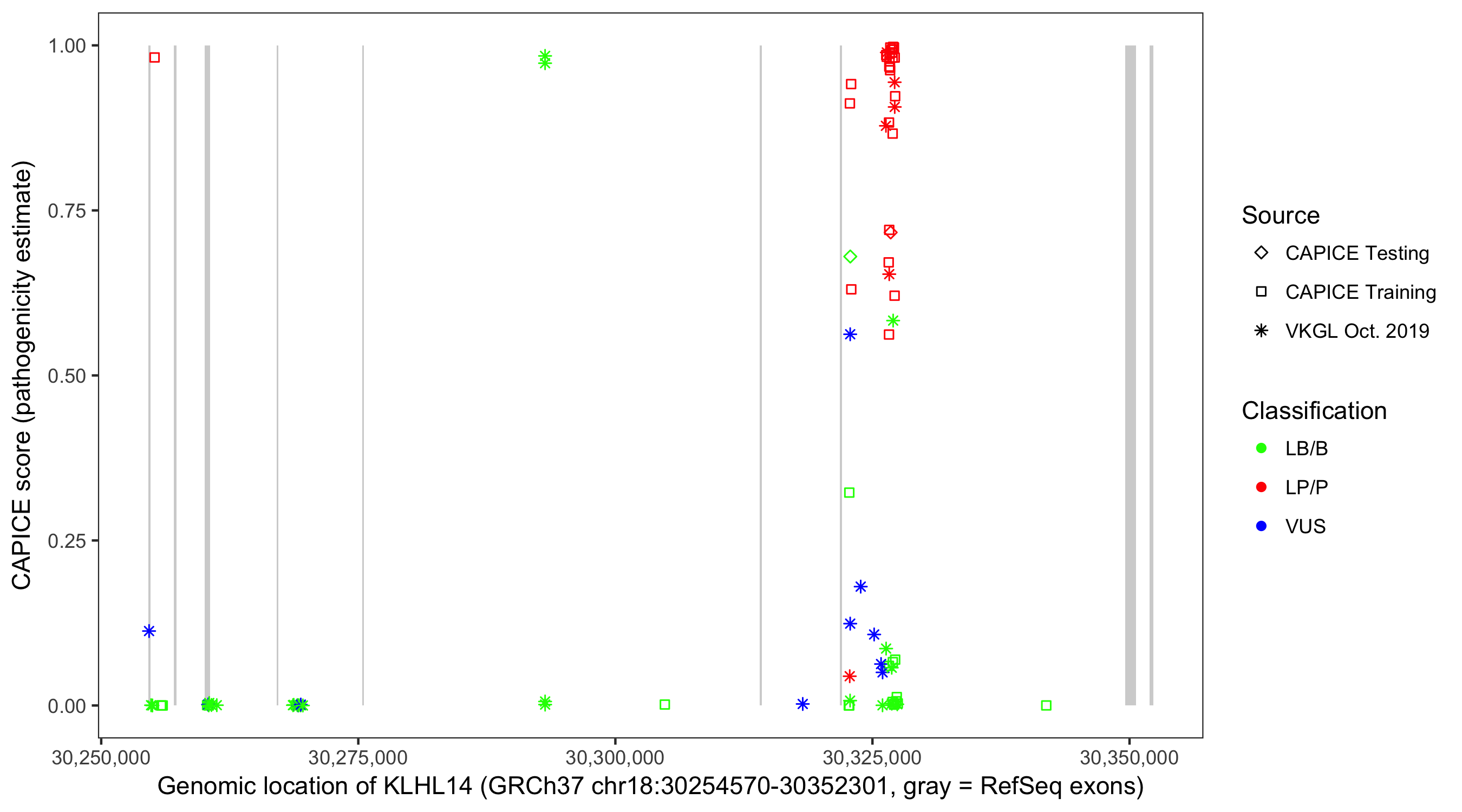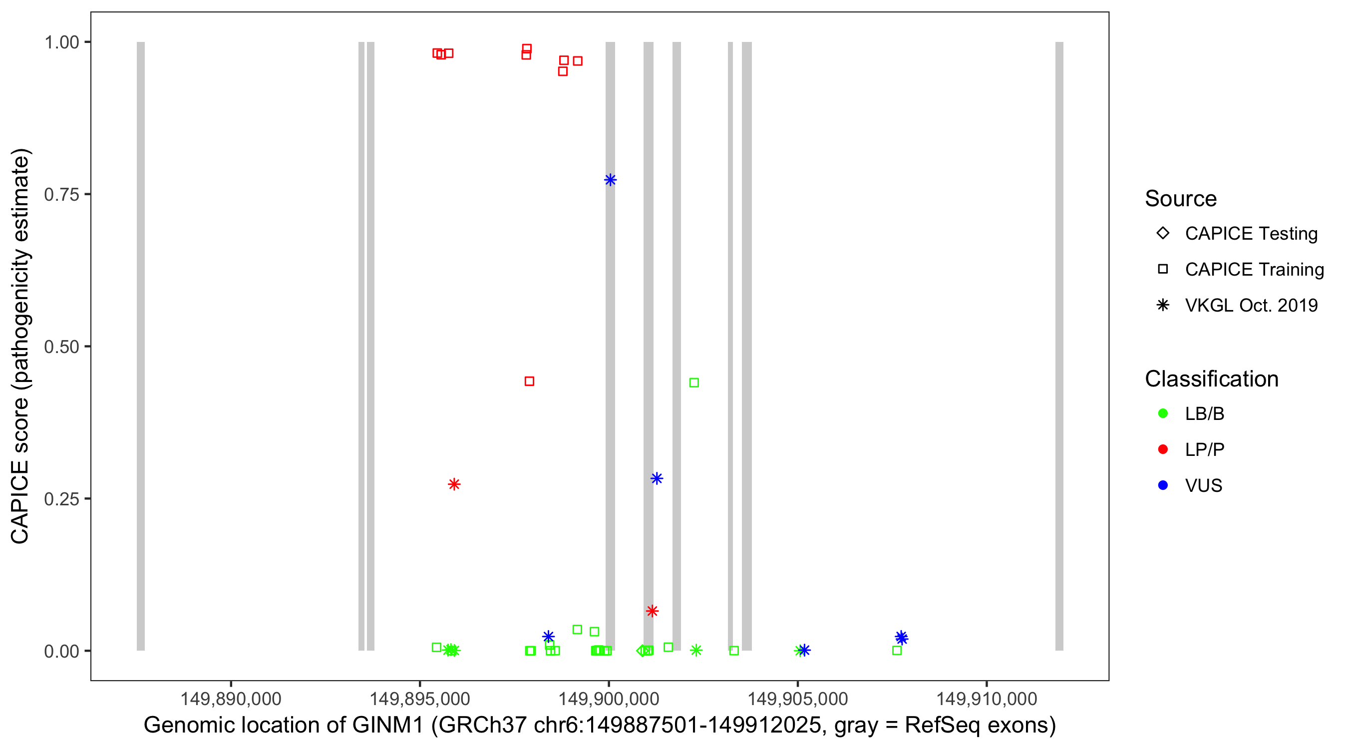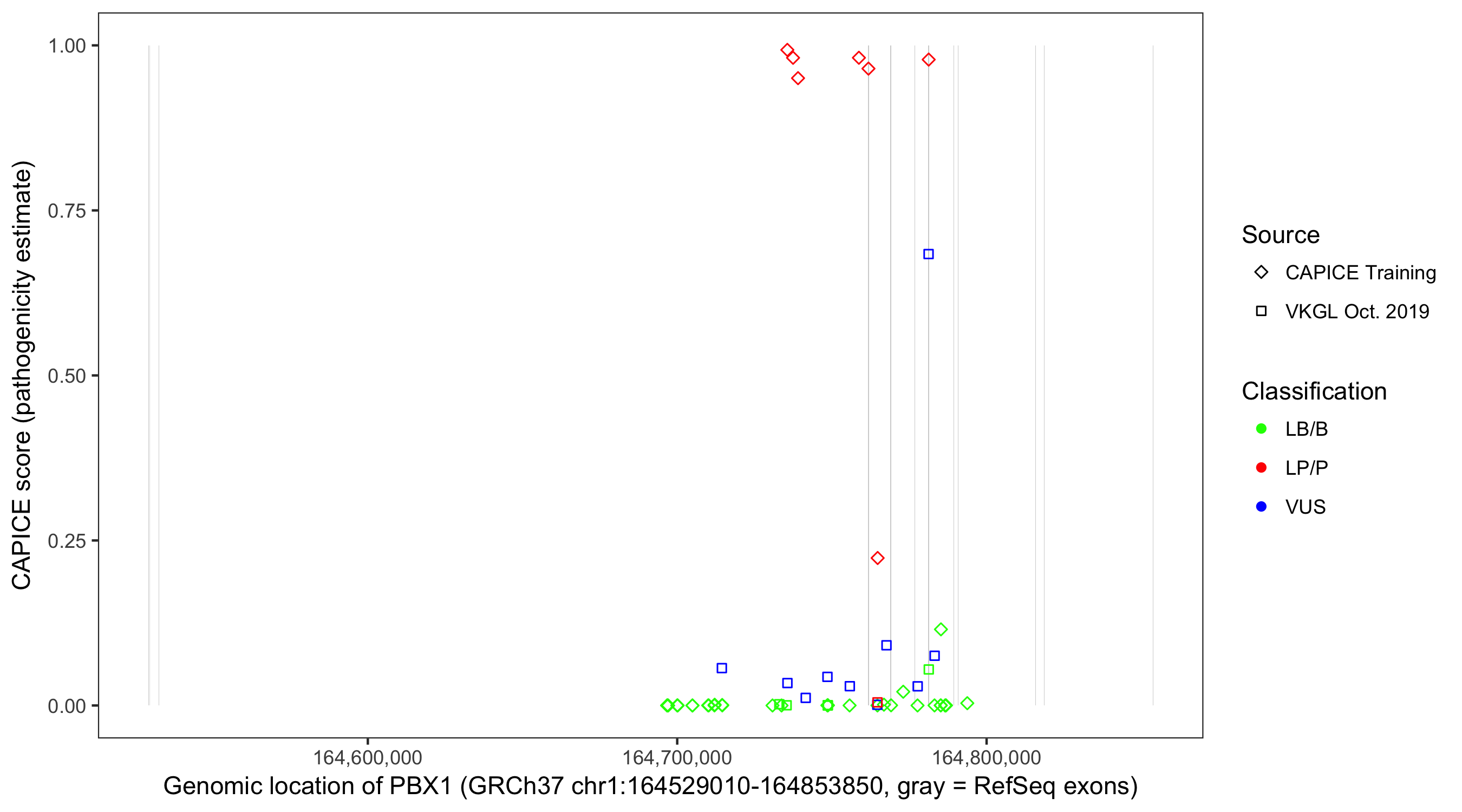 Shown are CAPICE train/test variants plus VKGL Oct 2019.