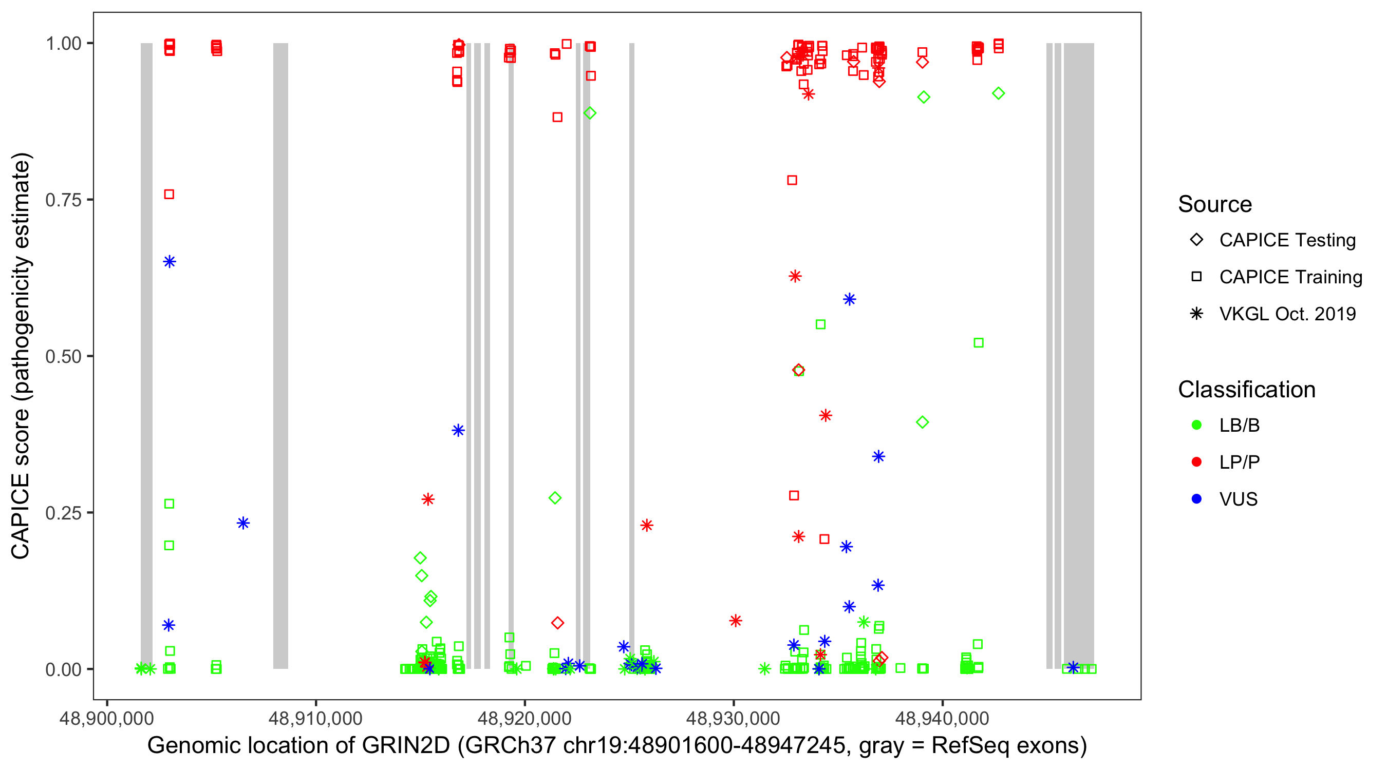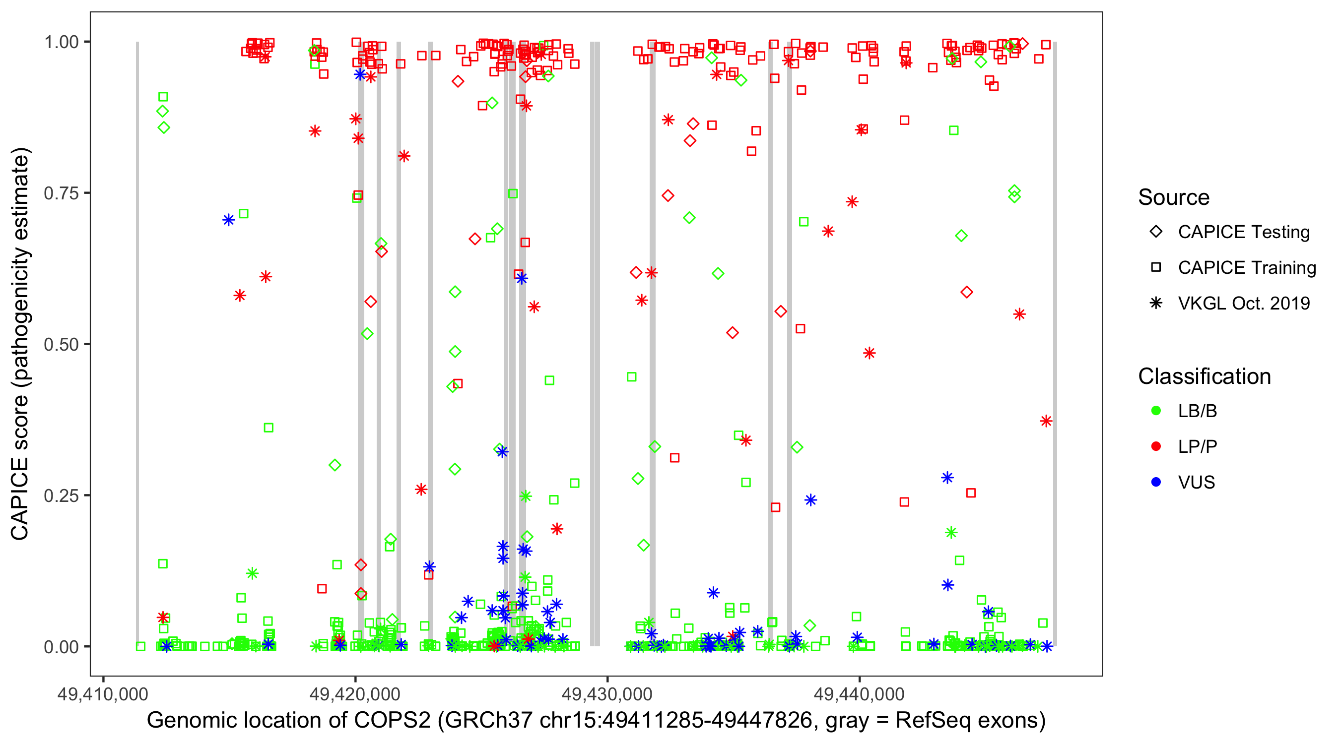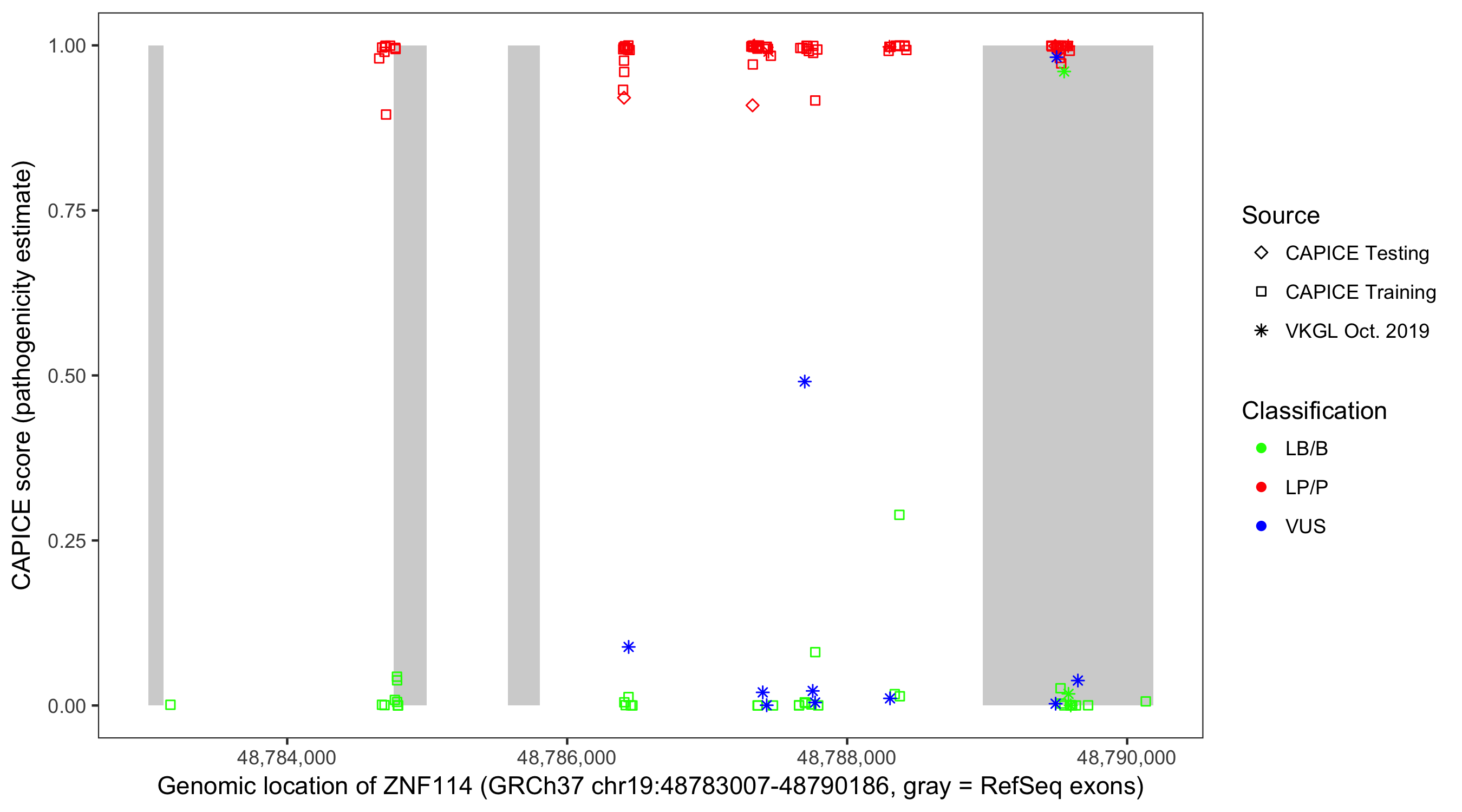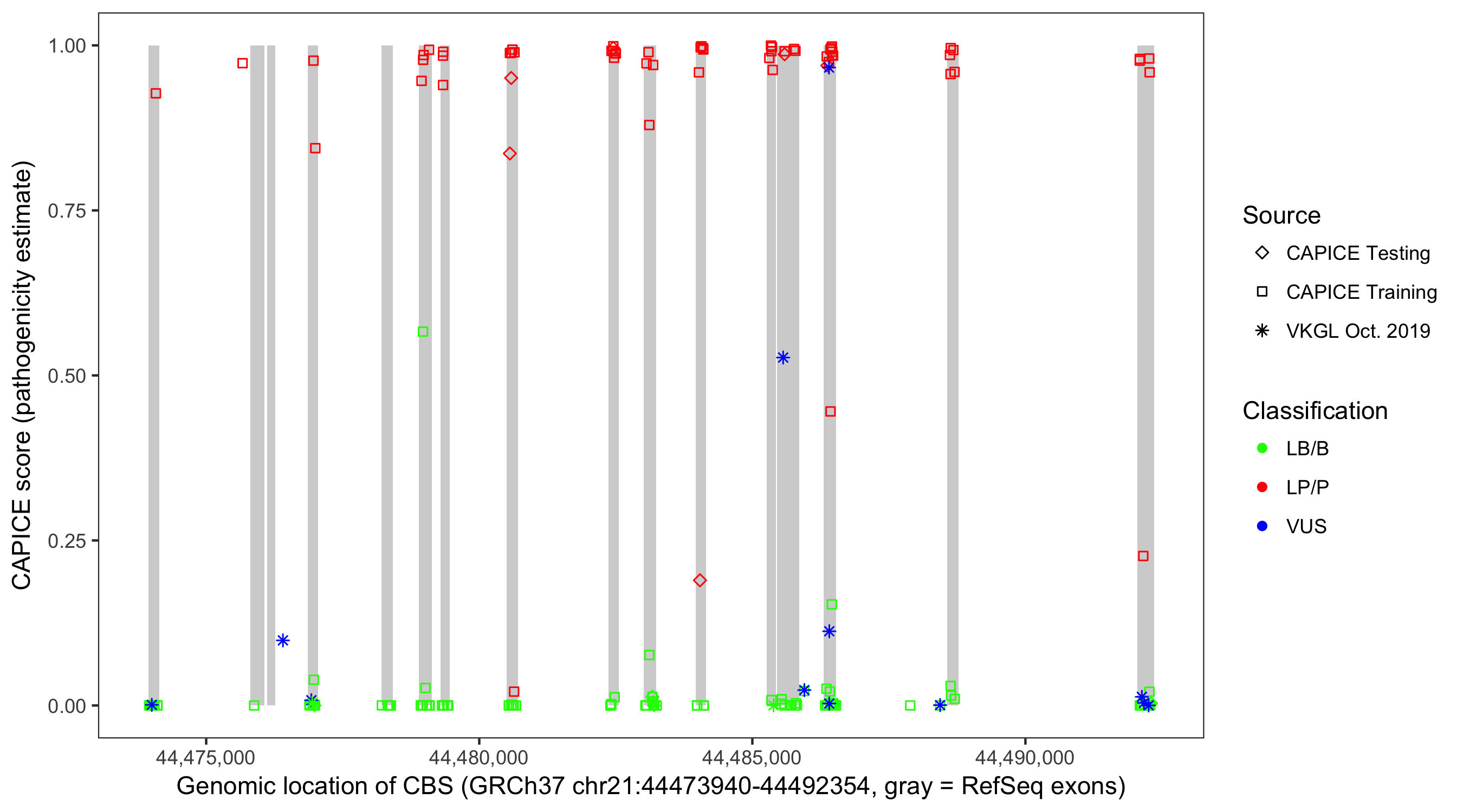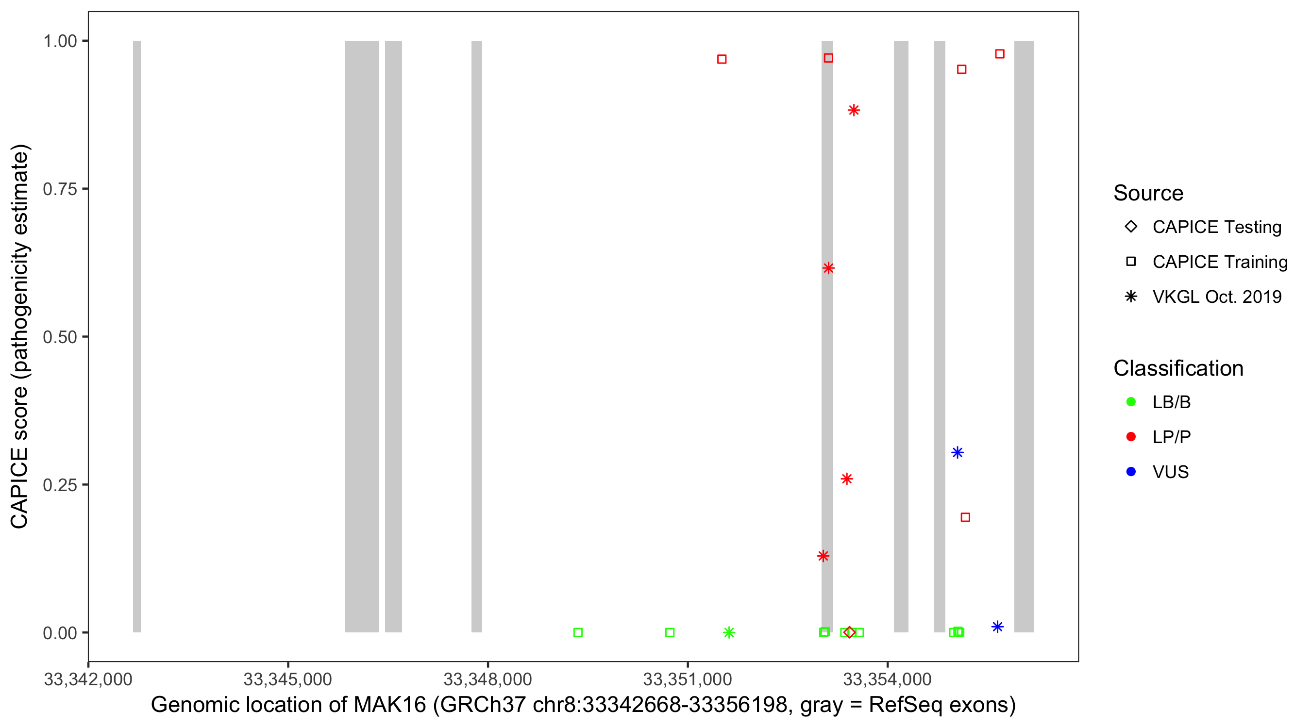 Shown are CAPICE train/test variants plus VKGL Oct 2019.