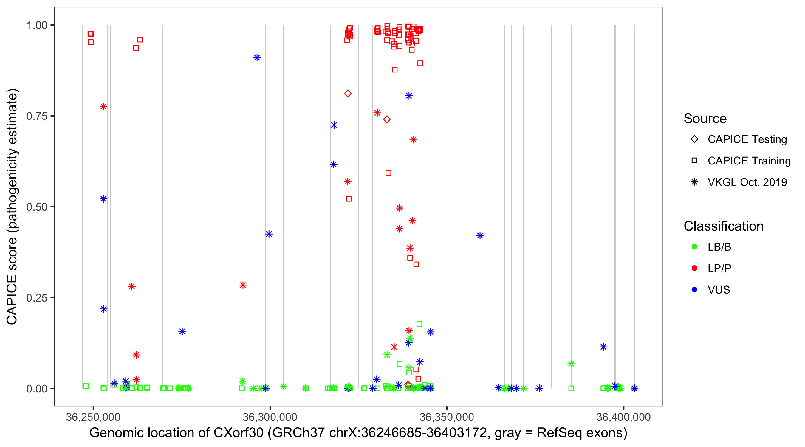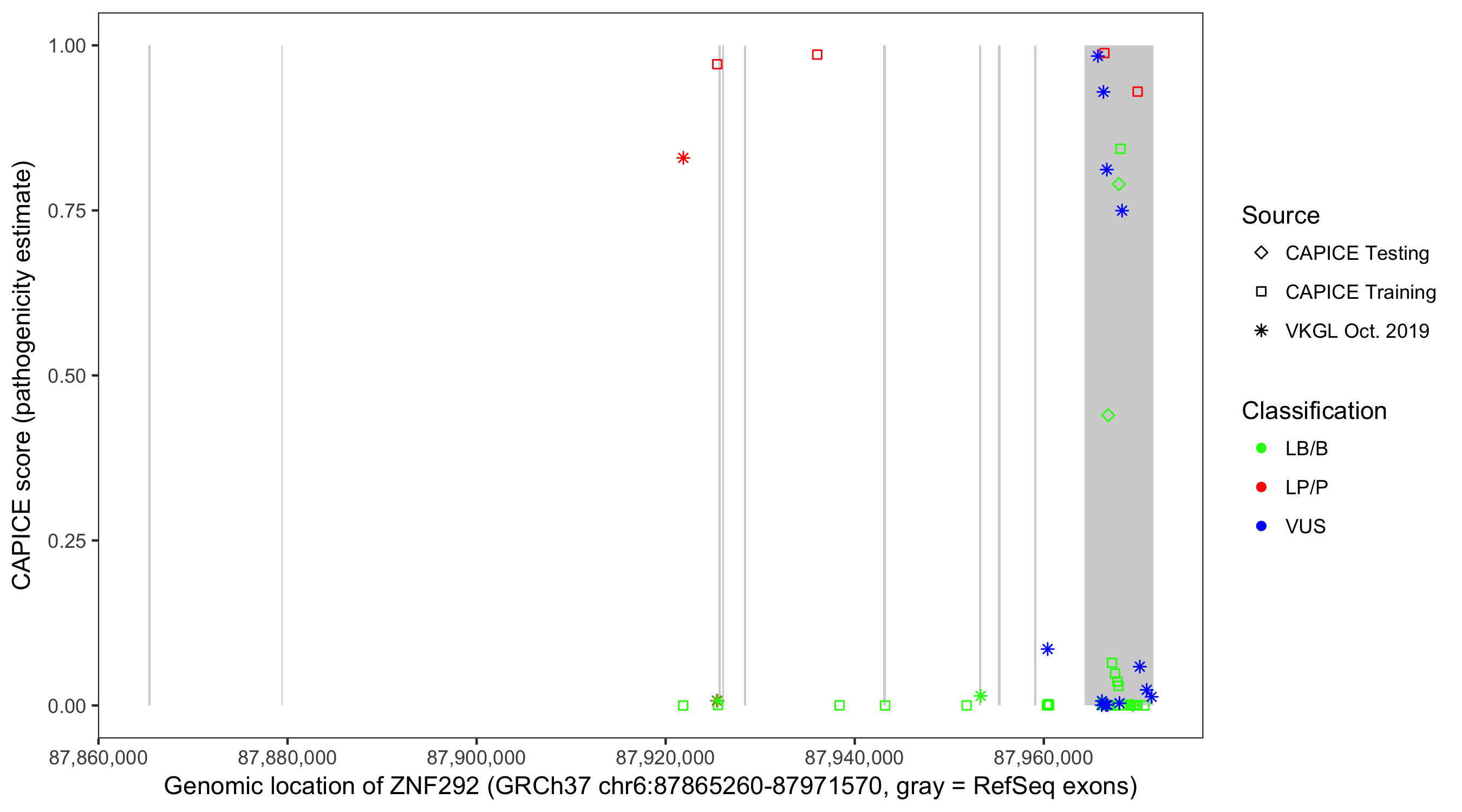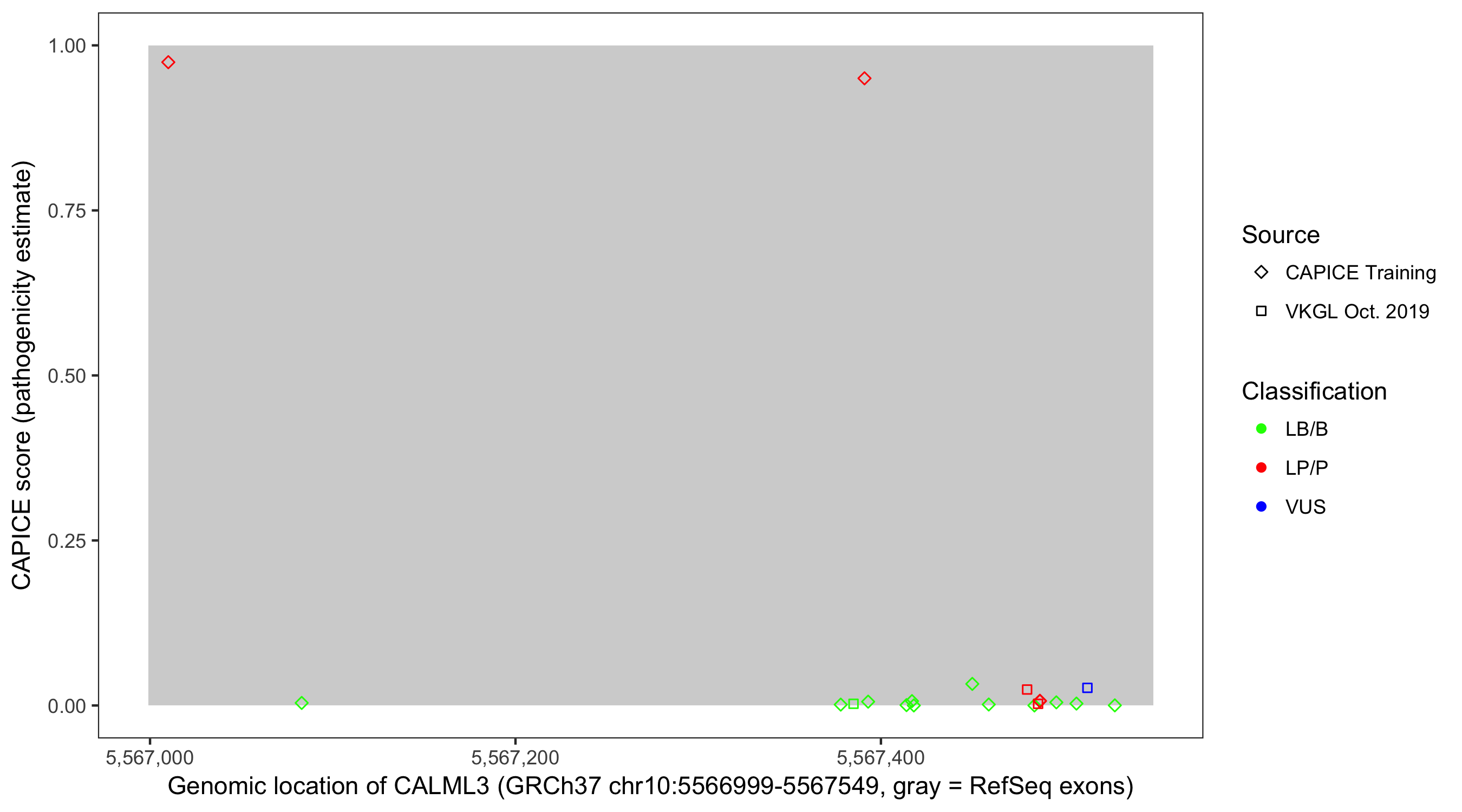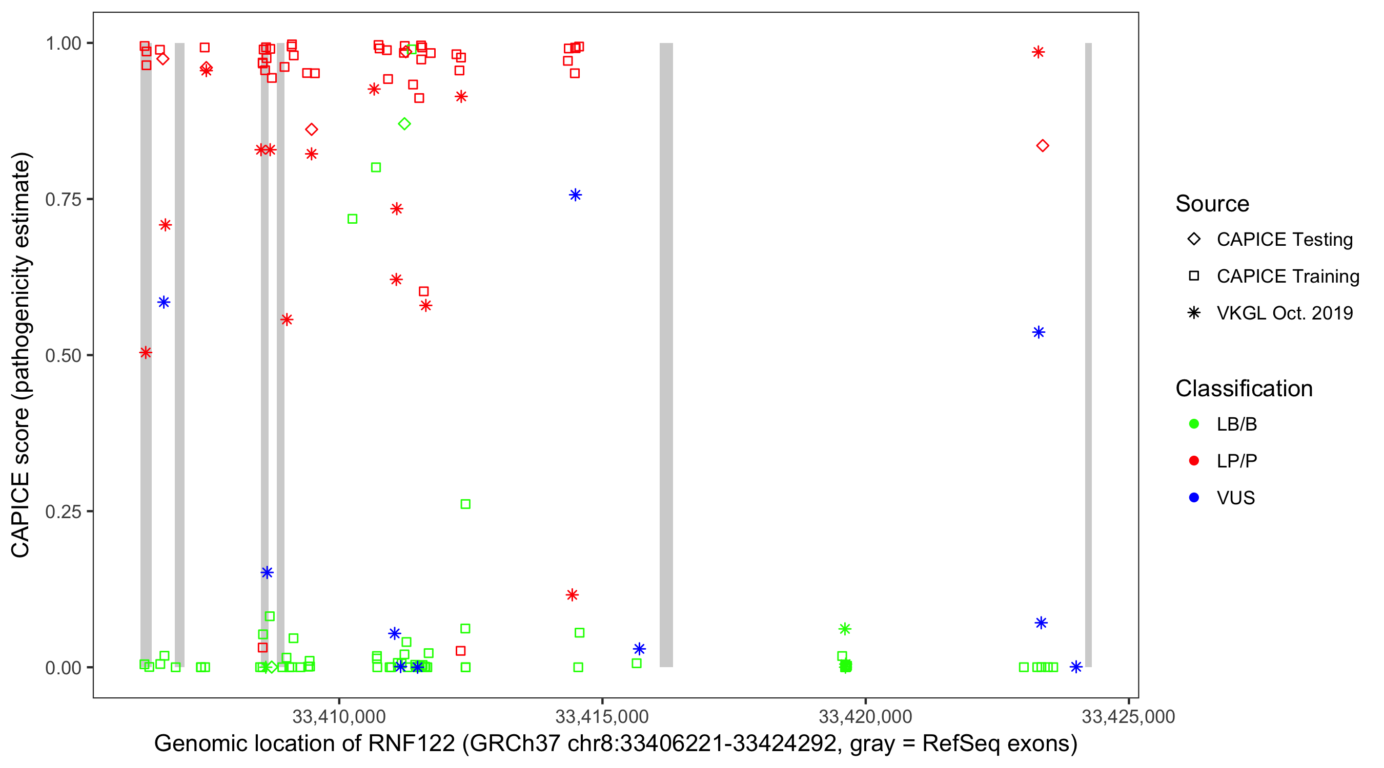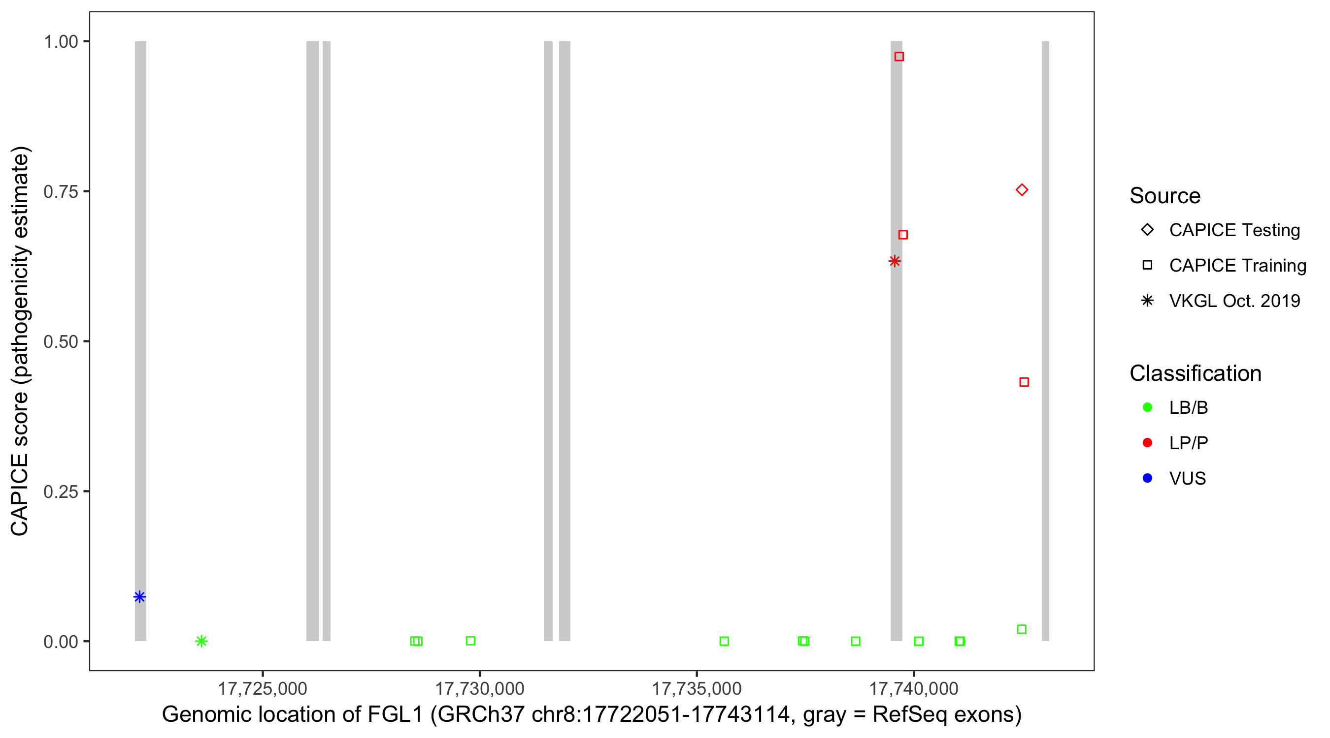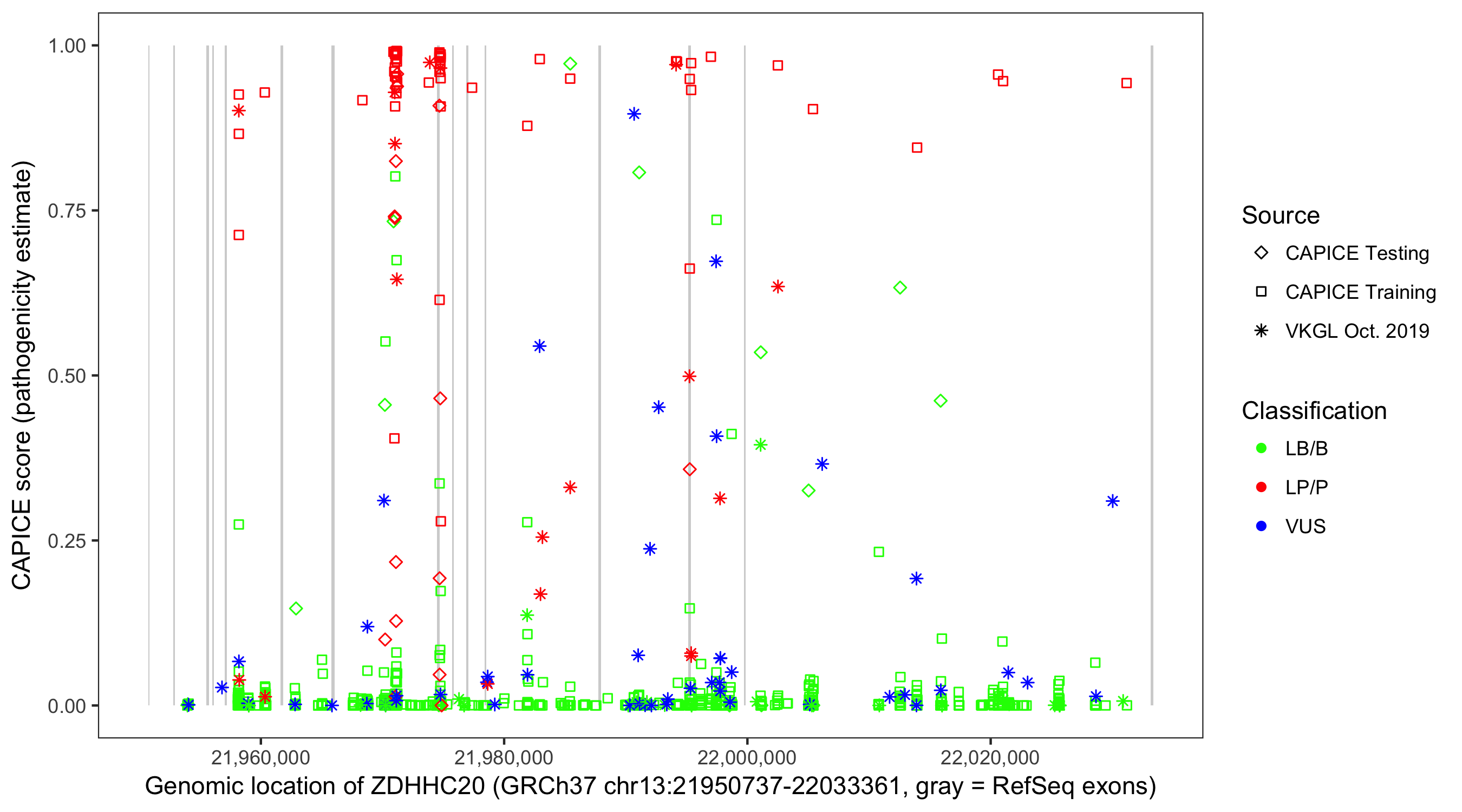 Shown are CAPICE train/test variants plus VKGL Oct 2019.