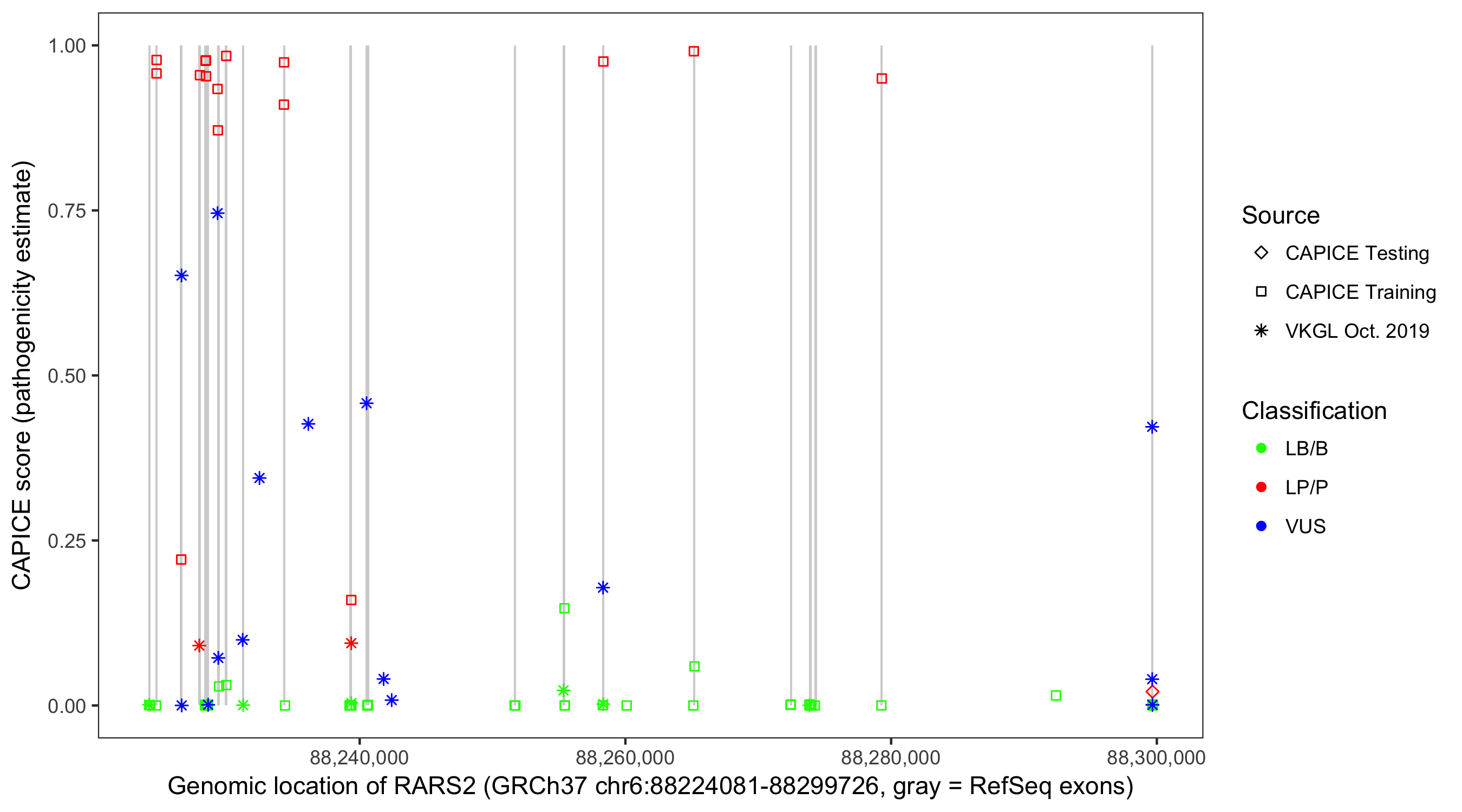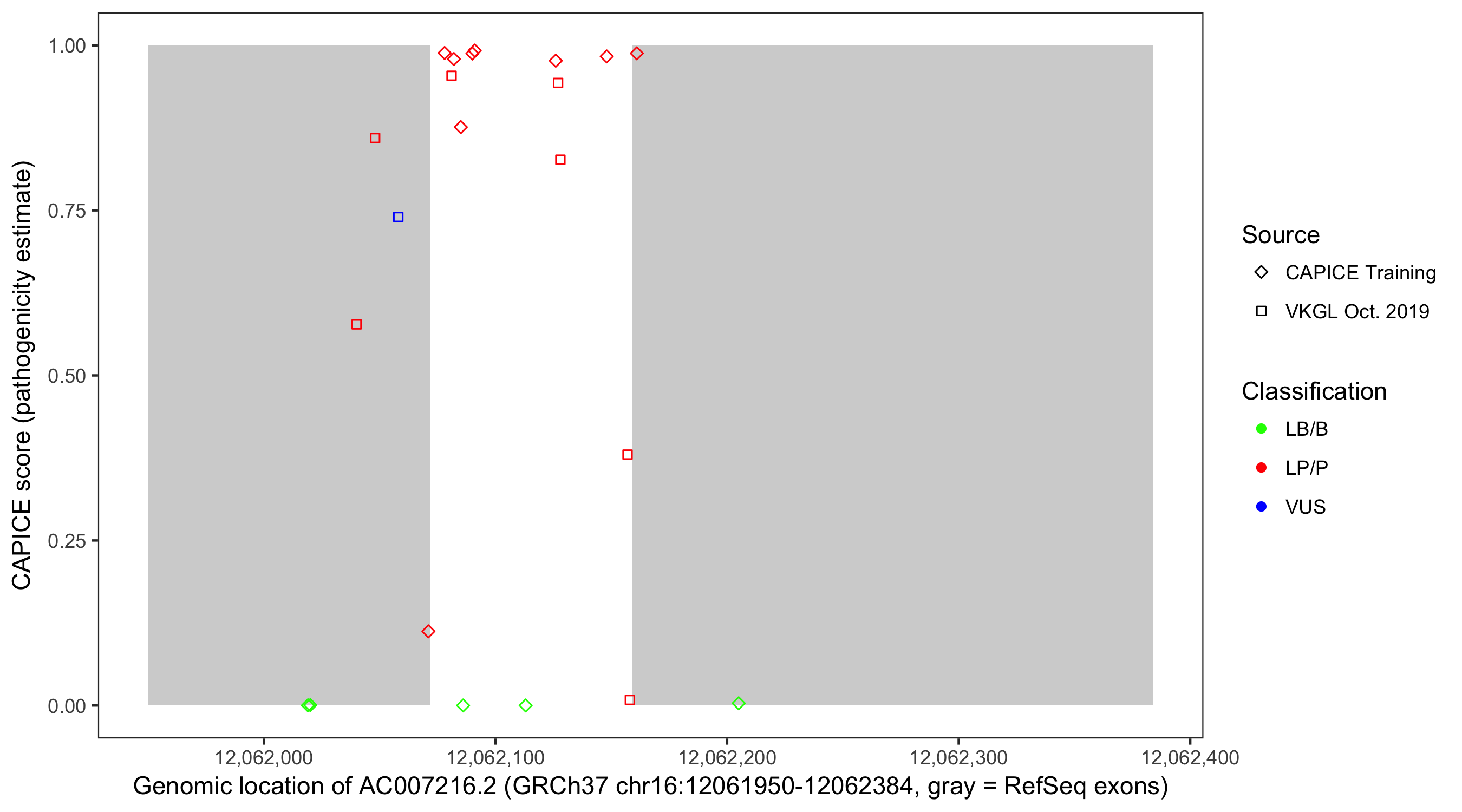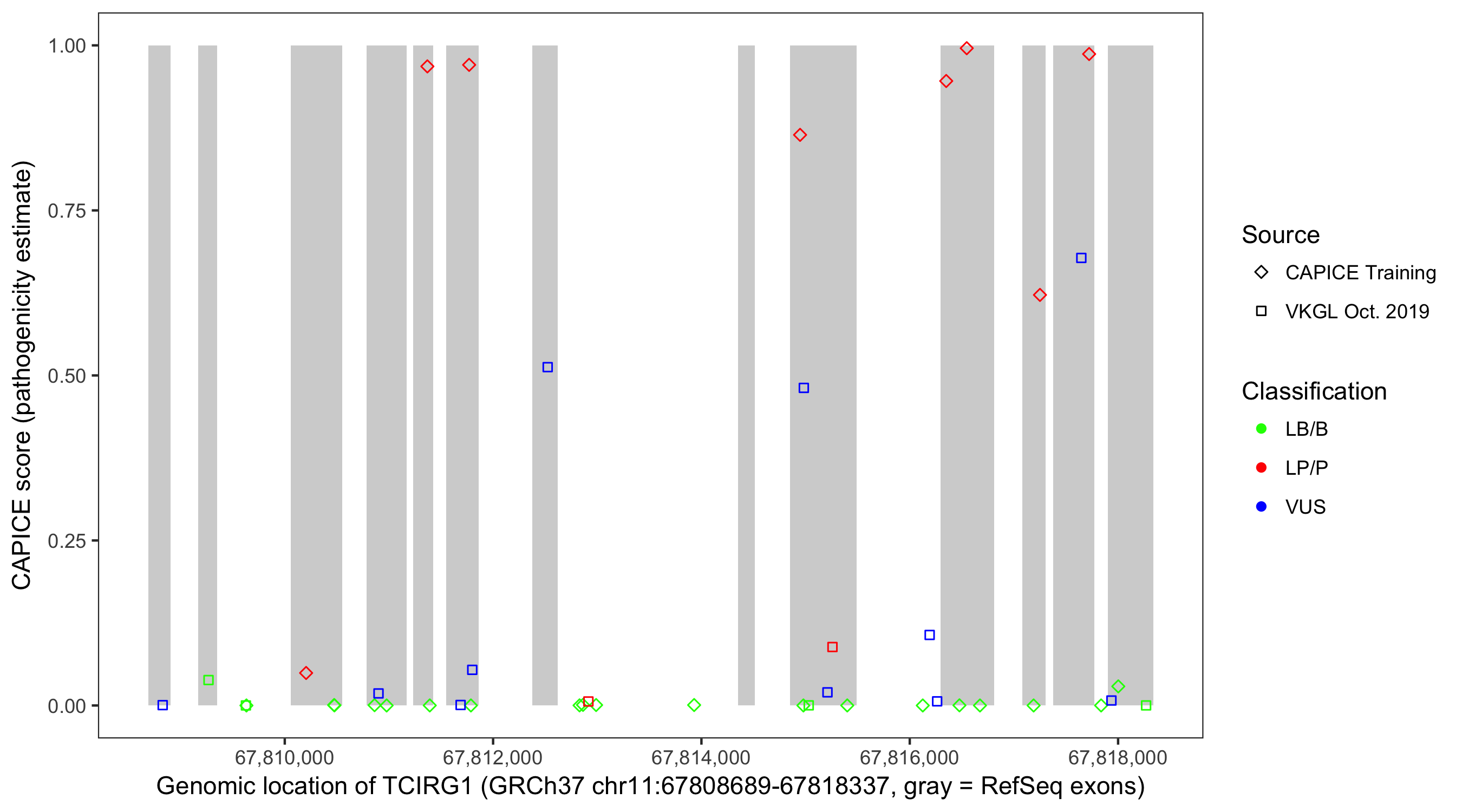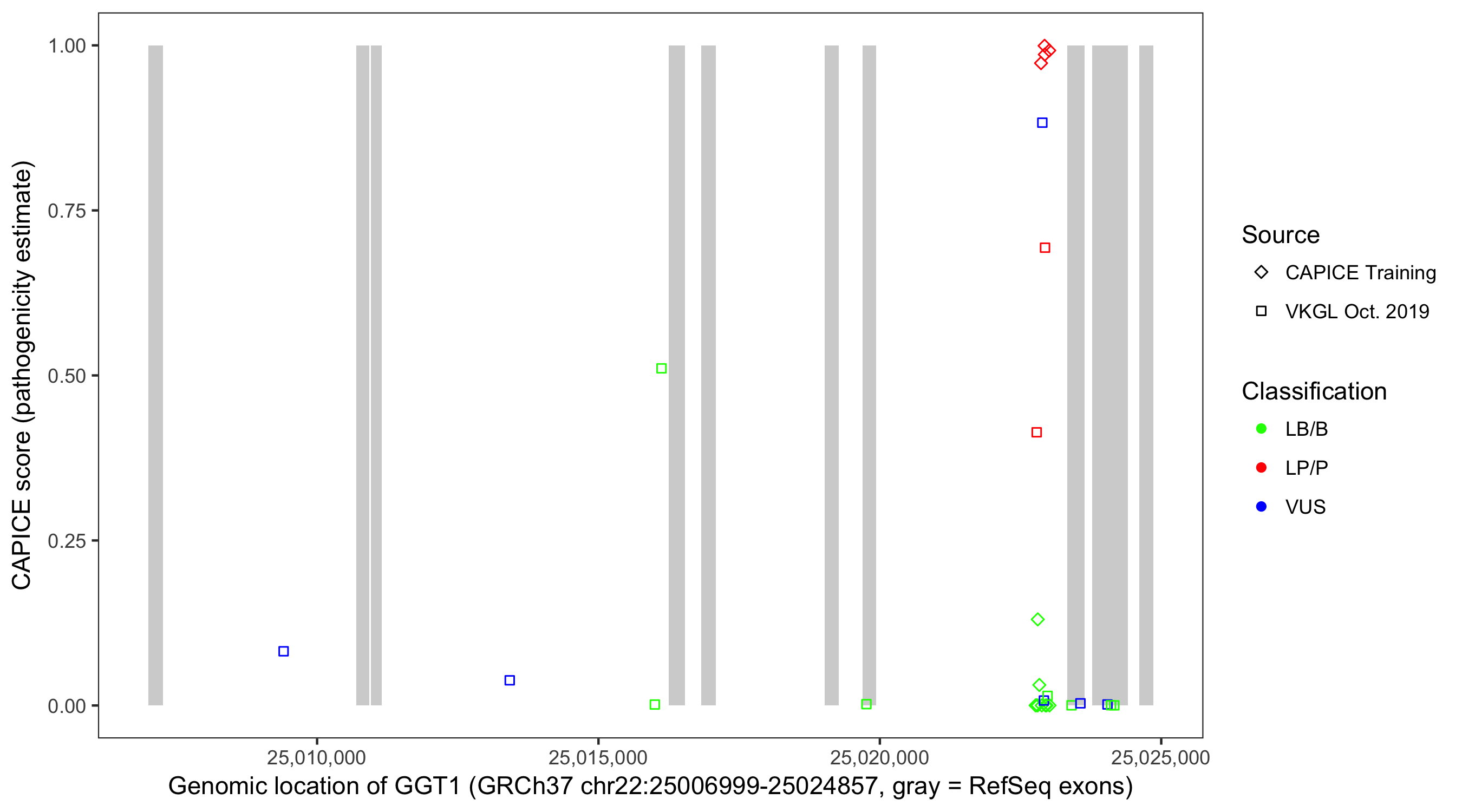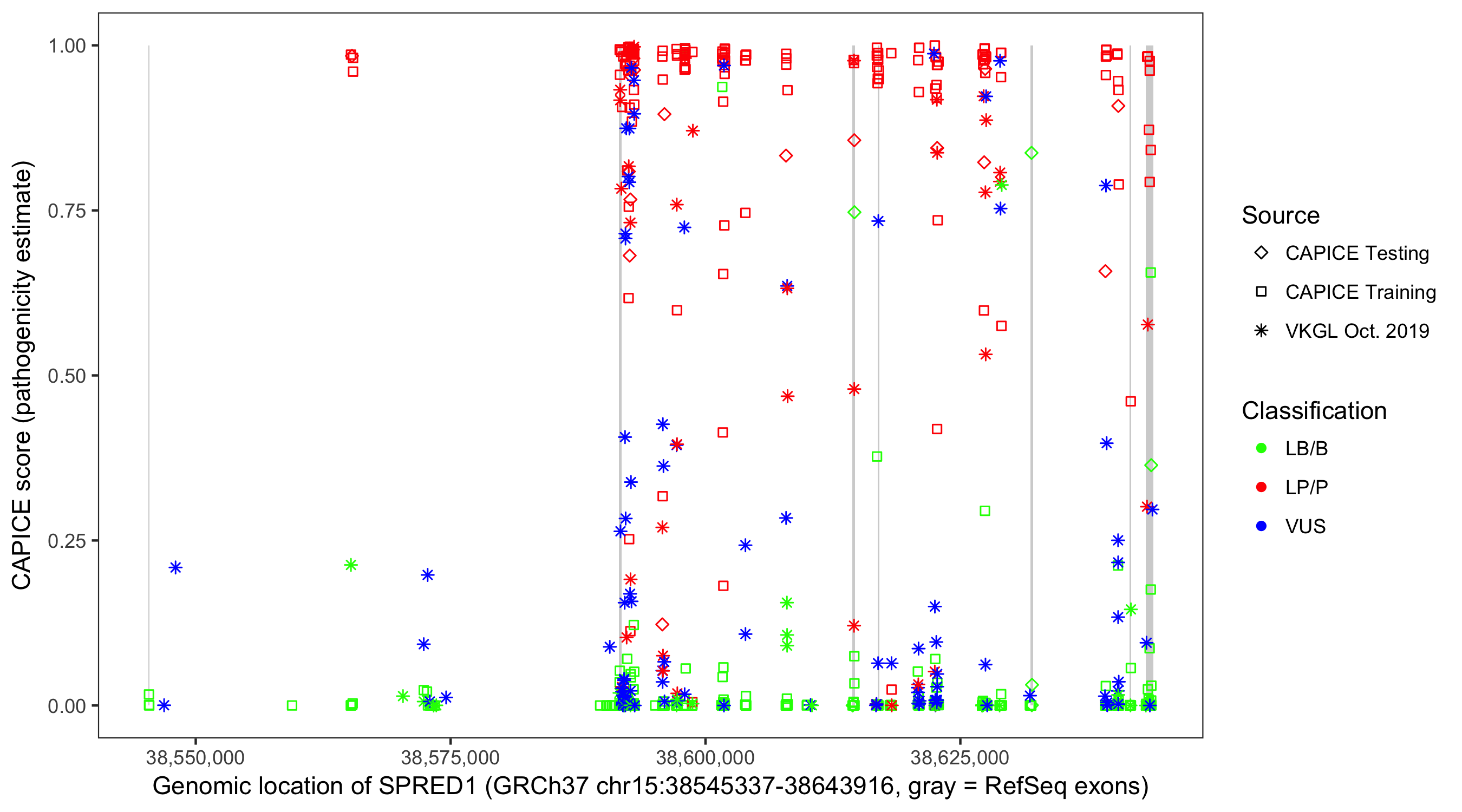 Shown are CAPICE train/test variants plus VKGL Oct 2019.