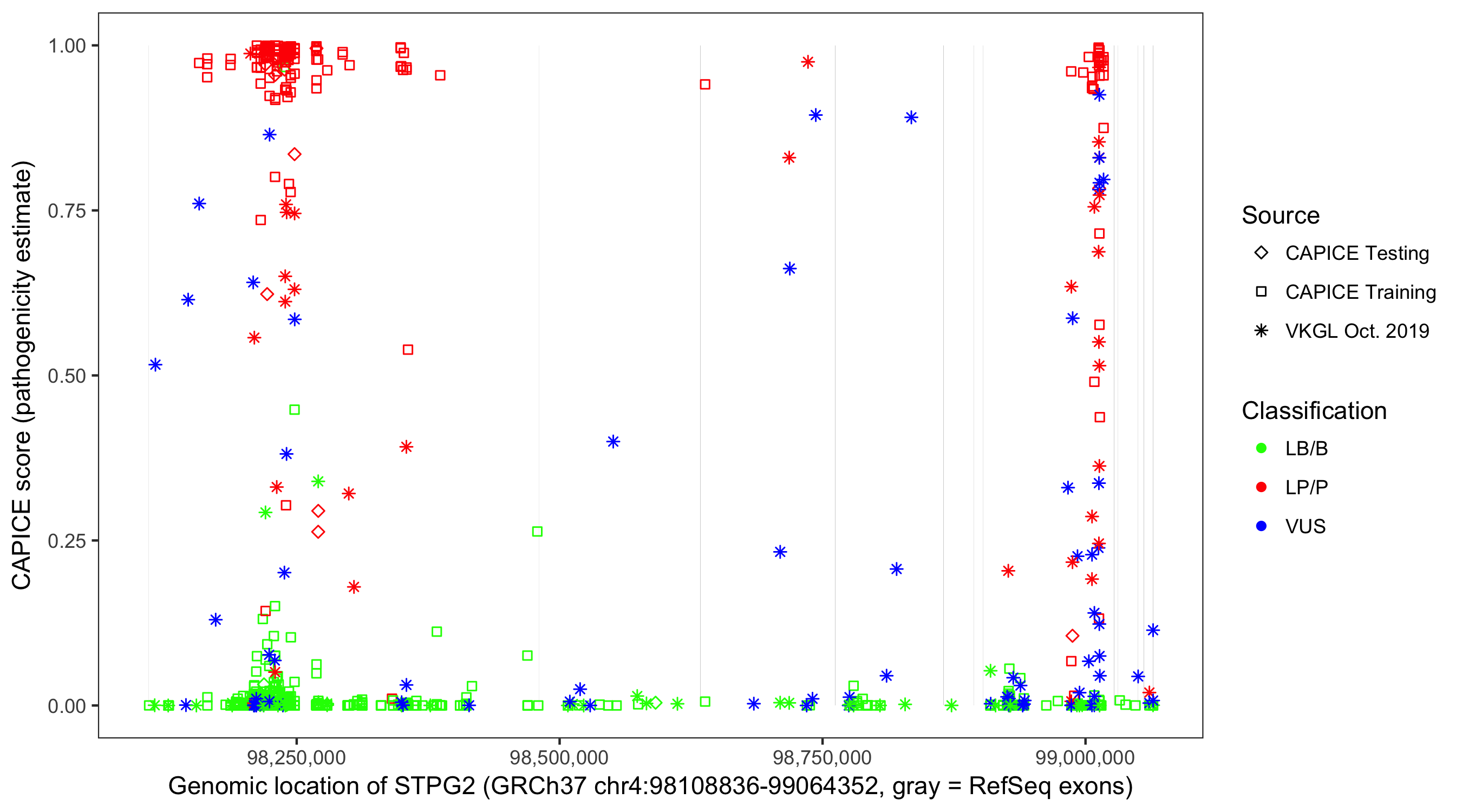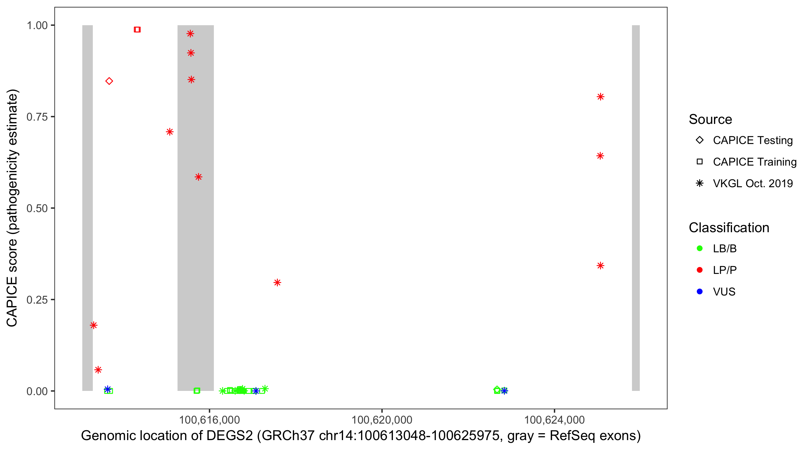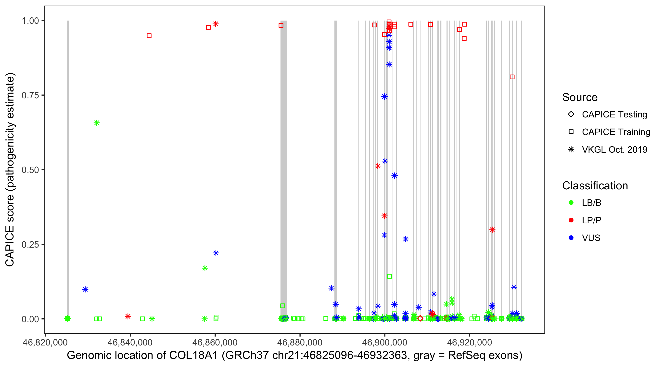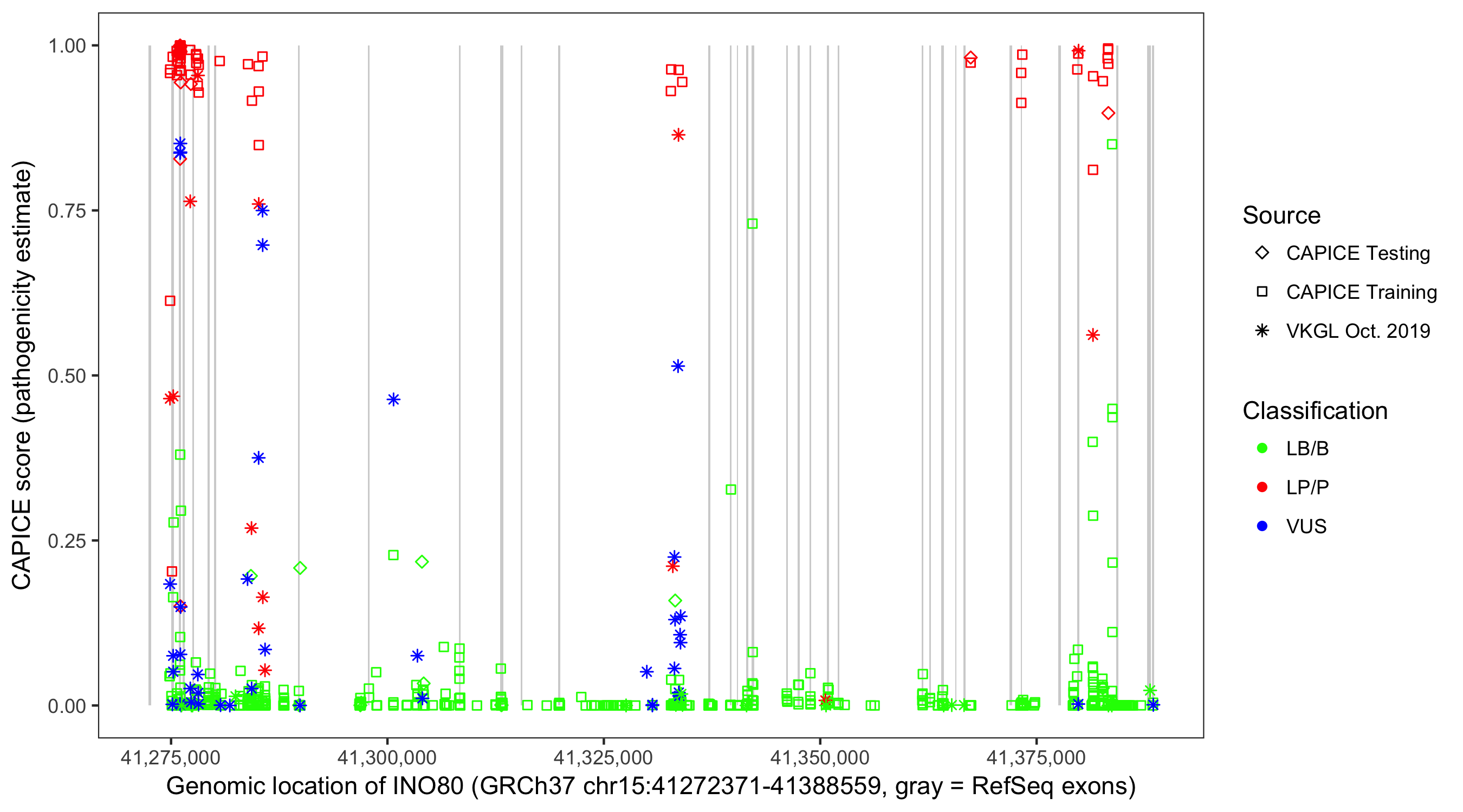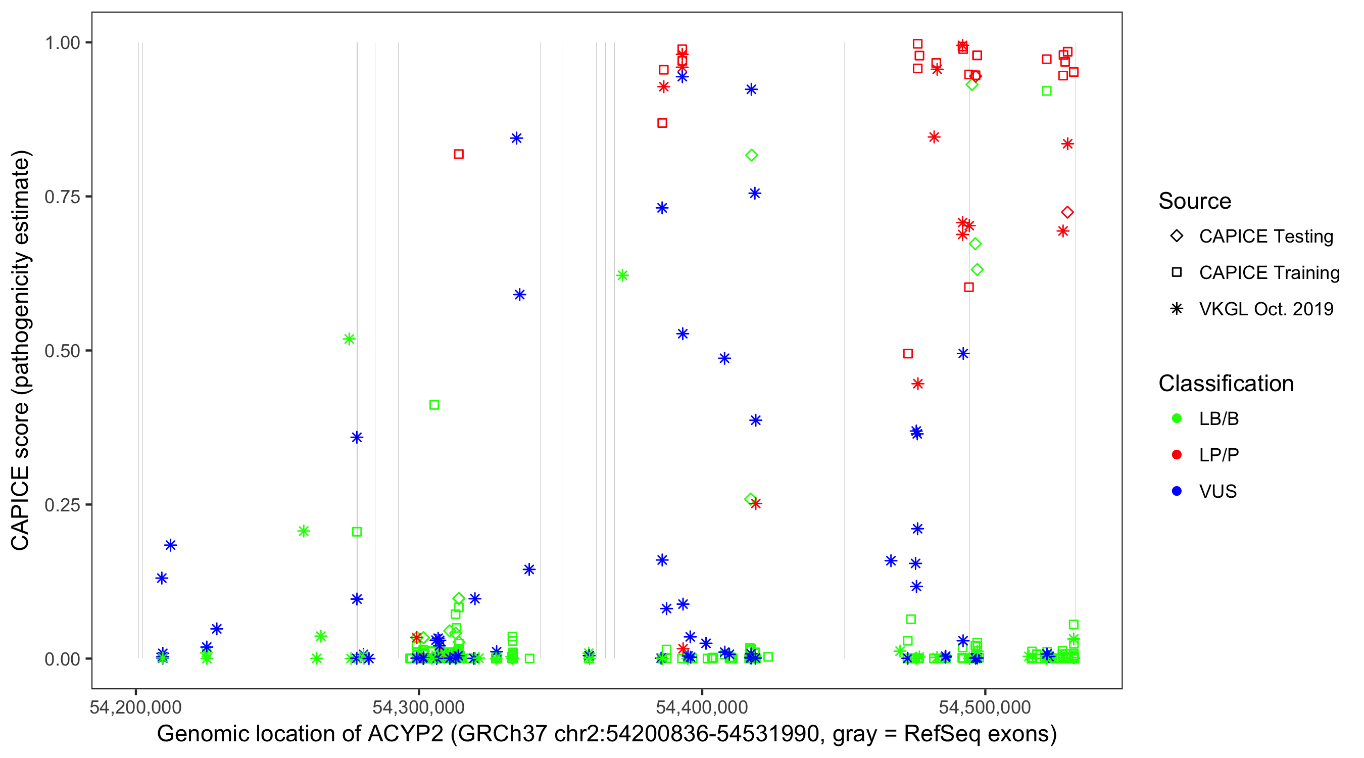 Shown are CAPICE train/test variants plus VKGL Oct 2019.