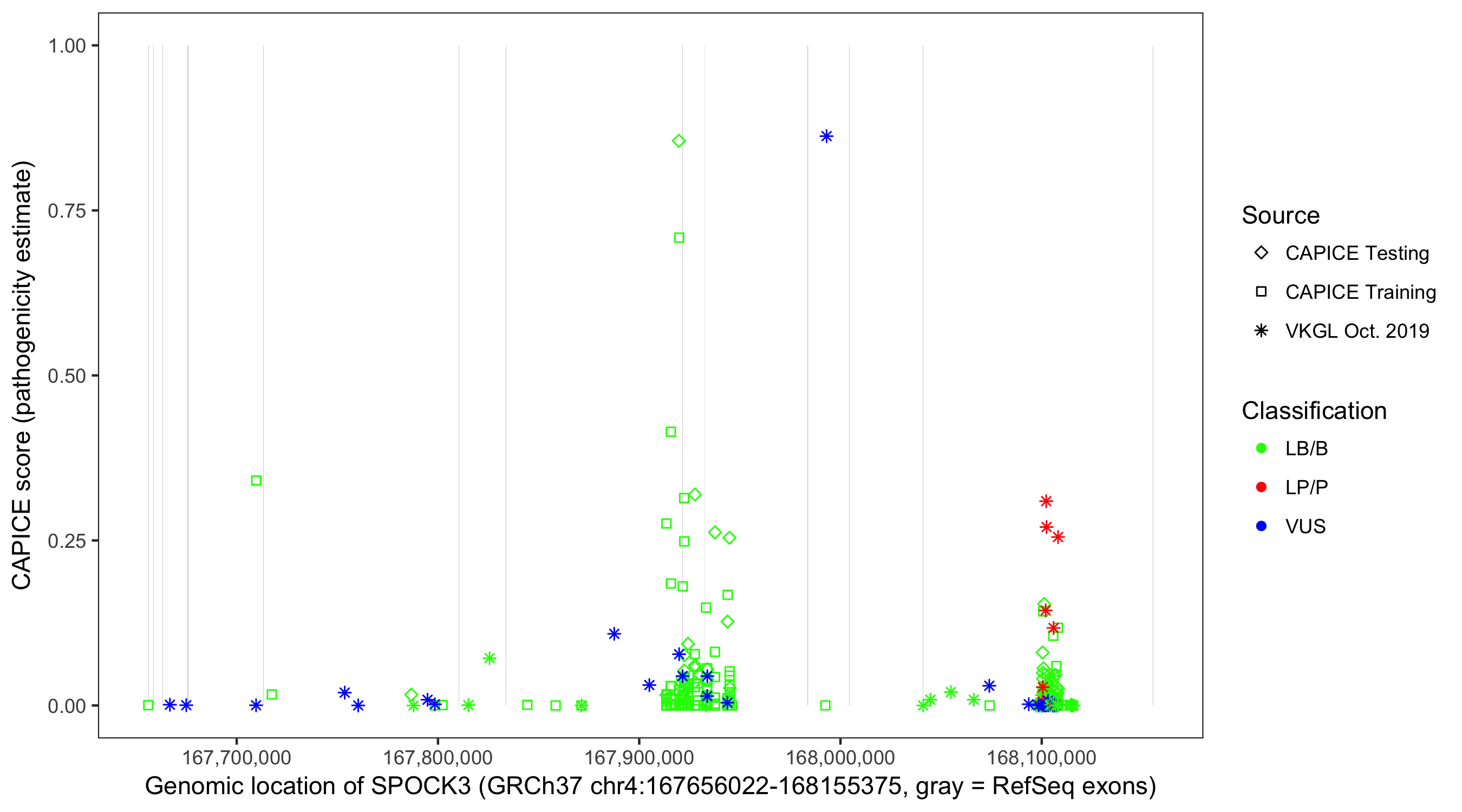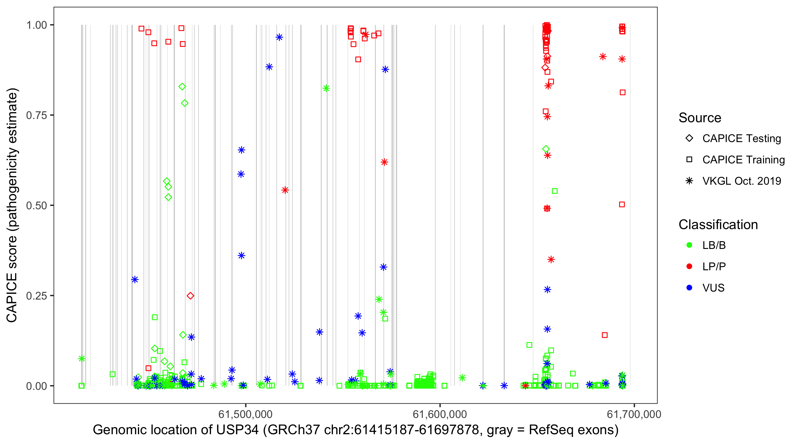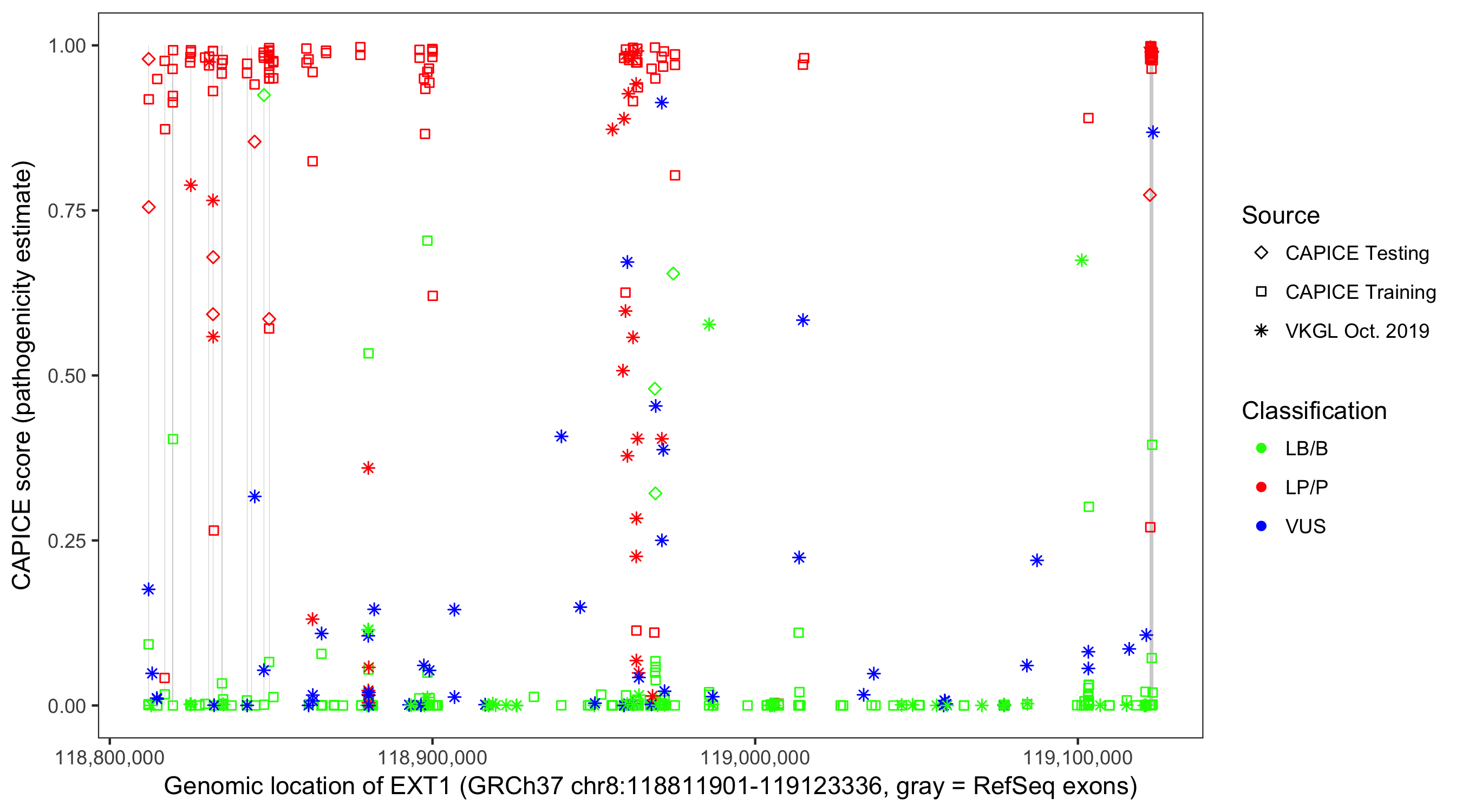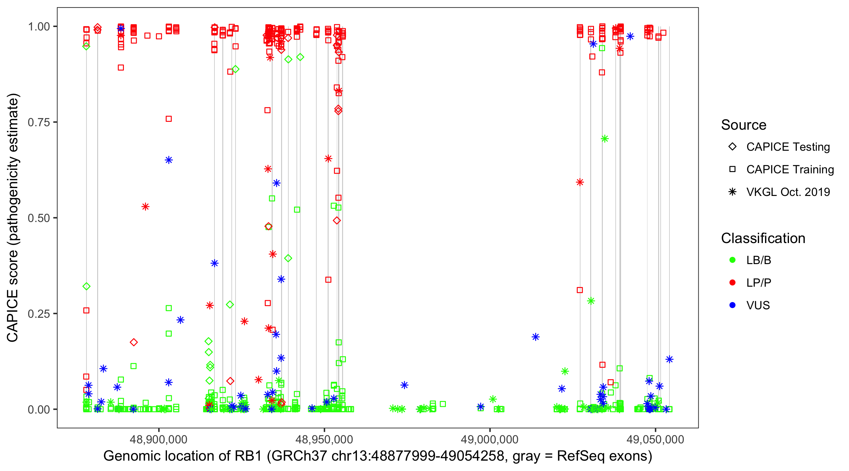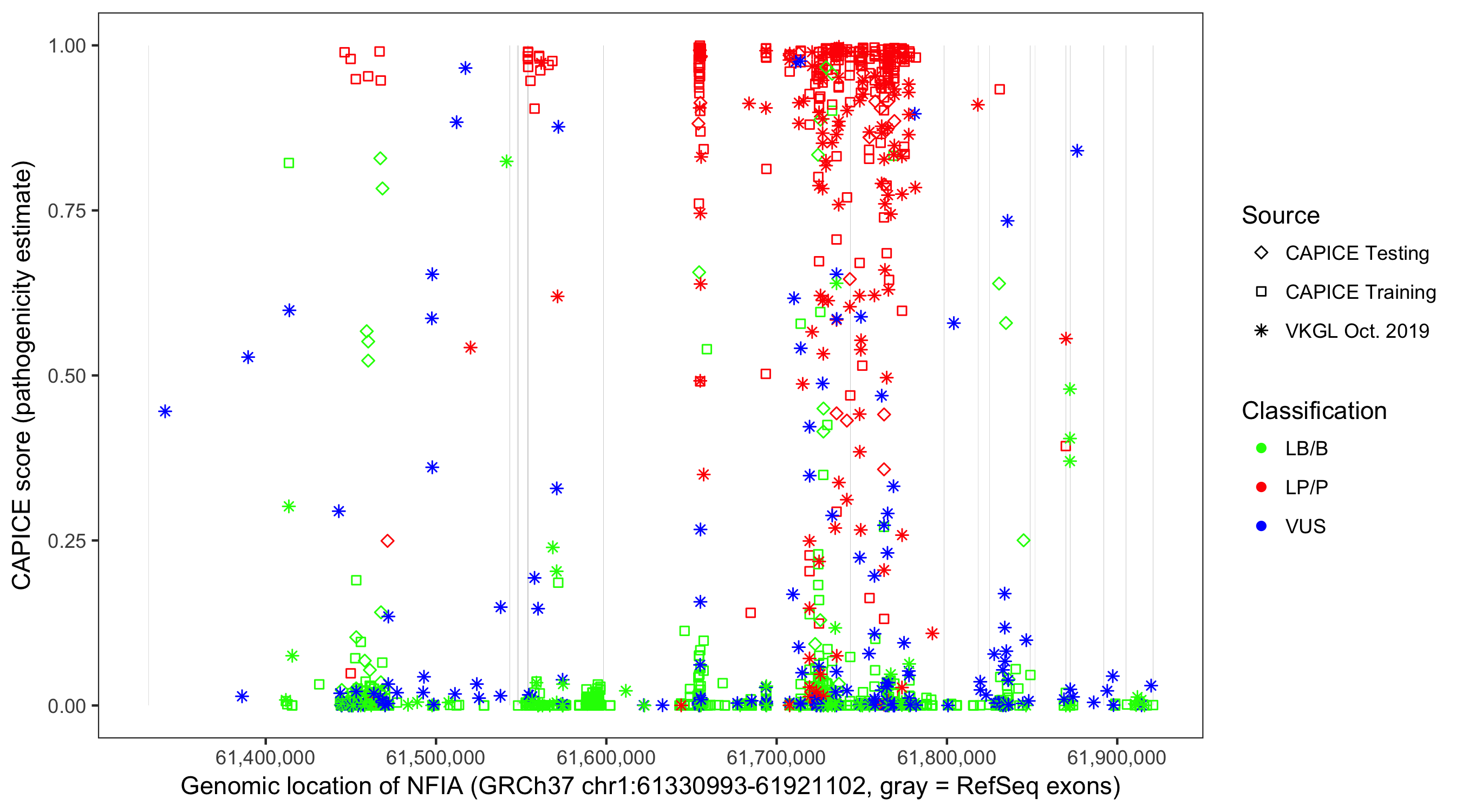 Shown are CAPICE train/test variants plus VKGL Oct 2019.