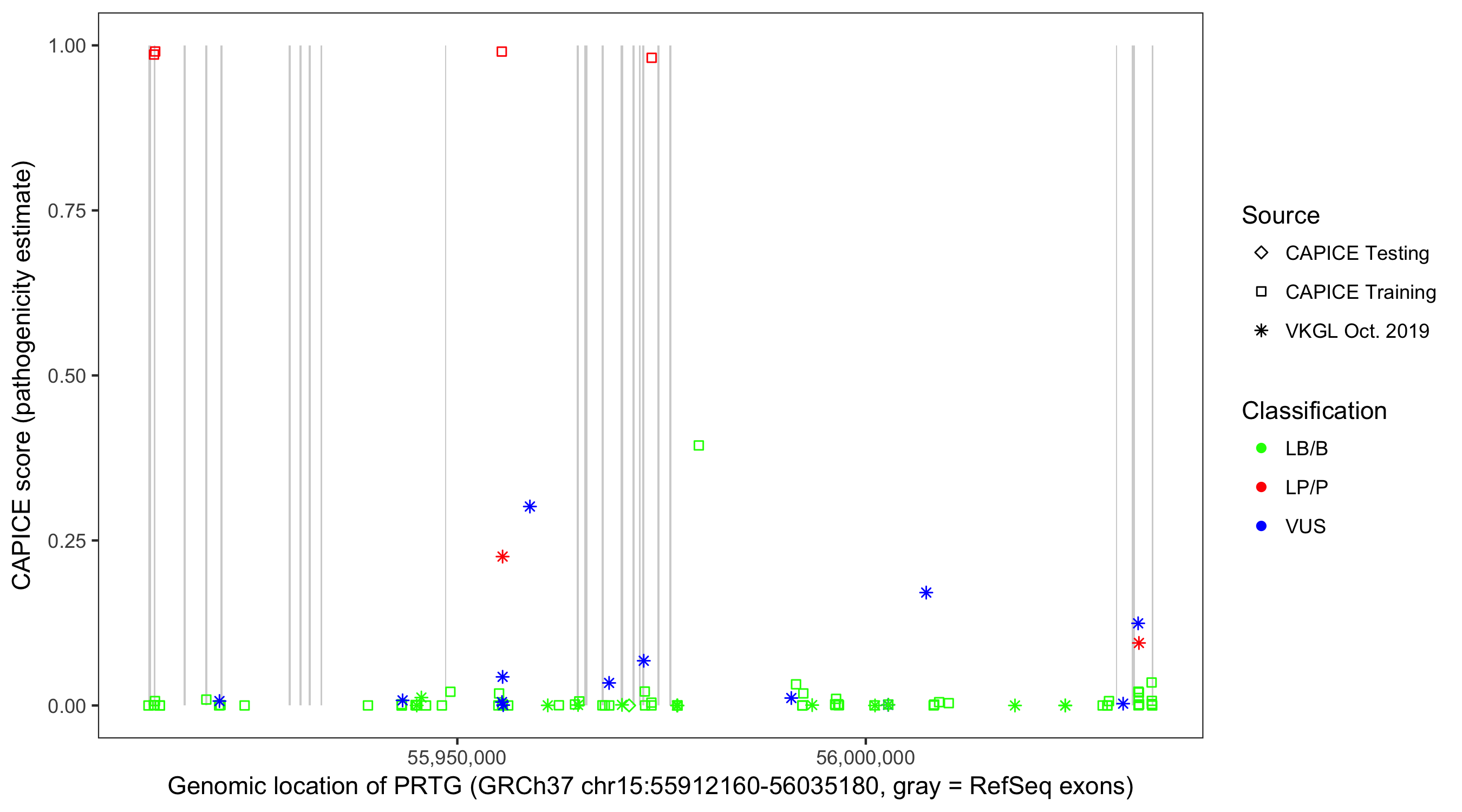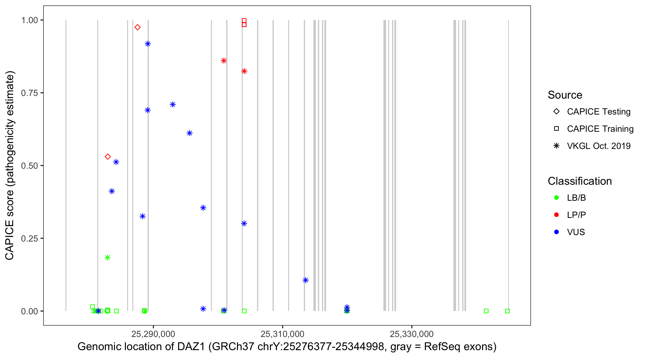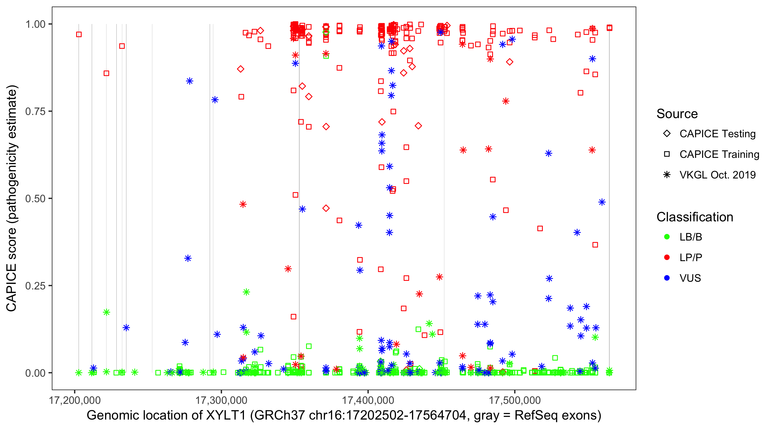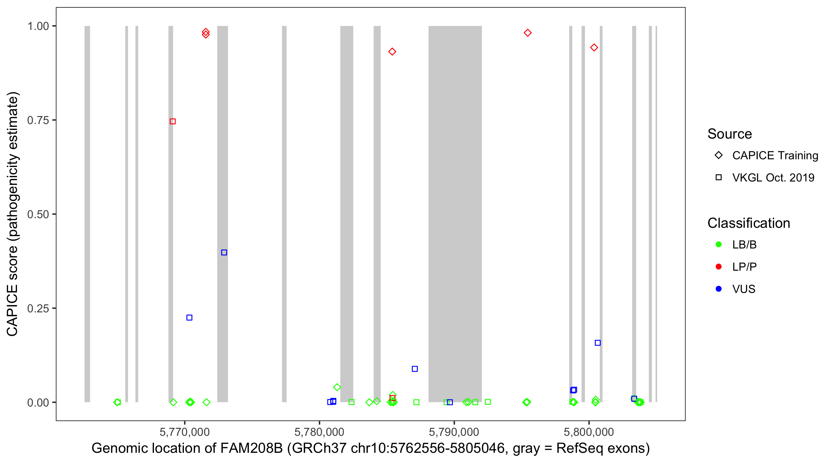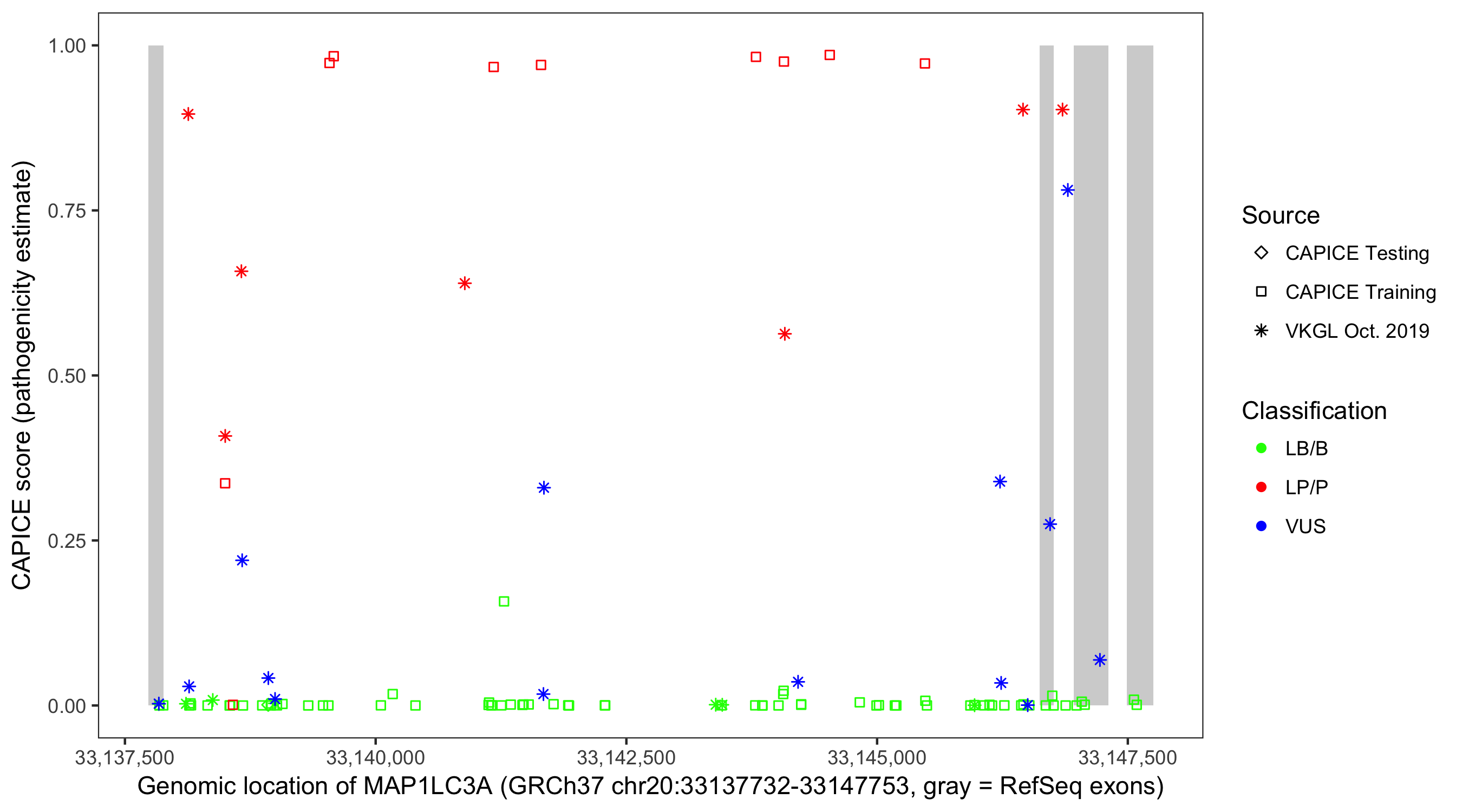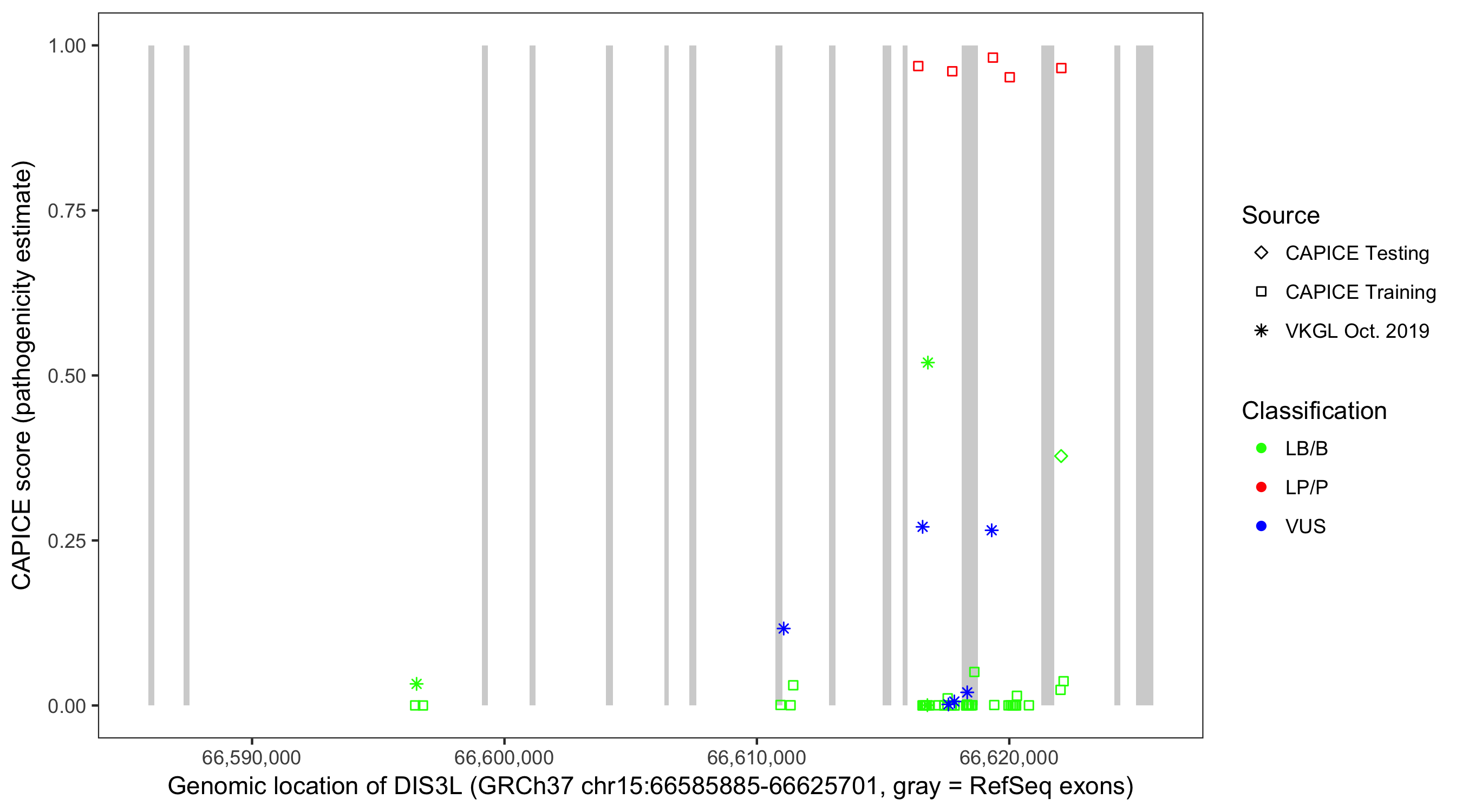 Shown are CAPICE train/test variants plus VKGL Oct 2019.