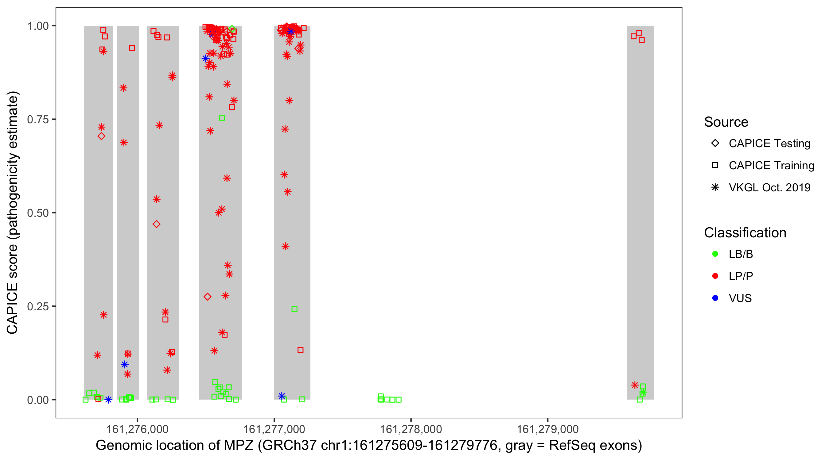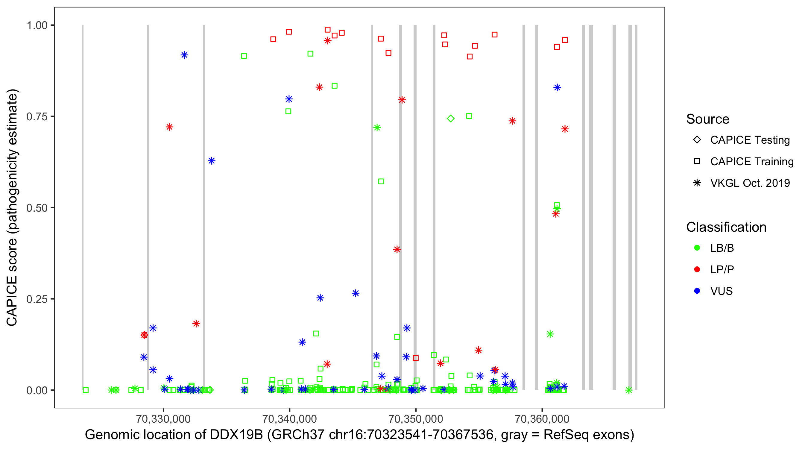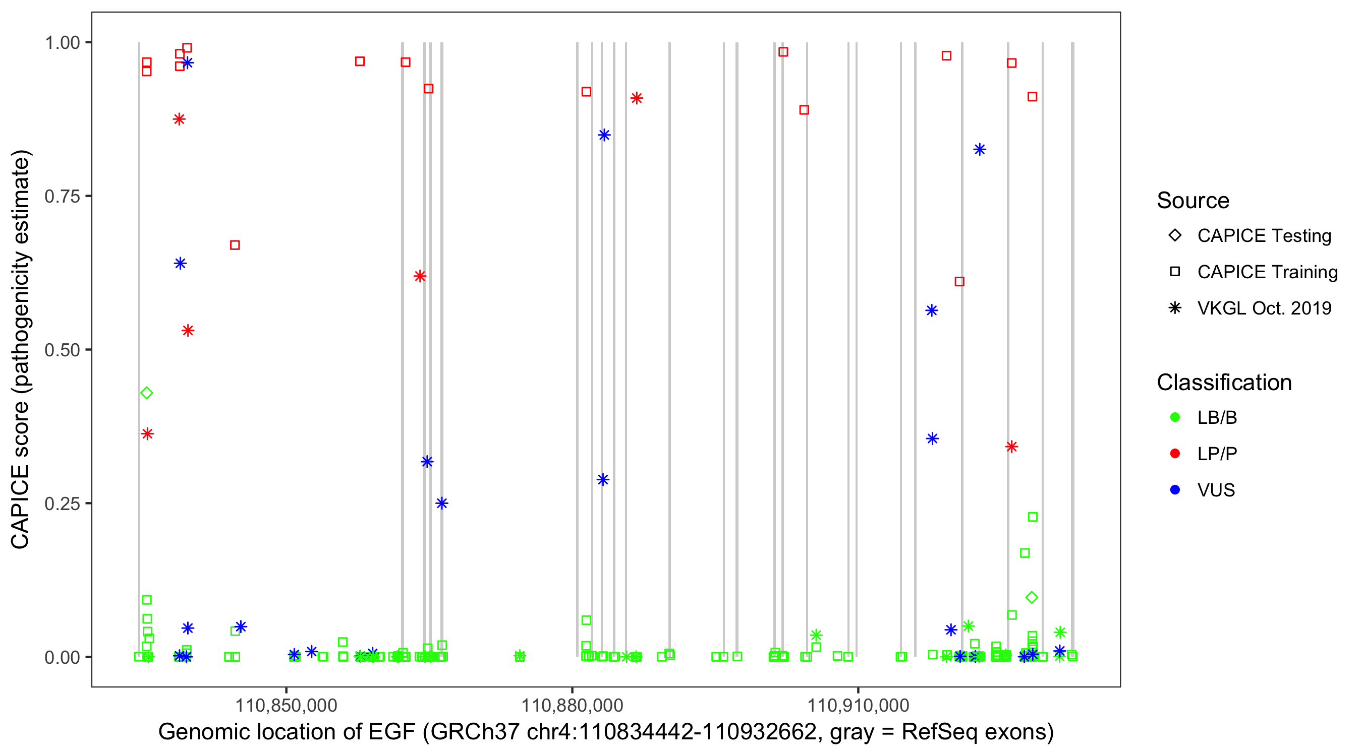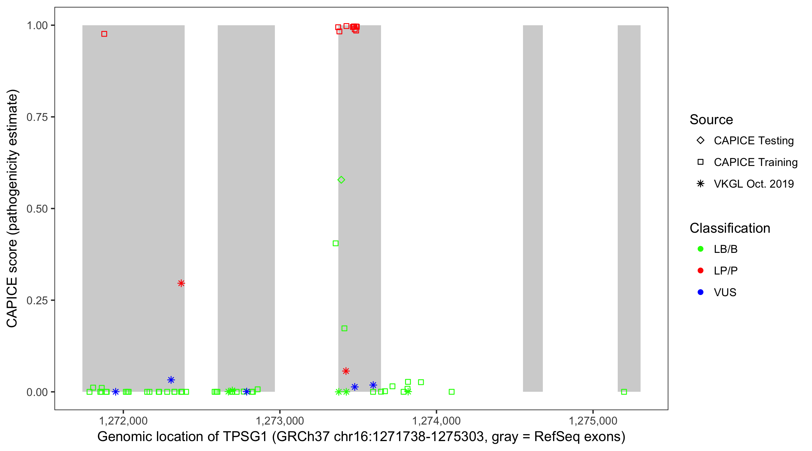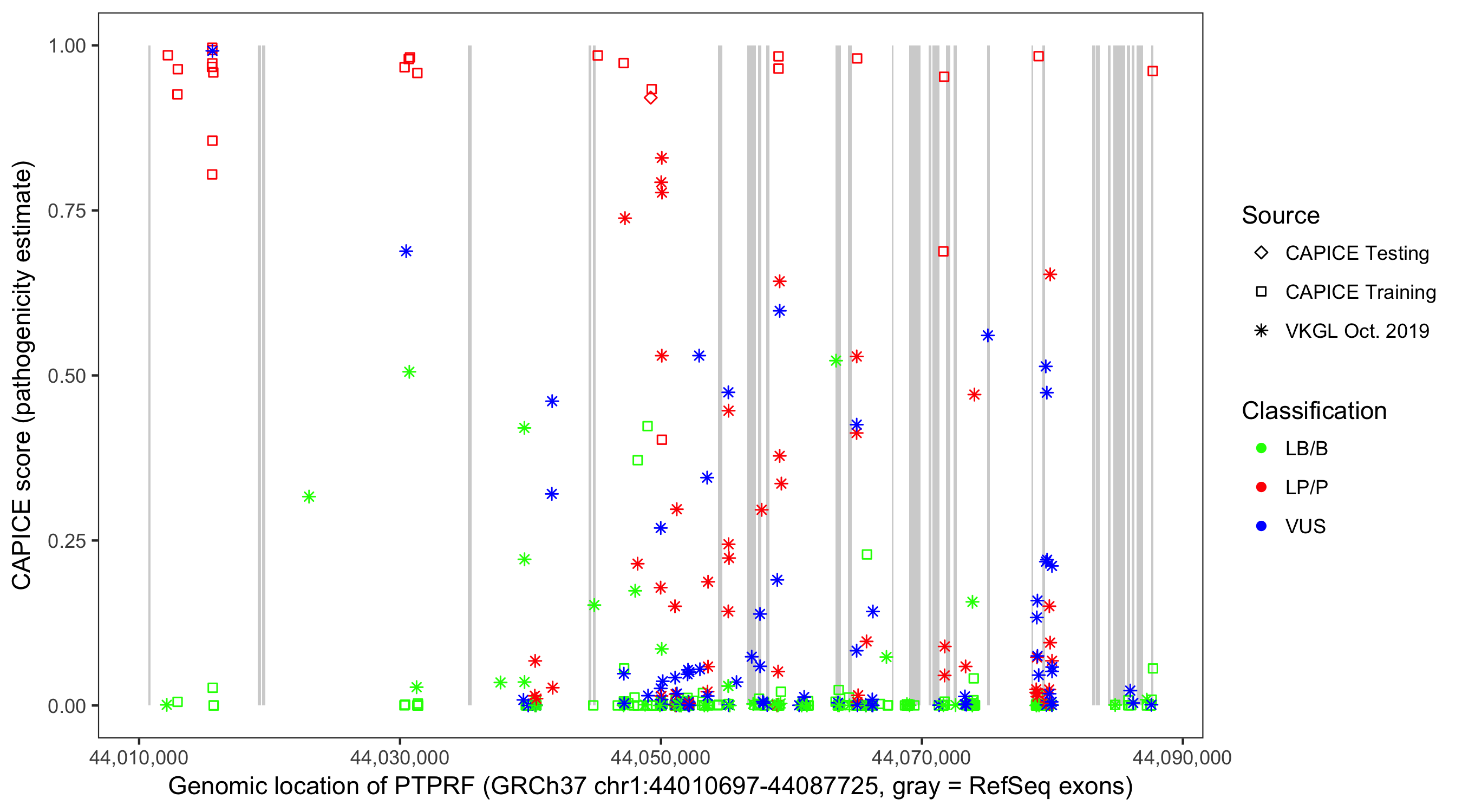 Shown are CAPICE train/test variants plus VKGL Oct 2019.