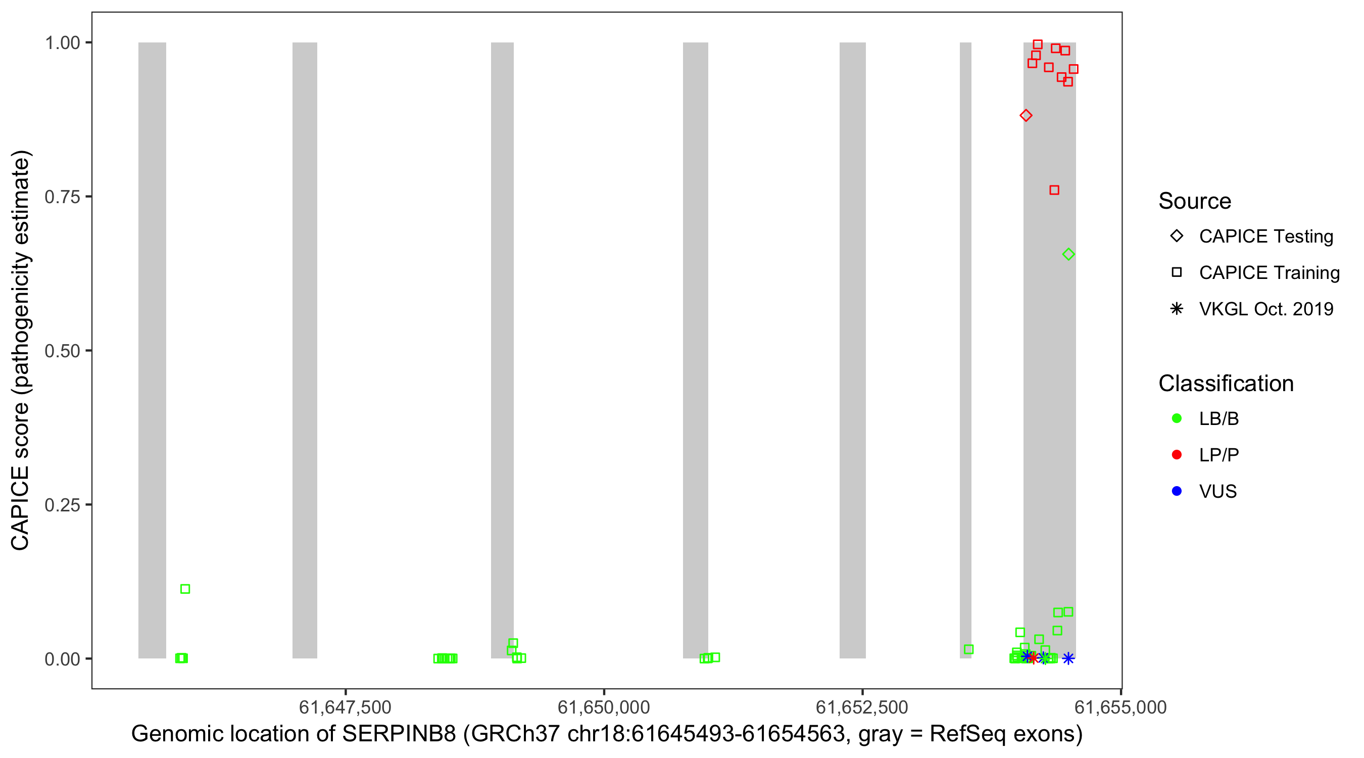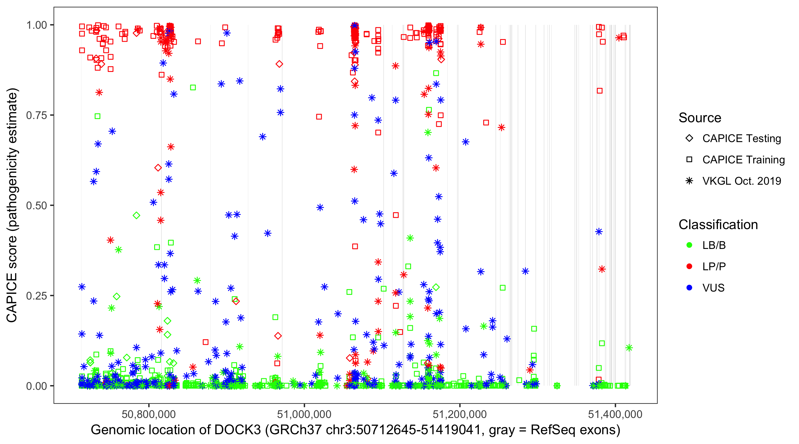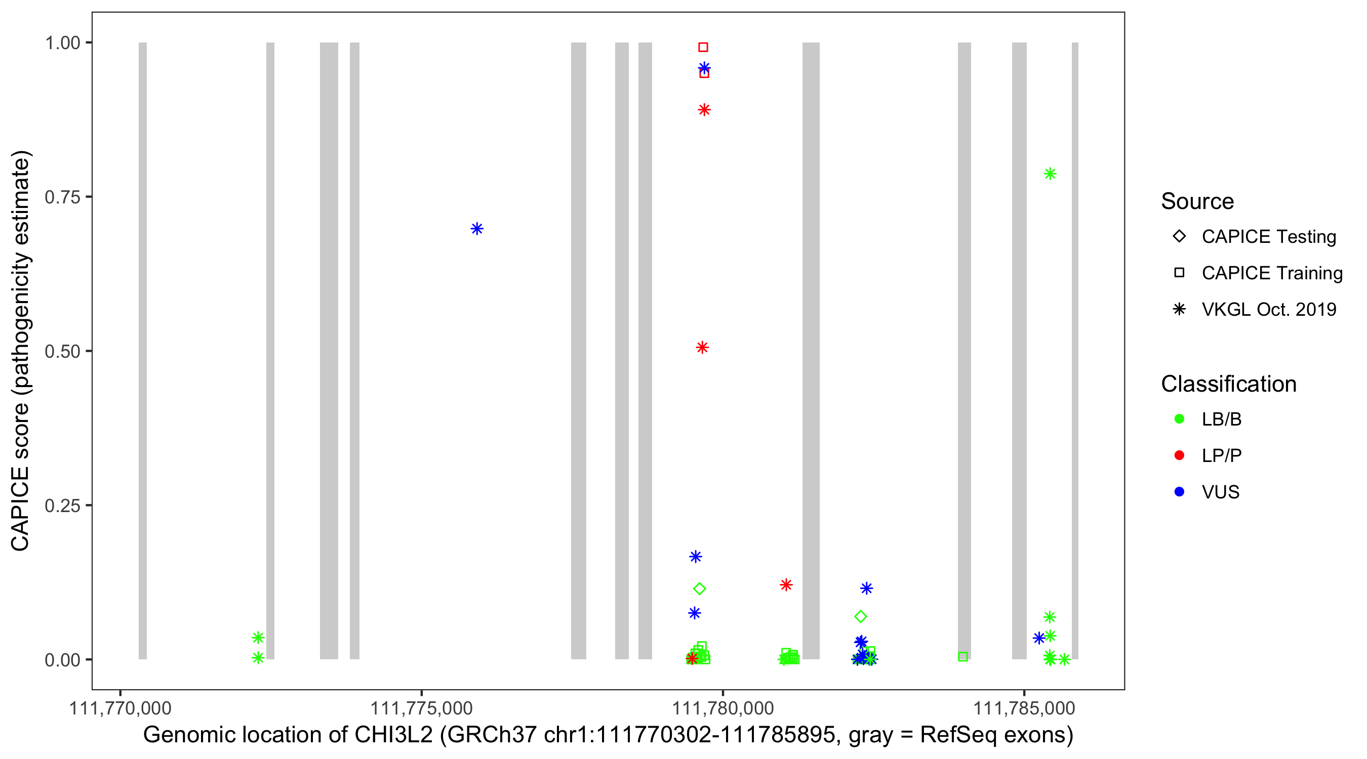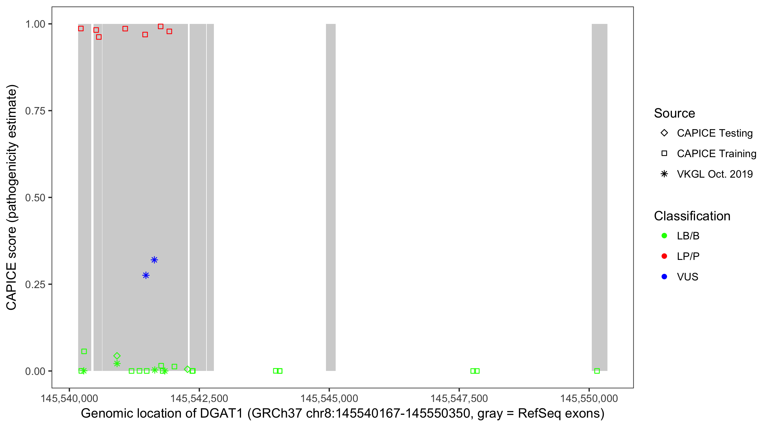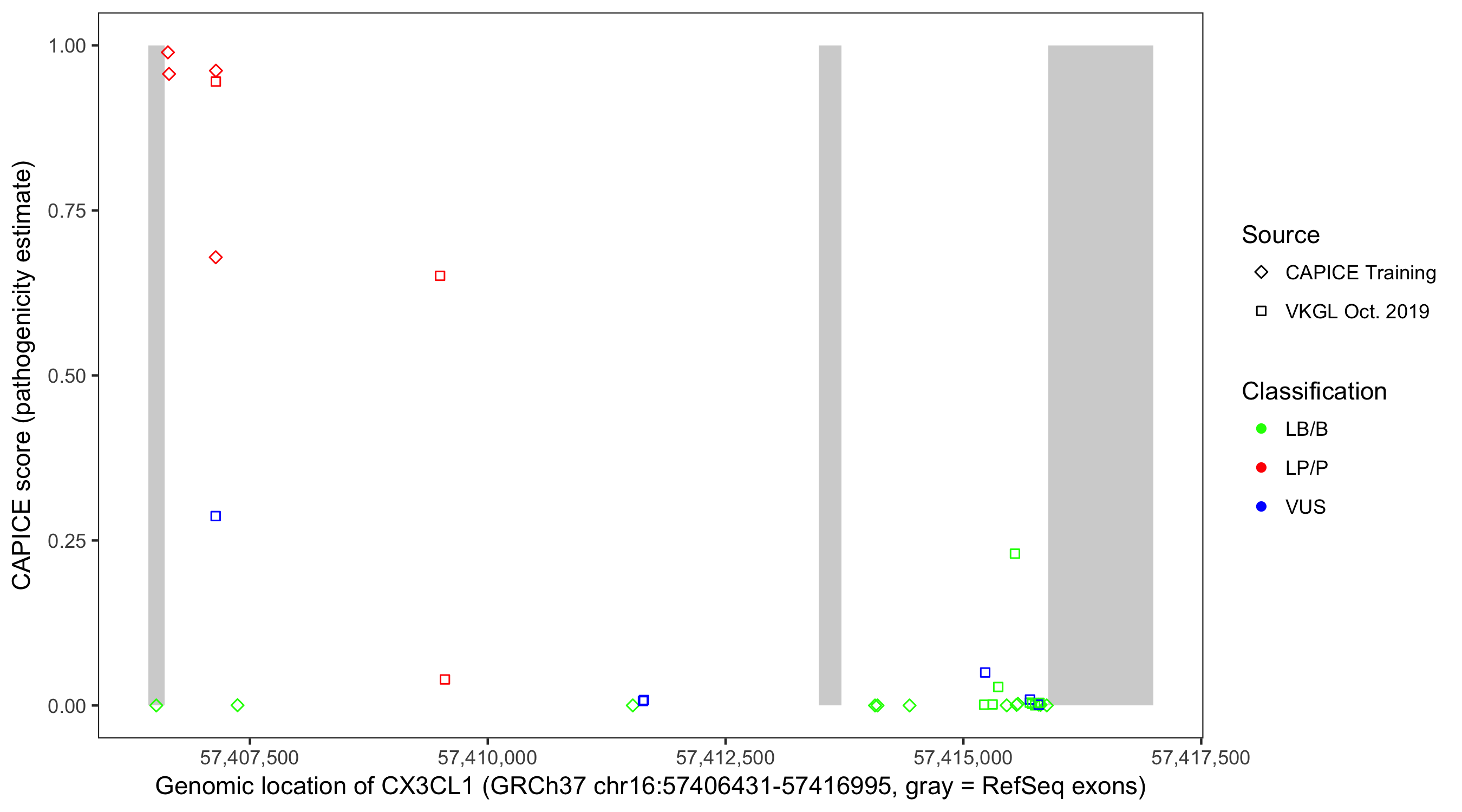 Shown are CAPICE train/test variants plus VKGL Oct 2019.